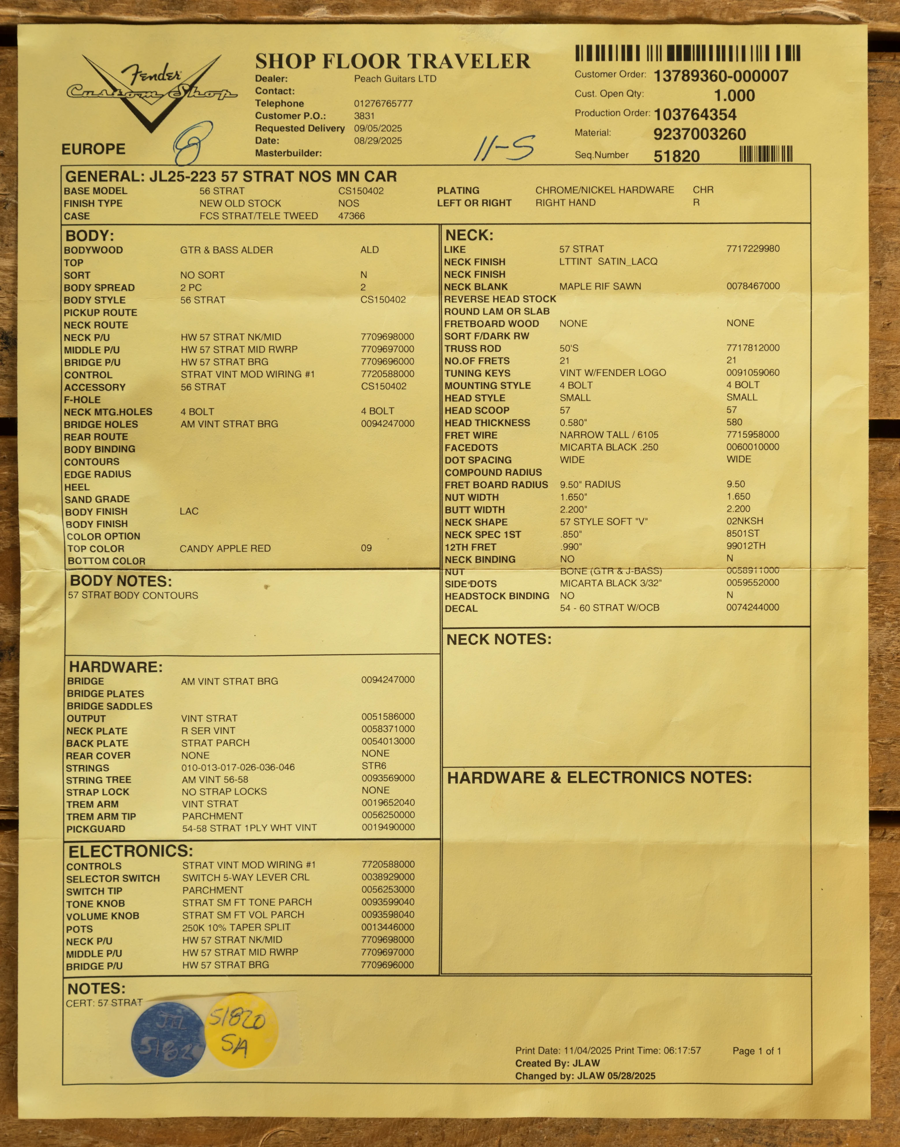 Handwound 57 Strat Pickups - 9.5" Fingerboard Radius - Narrow Tall Frets