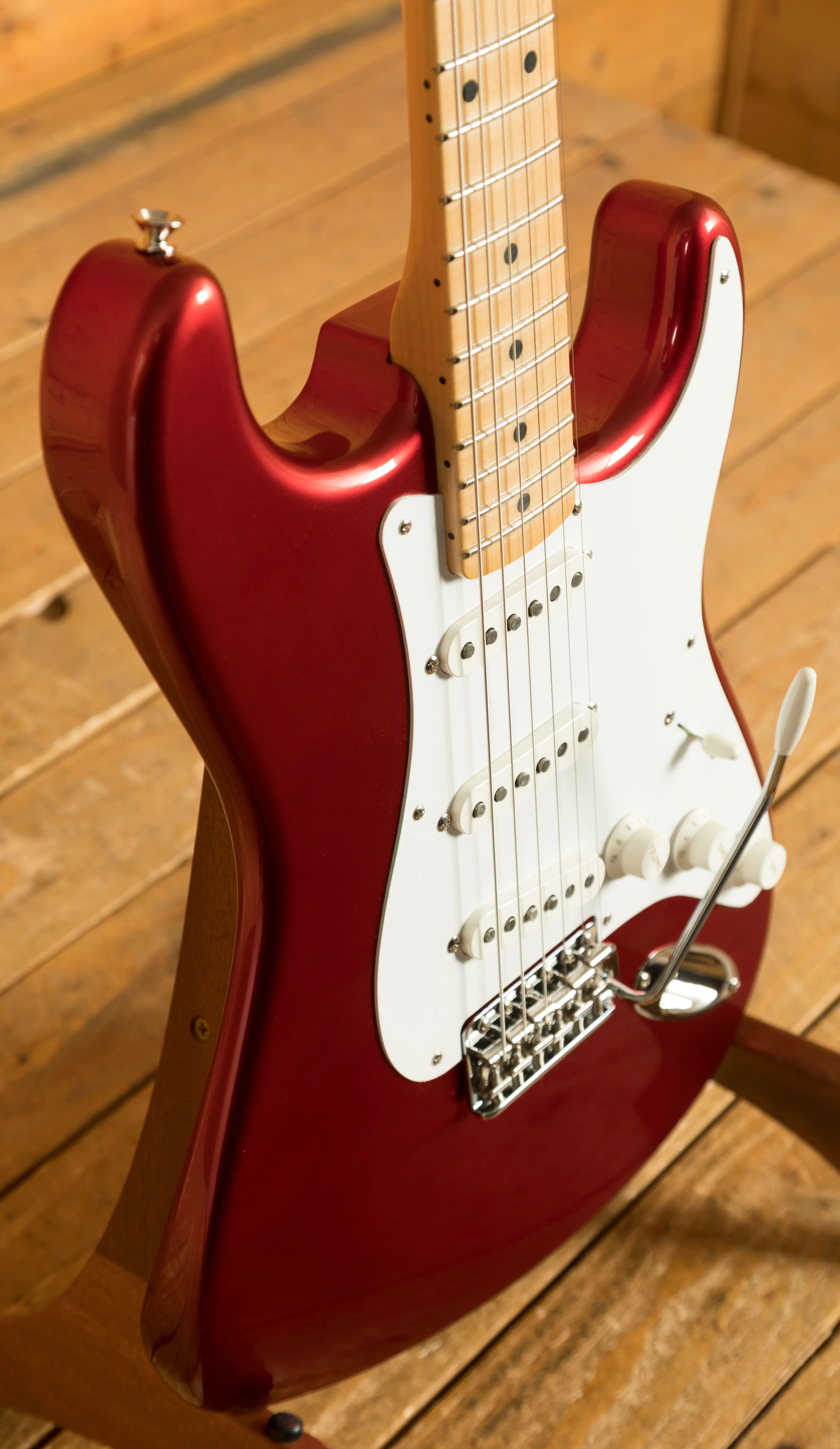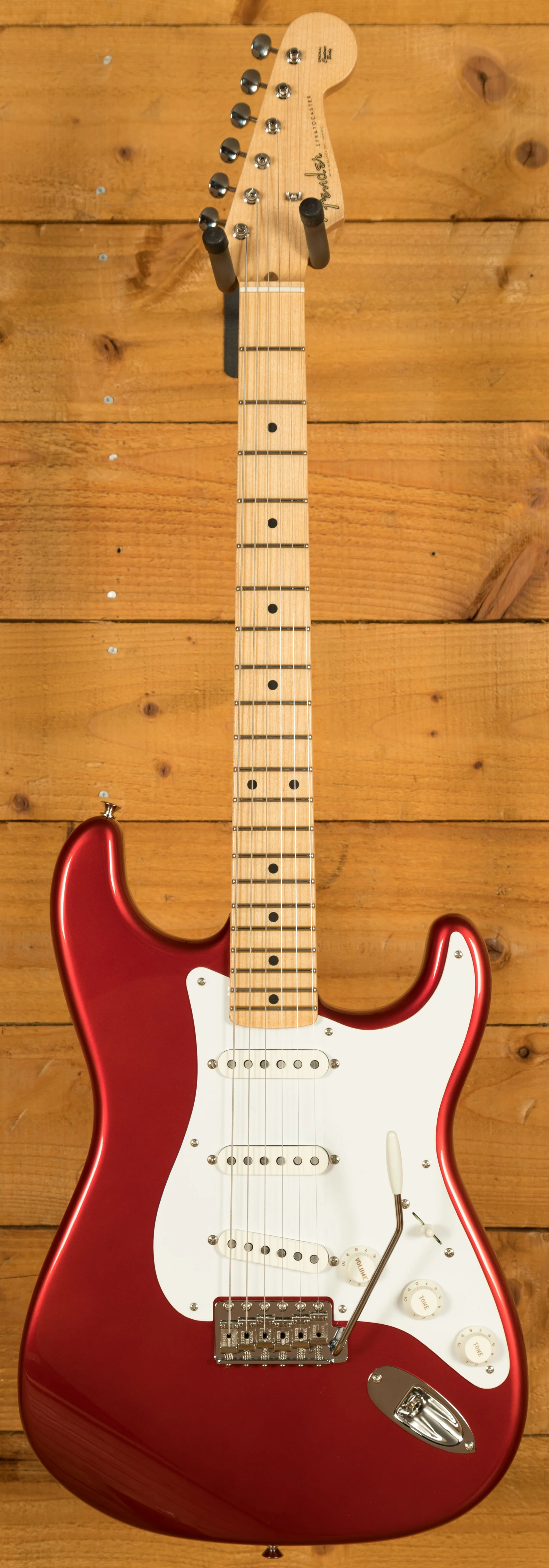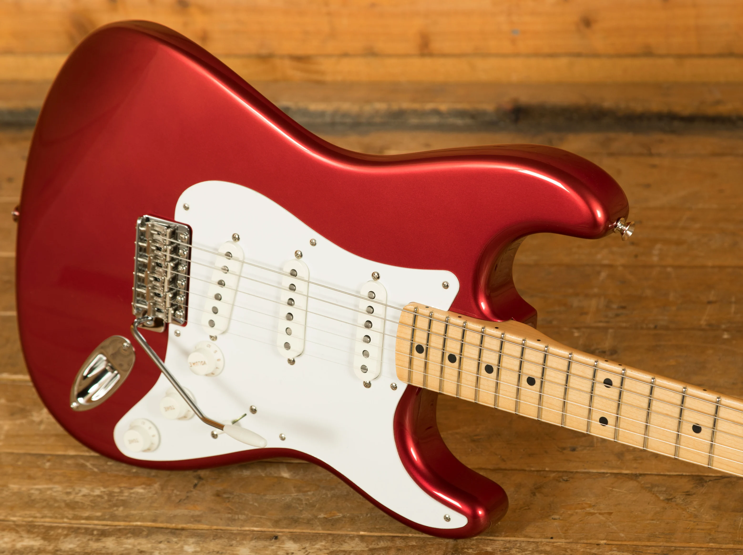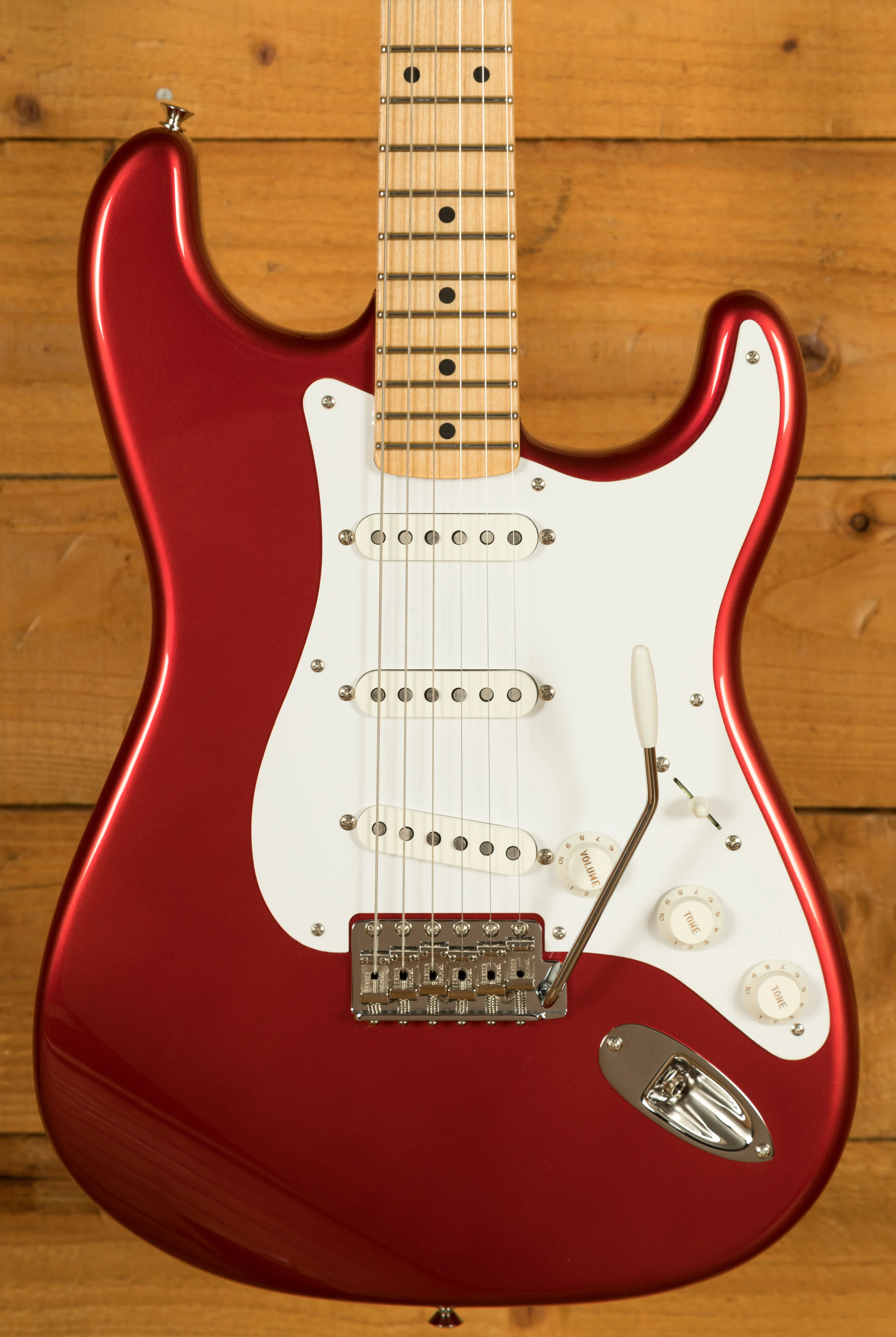 The Alder body is finished in a dazzling Candy Apple Red nitro lacquer, period correct, this finish will wear beautifully with time and develop its own character even further. It also allows the natural resonance of the body to sing and sustain much more effectively compared with other finishes. The NOS finish gives the appearance of a New Old Stock guitar, one that has been perfectly preserved since 1957 and doesn't feature any kind of ageing or relic work.