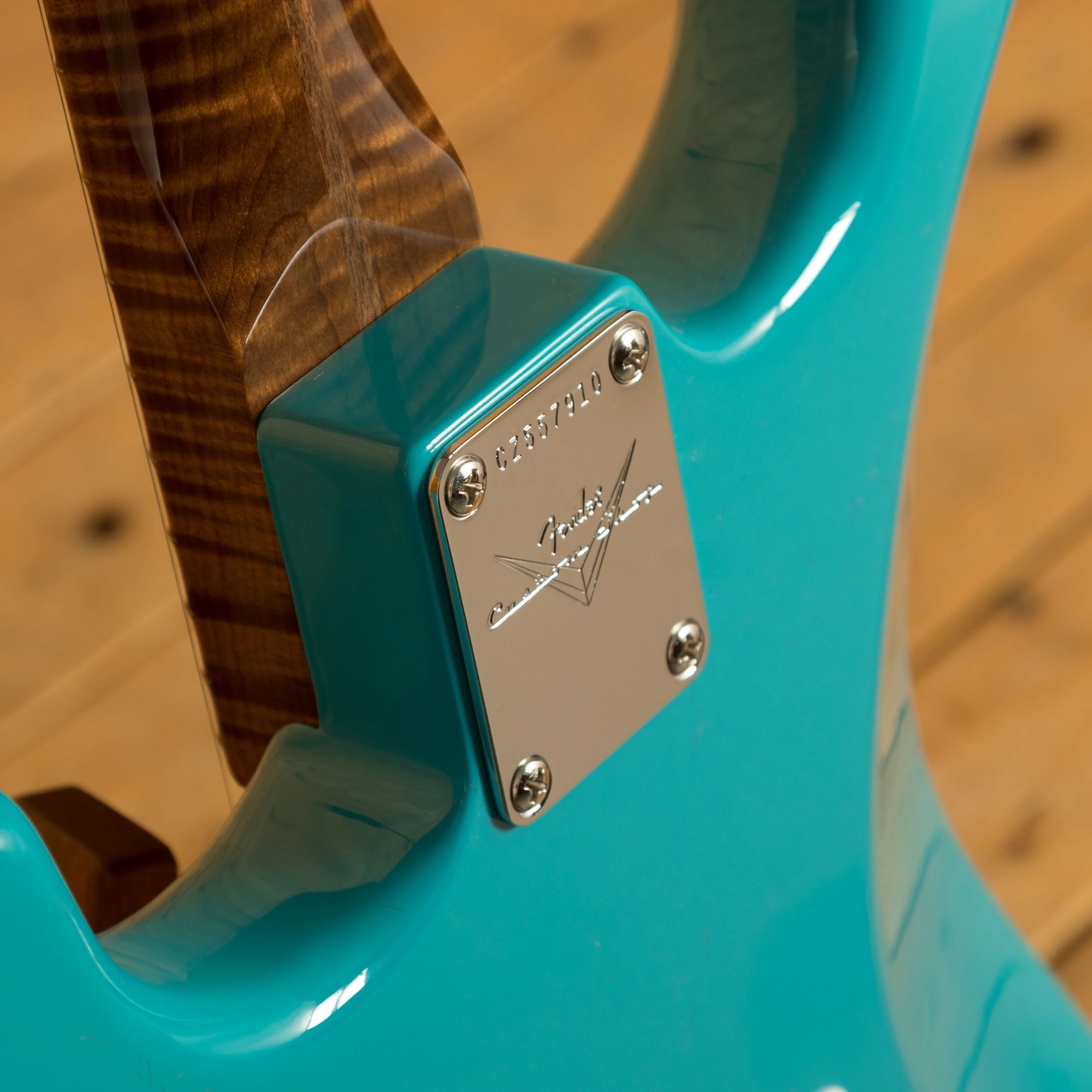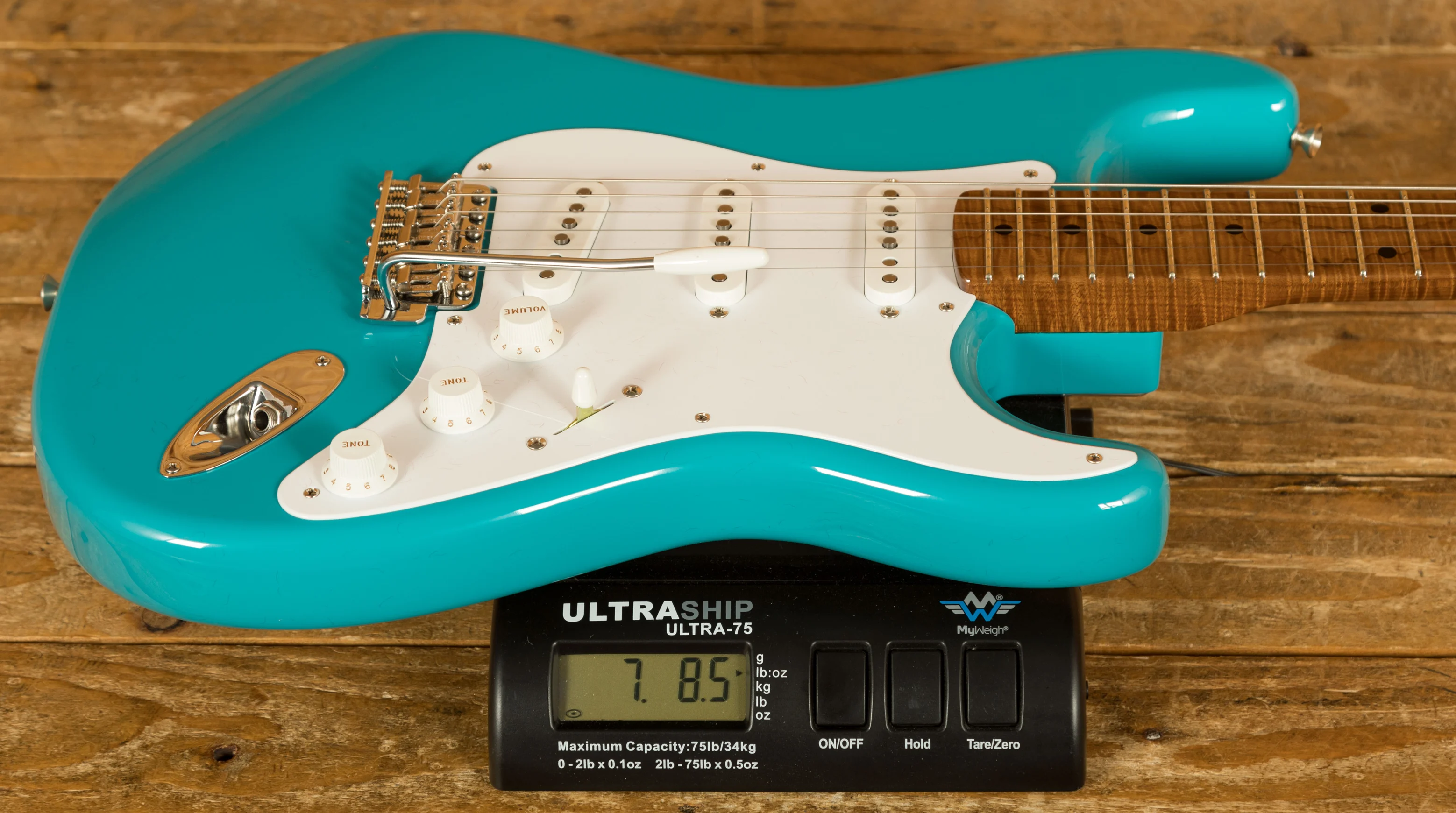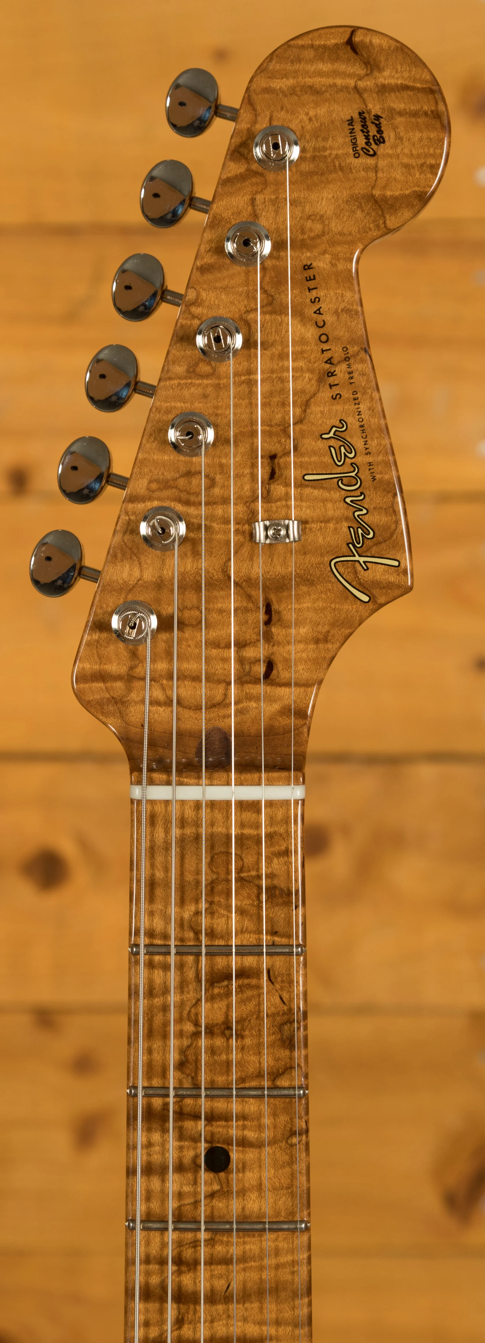 The Roasted 3A Flame Maple neck is truly breathtaking. The Maple fingerboard features a 9.5" radius and 21 narrow tall frets, the '57s Custom Shop Stratocaster can handle anything you throw at it without even breaking a sweat; it's supremely comfortable and well balanced. The 57s style soft "V" profile is a joy to play and offers a great platform for both rhythm and lead playing. It measures at .850" at the 1st fret and .990" at the 12th fret.