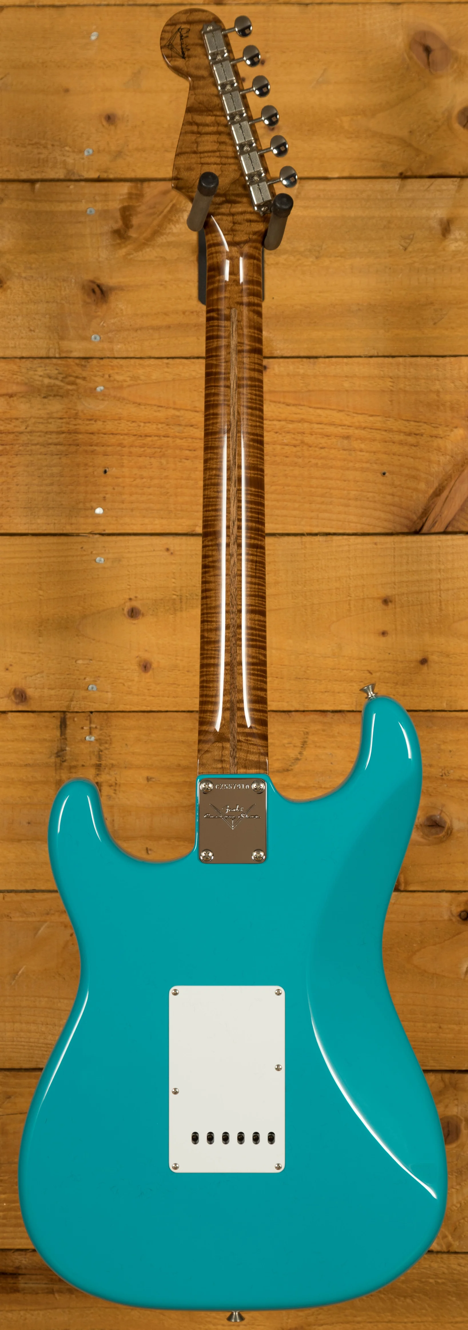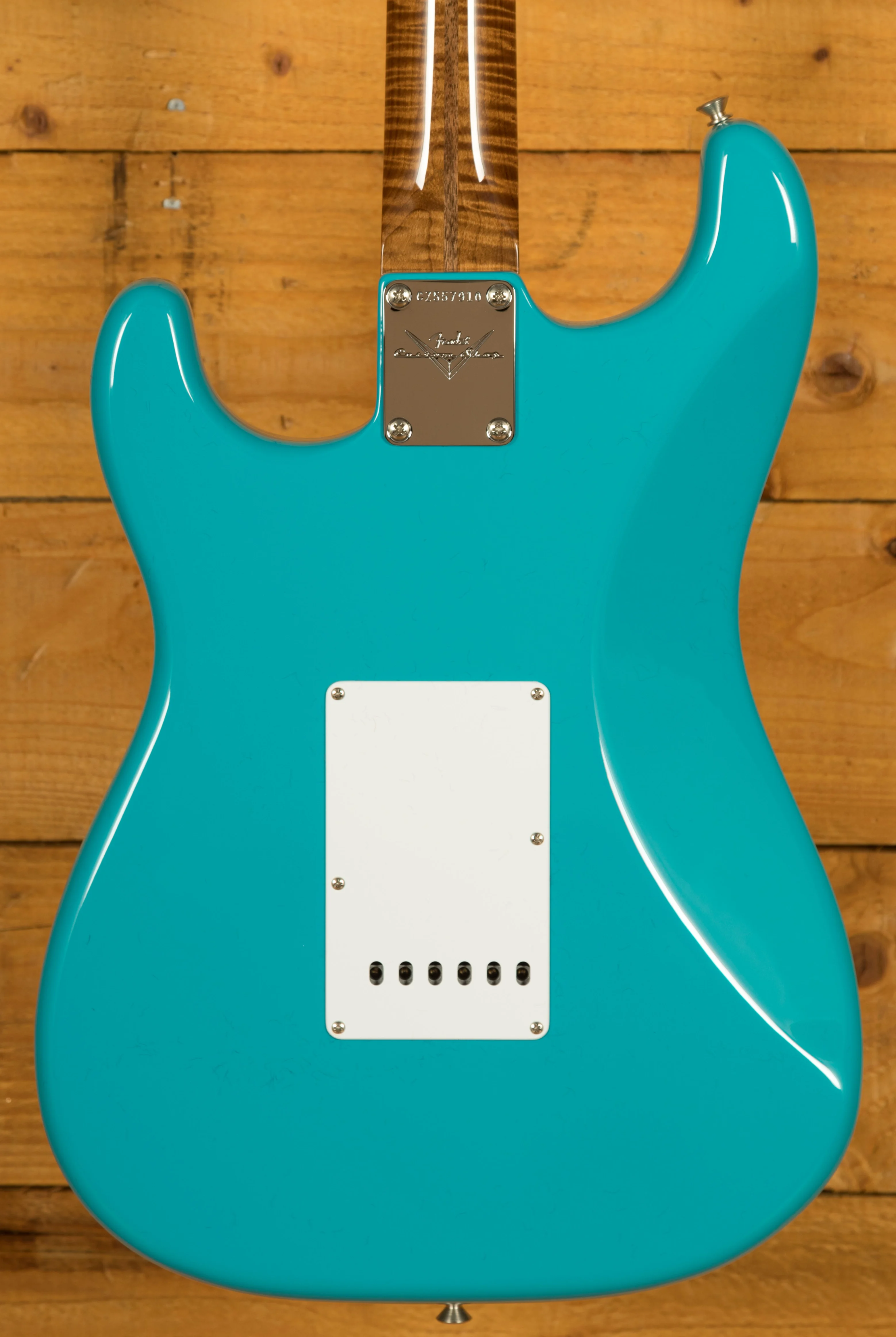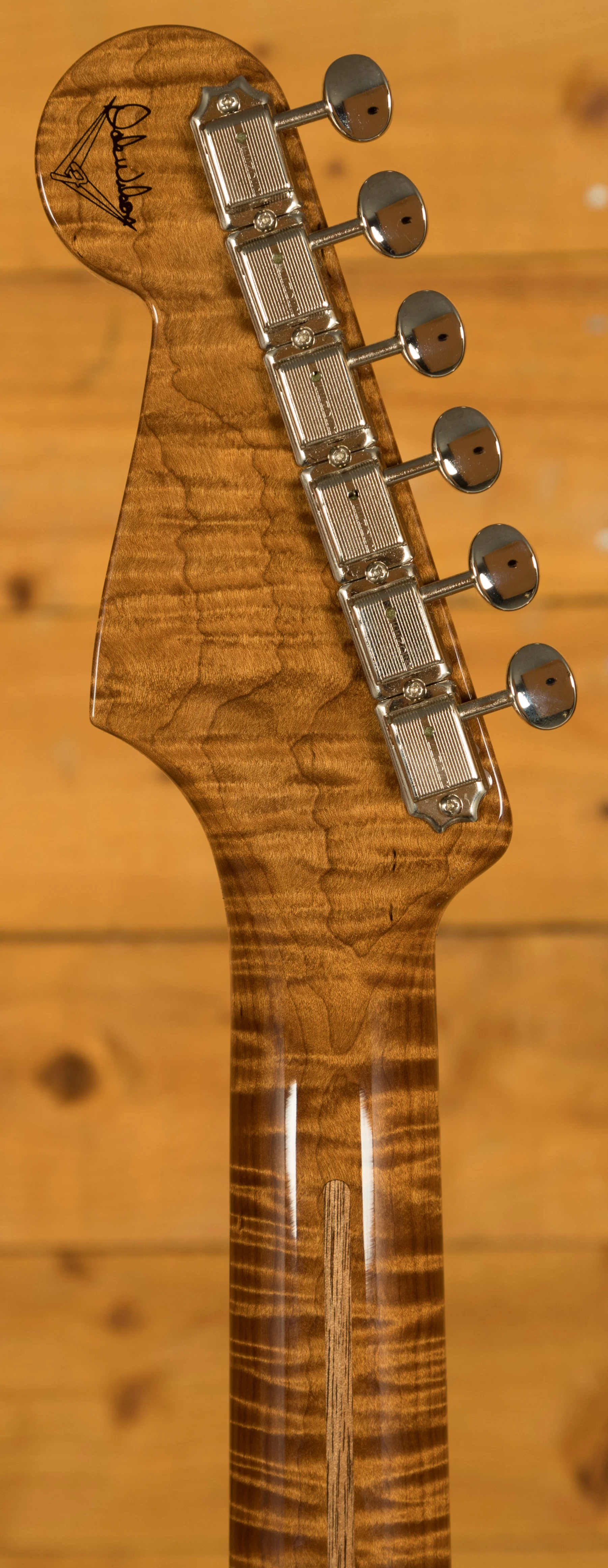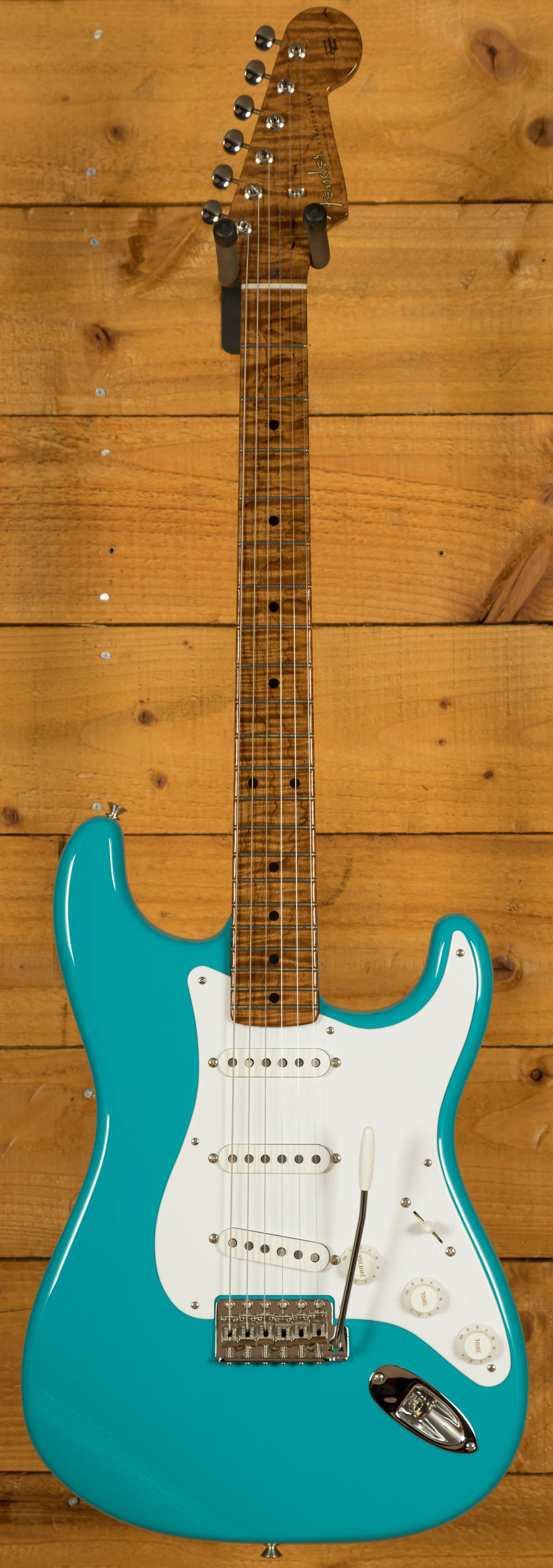 The Roasted 3A Flame Maple neck is truly breathtaking. The Maple fingerboard features a 9.5" radius and 21 narrow tall frets, the '57s Custom Shop Stratocaster can handle anything you throw at it without even breaking a sweat; it's supremely comfortable and well balanced. The 57s style soft "V" profile is a joy to play and offers a great platform for both rhythm and lead playing. It measures at .850" at the 1st fret and .990" at the 12th fret.