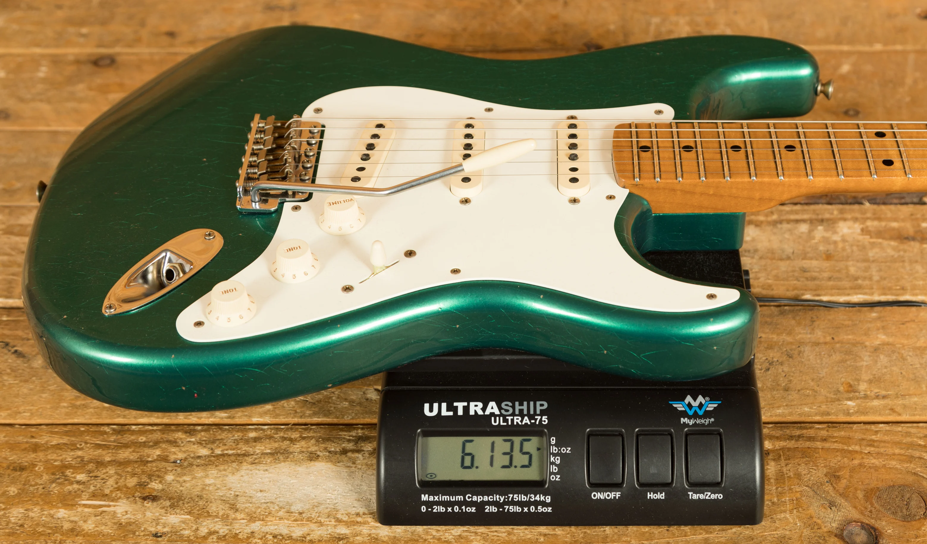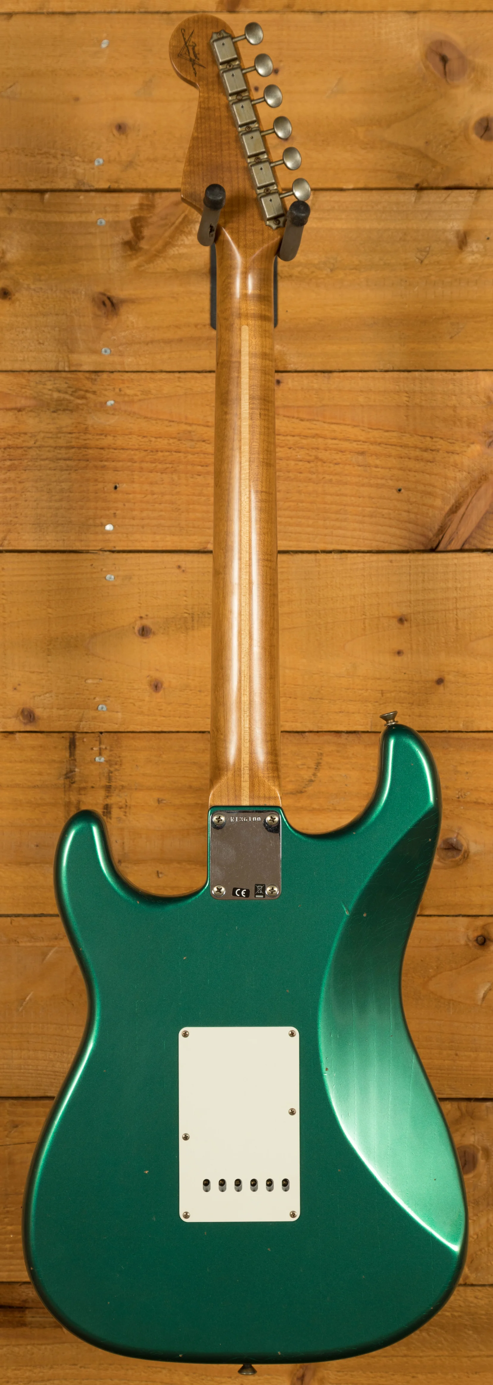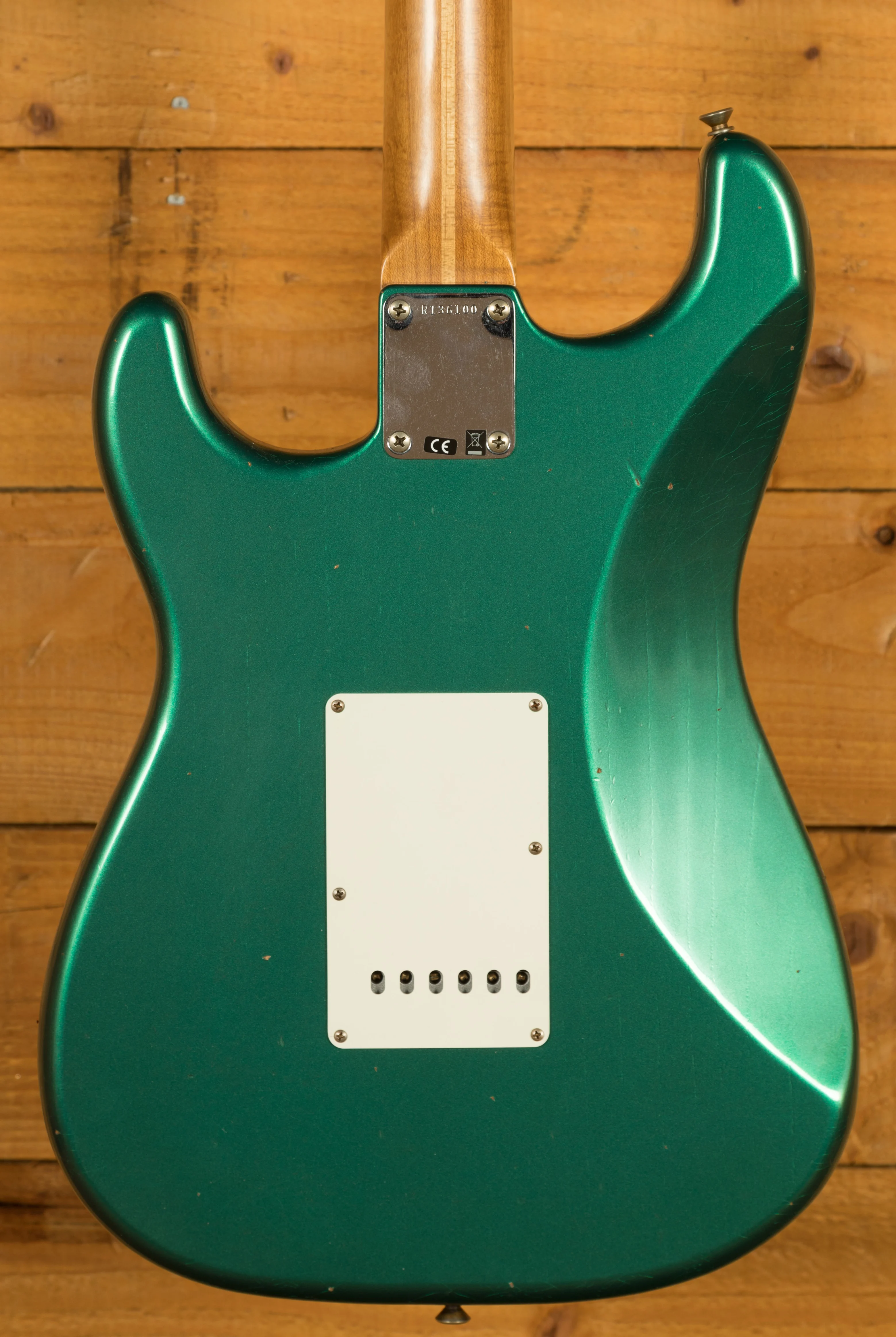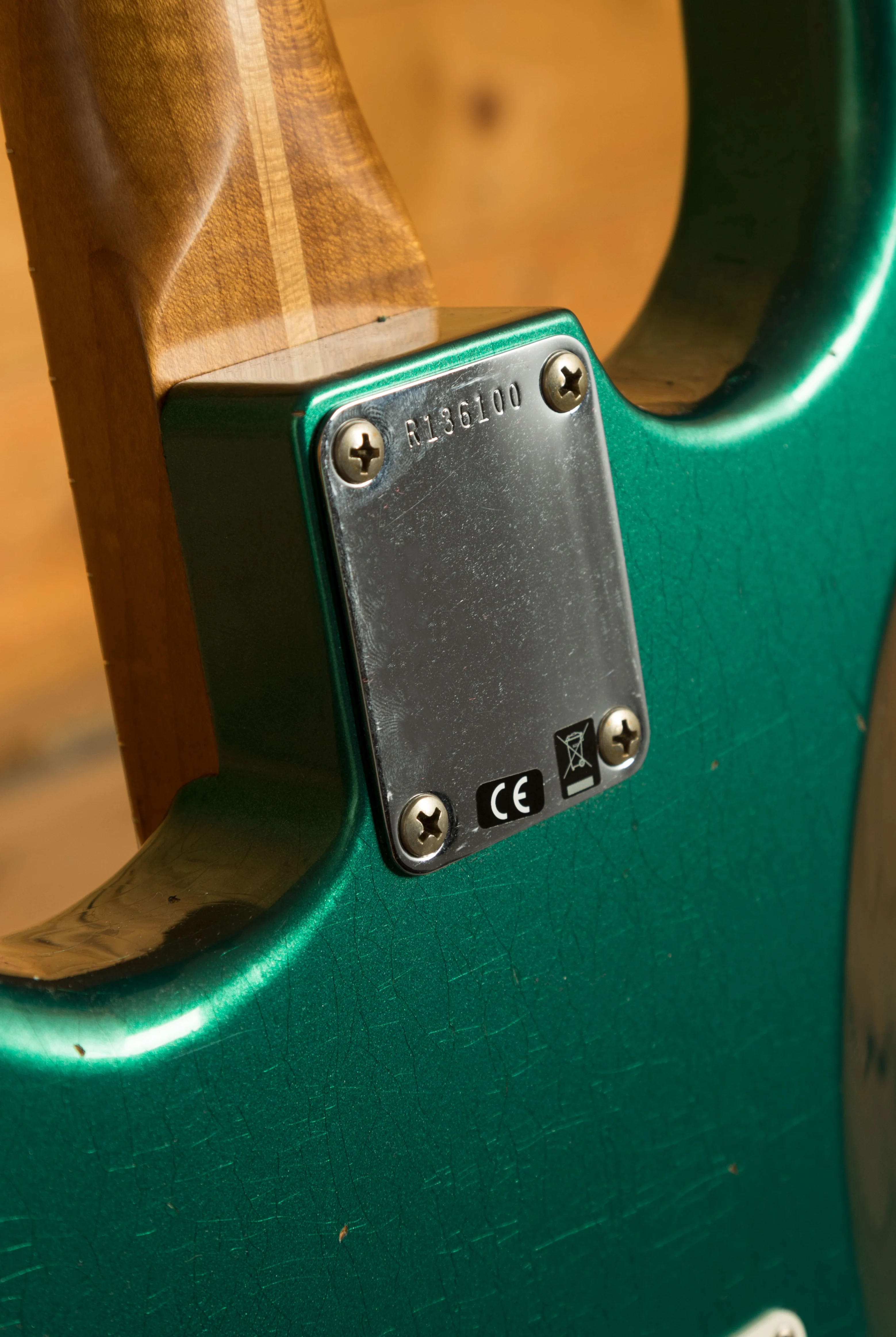 The Roasted Ash body is finished in a sleek British Racing Green nitro lacquer, this Strat boasts a Journeyman finish. The Journeyman is a very lightly aged nitro finish; this gives the look and feel of a vintage guitar that has been lovingly cared for over the years. This finish will wear beautifully with time and develop its own character even further. It also allows the natural resonance of the body to sing and sustain much more effectively compared with other more modern finishes.