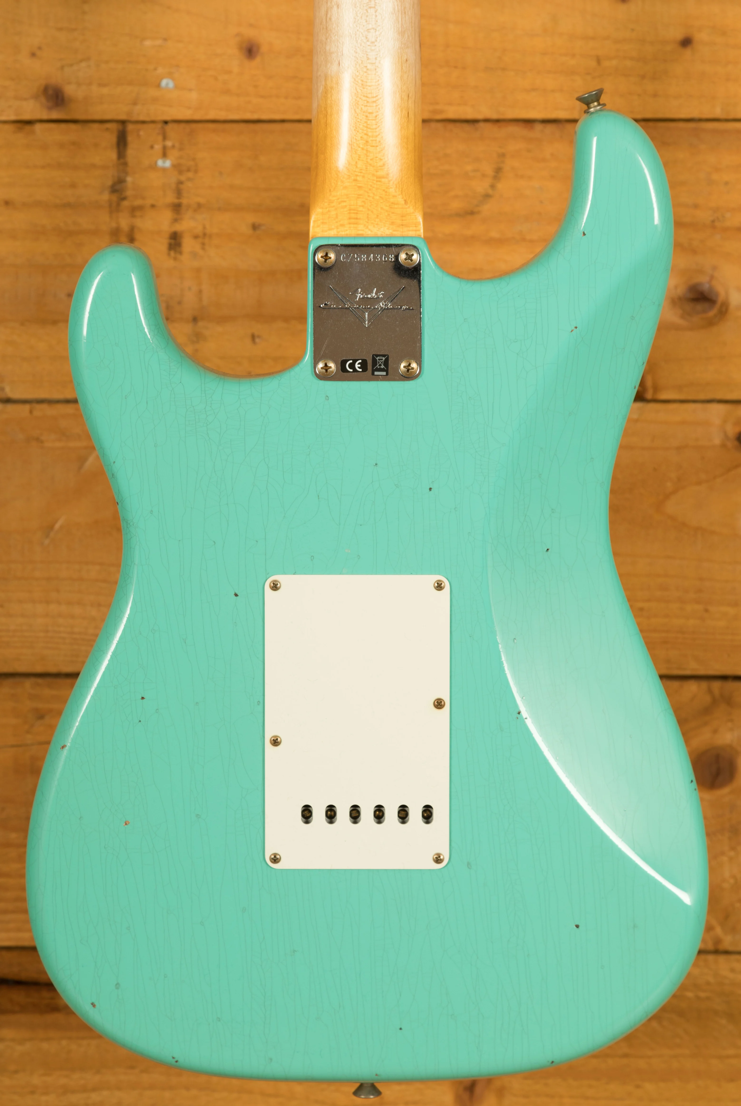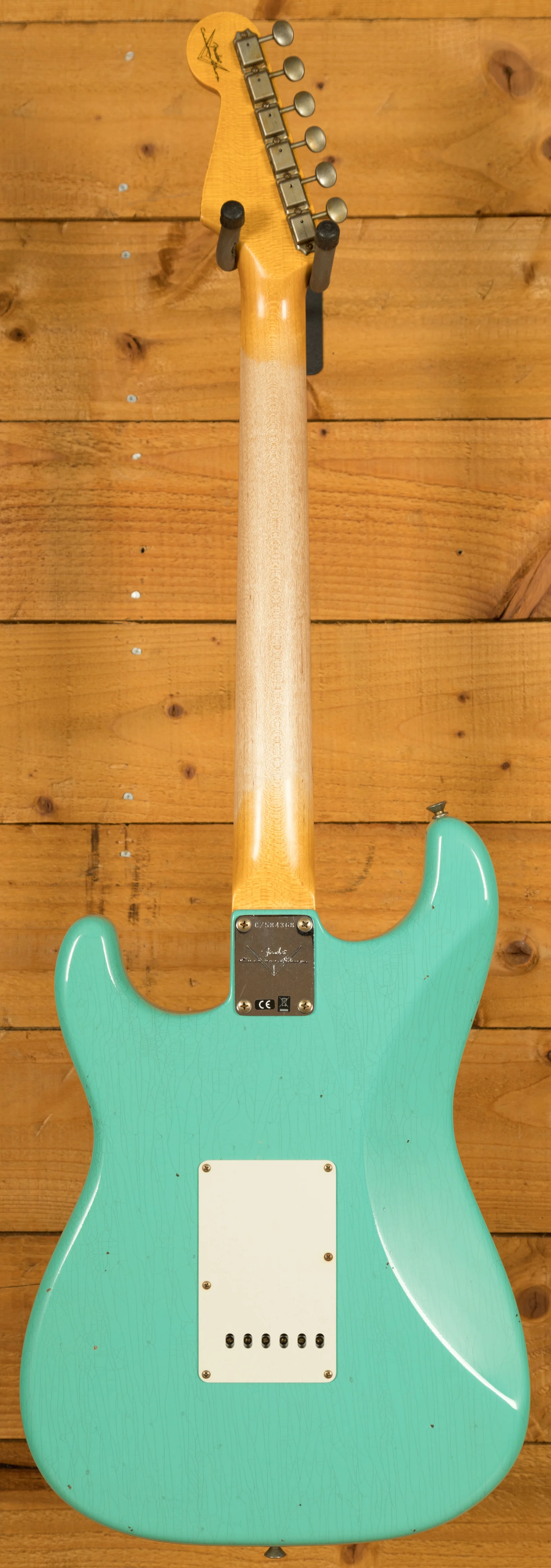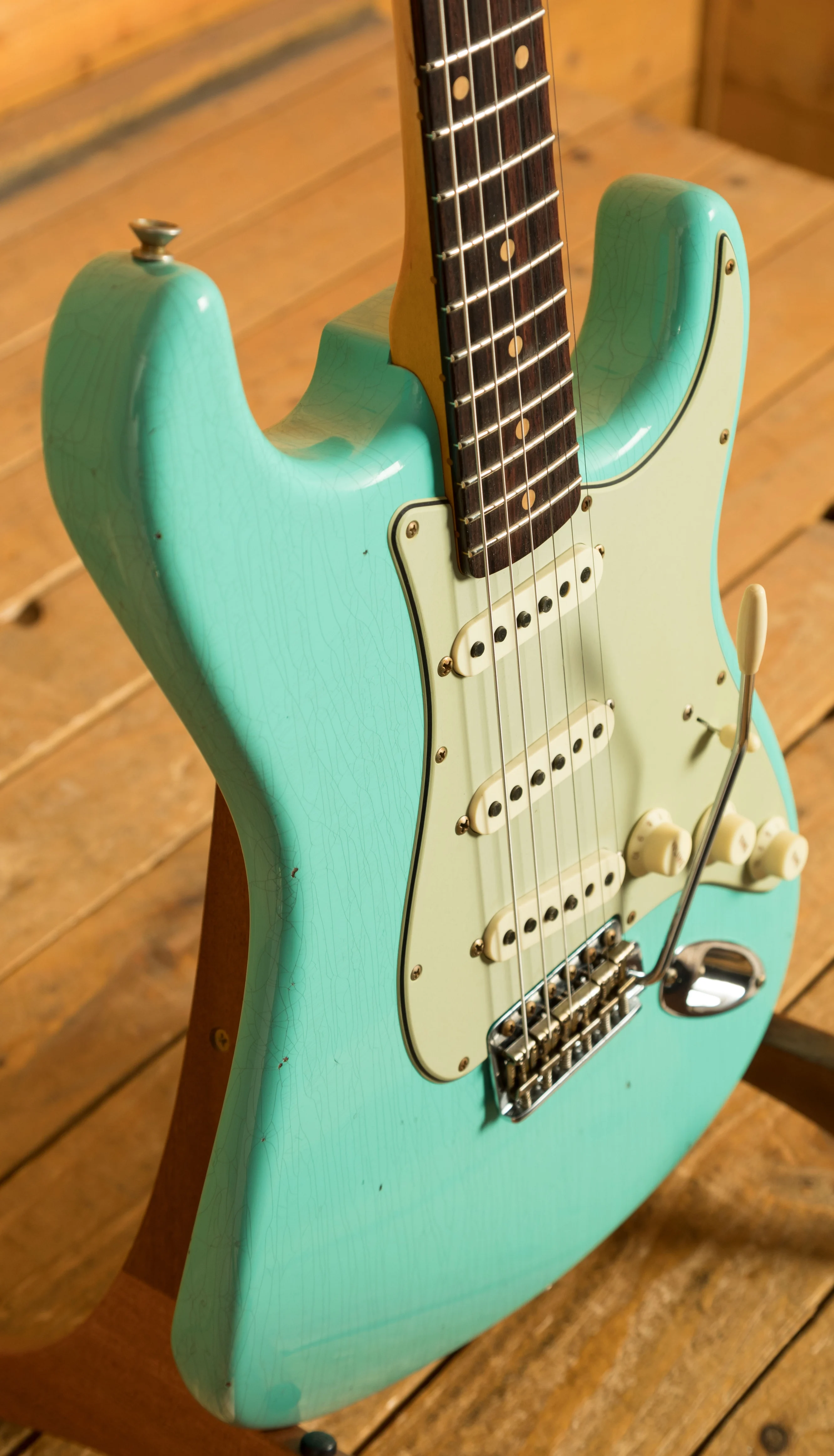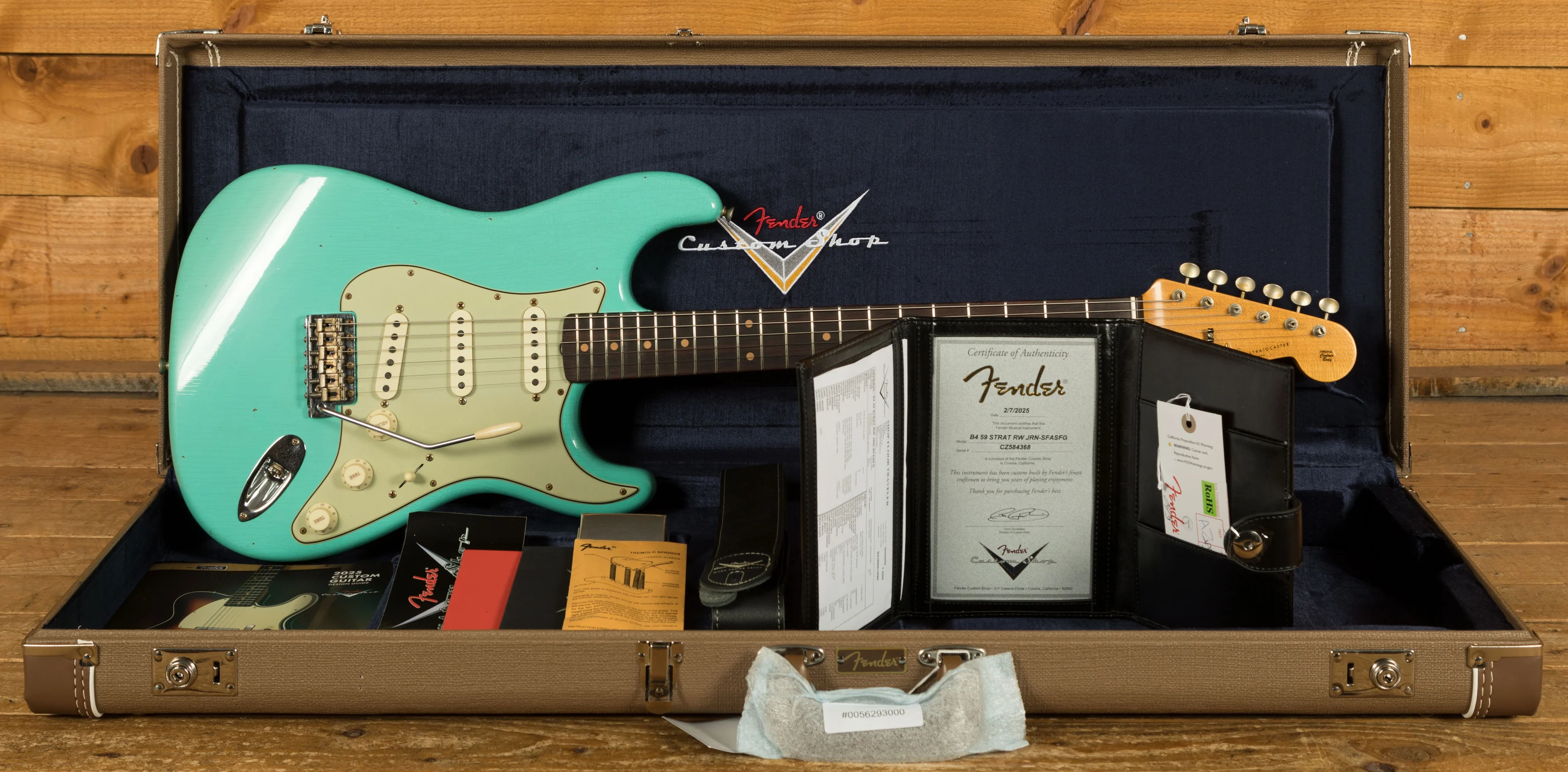 Experience the timeless magic of this Fender Custom Shop '59 Strat in Faded Aged Sea Foam Green Journeyman Relic, meticulously crafted at Fender’s Corona, California factory. A faithful recreation of a 1959 Stratocaster, this guitar captures the essence of Fender’s golden era with a 2-piece alder body finished in a Faded Aged Sea Foam Green nitrocellulose lacquer—a soft, vintage hue with a subtle fade that evokes the look of a well-loved classic. The Journeyman Relic treatment adds light lacquer checking, minor dings, and gently worn hardware, giving it the appearance of a guitar that’s been cherished for decades while remaining brand new straight from the factory. The quartersawn maple neck, carved to a ‘59 “C” profile (.800" at 1st fret, .980" at 12th), is paired with a rosewood fingerboard featuring a 9.5" radius, 21 medium frets (6105), and vintage clay dot inlays, offering a 25.5" scale length for an authentic ‘50s playing experience.