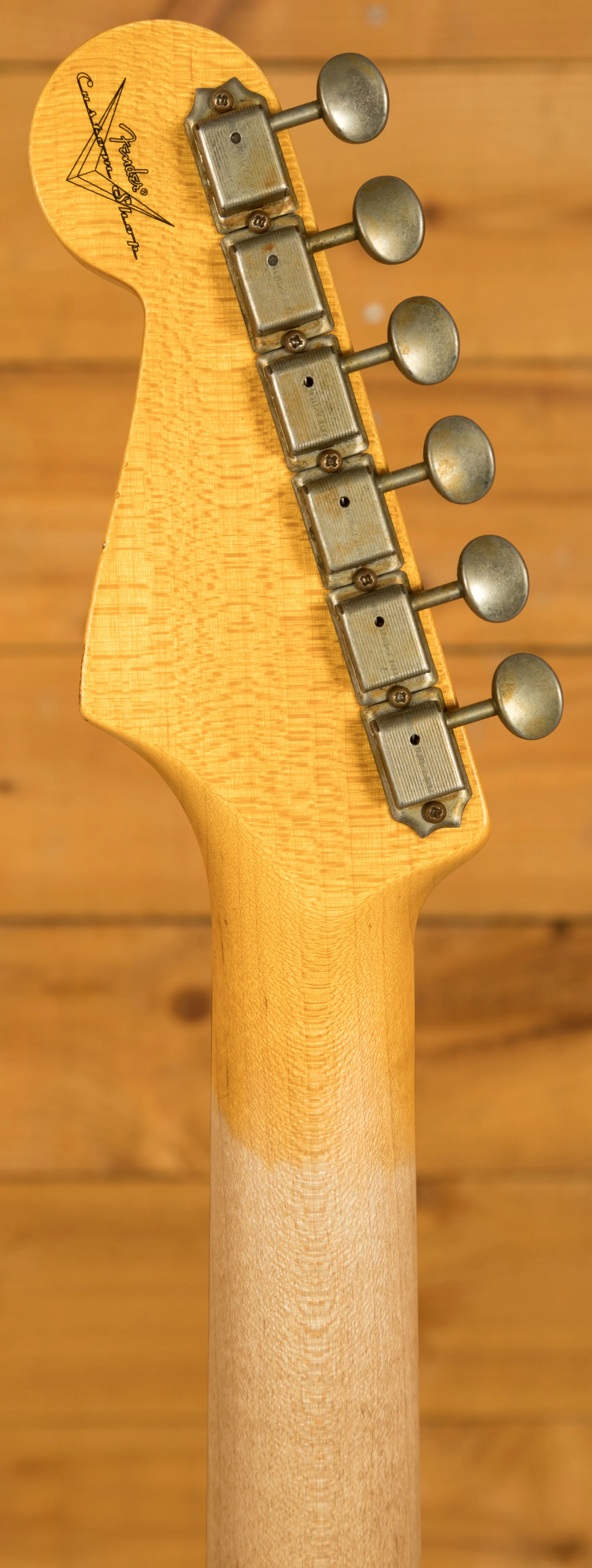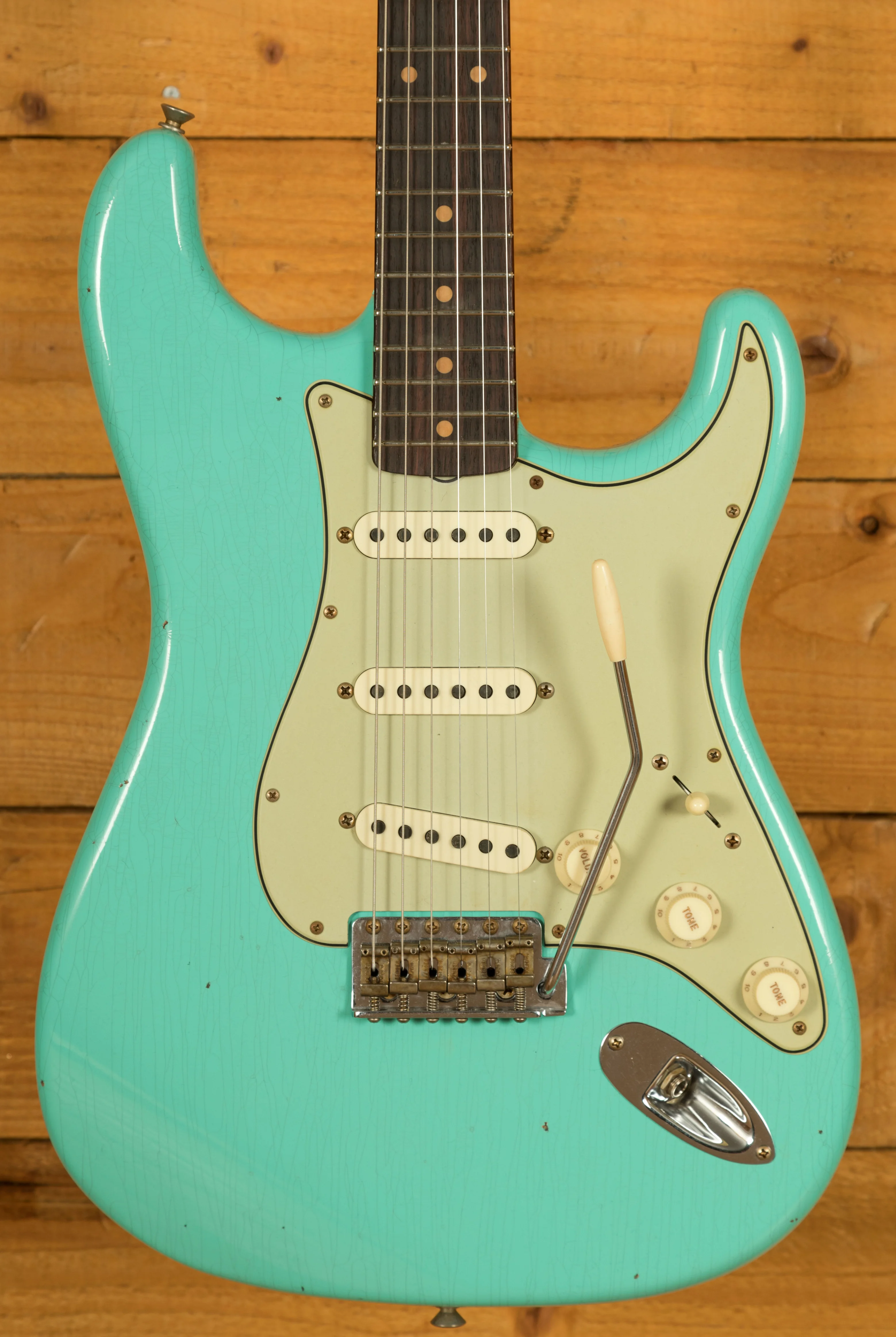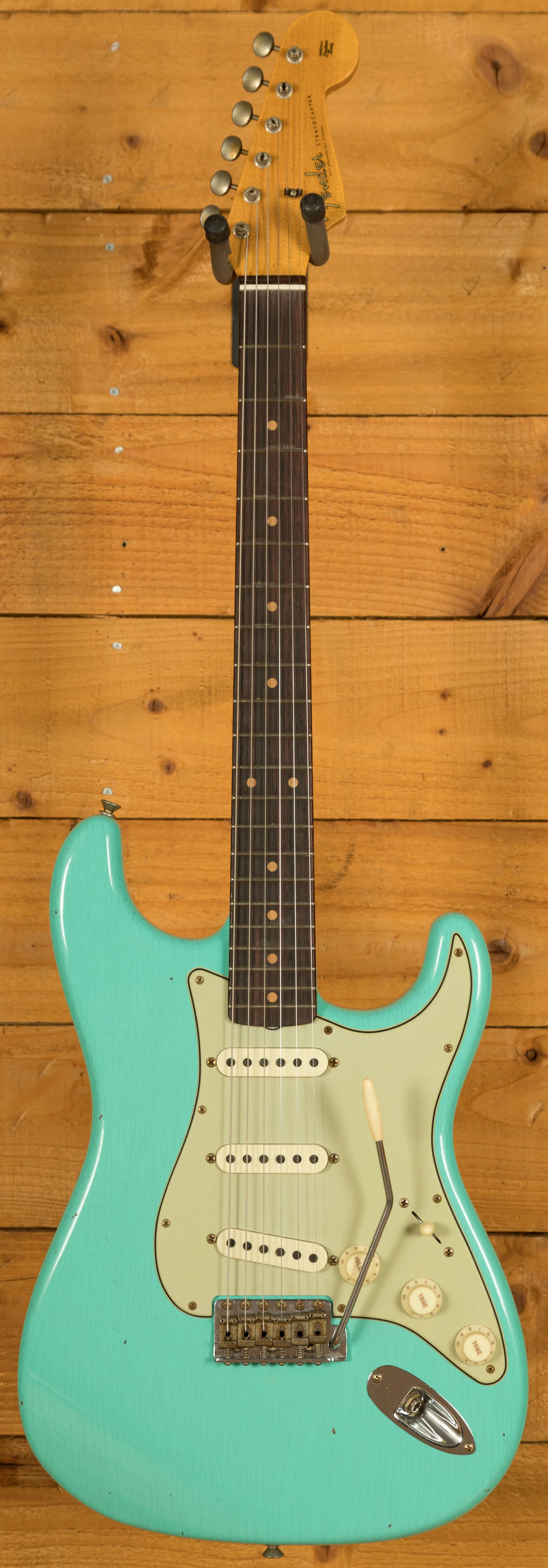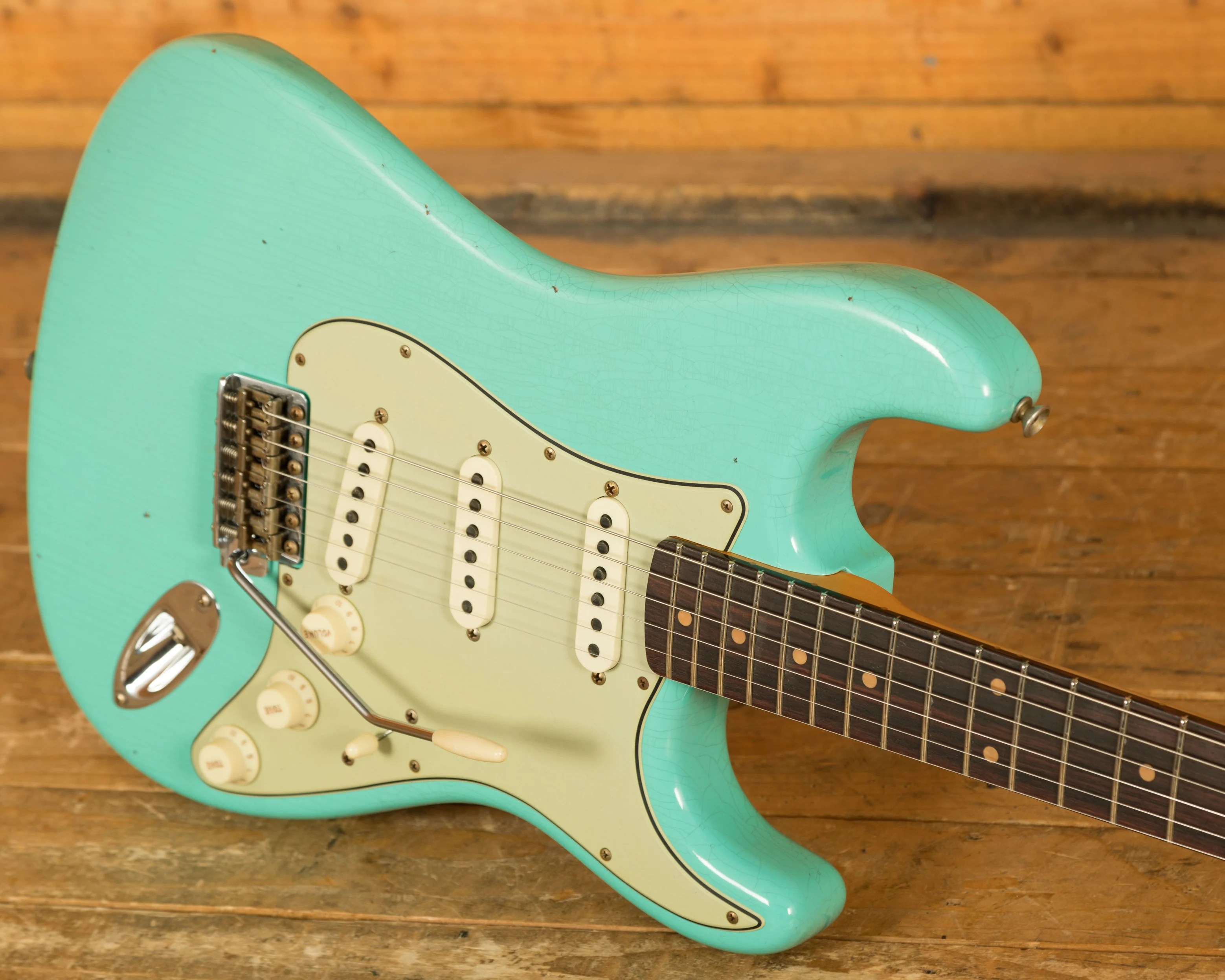 Experience the timeless magic of this Fender Custom Shop '59 Strat in Faded Aged Sea Foam Green Journeyman Relic, meticulously crafted at Fender’s Corona, California factory. A faithful recreation of a 1959 Stratocaster, this guitar captures the essence of Fender’s golden era with a 2-piece alder body finished in a Faded Aged Sea Foam Green nitrocellulose lacquer—a soft, vintage hue with a subtle fade that evokes the look of a well-loved classic. The Journeyman Relic treatment adds light lacquer checking, minor dings, and gently worn hardware, giving it the appearance of a guitar that’s been cherished for decades while remaining brand new straight from the factory. The quartersawn maple neck, carved to a ‘59 “C” profile (.800" at 1st fret, .980" at 12th), is paired with a rosewood fingerboard featuring a 9.5" radius, 21 medium frets (6105), and vintage clay dot inlays, offering a 25.5" scale length for an authentic ‘50s playing experience.