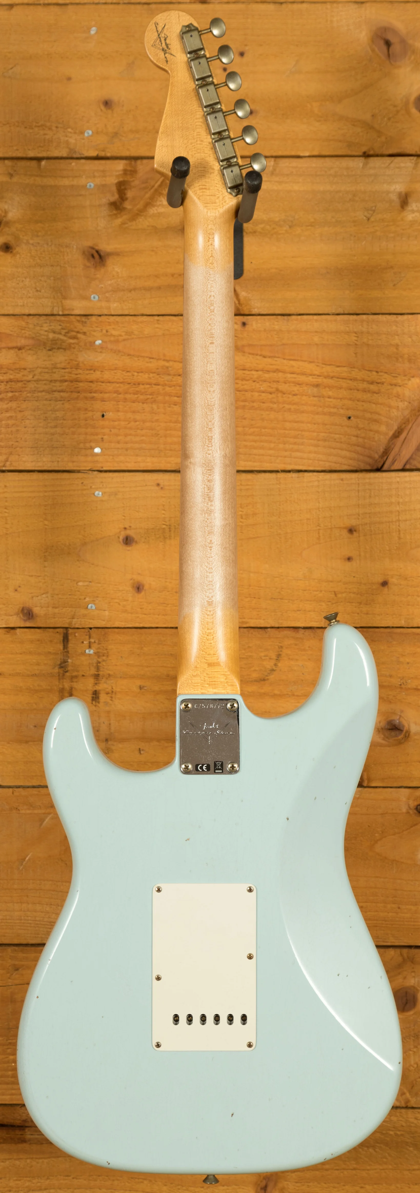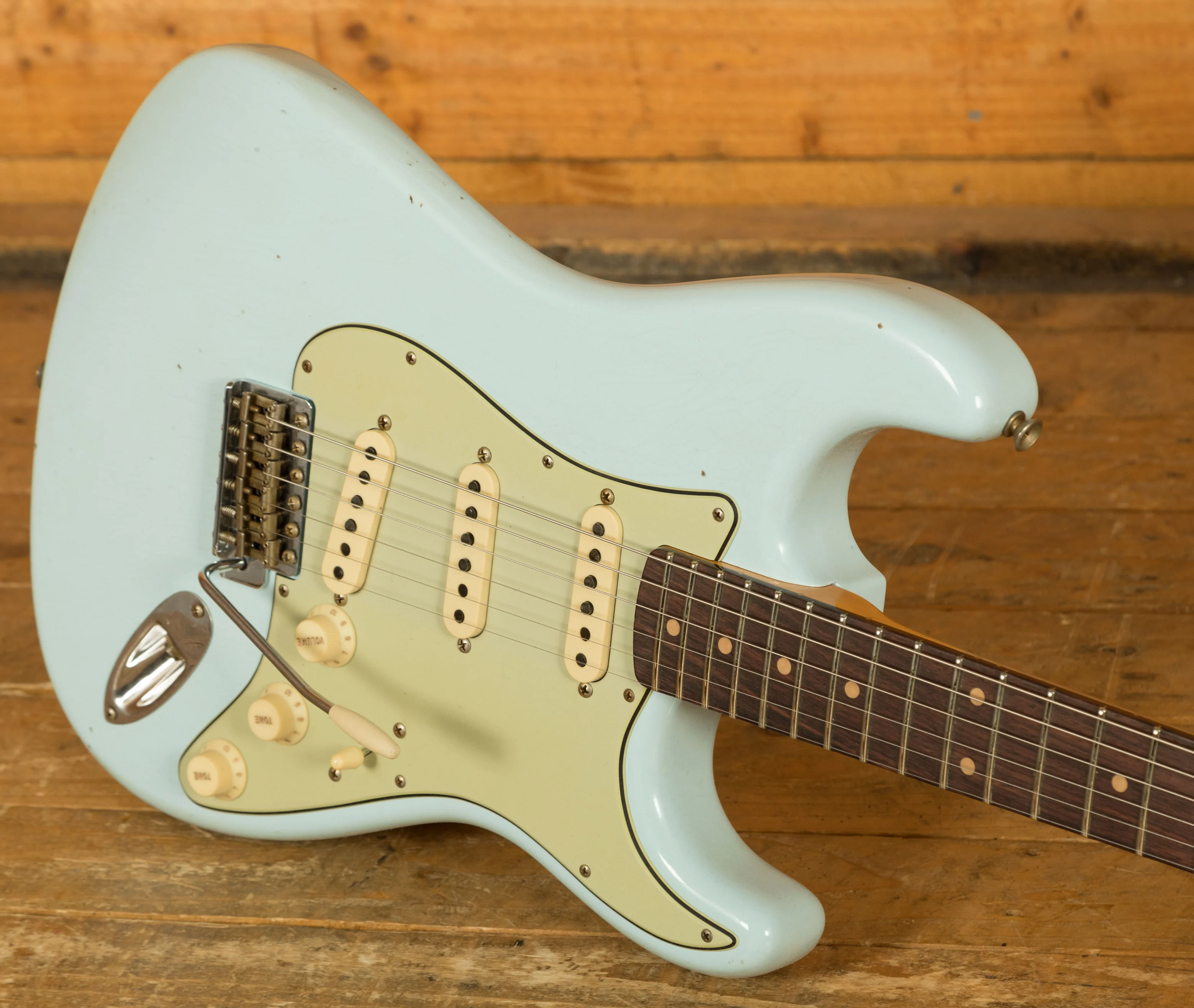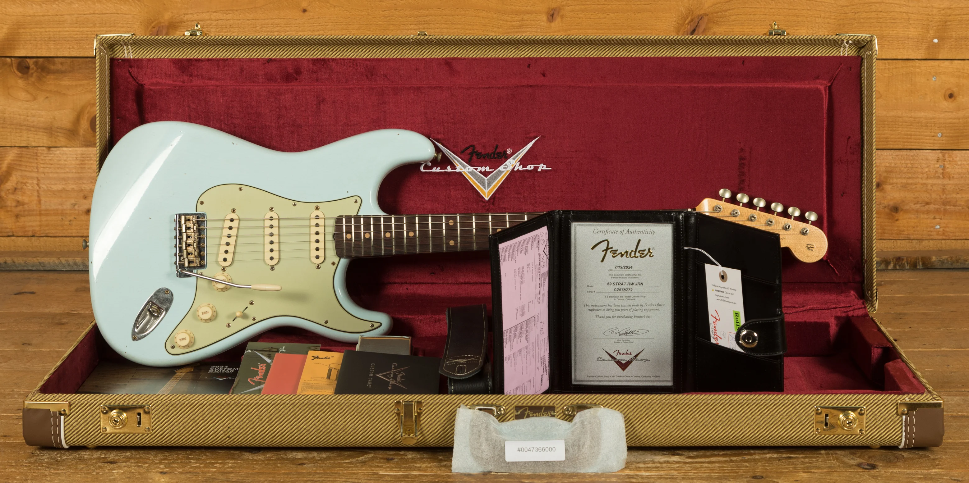 For this custom build, John made a few modifications: the fret material was changed from the standard 6105 to 6100, offering jumbo rather than tall and narrow frets. The pickups were swapped from Custom Shop Hand-Wound Fat '50s Strat to Hand-Wound '59 Strat pickups. The finish was also updated from 'Super Faded Aged Shell Pink' to 'Sonic Blue.'