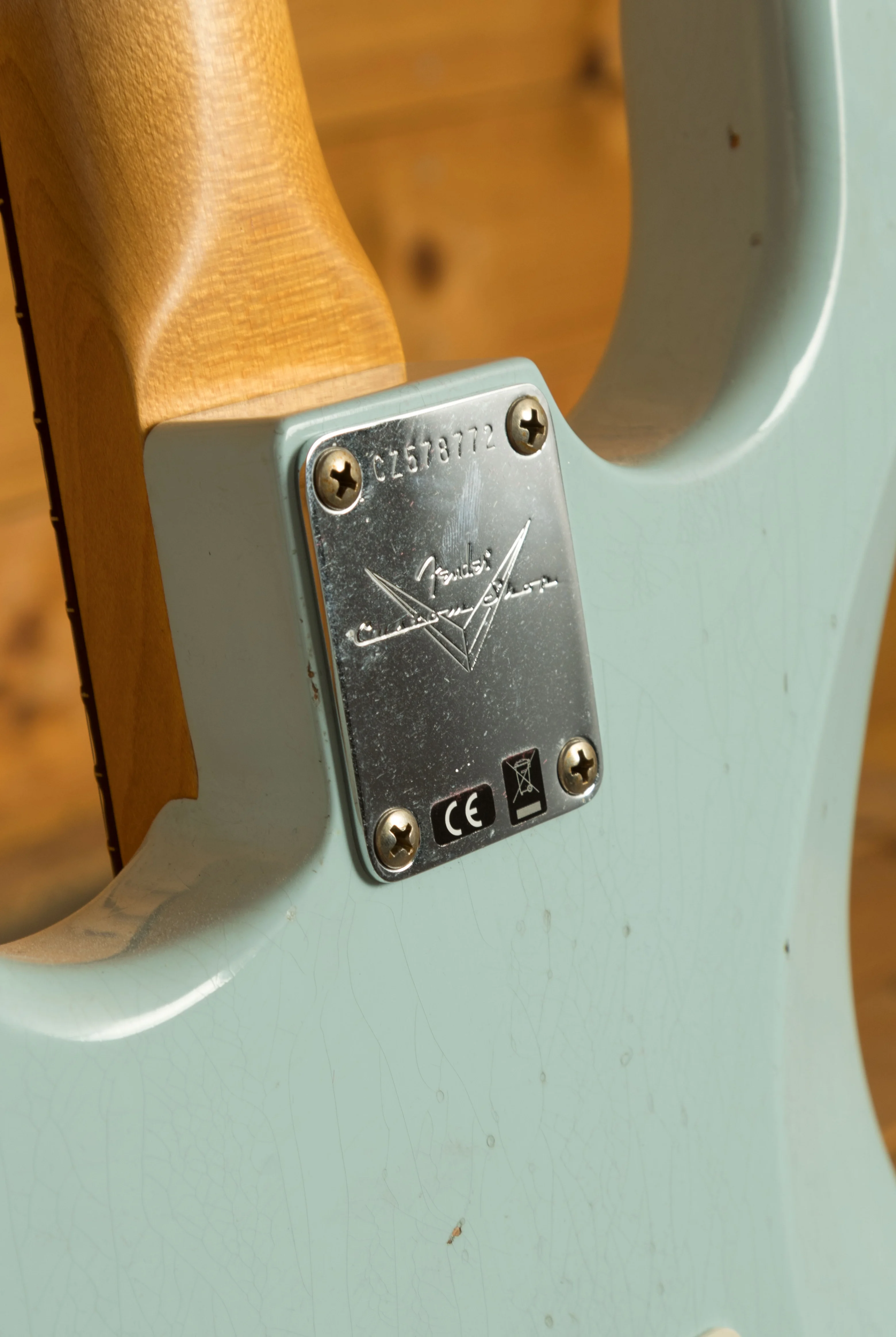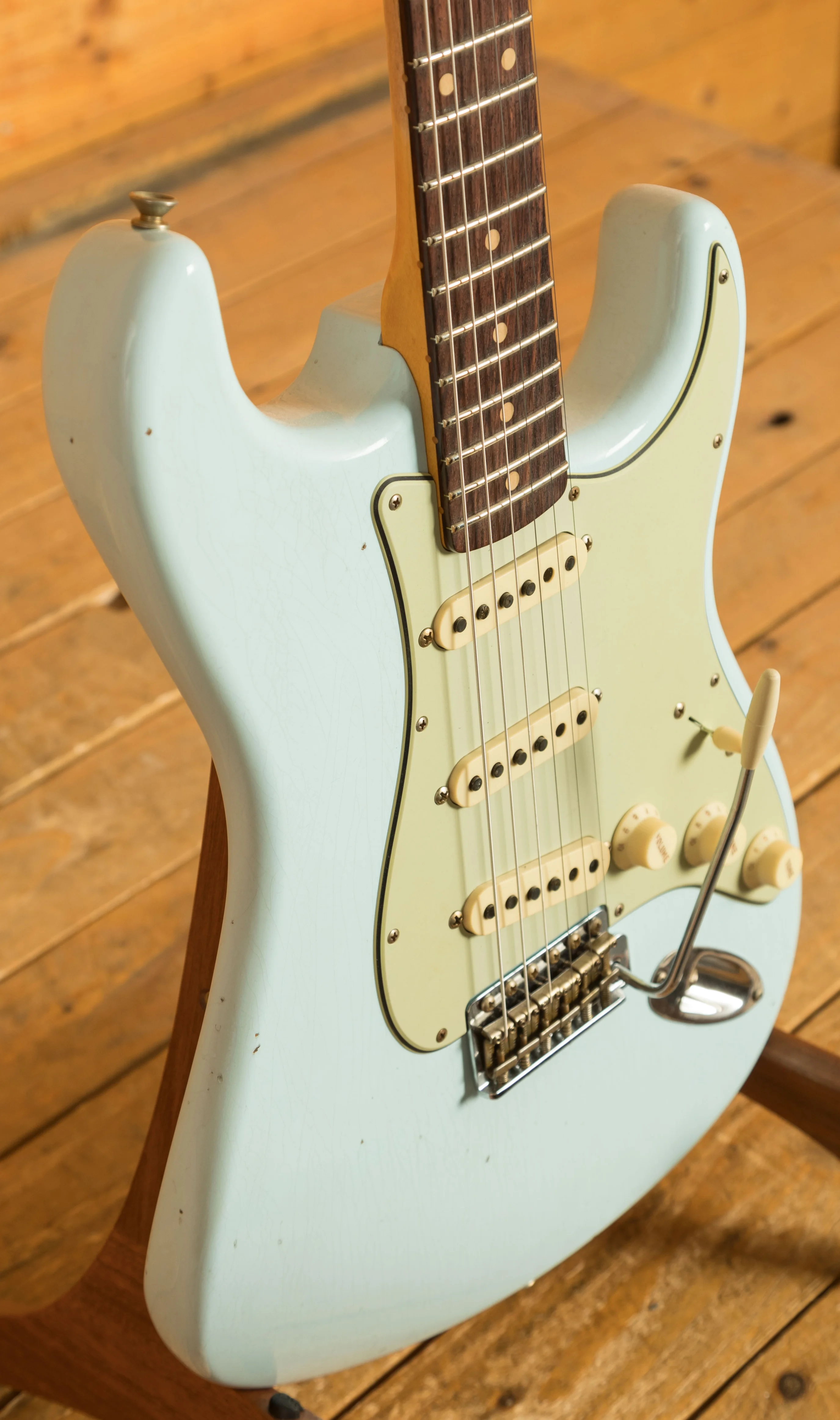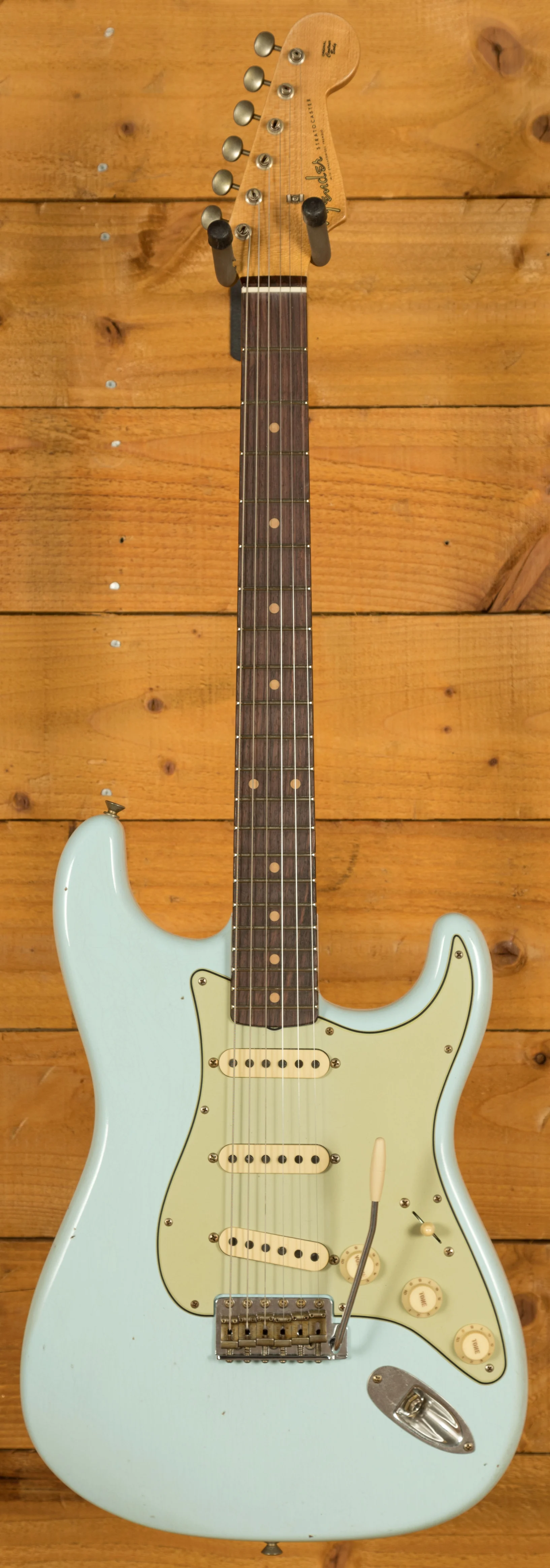 For this custom build, John made a few modifications: the fret material was changed from the standard 6105 to 6100, offering jumbo rather than tall and narrow frets. The pickups were swapped from Custom Shop Hand-Wound Fat '50s Strat to Hand-Wound '59 Strat pickups. The finish was also updated from 'Super Faded Aged Shell Pink' to 'Sonic Blue.'