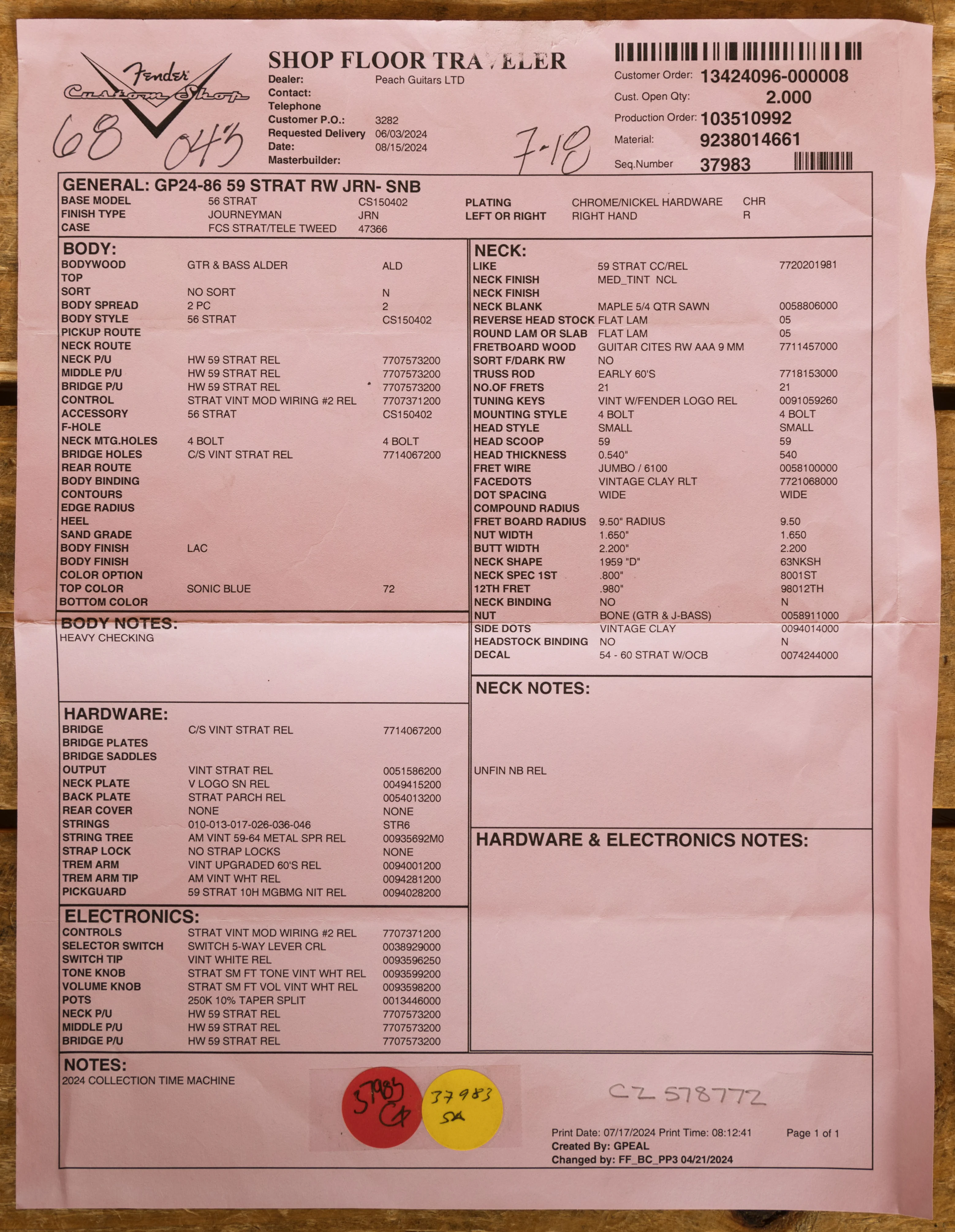 This is really exciting - a custom build that John designed specifically for Peach. The guitar is inspired by the Time Machine 1959 Stratocaster Journeyman Relic, a model from Fender's current Custom Shop lineup.