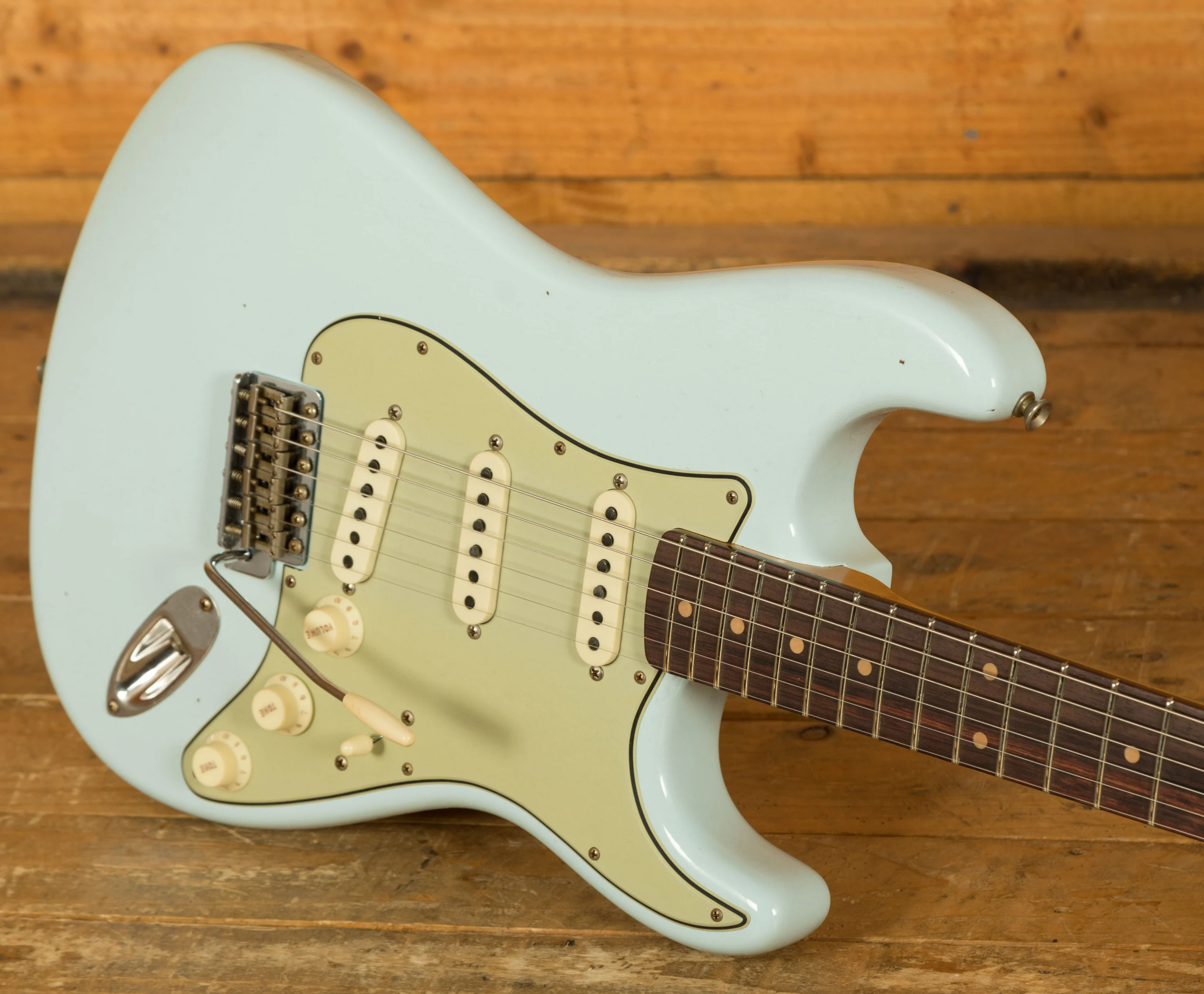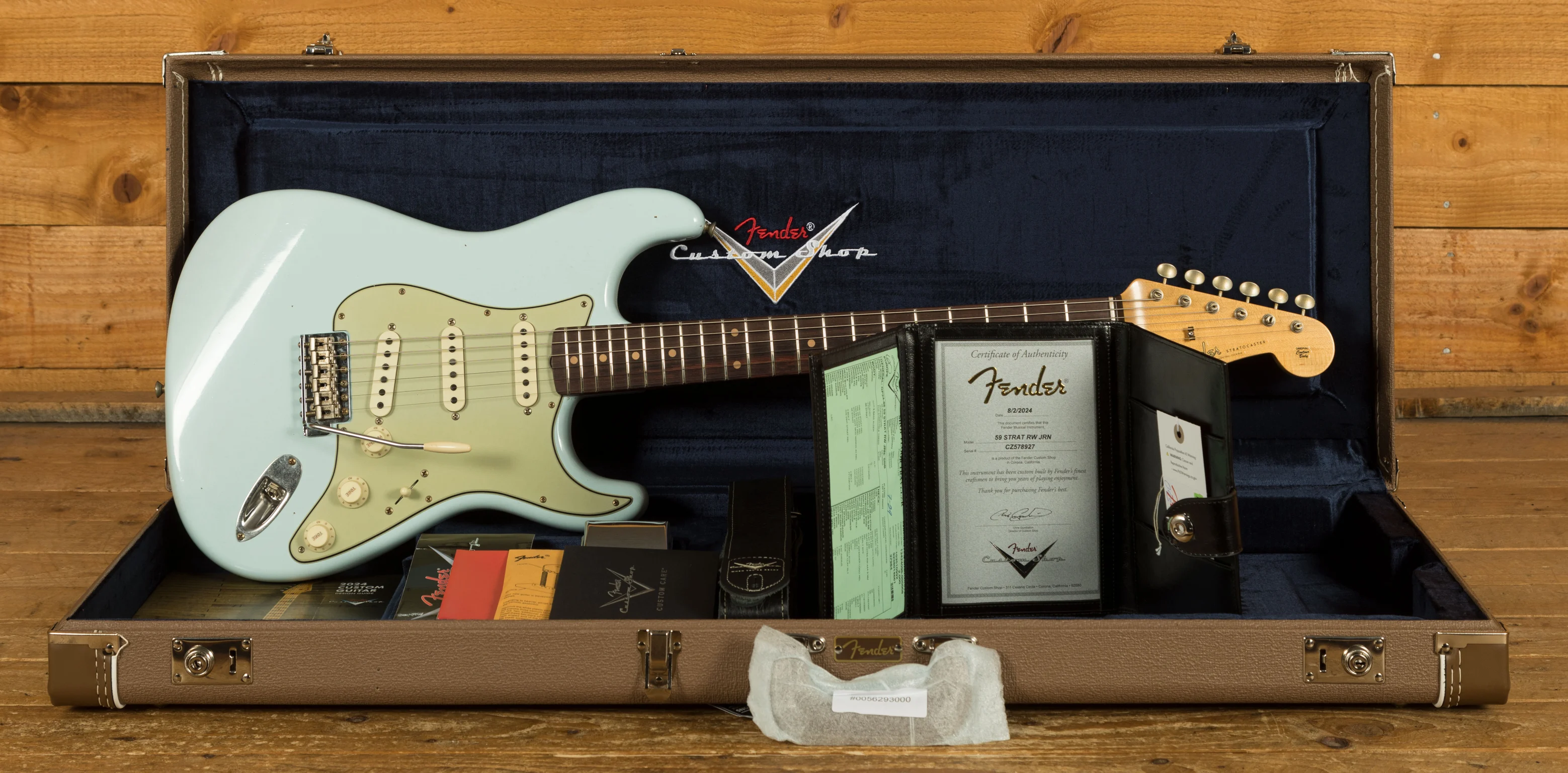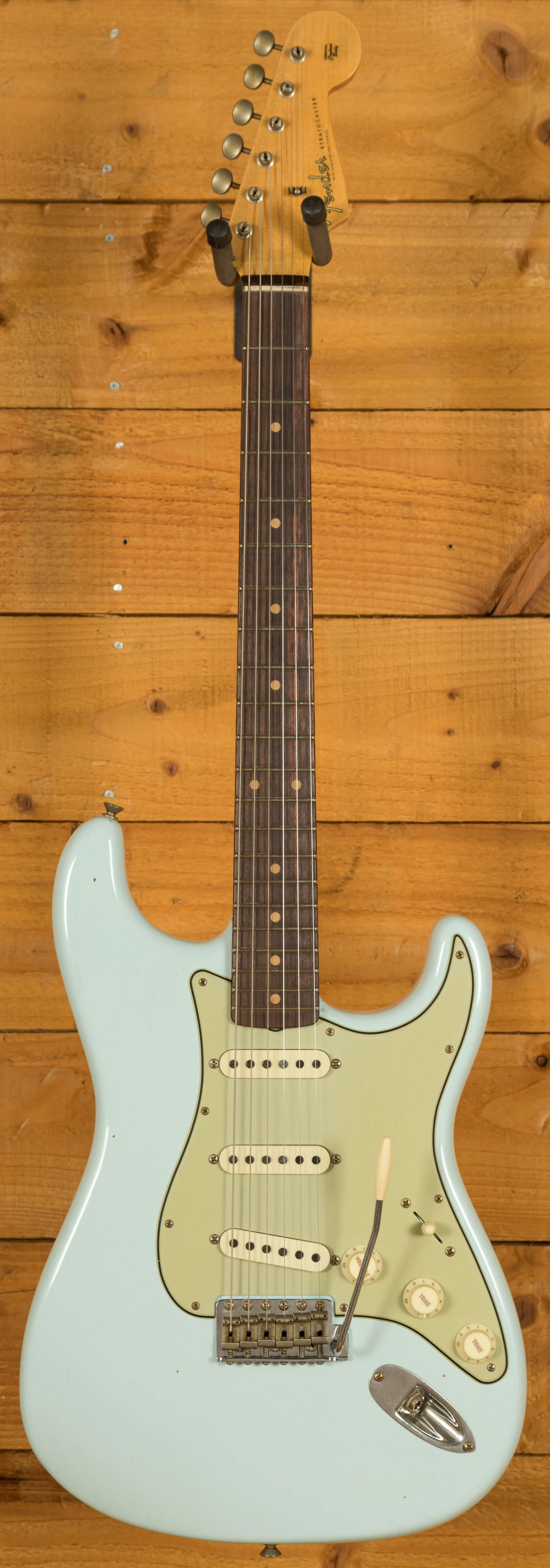 For this custom build, John made a few modifications: the fret material was changed from the standard 6105 to 6100, offering jumbo rather than tall and narrow frets. The pickups were swapped from Custom Shop Hand-Wound Fat '50s Strat to Hand-Wound '59 Strat pickups. The finish was also updated from 'Super Faded Aged Shell Pink' to 'Sonic Blue.'