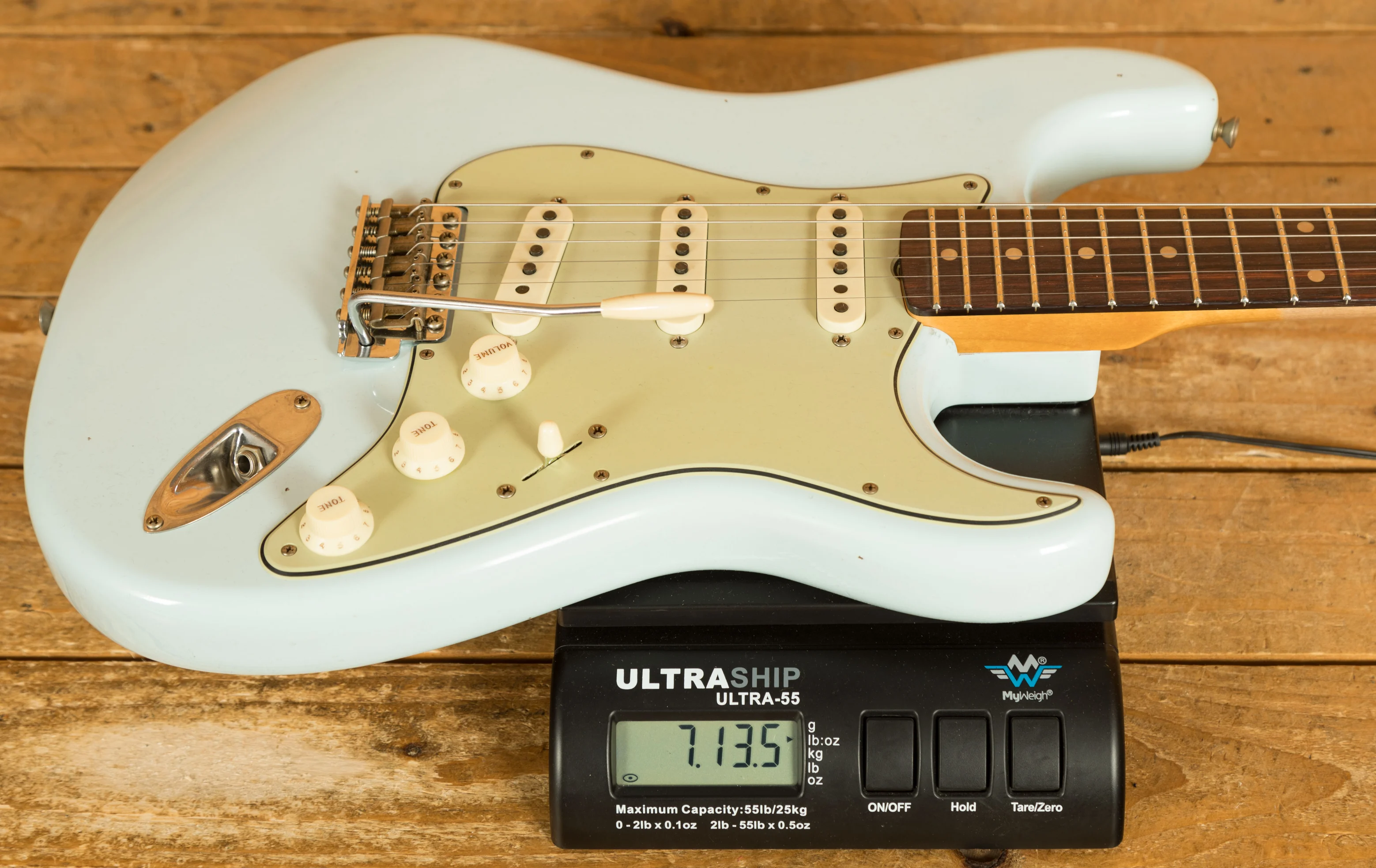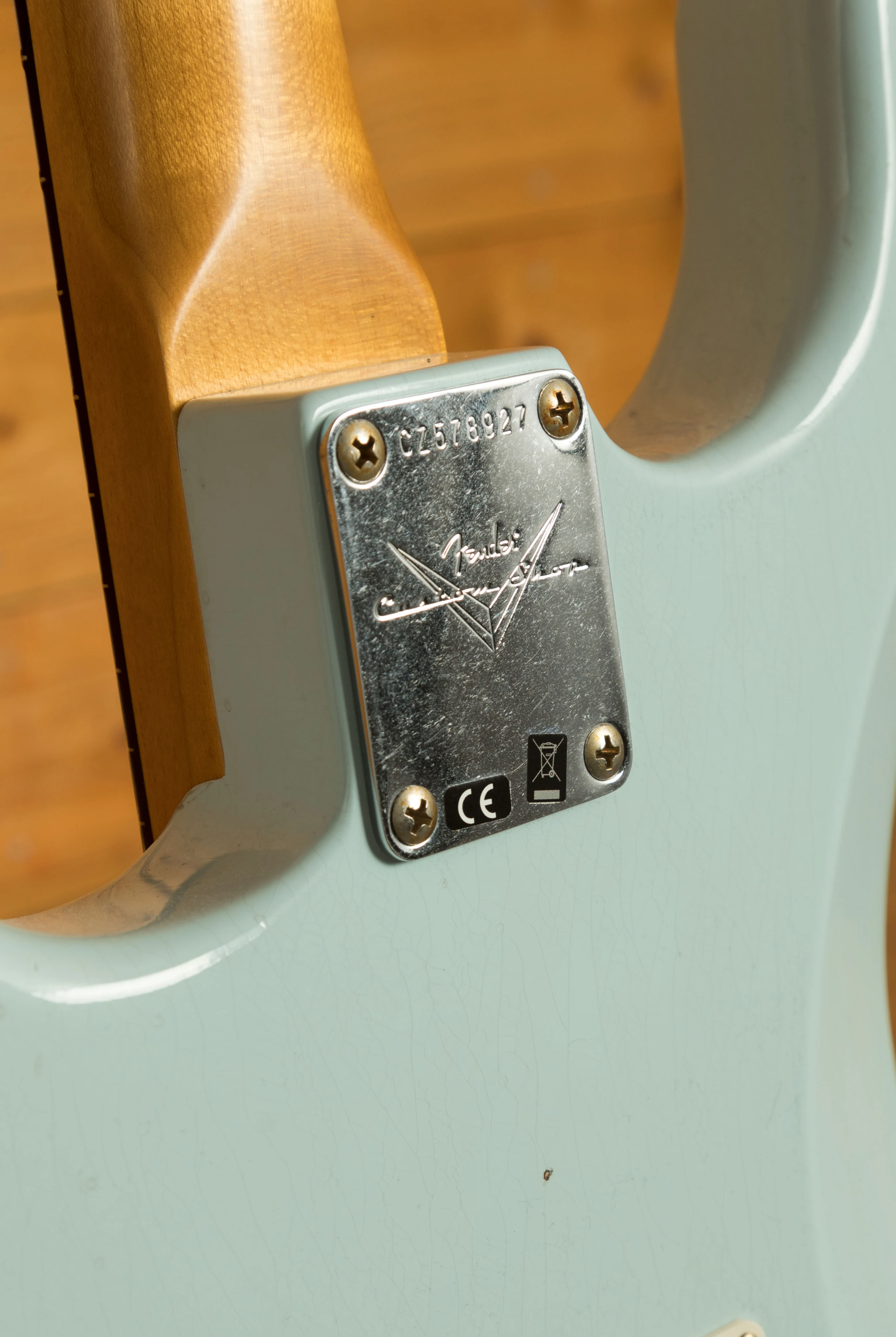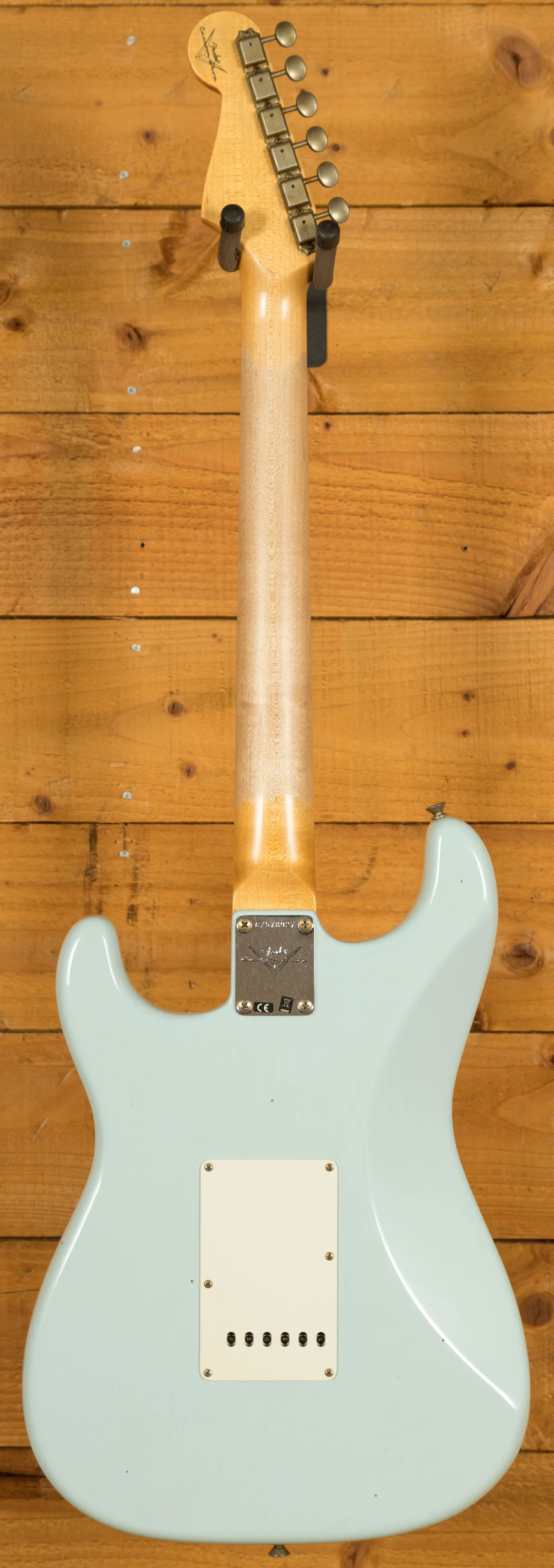 For this custom build, John made a few modifications: the fret material was changed from the standard 6105 to 6100, offering jumbo rather than tall and narrow frets. The pickups were swapped from Custom Shop Hand-Wound Fat '50s Strat to Hand-Wound '59 Strat pickups. The finish was also updated from 'Super Faded Aged Shell Pink' to 'Sonic Blue.'