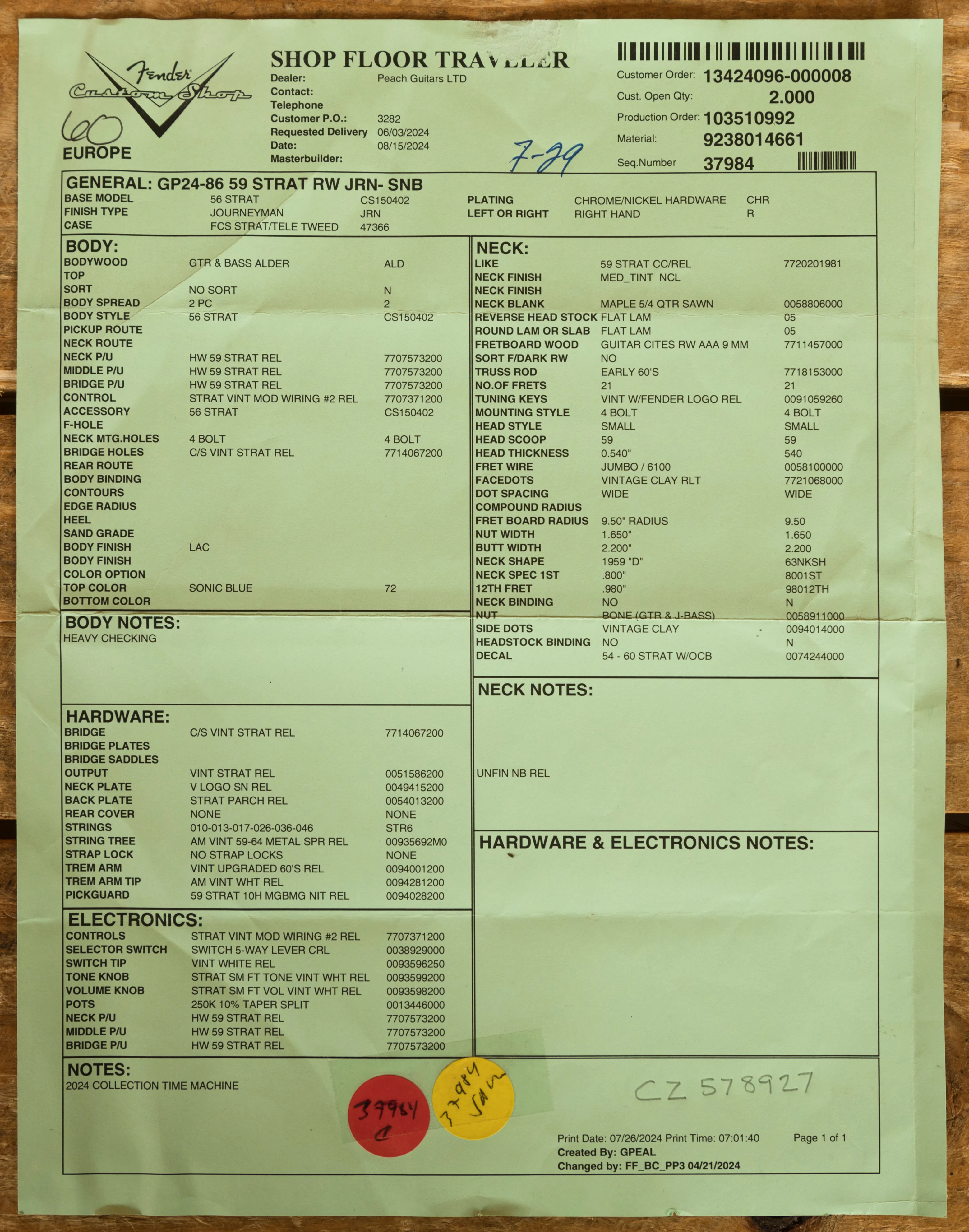 This is really exciting - a custom build that John designed specifically for Peach. The guitar is inspired by the Time Machine 1959 Stratocaster Journeyman Relic, a model from Fender's current Custom Shop lineup.