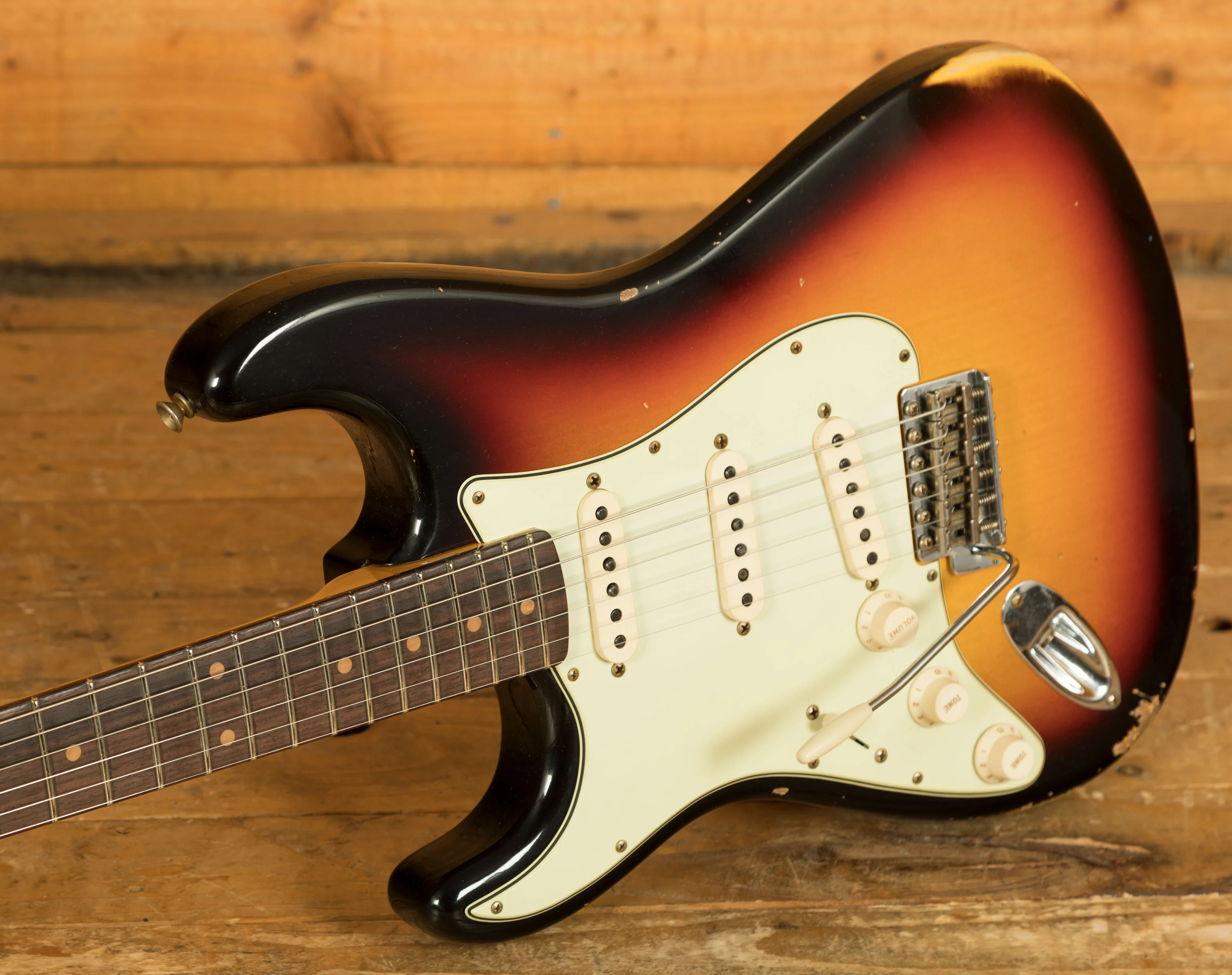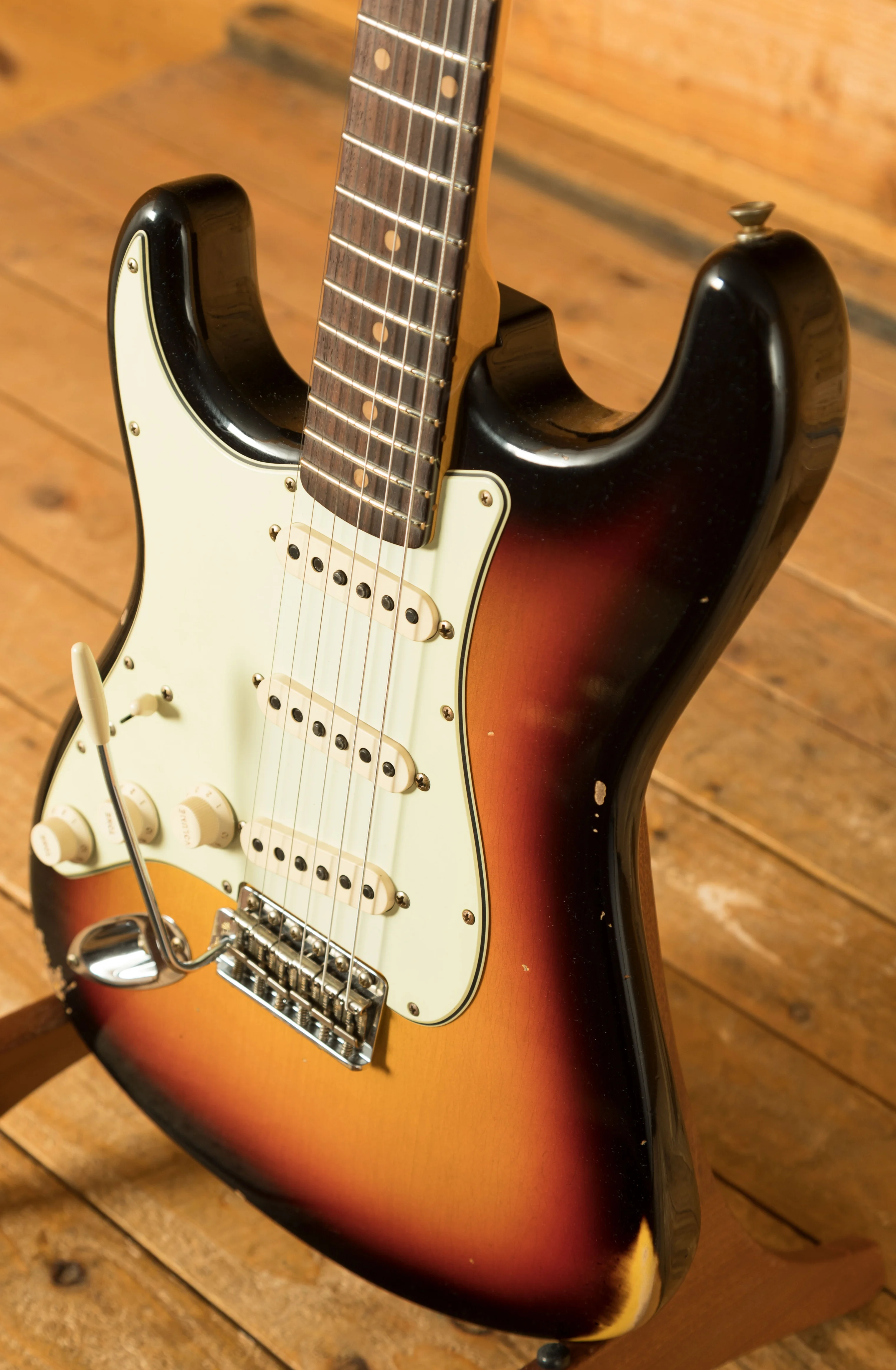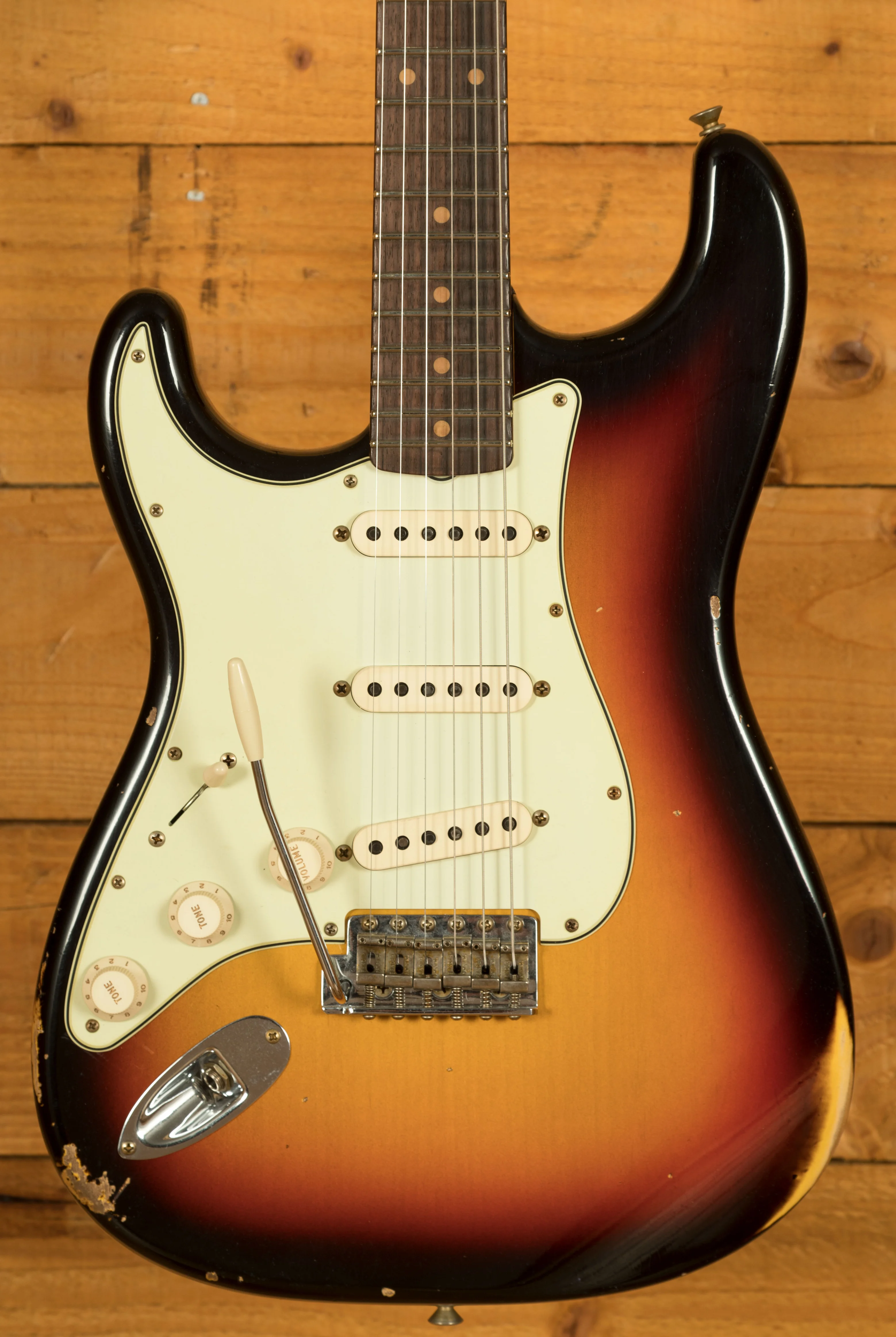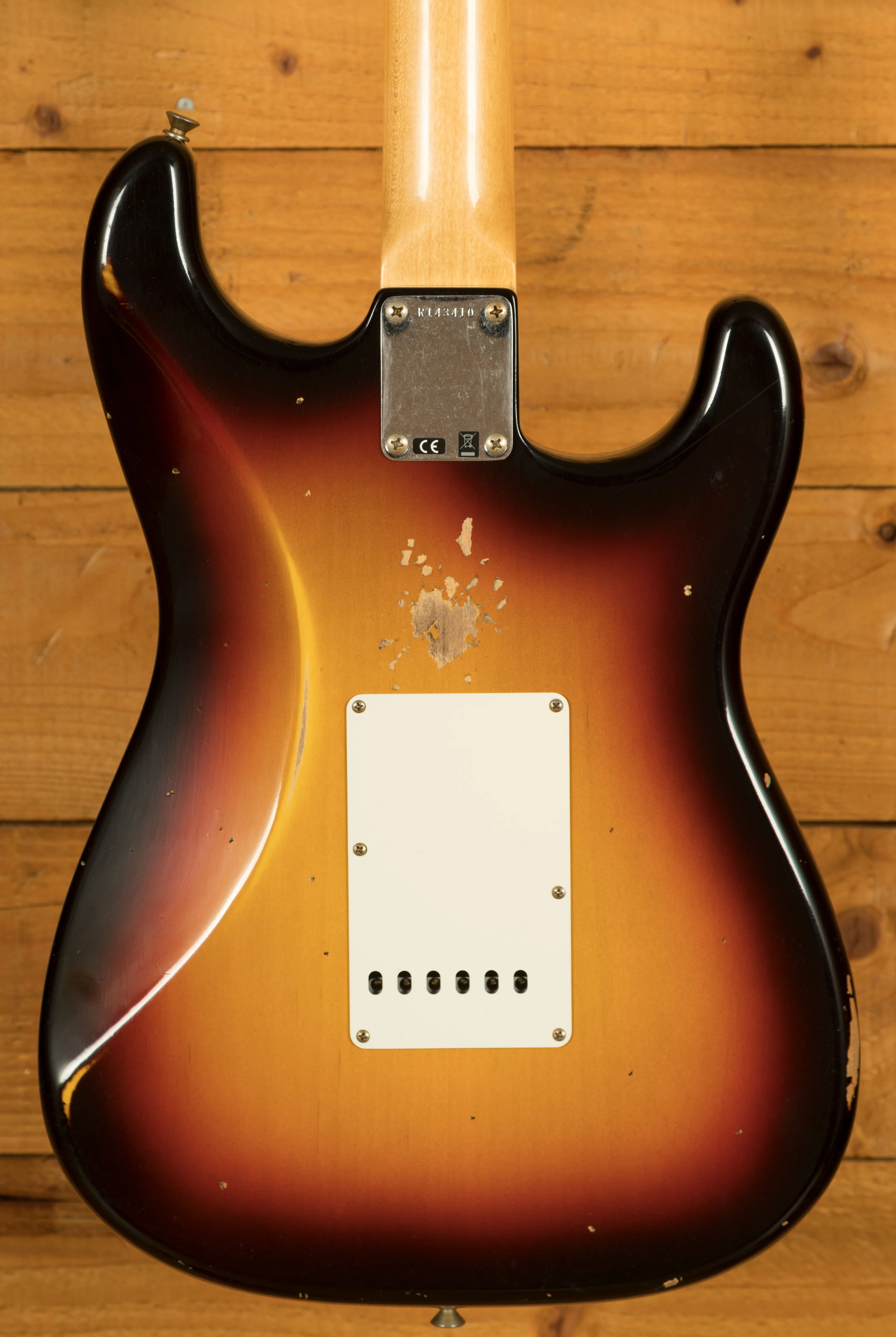 An Alder body is finished in a classic 3-Tone Sunburst, one of Fender's most iconic finishes, it's a real beauty! Authentically aged, this finish will wear beautifully with time and develop its own character even further. The thin nitro finish also allows the natural resonance of the body to sing and sustain much more effectively and with the relicing you also get that road-worn, look without any actual damage to the guitar.