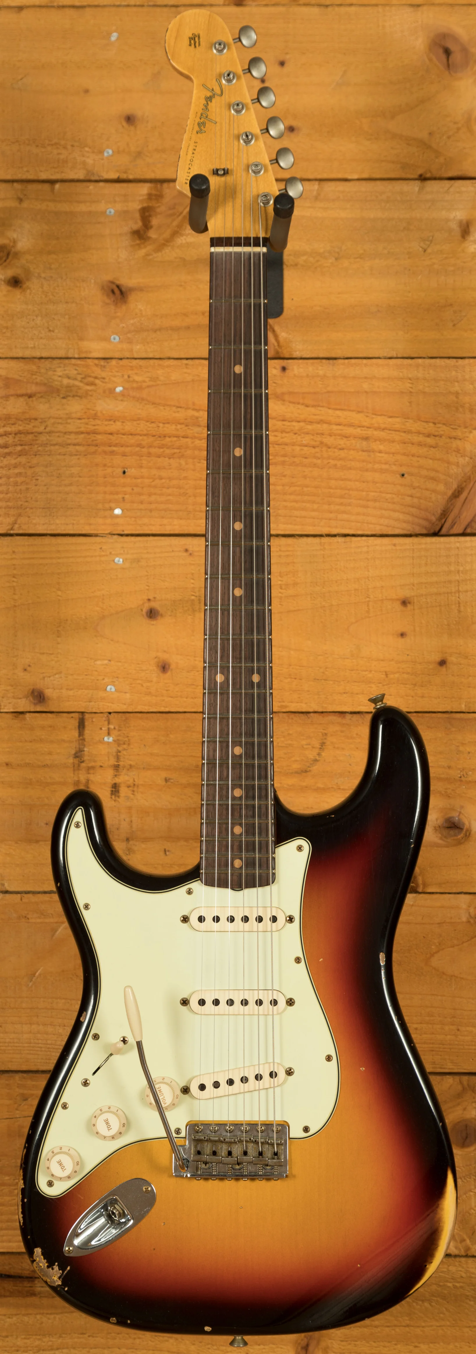 The electronics are a highlight of this instrument. It is equipped with three hand-wound Fat '60s single-coil pickups made by Josefina Campos, Fender's current Master Pickup Winder. Having trained under Abigail Ybarra, Campos has carried forward the legacy of Fender's original pickup designs, handcrafting each coil with meticulous care. These pickups deliver a rich and dynamic tonal range, offering a strong bass response, clear and articulate highs, and a vintage-correct voice that responds sensitively to playing dynamics. This makes the guitar equally capable of handling subtle, expressive passages as well as more powerful, driven tones.