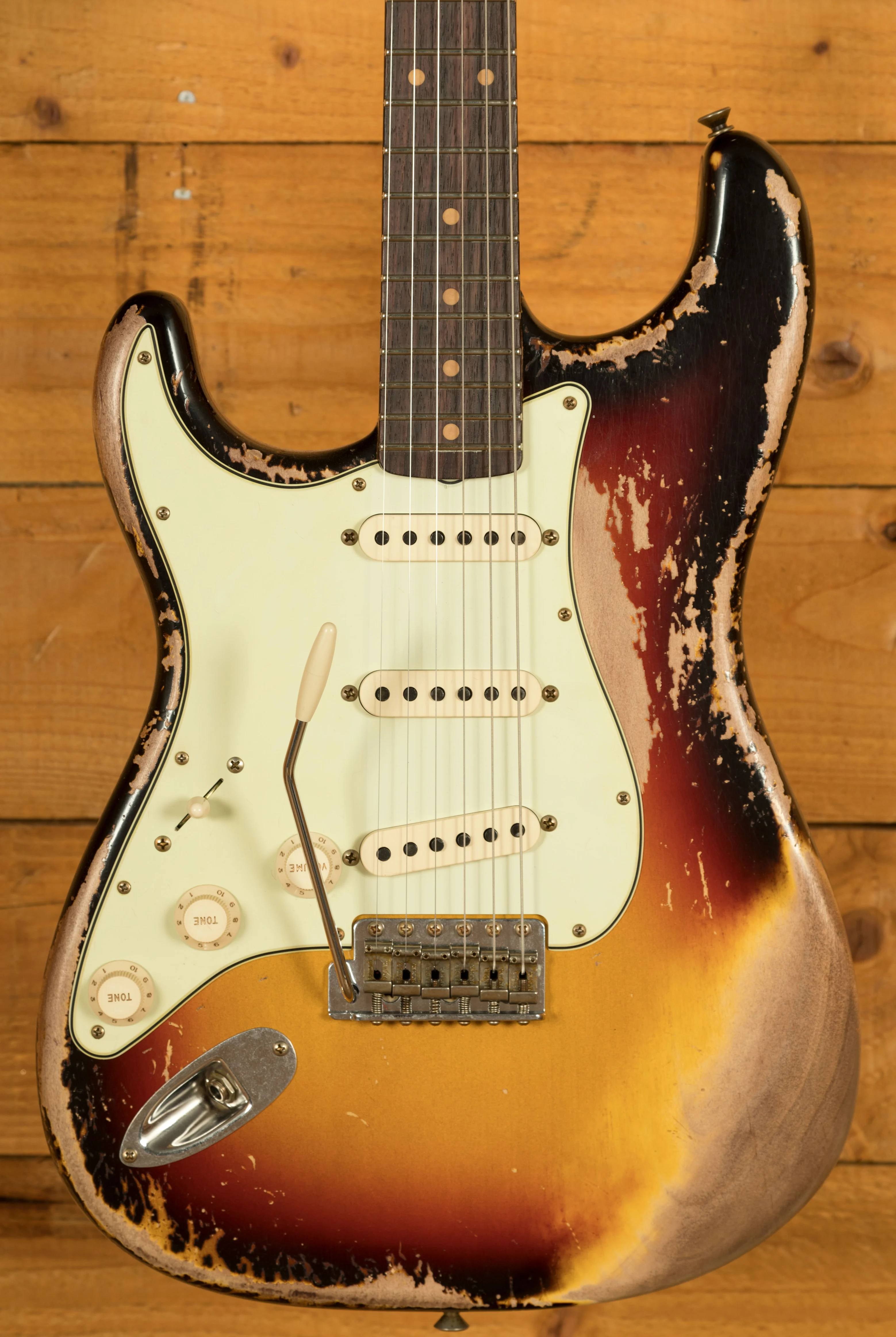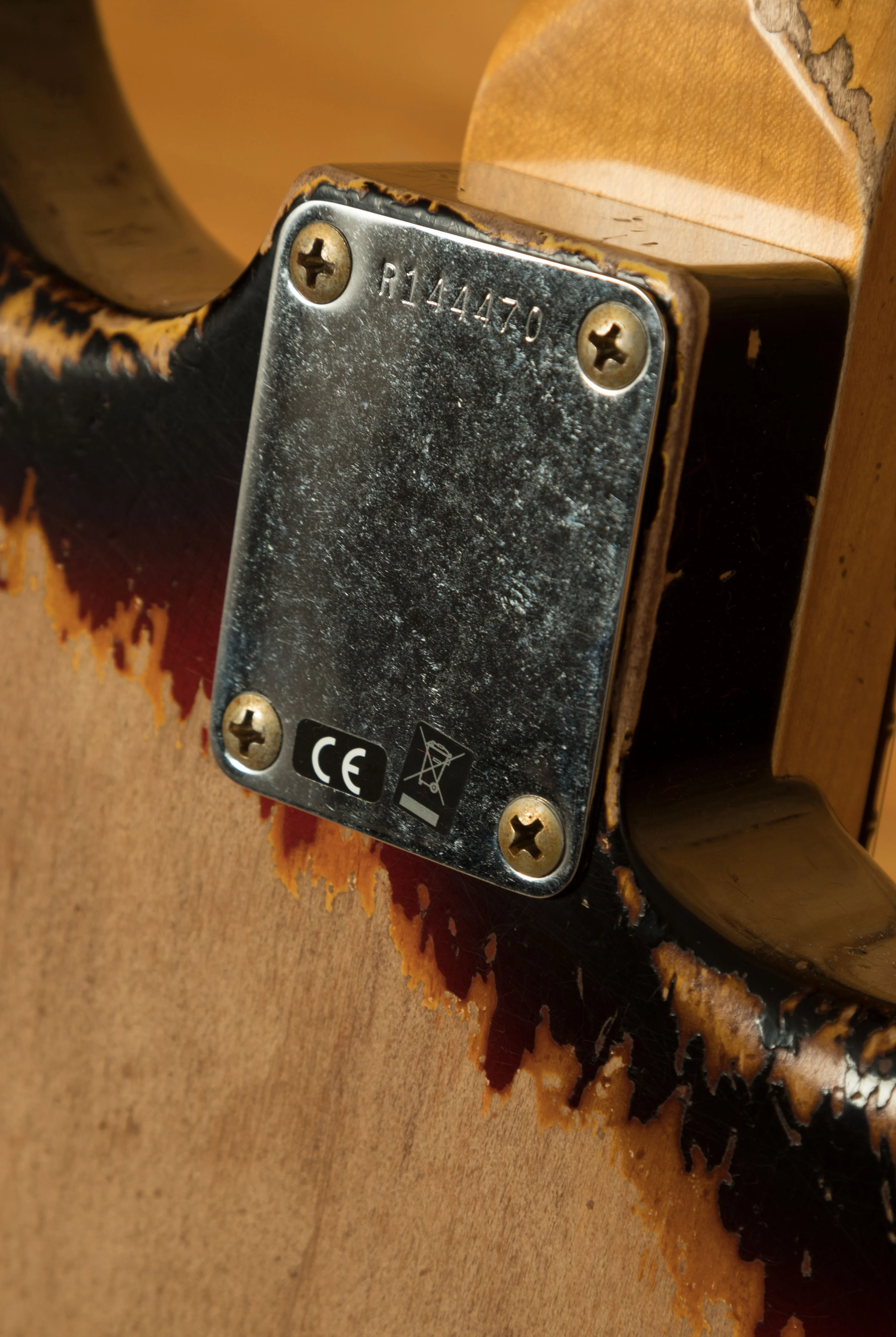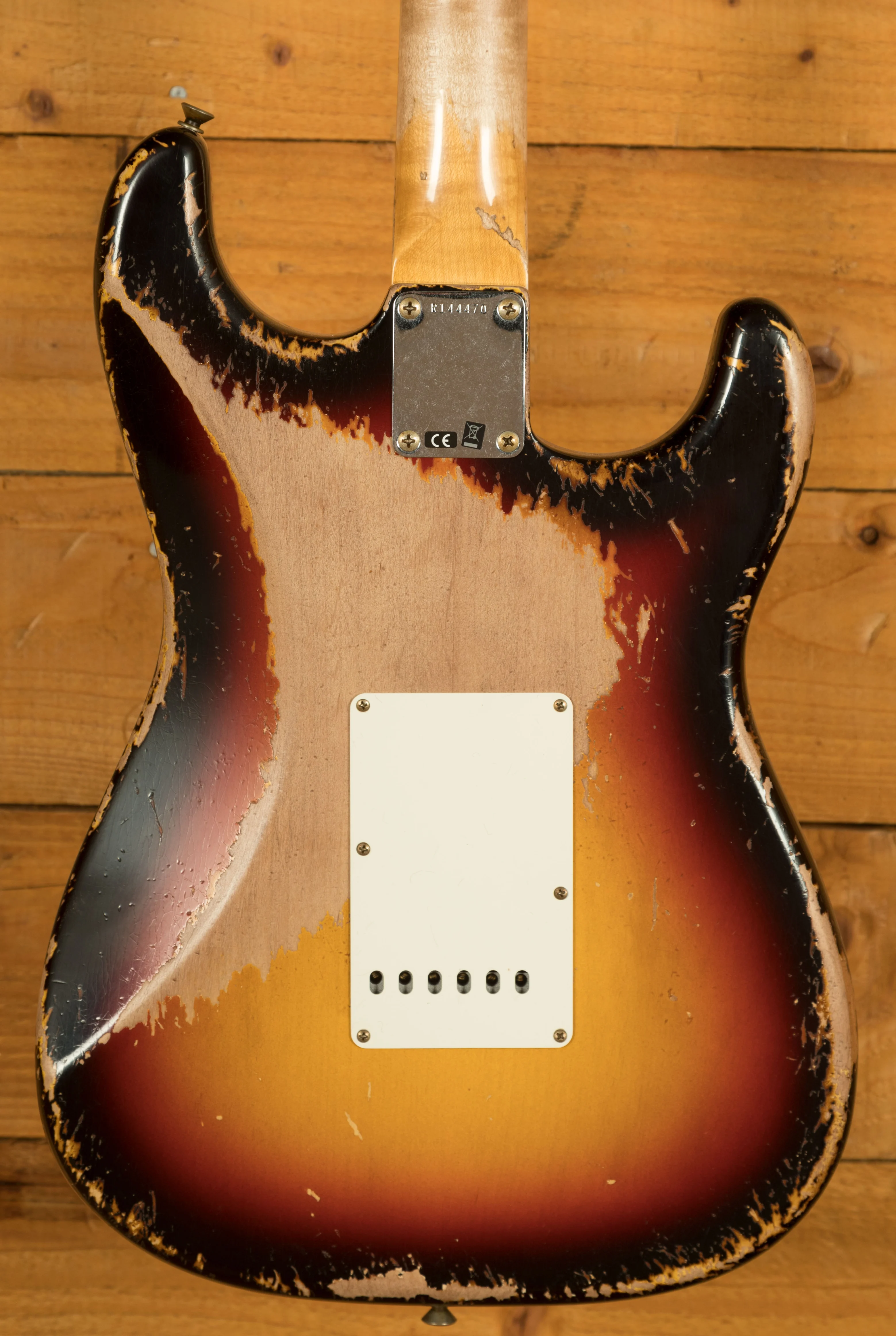An Alder body is finished in a super cool 3-Tone Sunburst, one of Fender's most iconic finishes, it's a real beauty! Authentically aged, this finish will wear beautifully with time and develop its own character even further. The thin nitro finish also allows the natural resonance of the body to sing and sustain much more effectively and with the super heavy relicing you also get that extreme road-worn, look without any actual damage to the guitar.