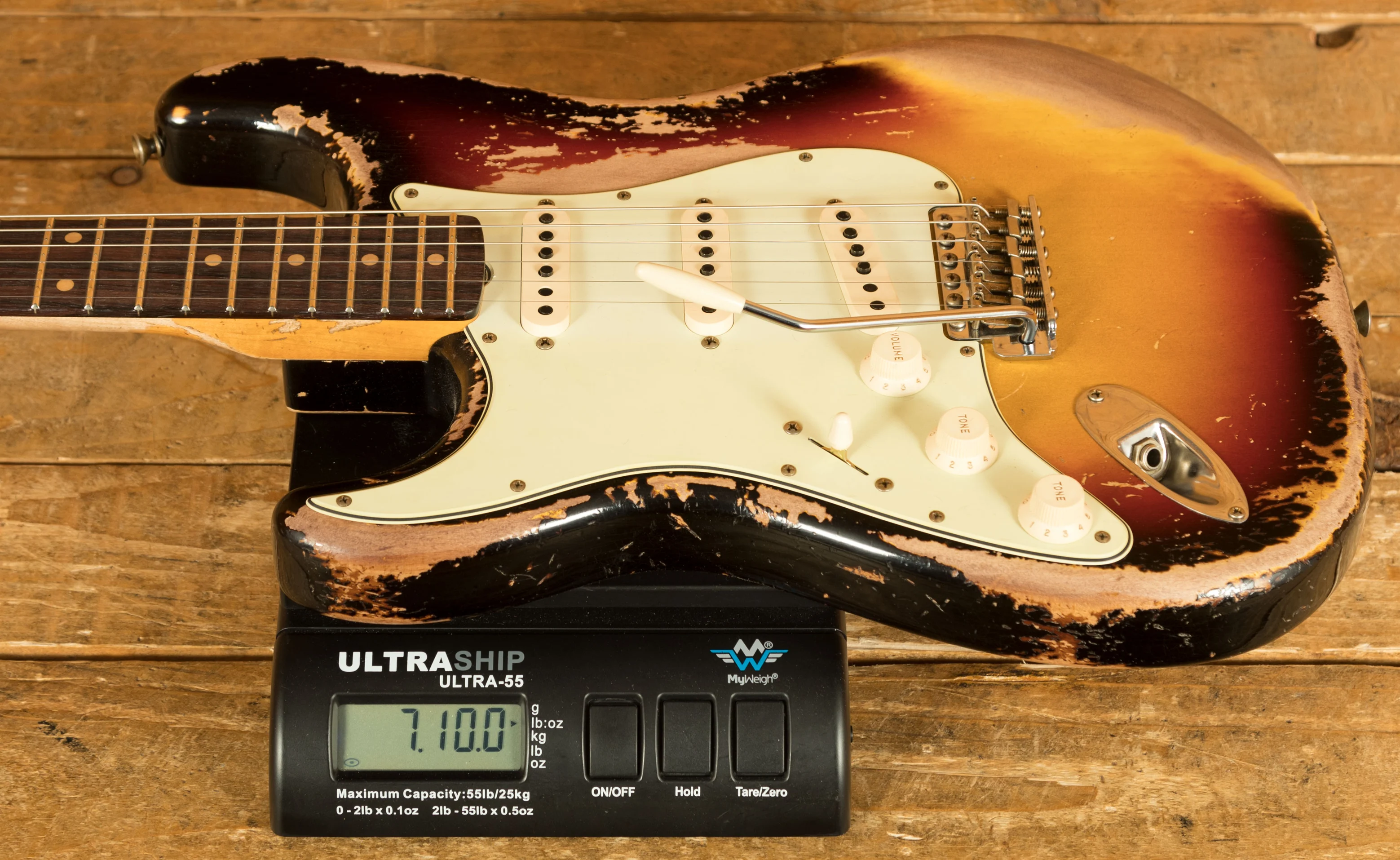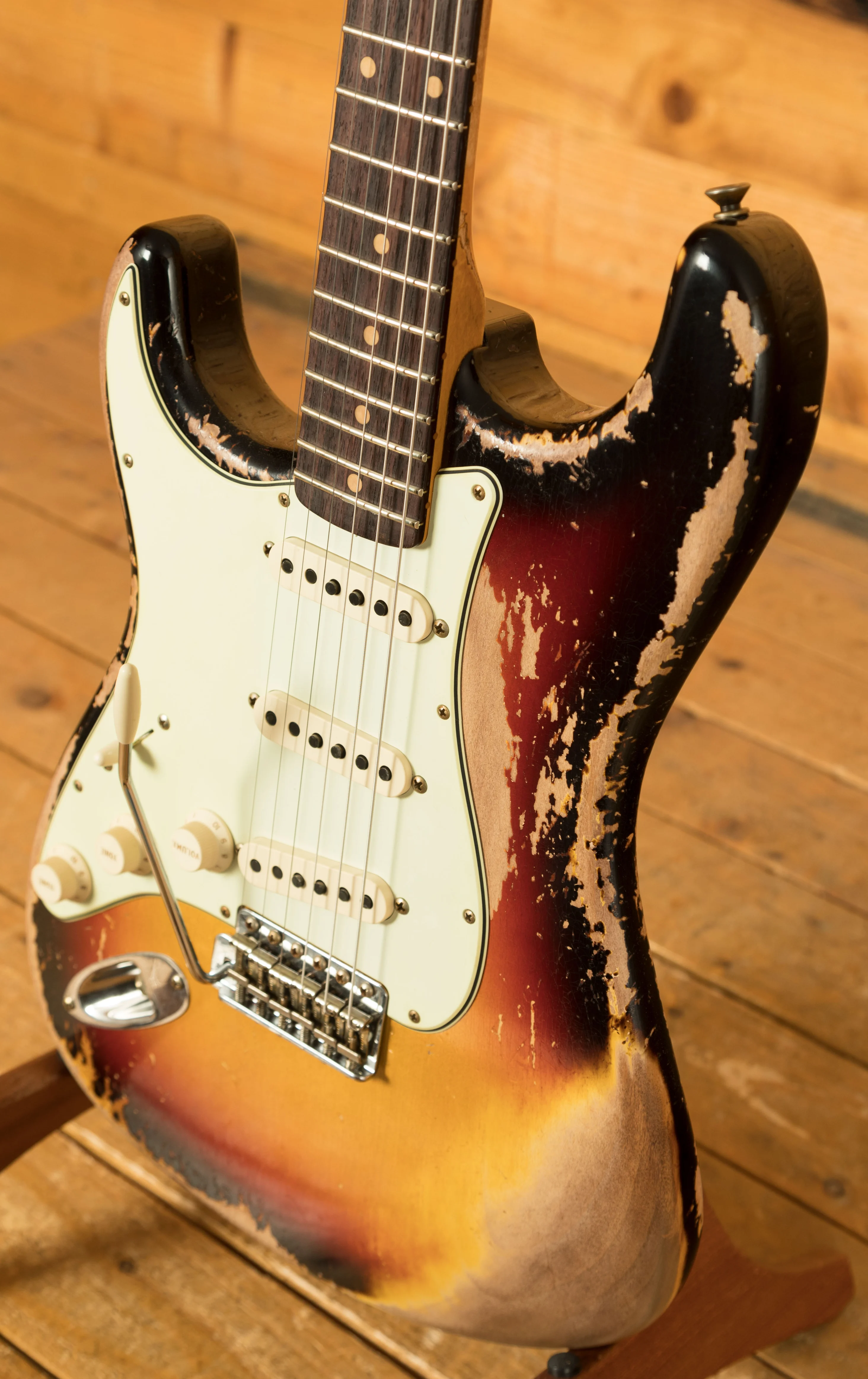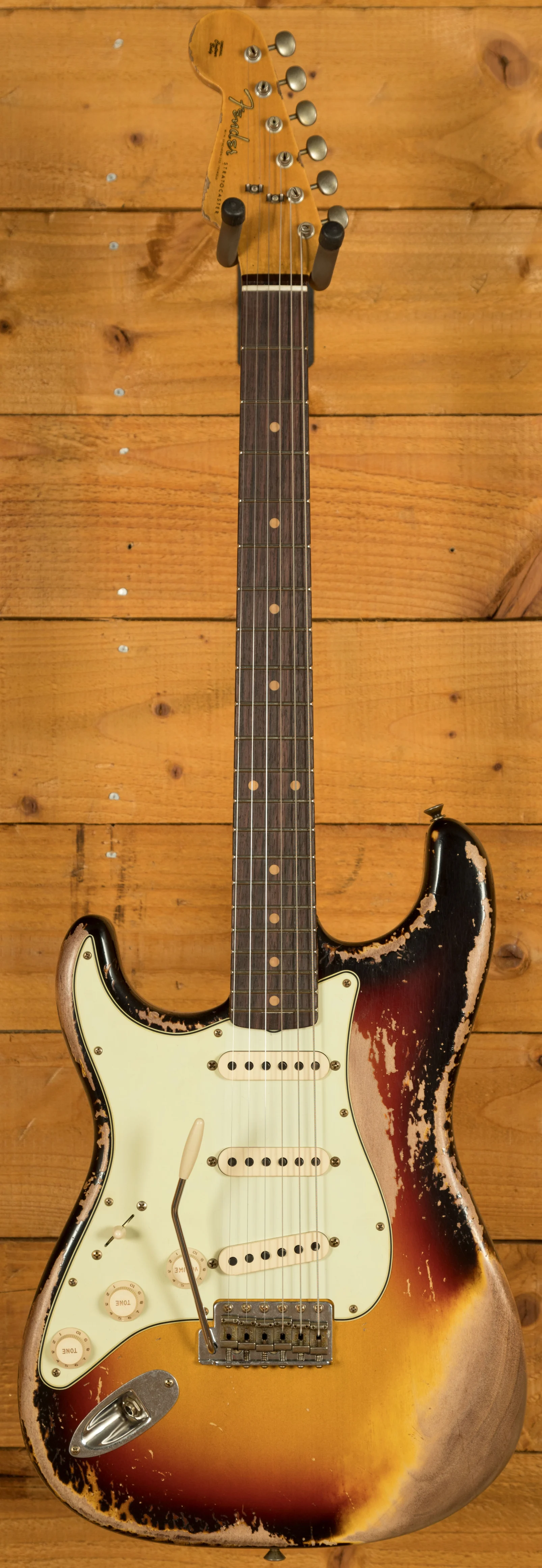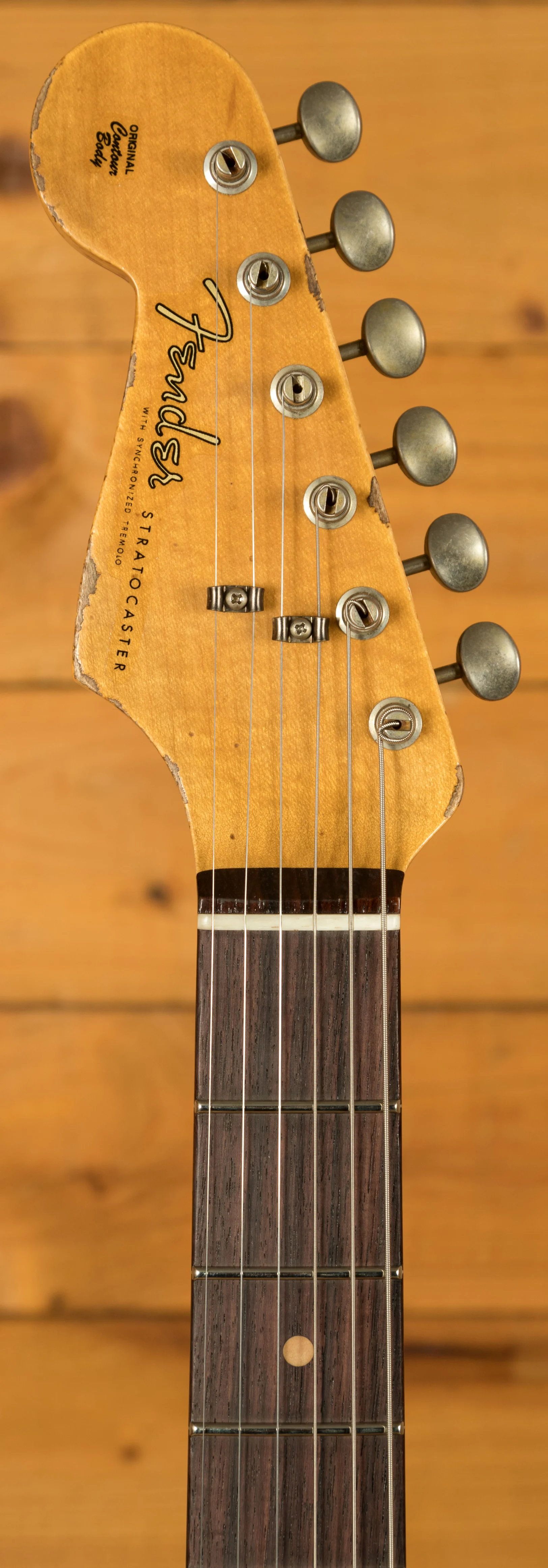 An Alder body is finished in a super cool 3-Tone Sunburst, one of Fender's most iconic finishes, it's a real beauty! Authentically aged, this finish will wear beautifully with time and develop its own character even further. The thin nitro finish also allows the natural resonance of the body to sing and sustain much more effectively and with the super heavy relicing you also get that extreme road-worn, look without any actual damage to the guitar.