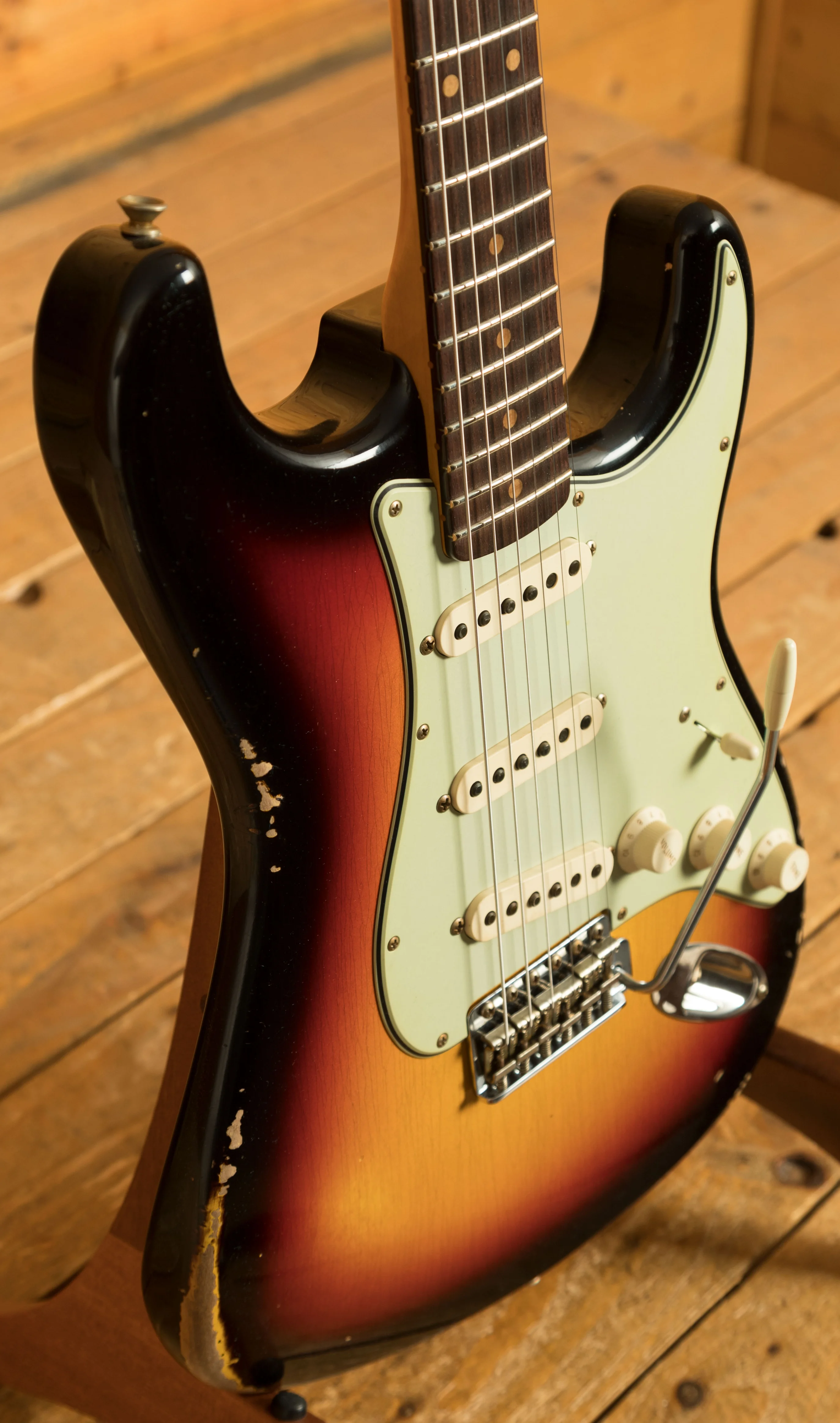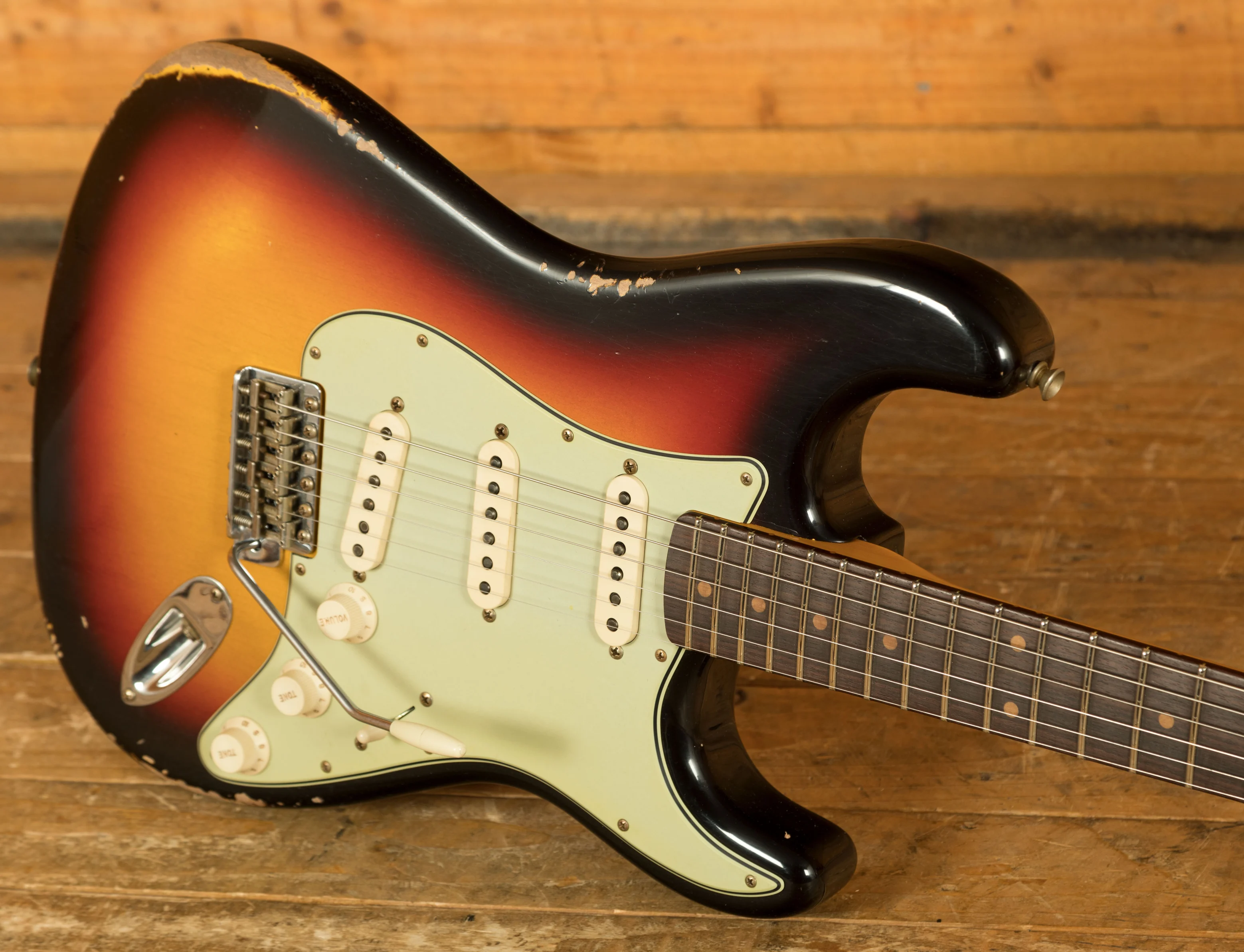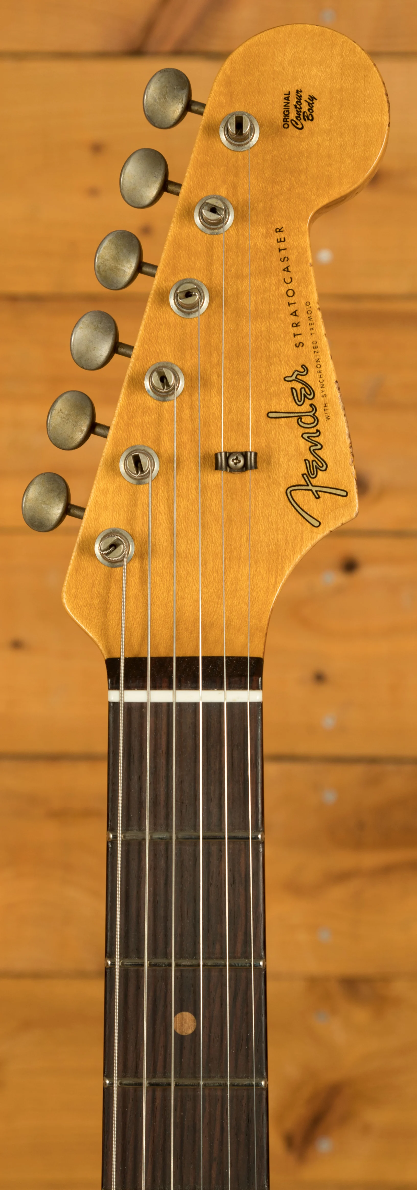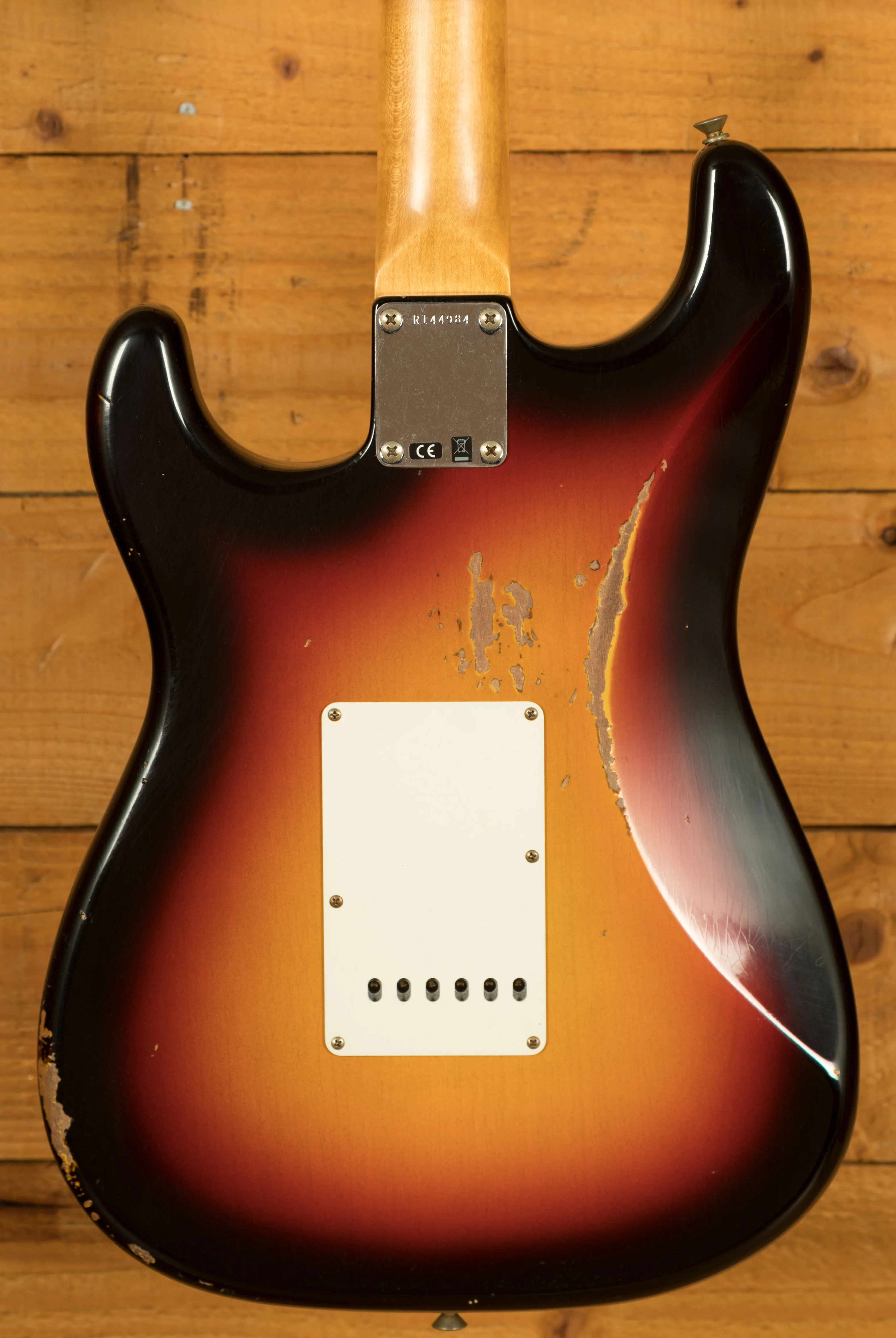 An Alder body is finished in a classic 3-Tone Sunburst, one of Fender's most iconic finishes, it's a real beauty! Authentically aged, this finish will wear beautifully with time and develop its own character even further. The thin nitro finish also allows the natural resonance of the body to sing and sustain much more effectively and with the relicing you also get that road-worn, look without any actual damage to the guitar.