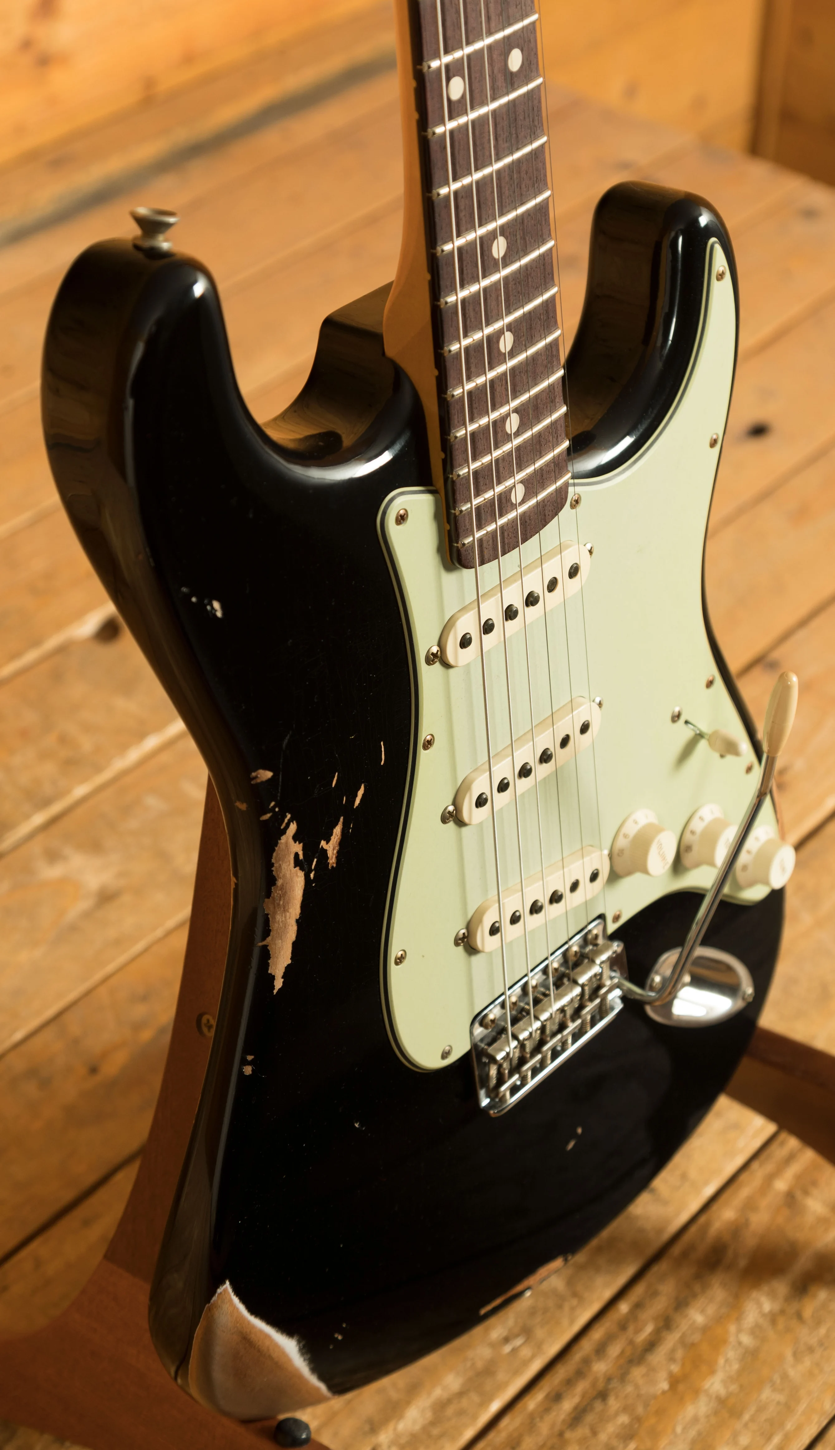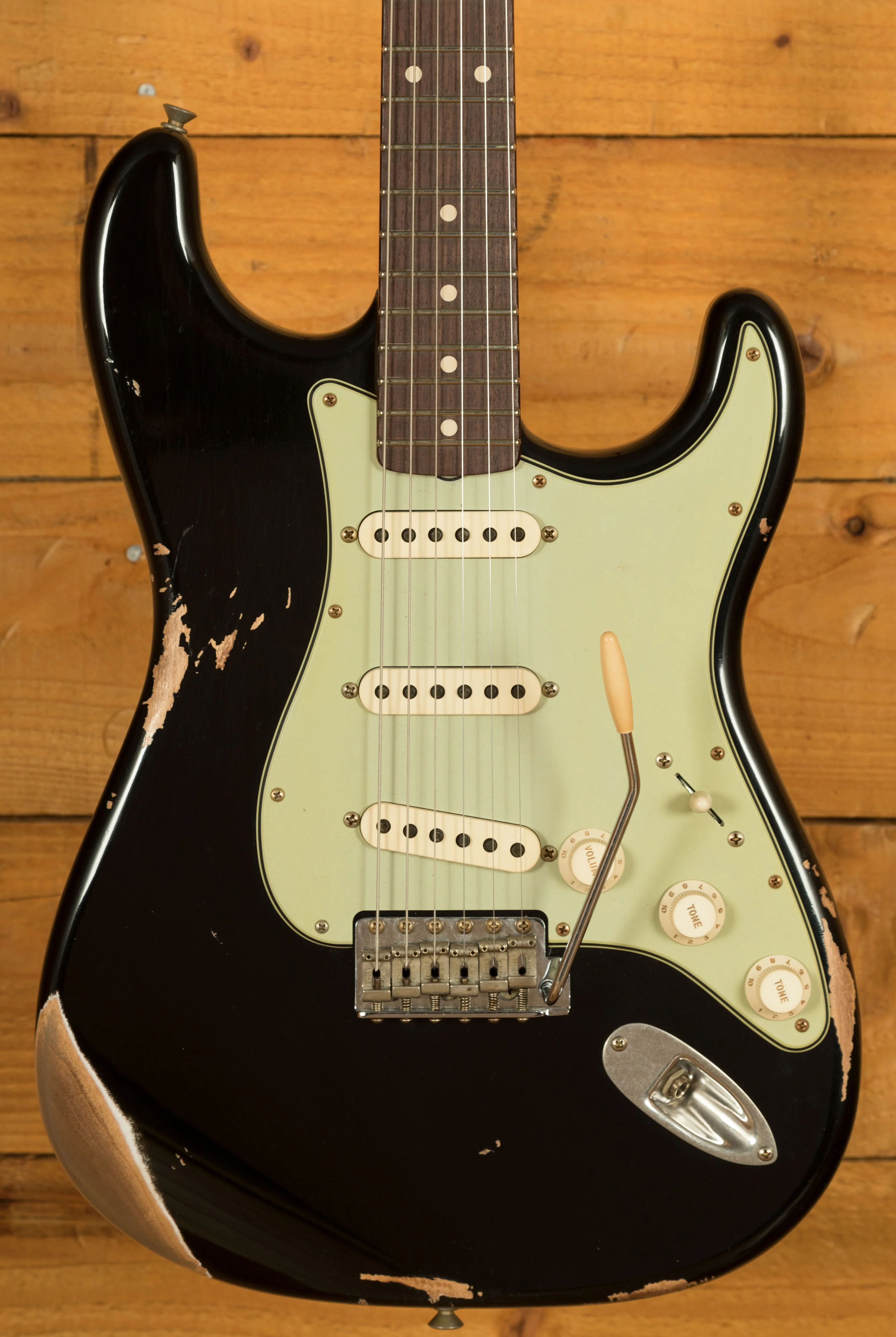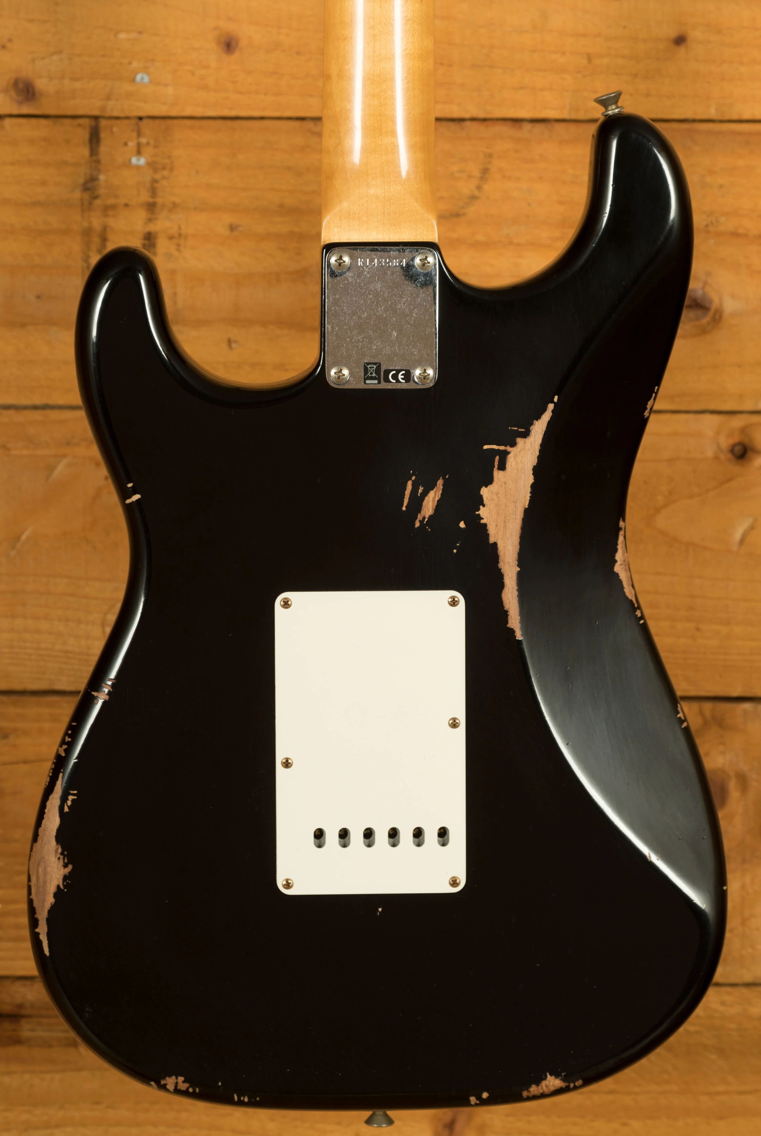 An Alder body is finished in a classic Black, one of Fender's most iconic finishes, it's a real beauty! Authentically aged, this finish will wear beautifully with time and develop its own character even further. The thin nitro finish also allows the natural resonance of the body to sing and sustain much more effectively and with the relicing you also get that road-worn, look without any actual damage to the guitar.