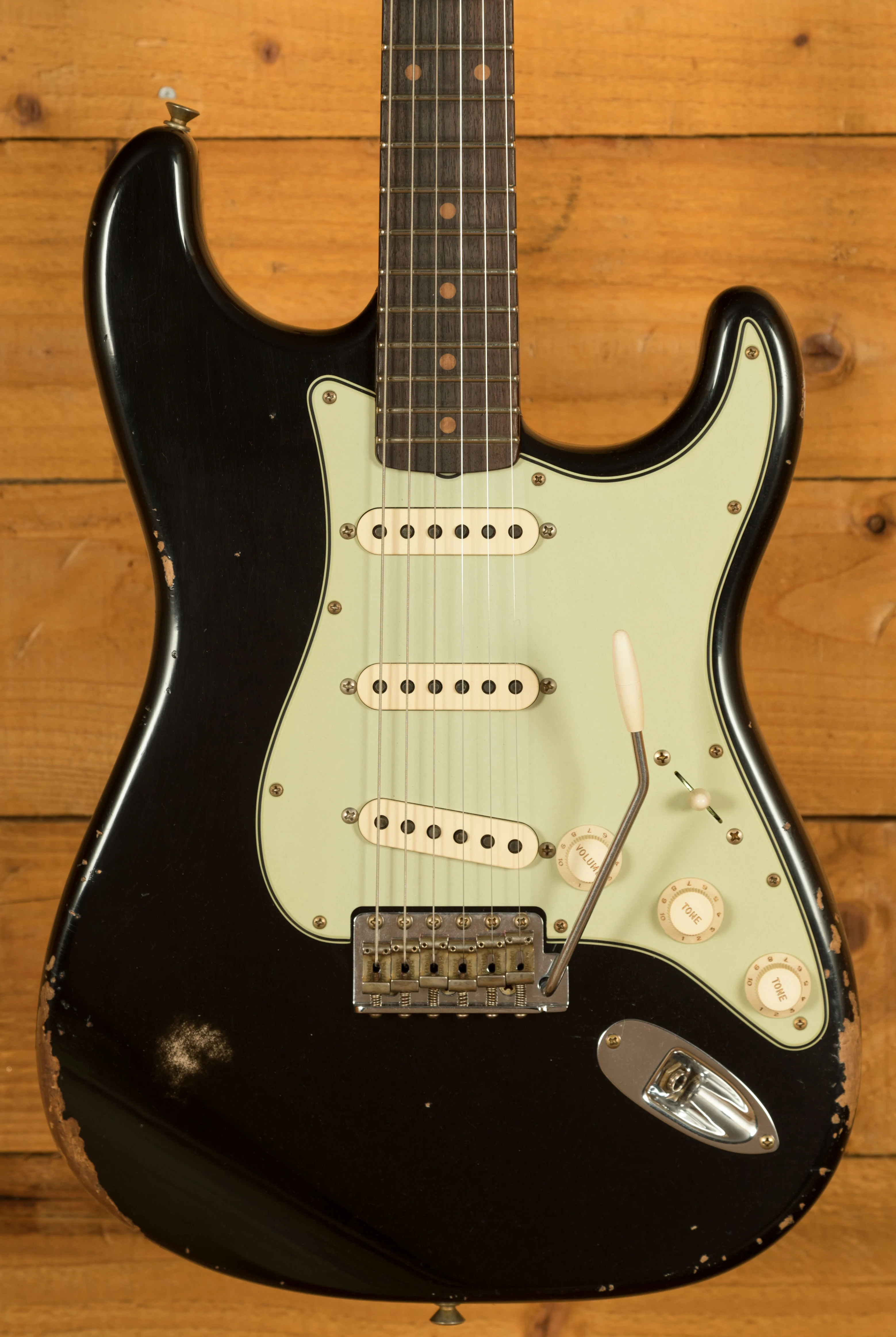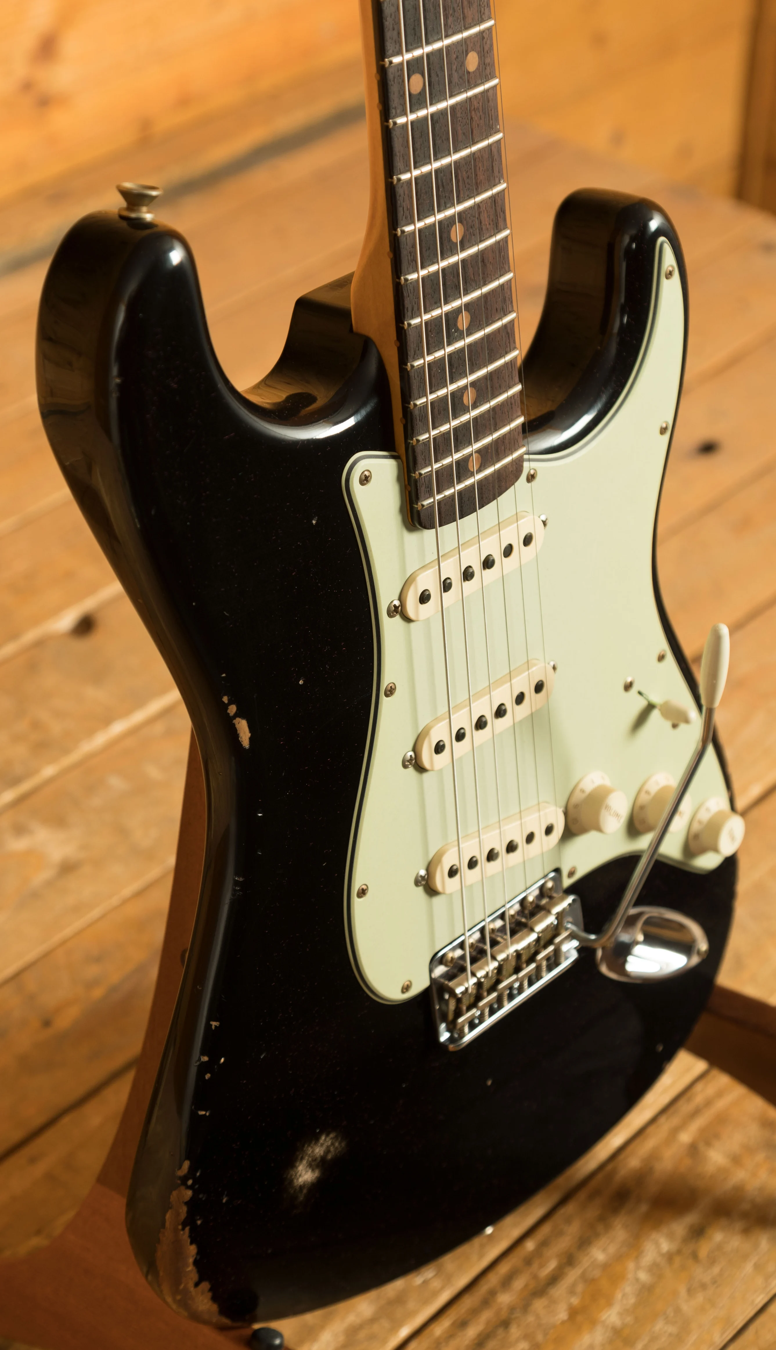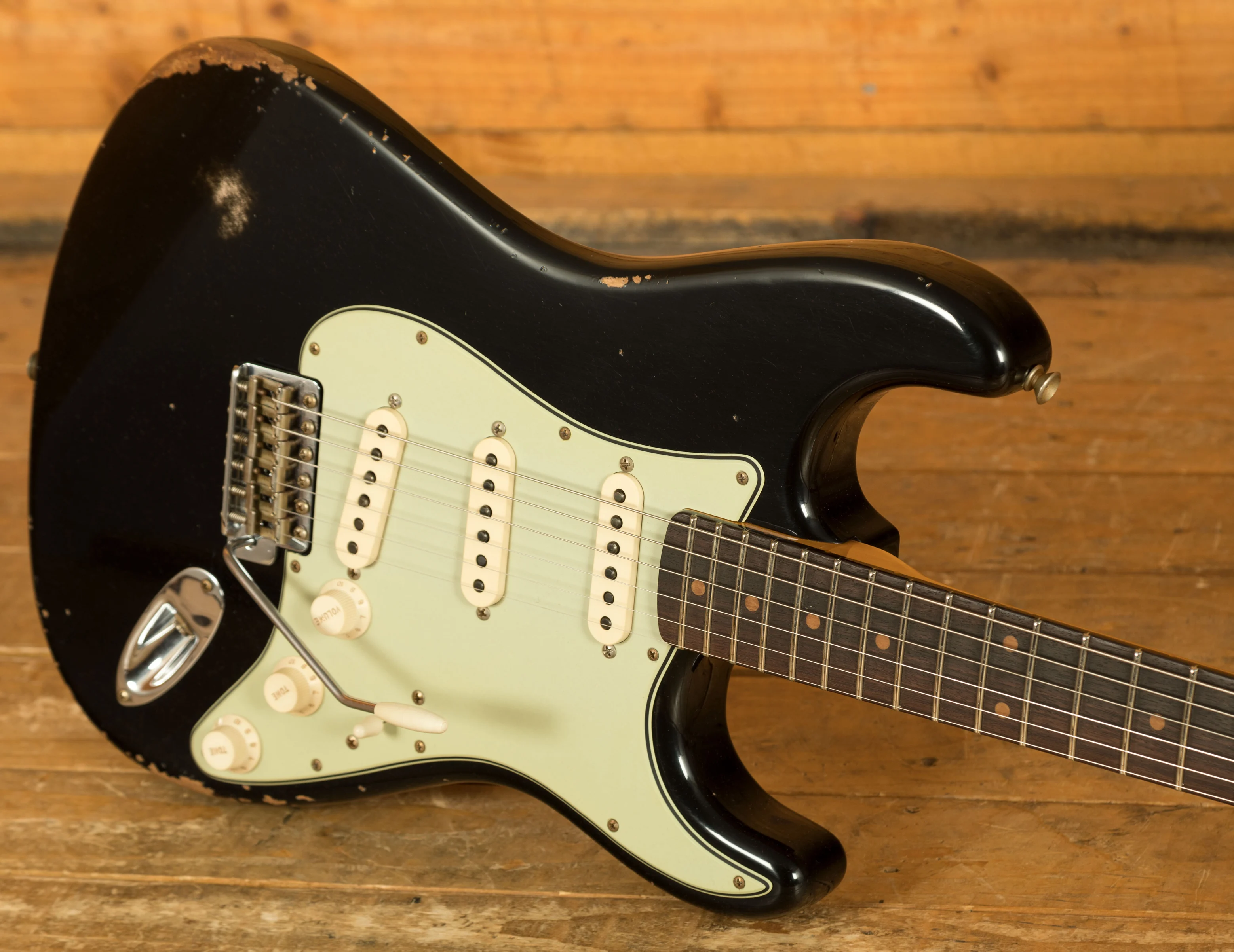 An Alder body is finished in a classic Black, one of Fender's most iconic finishes, it's a real beauty! Authentically aged, this finish will wear beautifully with time and develop its own character even further. The thin nitro finish also allows the natural resonance of the body to sing and sustain much more effectively and with the relicing you also get that road-worn, look without any actual damage to the guitar.
