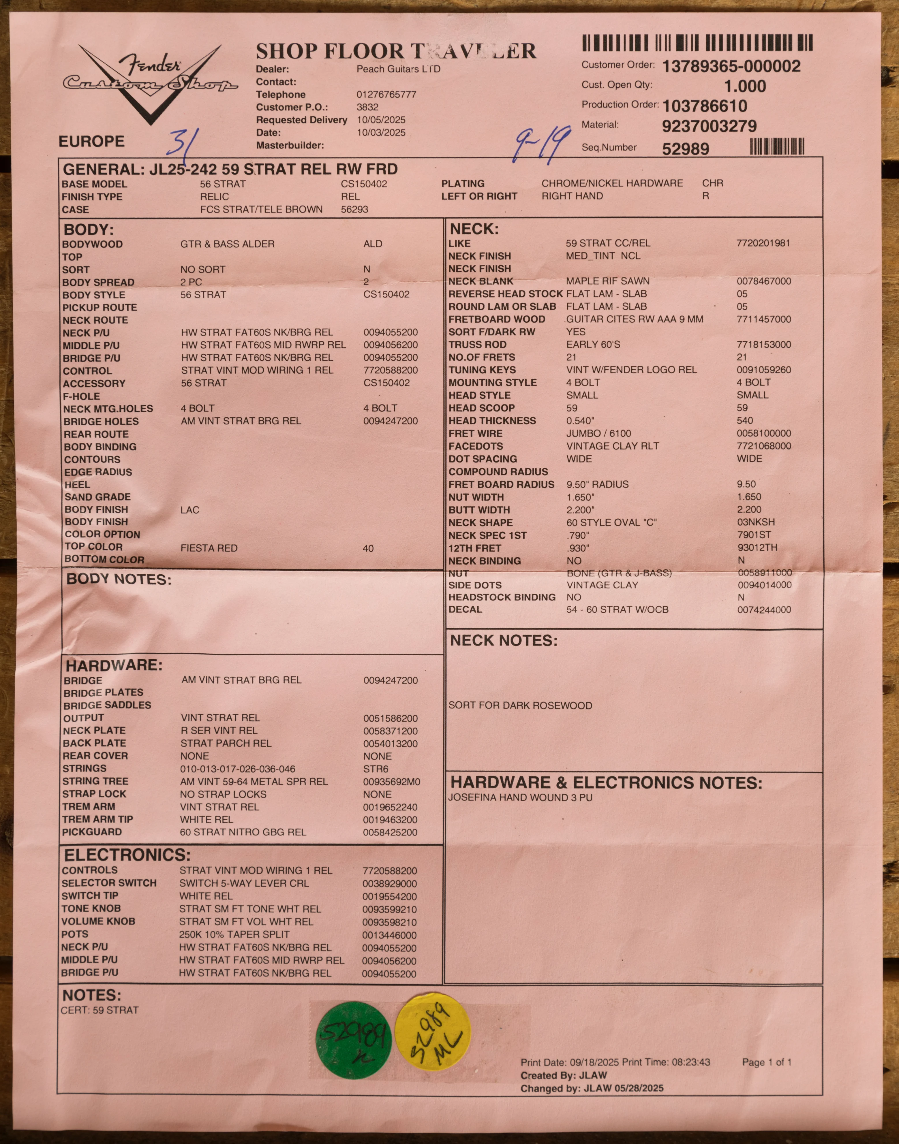 An Alder body is finished in a super cool Fiesta Red, one of Fender's most iconic finishes, it's a real beauty! Authentically aged, this finish will wear beautifully with time and develop its own character even further. The thin nitro finish also allows the natural resonance of the body to sing and sustain much more effectively and with the relicing you also get that road-worn, look without any actual damage to the guitar.
