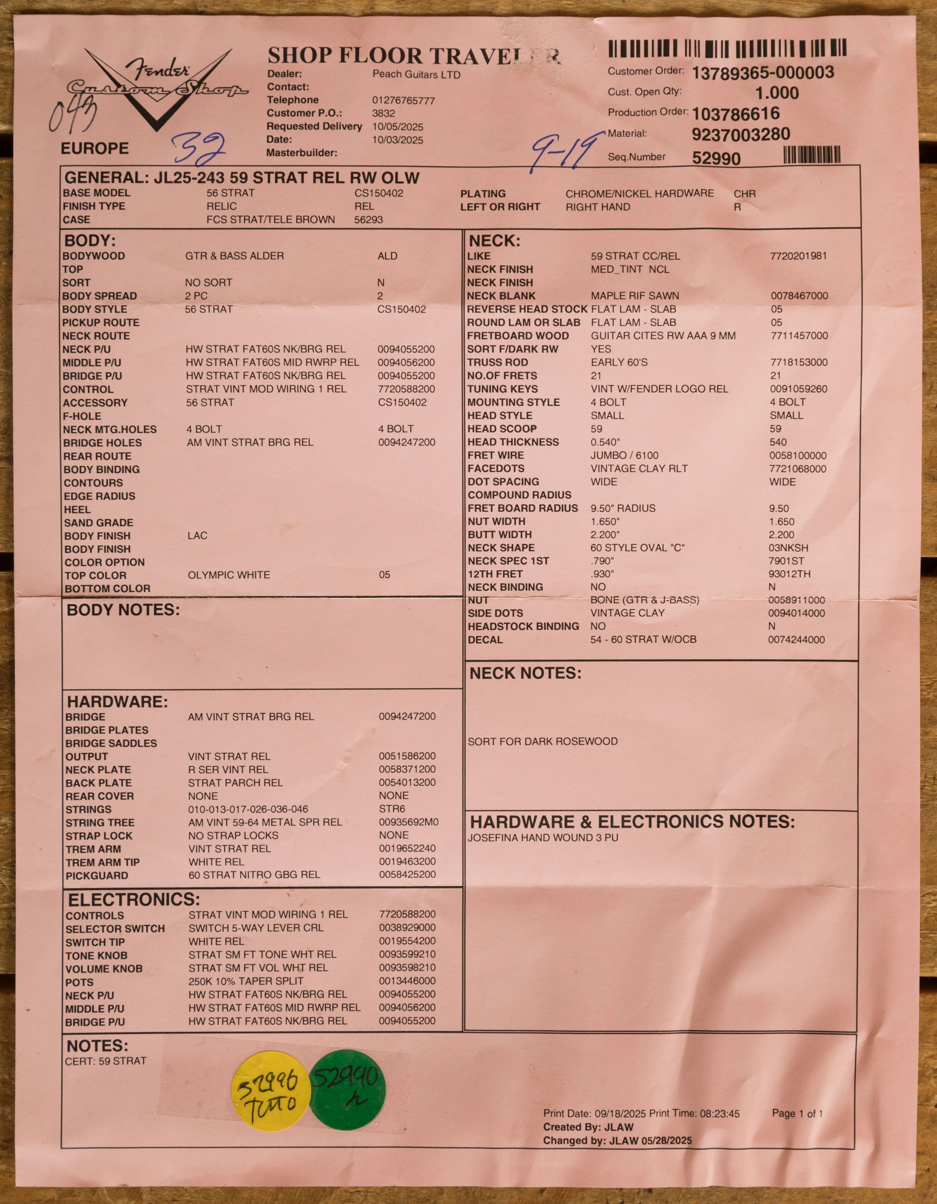 The electronics are a highlight of this instrument. It is equipped with three hand-wound Fat '60s single-coil pickups made by Josefina Campos, Fender's current Master Pickup Winder. Having trained under Abigail Ybarra, Campos has carried forward the legacy of Fender's original pickup designs, handcrafting each coil with meticulous care. These pickups deliver a rich and dynamic tonal range, offering a strong bass response, clear and articulate highs, and a vintage-correct voice that responds sensitively to playing dynamics. This makes the guitar equally capable of handling subtle, expressive passages as well as more powerful, driven tones.