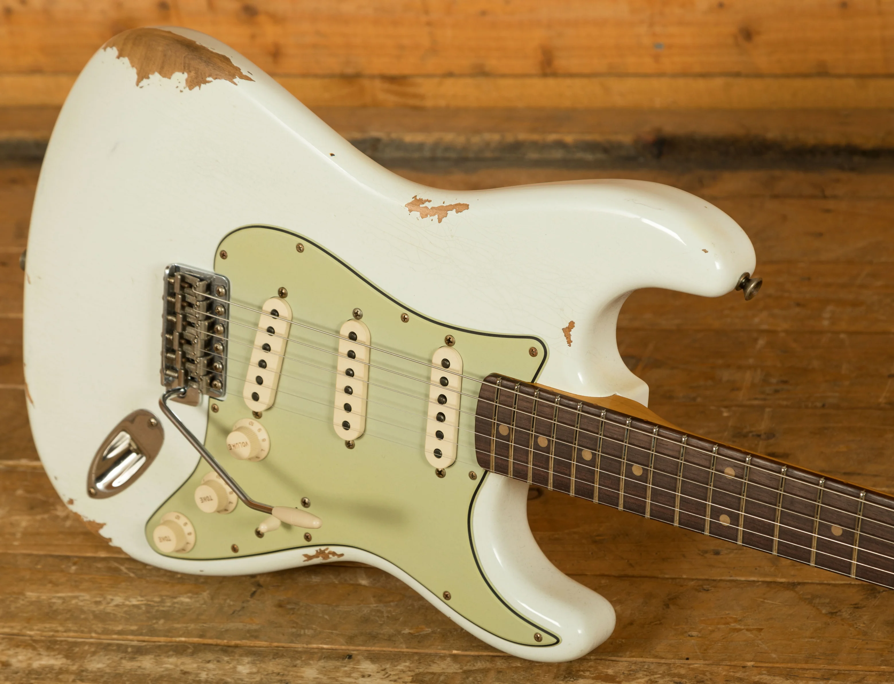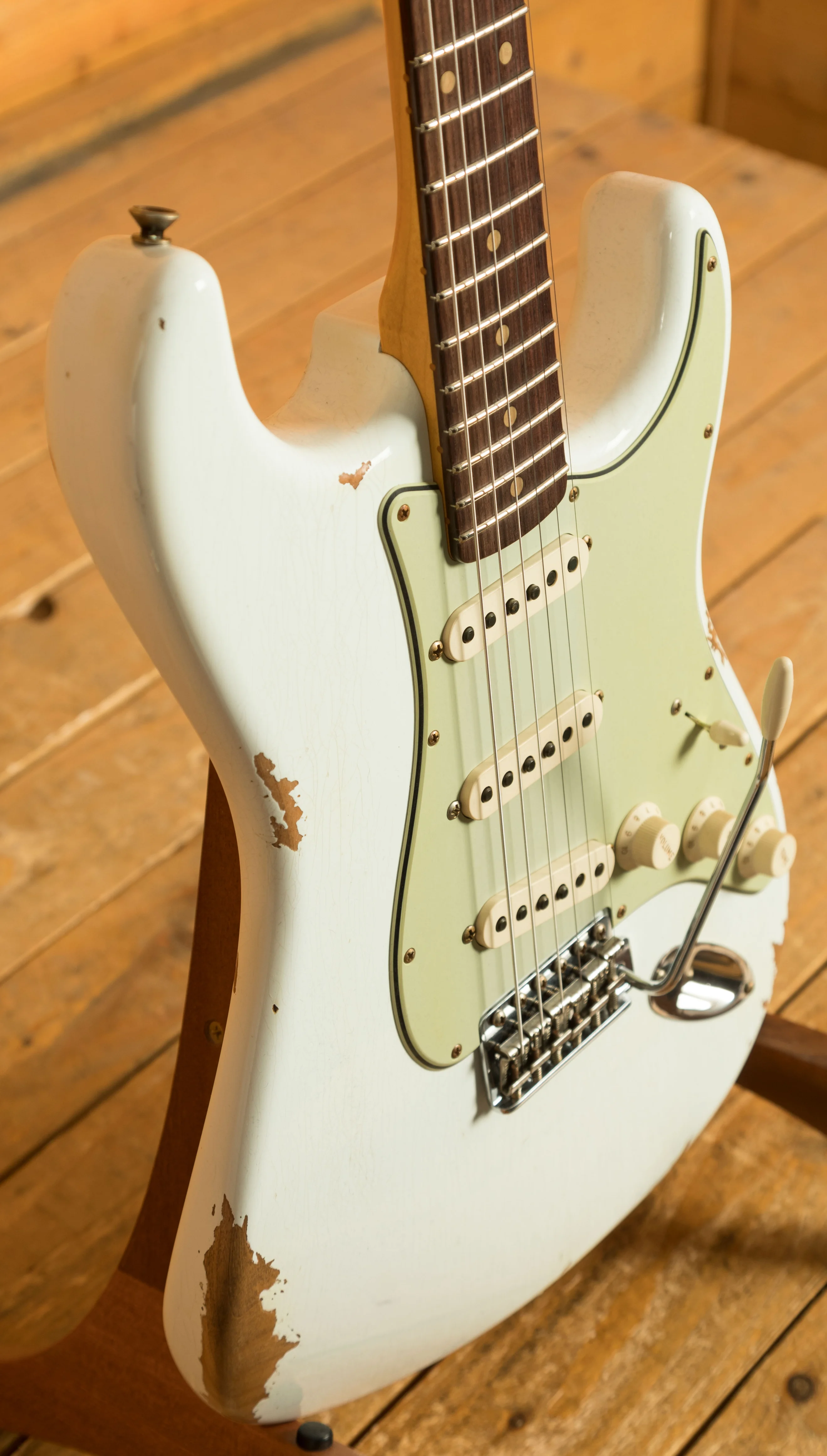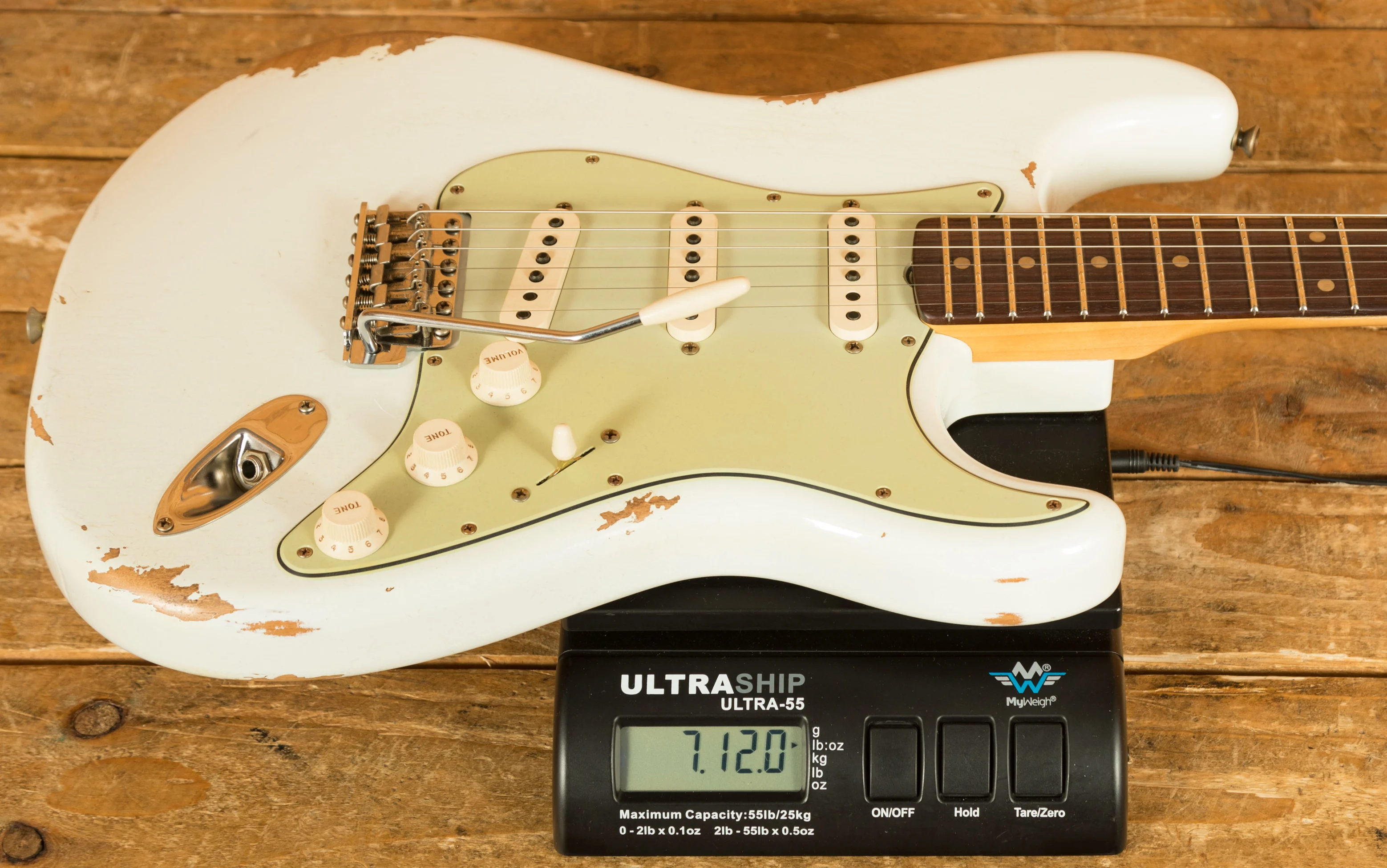 An Alder body is finished in a super cool Olympic White, one of Fender's most iconic finishes, it's a real beauty! Authentically aged, this finish will wear beautifully with time and develop its own character even further. The thin nitro finish also allows the natural resonance of the body to sing and sustain much more effectively and with the relicing you also get that road-worn, look without any actual damage to the guitar.