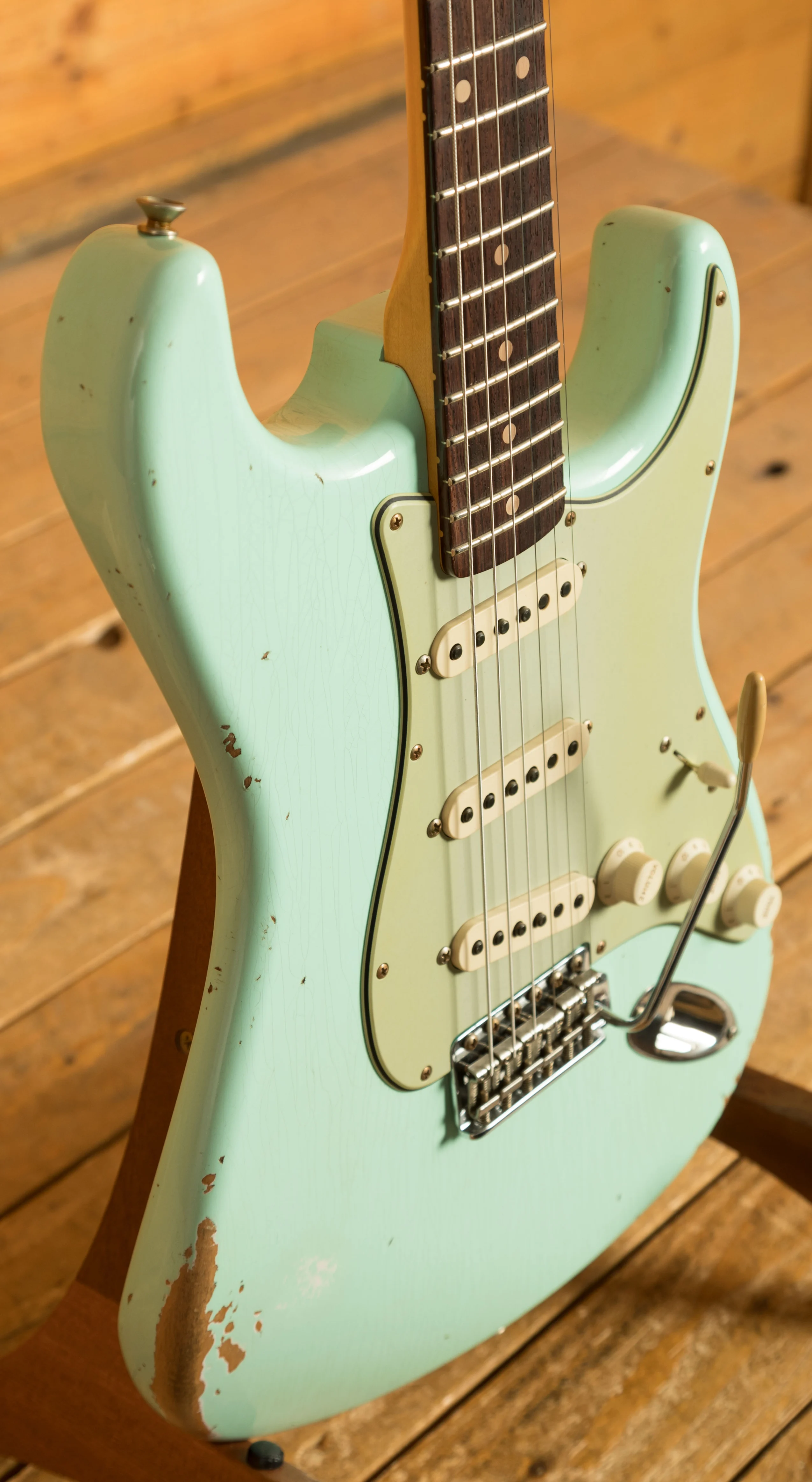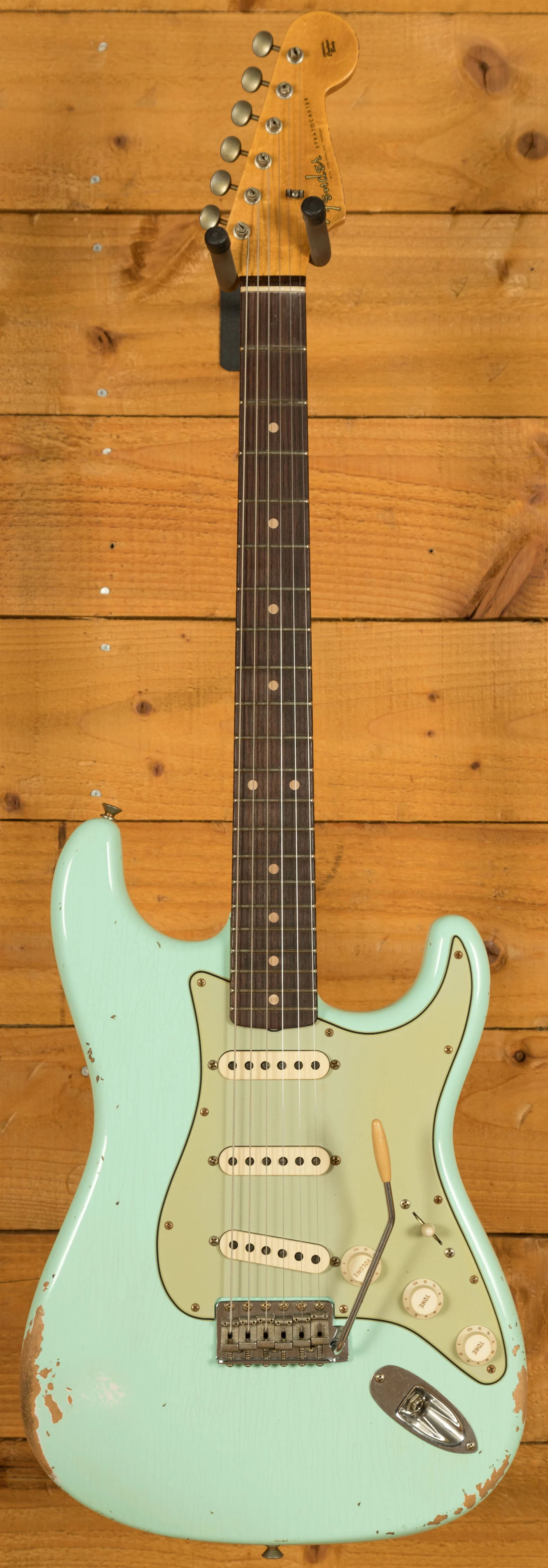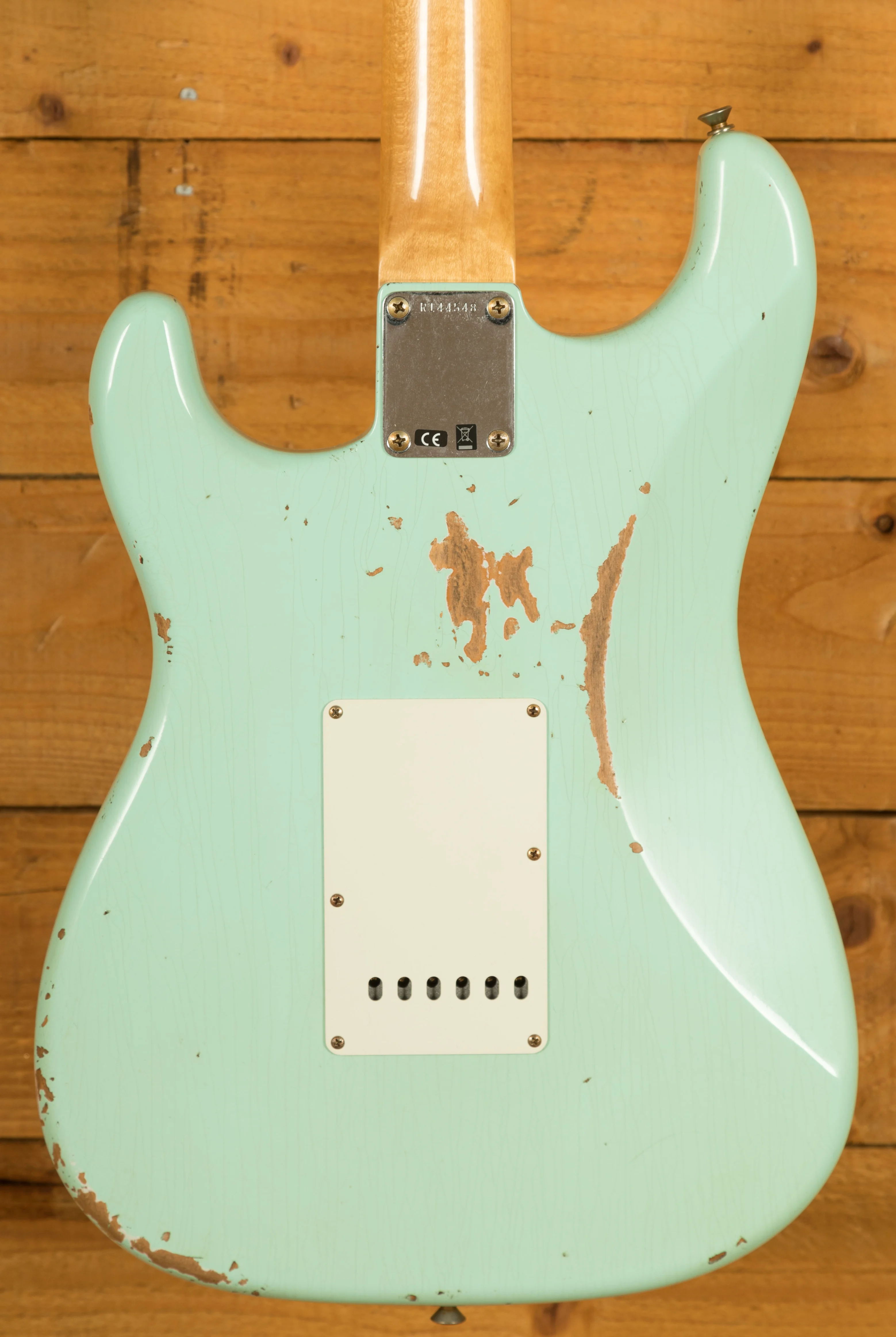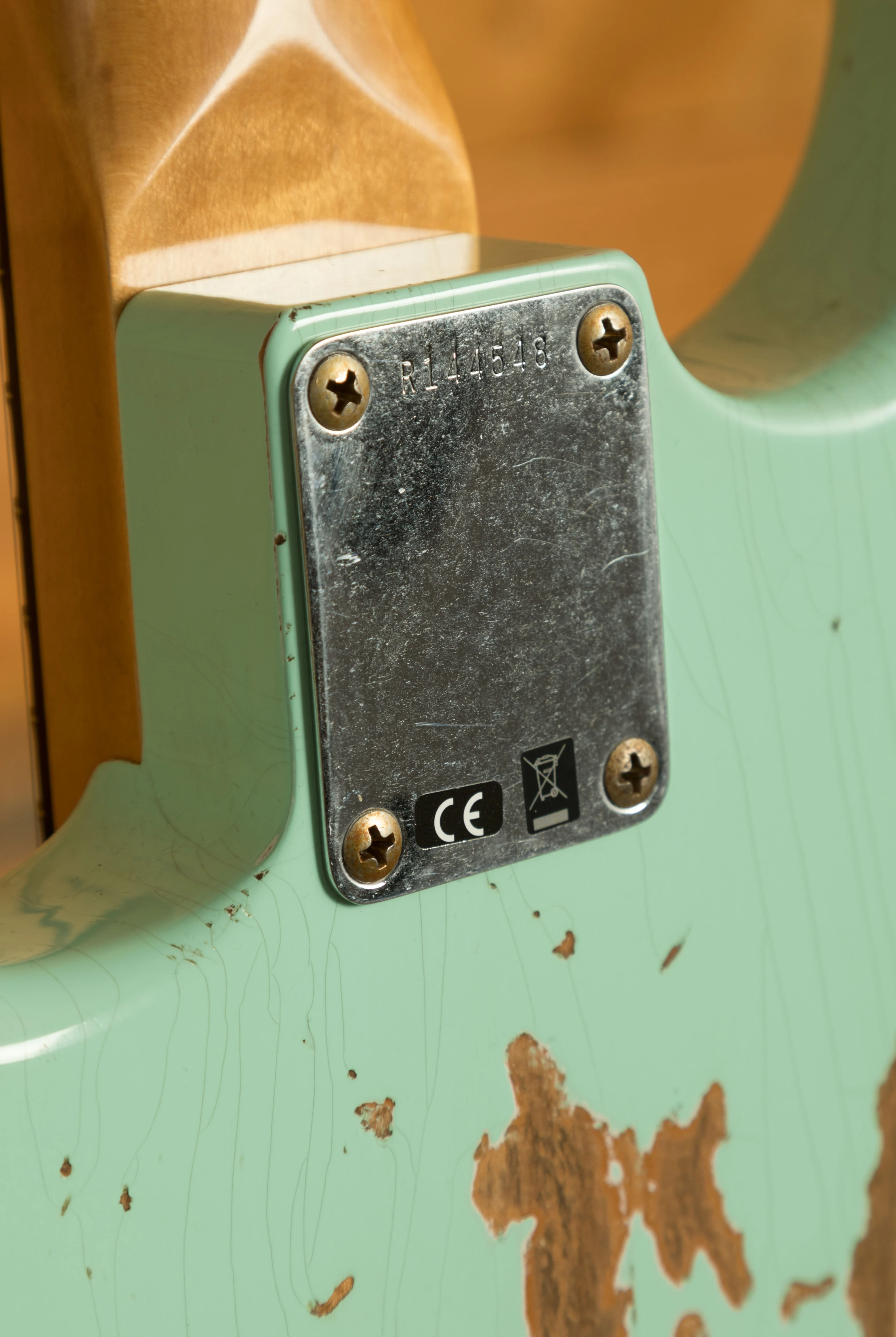 An Alder body is finished in a Surf Green, one of Fender's most styish finishes, it's a real beauty! Authentically aged, this finish will wear beautifully with time and develop its own character even further. The thin nitro finish also allows the natural resonance of the body to sing and sustain much more effectively and with the relicing you also get that road-worn, look without any actual damage to the guitar.