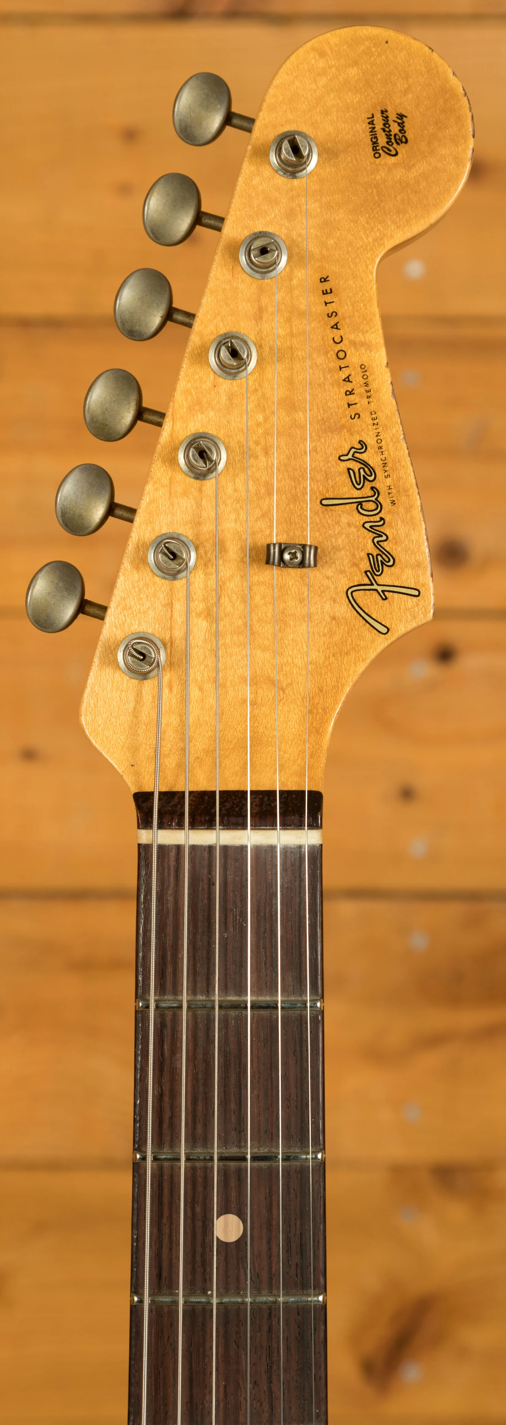 The medium tint rift sawn Maple neck has a smooth nitro finished back and an AAA grade sort-for-dark Rosewood fingerboard. With a 9.5" fingerboard radius and 21 6100 jumbo frets, the '59 Custom Shop Stratocaster can handle anything you throw at it without even breaking a sweat; it's supremely comfortable and well balanced. The 60 Style Oval "C" neck profile is a joy to play and offers a great platform for both rhythm and lead playing - measuring .790" at the 1st fret and .930" at the 12th. With the inclusion of a custom shop vintage Strat bridge and vintage tuners you have brilliant tuning stability and intonation.