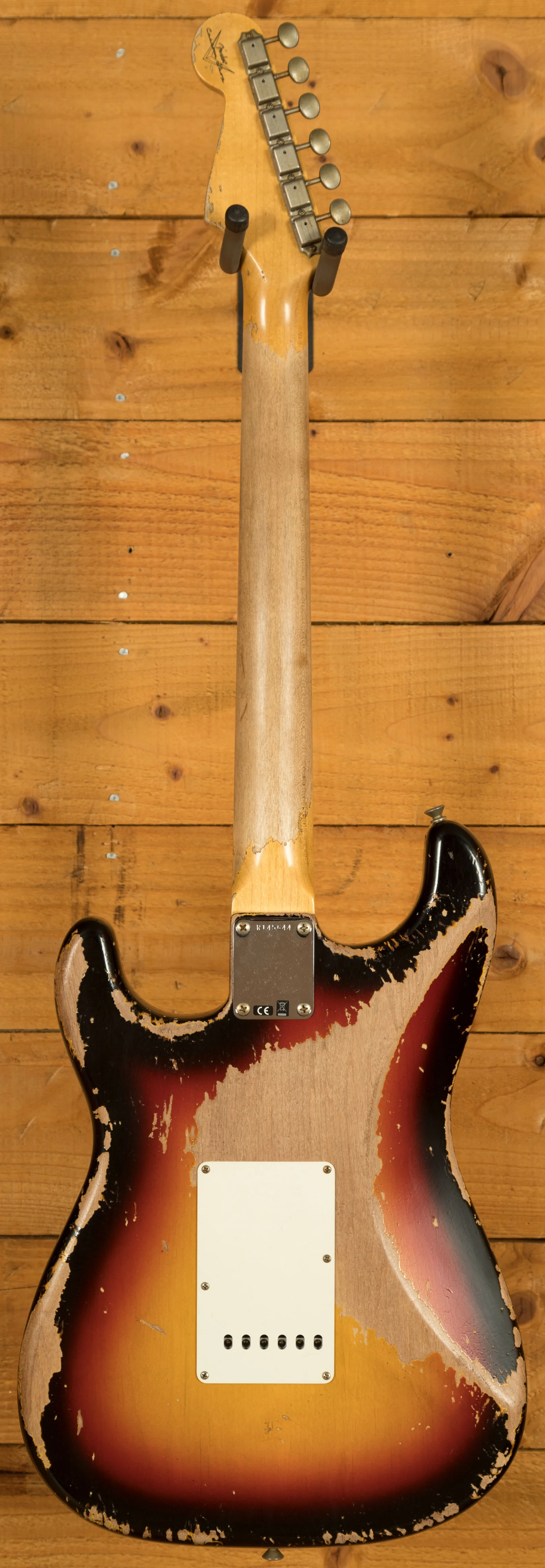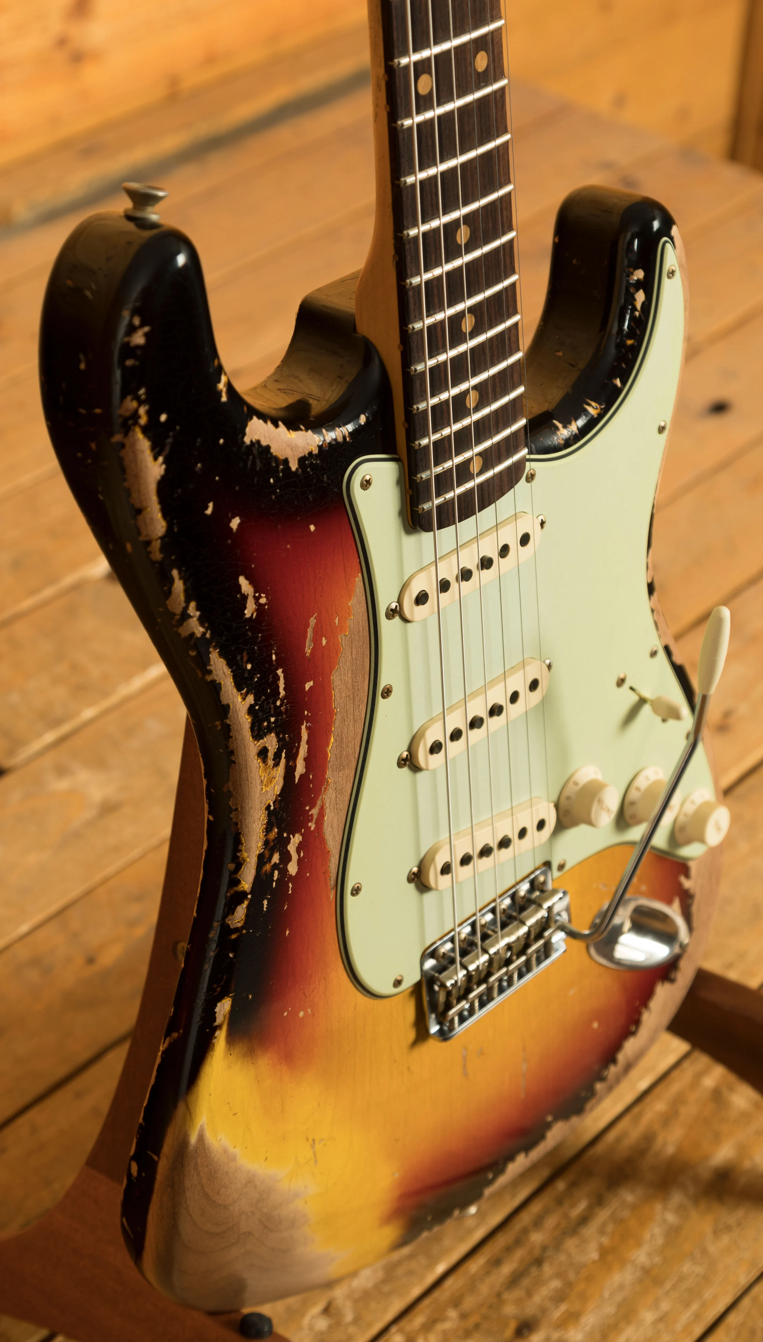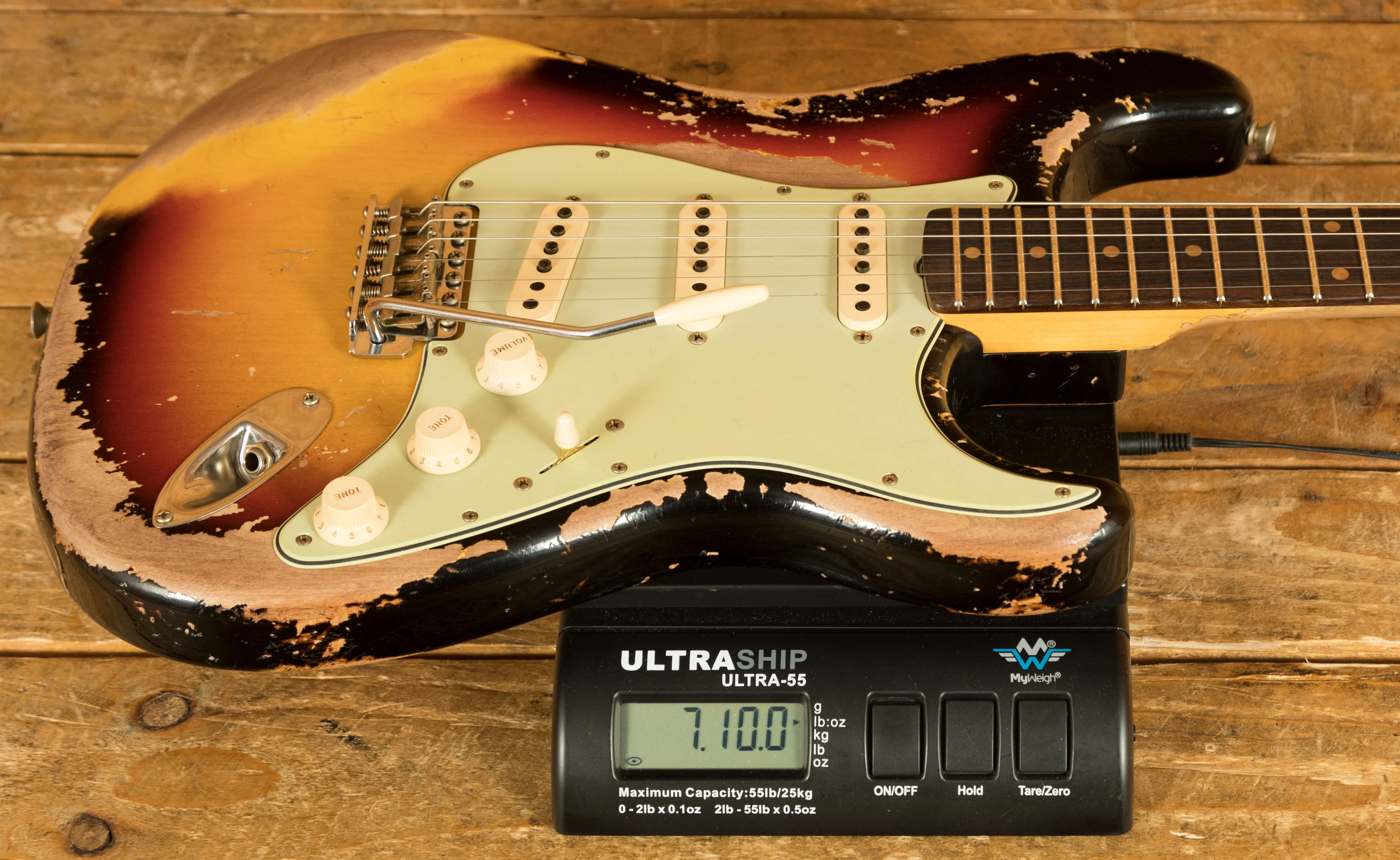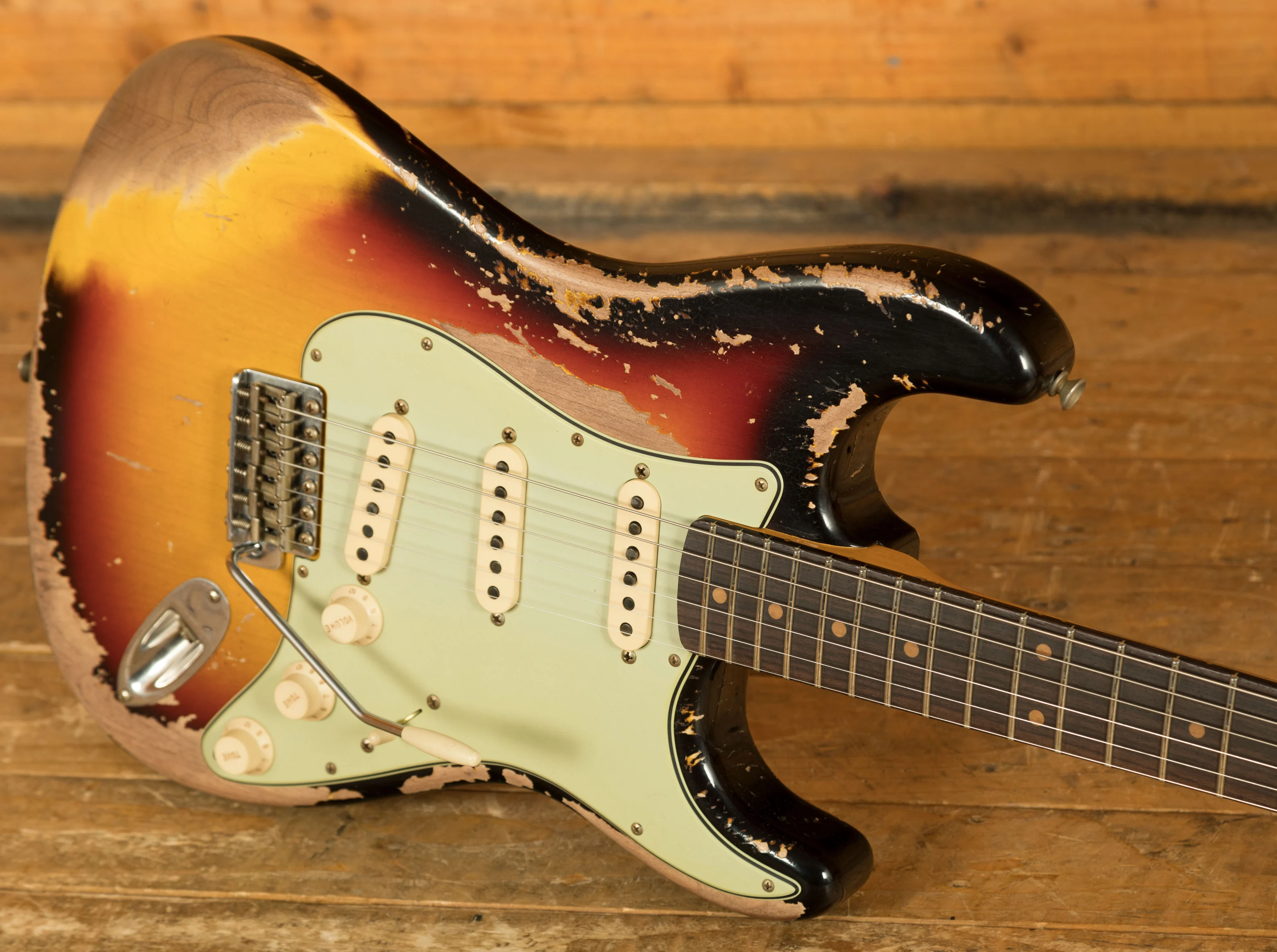 An Alder body is finished in a super cool 3-Tone Sunburst, one of Fender's most iconic finishes, it's a real beauty! Authentically aged, this finish will wear beautifully with time and develop its own character even further. The thin nitro finish also allows the natural resonance of the body to sing and sustain much more effectively and with the super heavy relicing you also get that extreme road-worn, look without any actual damage to the guitar.