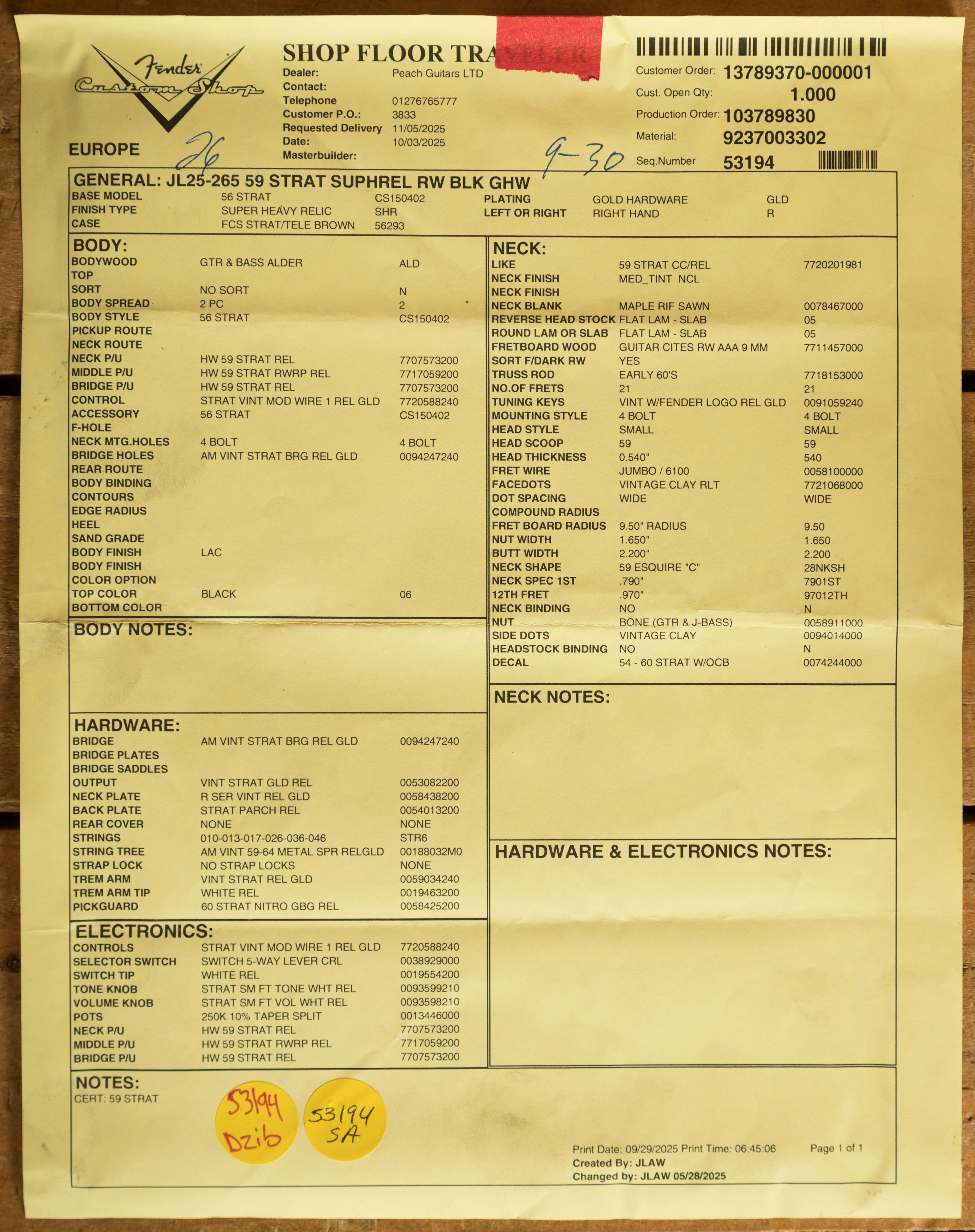 The medium tint riftsawn Maple neck has a smooth nitro finished back and an AAA grade sort-for-dark slab Rosewood fingerboard. With a 9.5" fingerboard radius and 21 6100 jumbo frets, the '59 Custom Shop Stratocaster can handle anything you throw at it without even breaking a sweat; it's supremely comfortable and well balanced. The 59 Esquire "C" neck profile is a joy to play and offers a great platform for both rhythm and lead playing - measuring .790" at the 1st fret and .970" at the 12th. With the inclusion of gold hardware including an American vintage Strat bridge and vintage tuners, you have brilliant tuning stability and intonation.