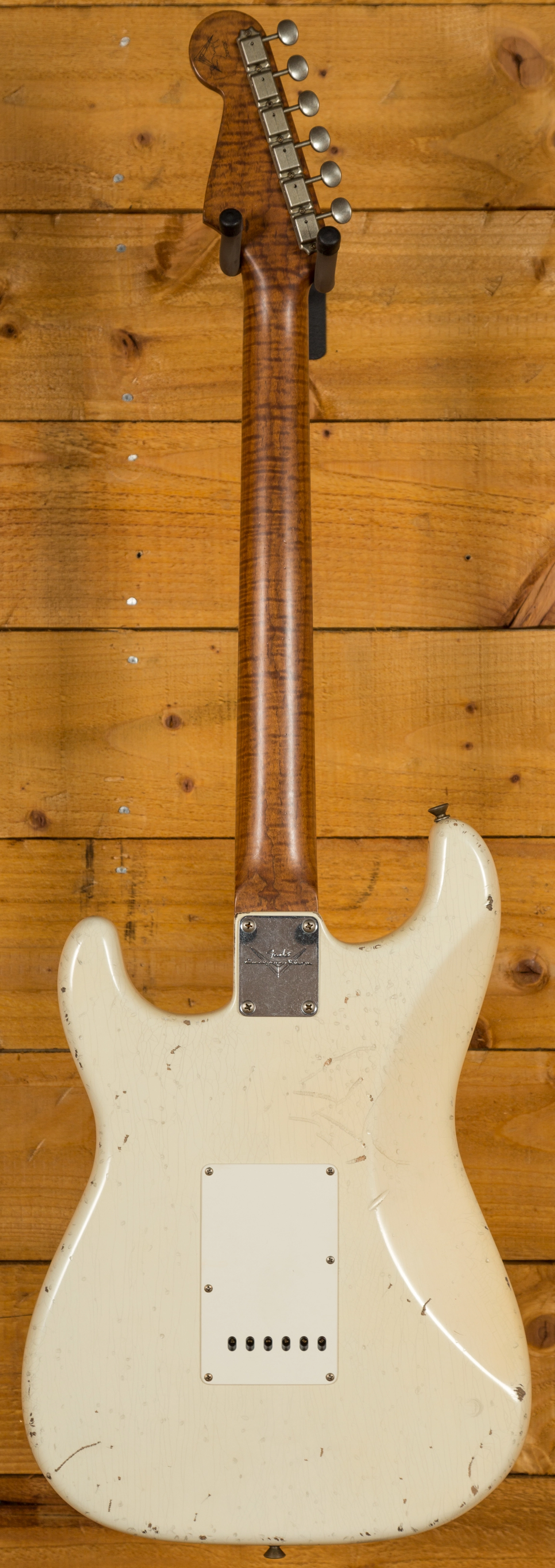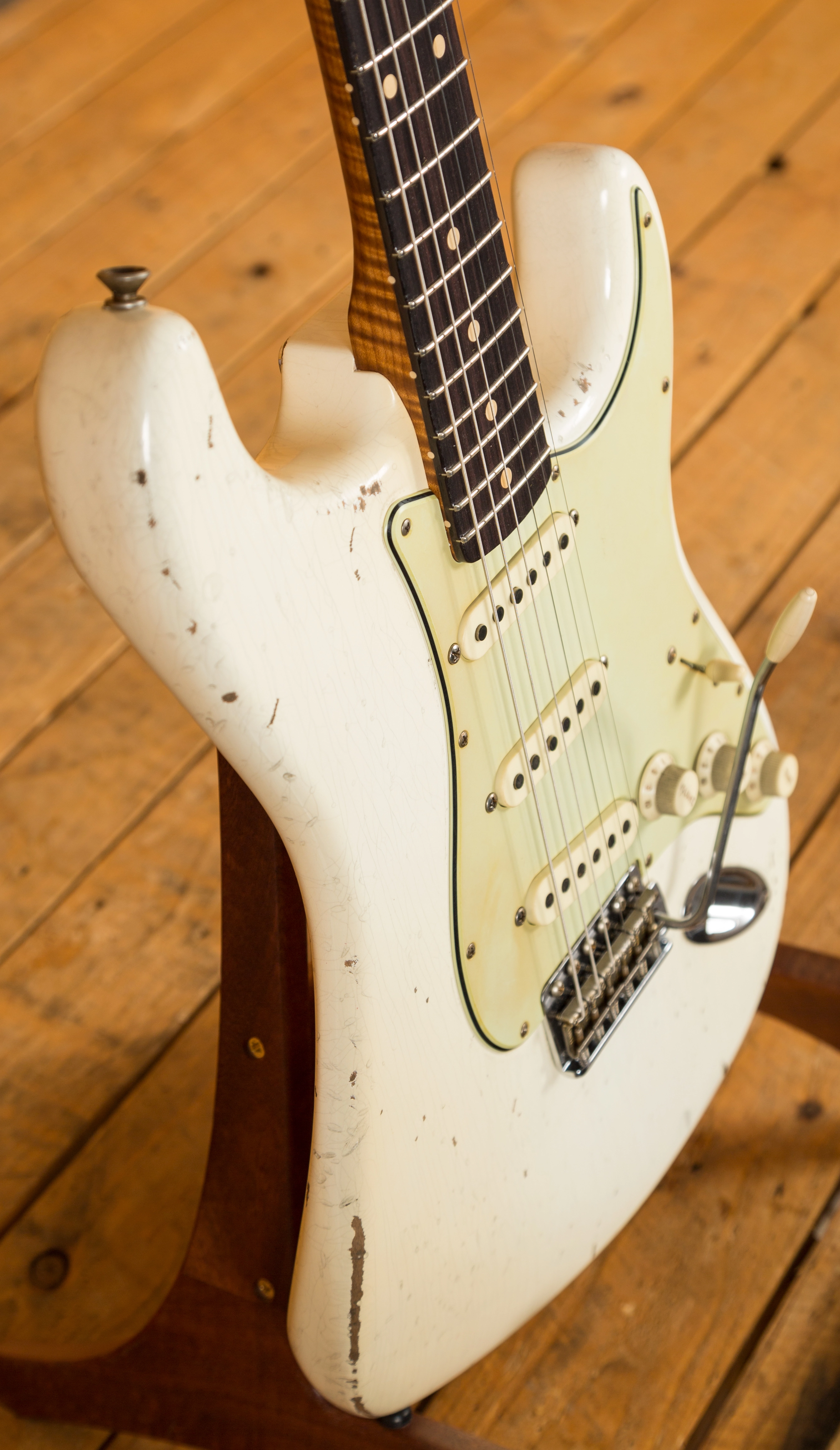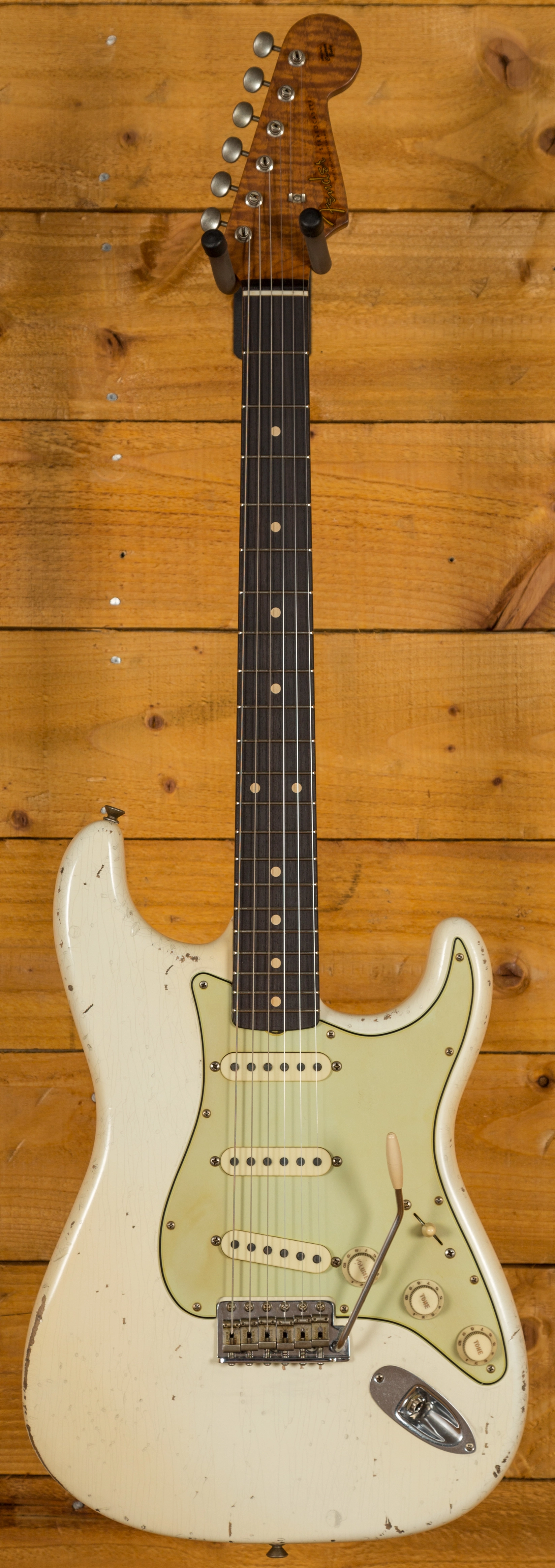 With an Alder body this guitar is super resonant and has a really bold tone. The relic Olympic White finish gives the appearance of a well-loved and gigged guitar; it's totally authentic and really cool. The level of attention to detail that has been applied to this guitar is simply out of this world!