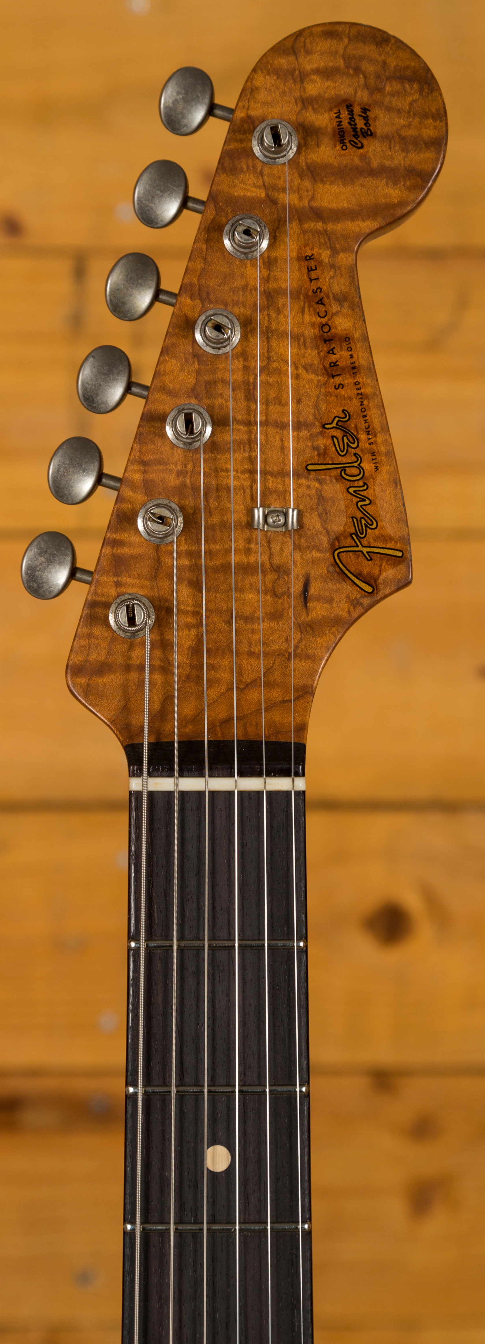 The 4A Roasted Flame Maple neck is real comfortable; it has a worn feel but also a really smooth gradient. With a '65 Strat C profile, 9.5"-12" compound radius and 6105 frets it's super resonant and feels incredible underhand. The AAA Rosewood fingerboard is a treat to play, perfectly balanced and with flawless playability right up the neck, it's a real player's piece.