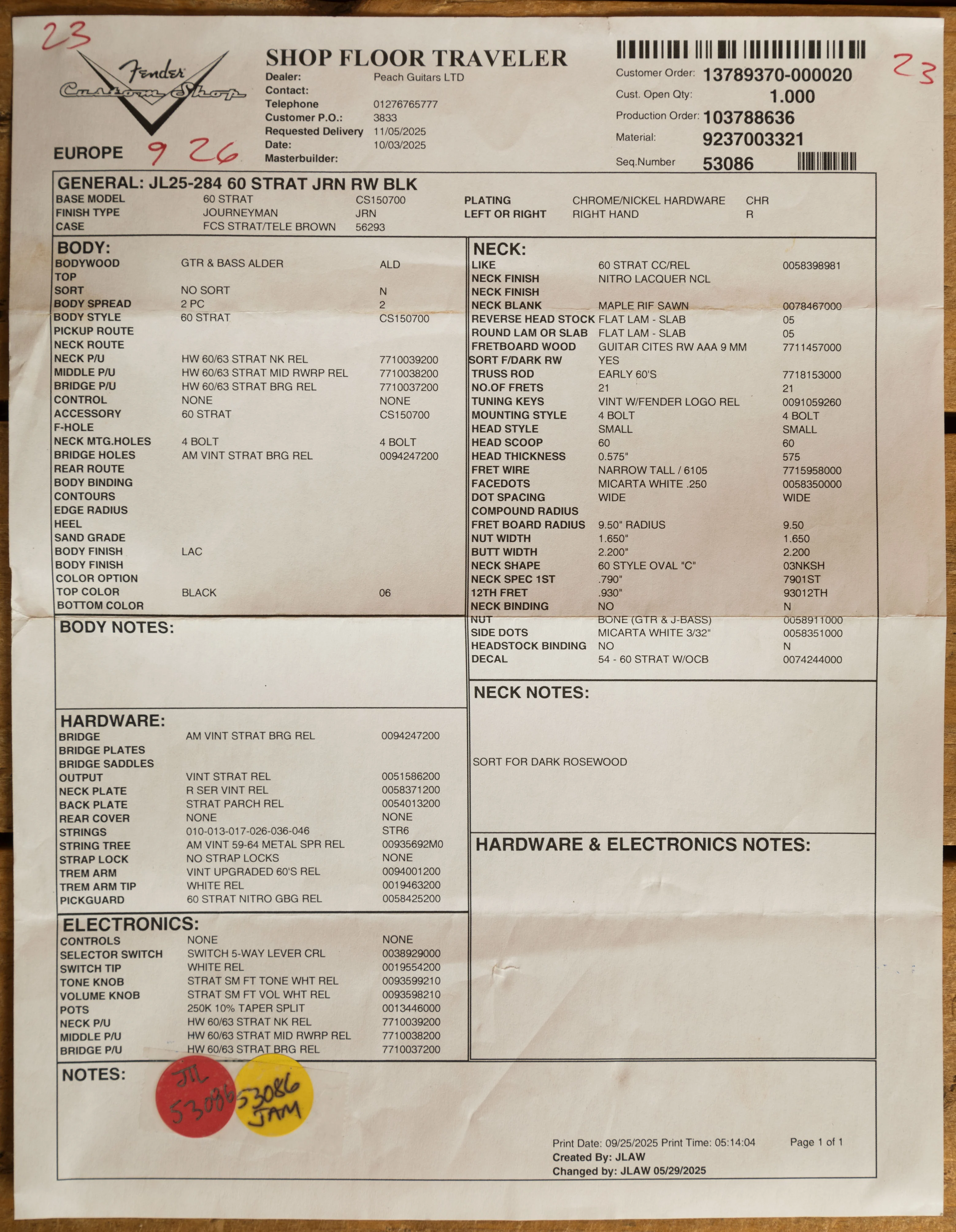 The rift sawn Maple neck has a smooth nitro finish. With a sort-for-dark slab rosewood fingerboard, 9.5" radius and 21 narrow tall frets, the '60 Custom Shop Stratocaster also features a '60 Style Oval "C" neck shape. Measuring .790" at the 1st fret and .930" at the 12th, it's supremely comfortable and well balanced.