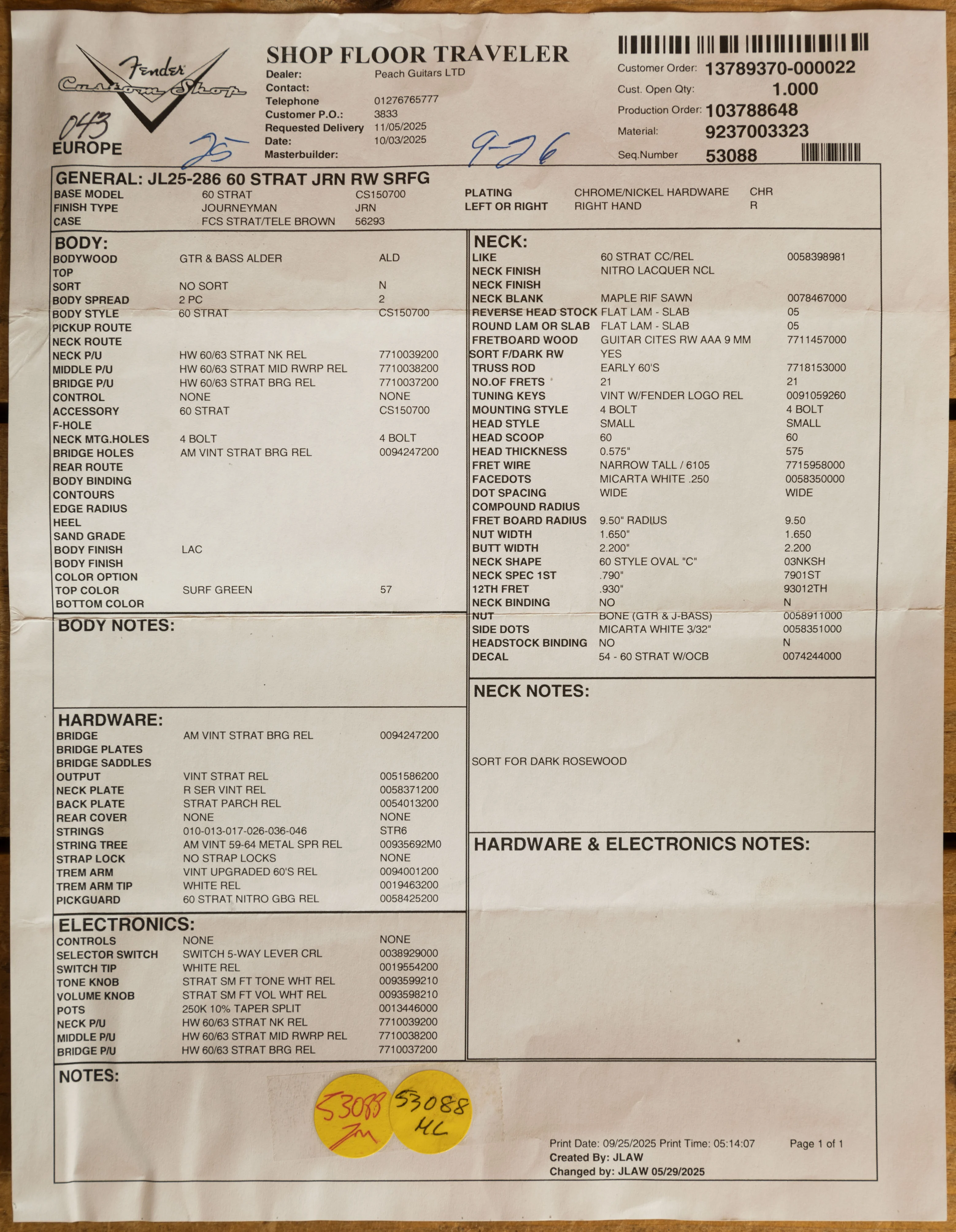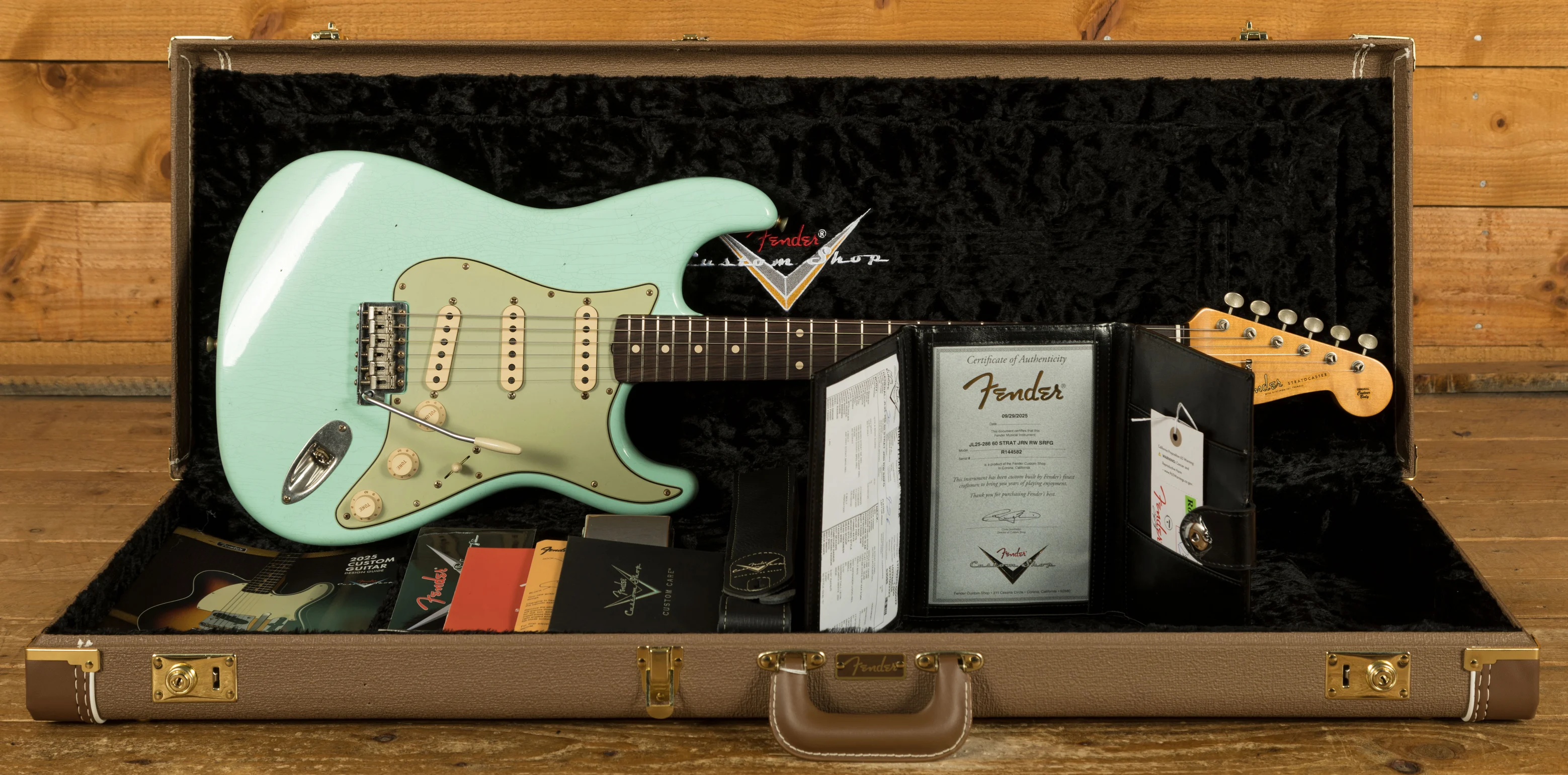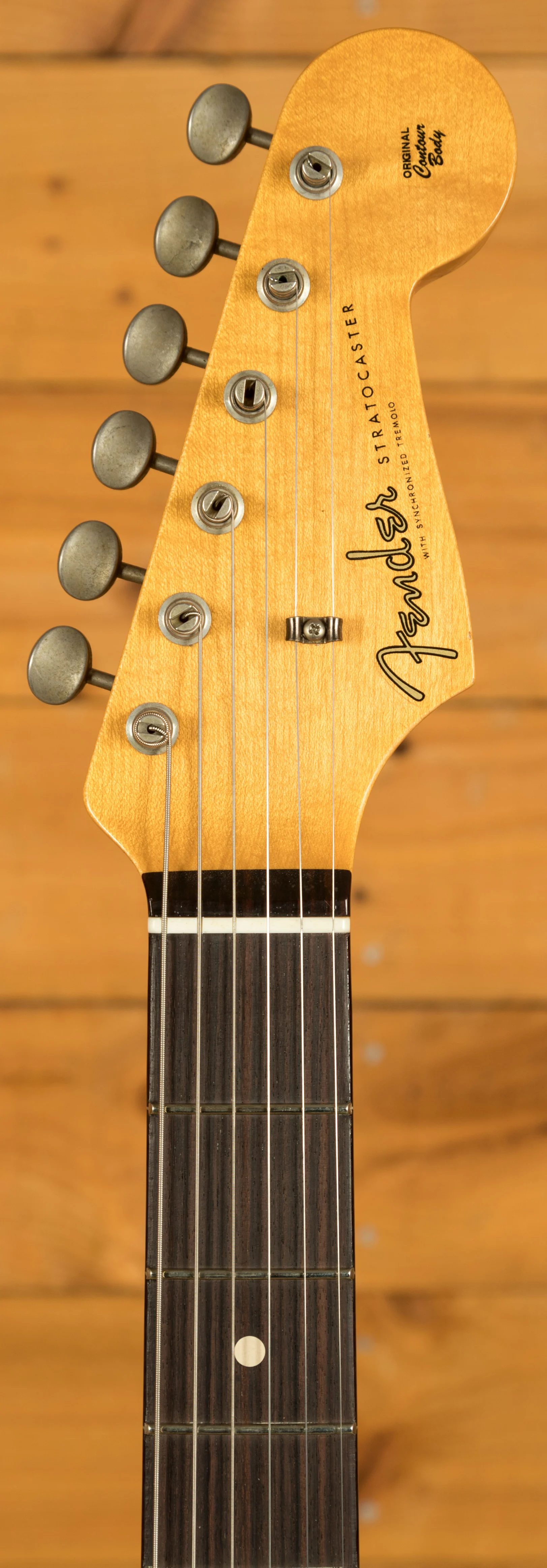 The rift sawn Maple neck has a smooth nitro finish. With a sort-for-dark slab rosewood fingerboard, 9.5" radius and 21 narrow tall frets, the '60 Custom Shop Stratocaster also features a '60 Style Oval "C" neck shape. Measuring .790" at the 1st fret and .930" at the 12th, it's supremely comfortable and well balanced.