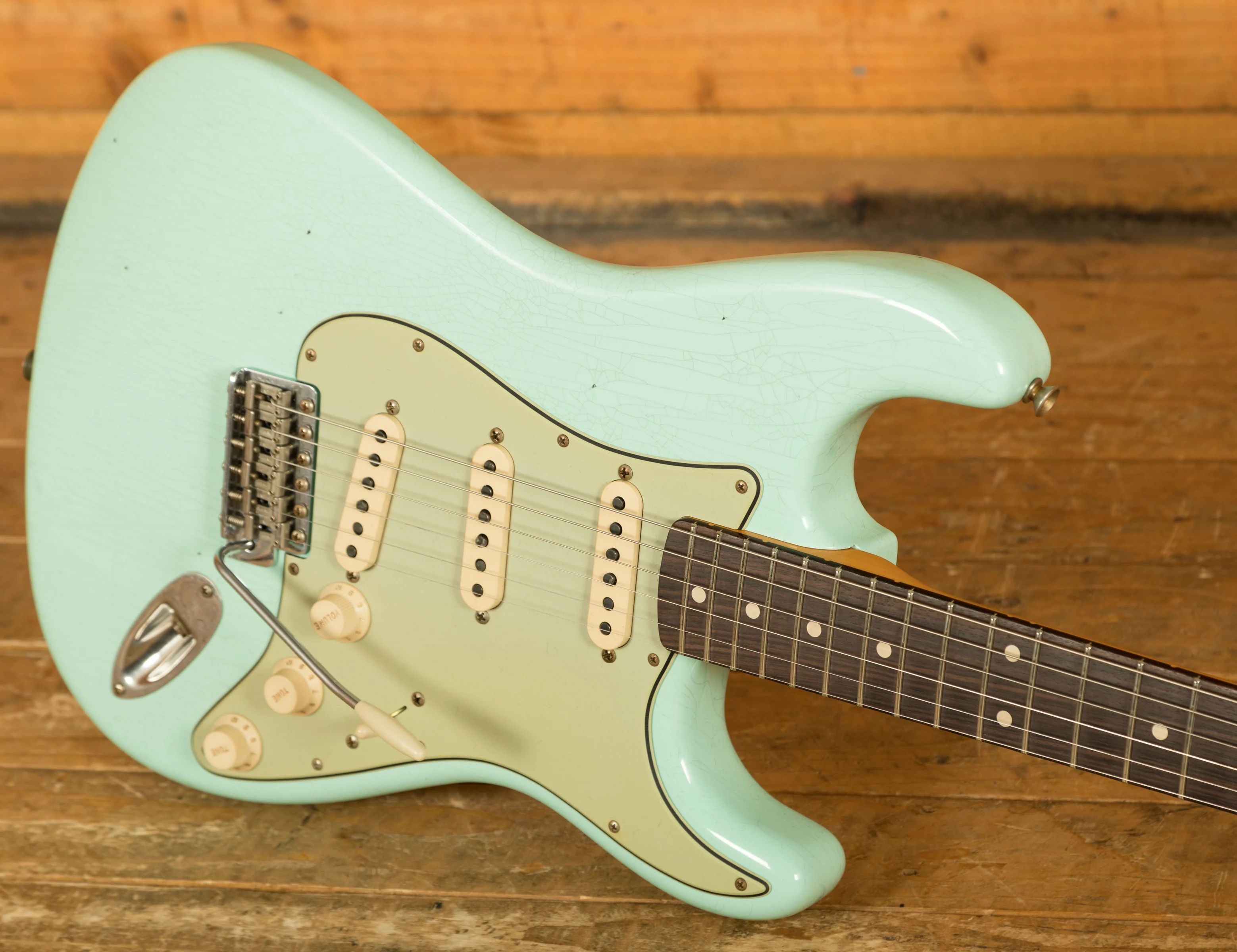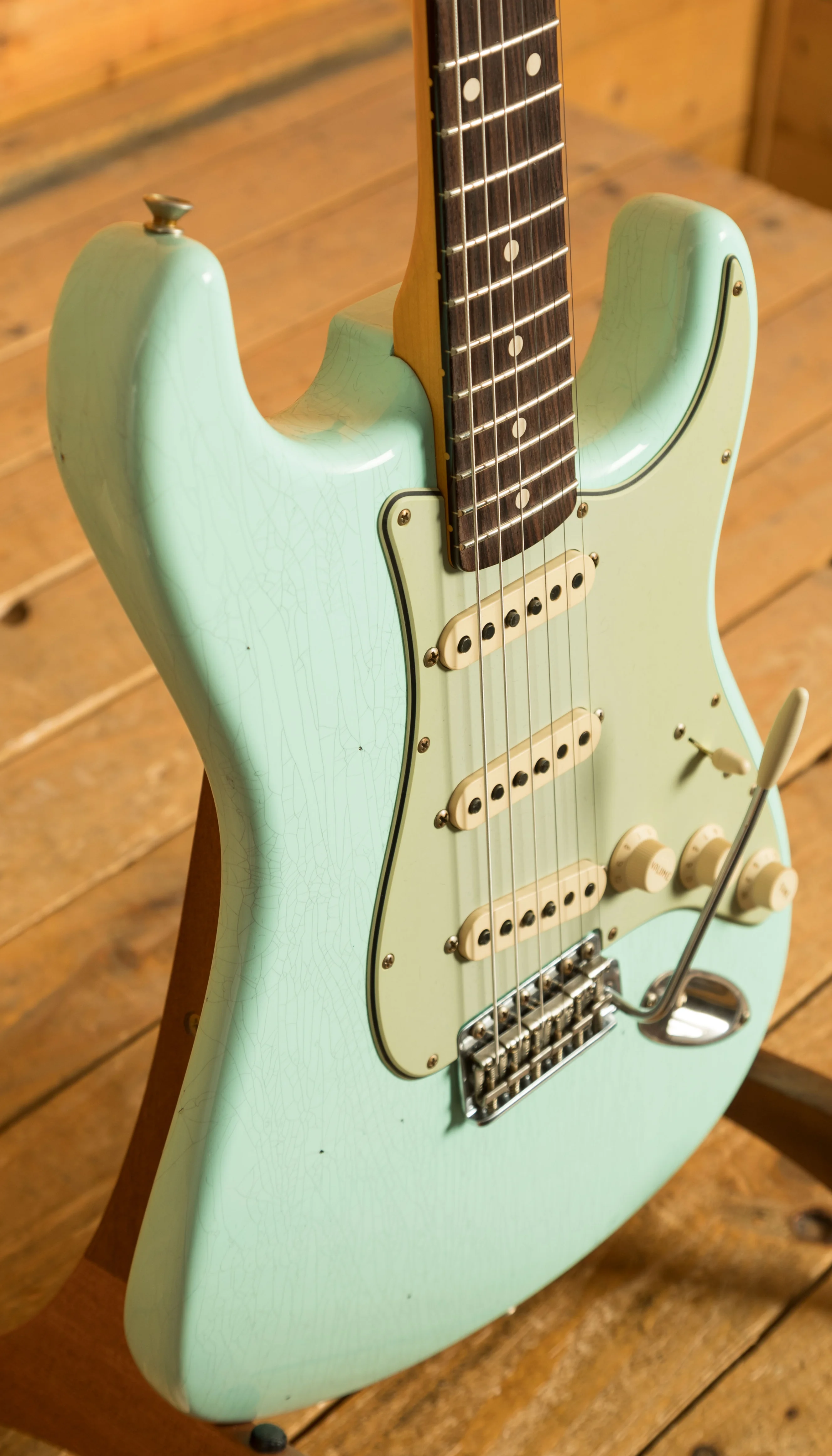 The lightweight Alder body is finished in a classic Journeyman Relic Surf Green nitro lacquer, this finish will wear beautifully with time and develop its own character even further. It also allows the natural resonance of the body to sing and sustain much more effectively compared with other more modern finishes.