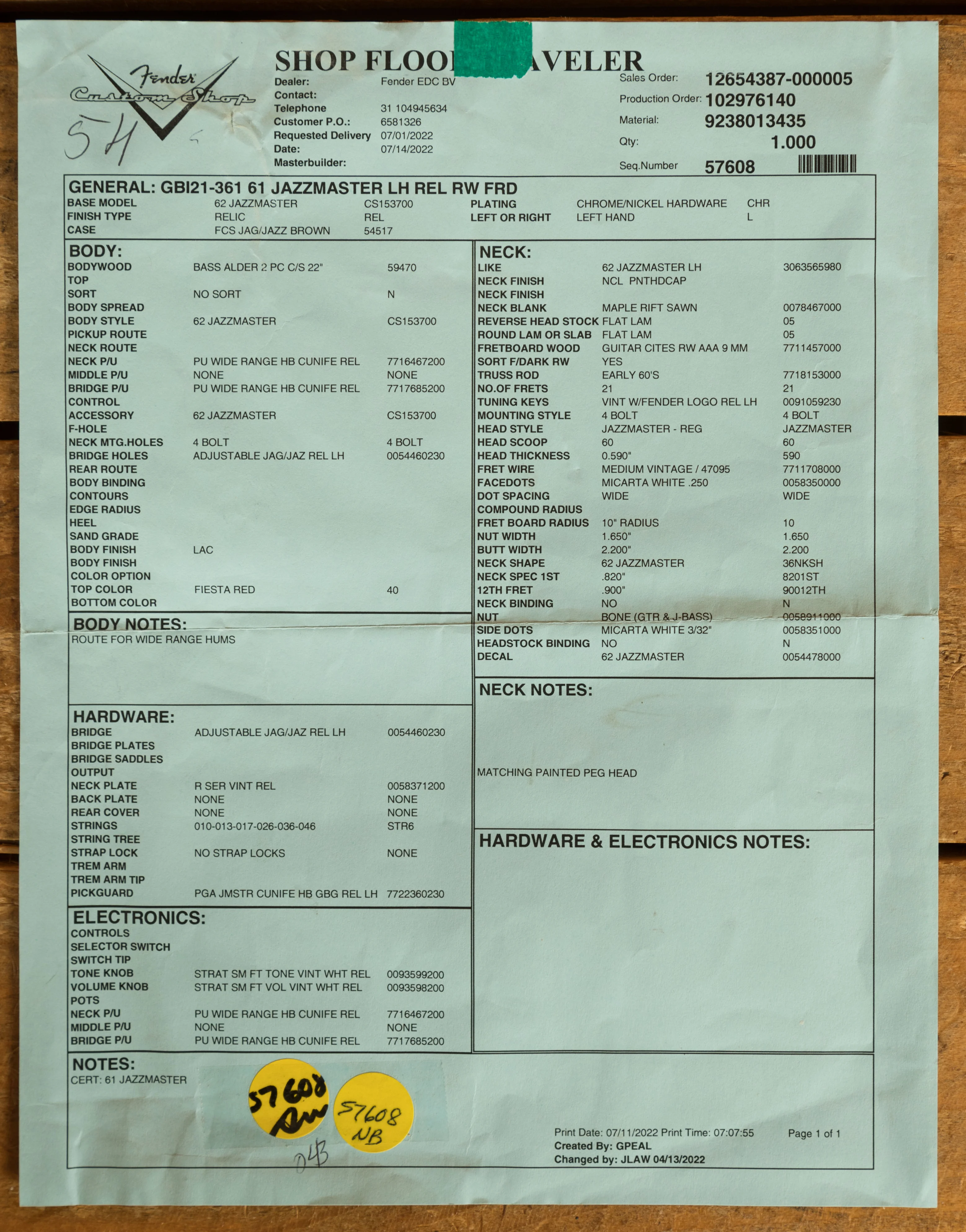 Jazzmasters have seen a resurgence of late and this particular model is bound to attract some serious interest. The rift sawn Maple neck features a cracking sort for dark AAA grade Rosewood fingerboard, 21 medium vintage frets, a 10" radius and a 62 Jazzmaster profile that measures .820" at the 1st fret and .900" at the 12th.