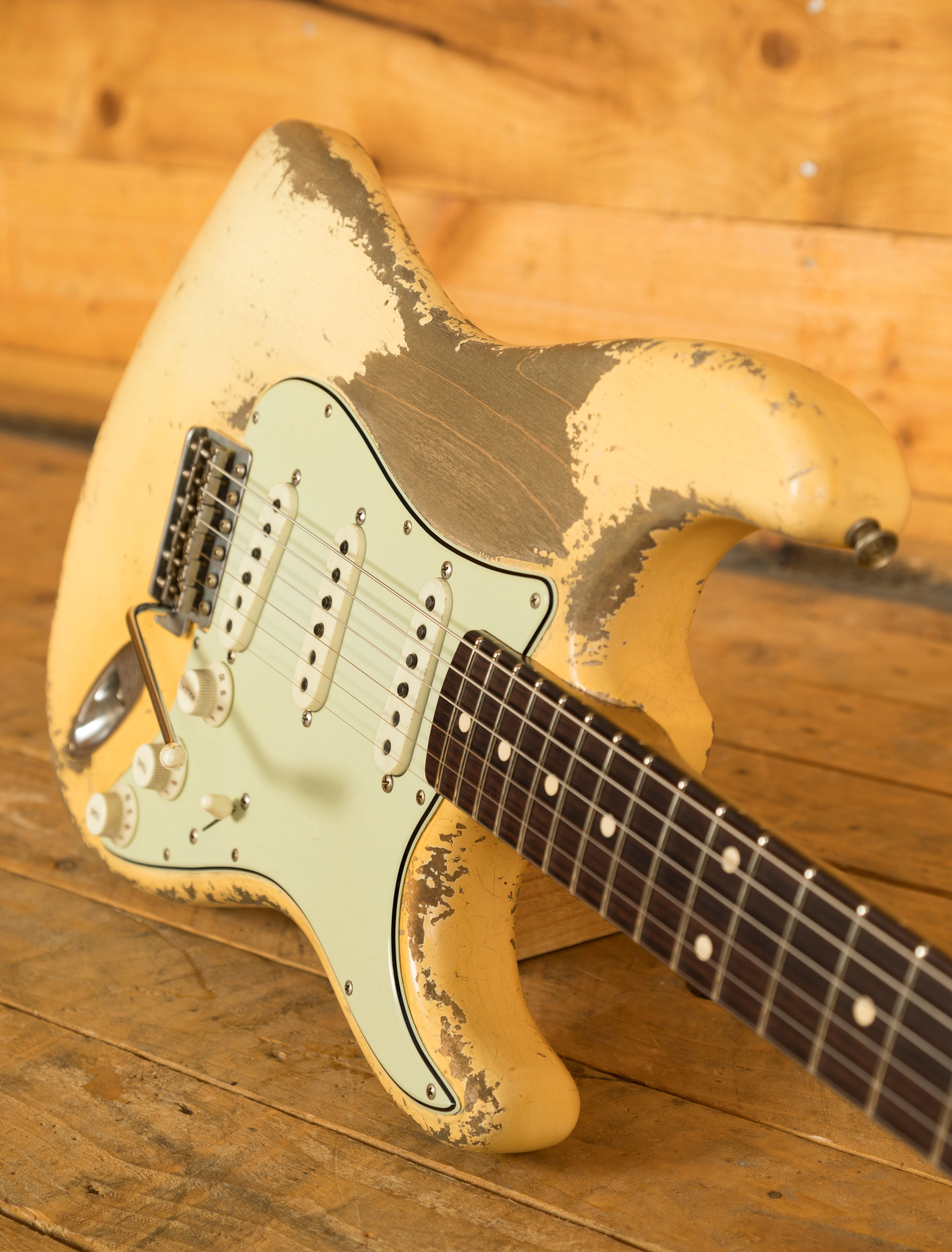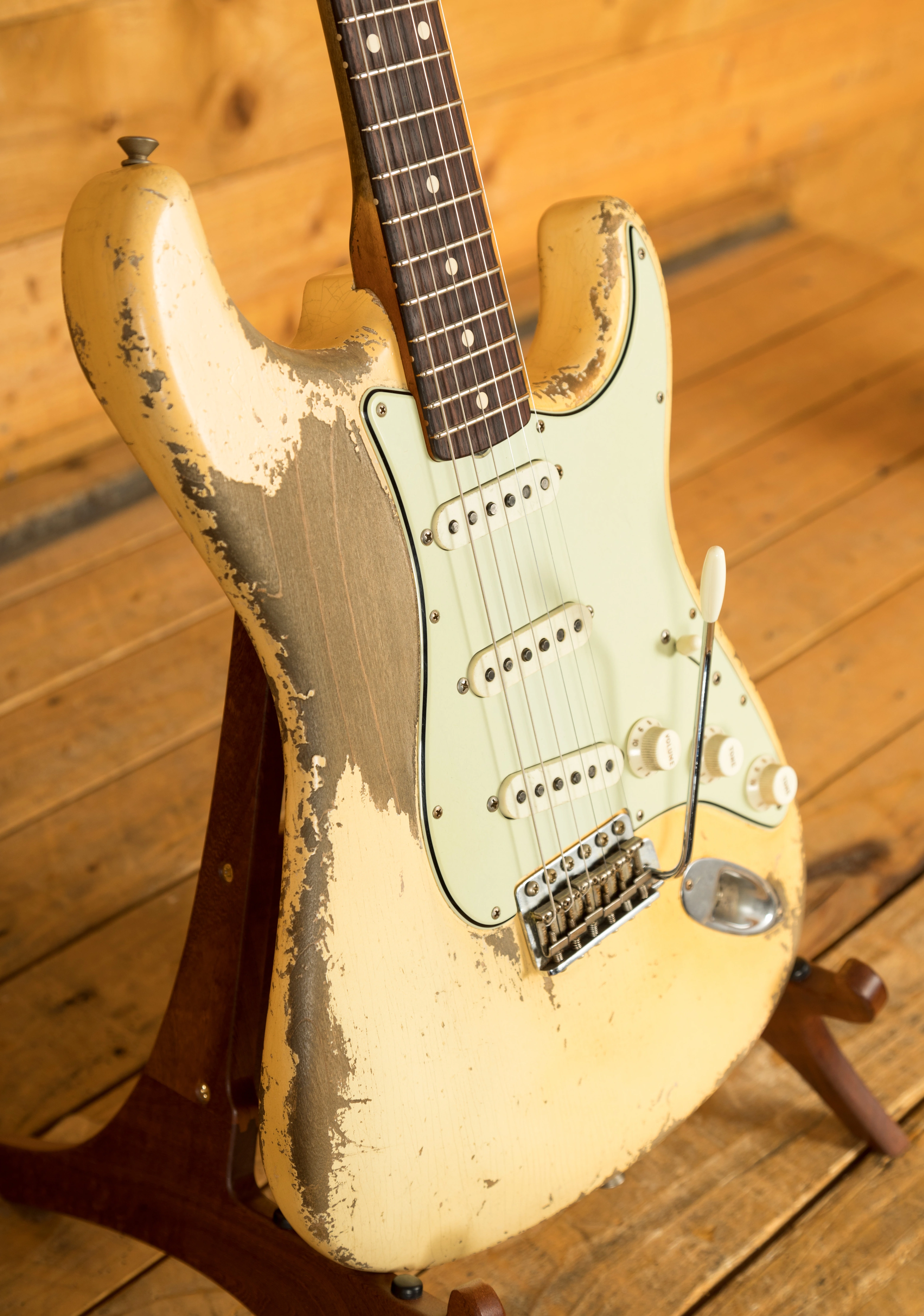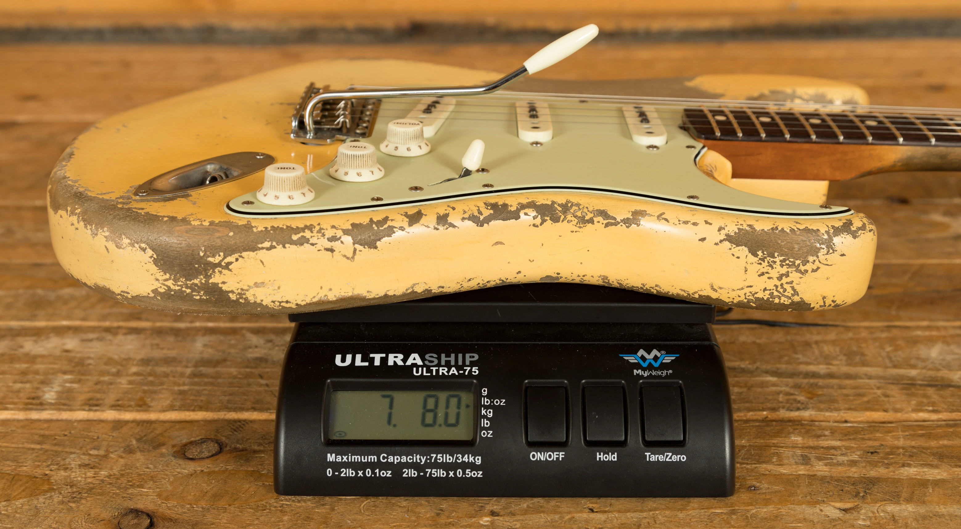 An Alder body is finished in the classic Vintage White, one of Fender's most popular finishes, it's a real beauty! Authentically aged, this finish will wear beautifully with time and develop its own character even further. The thin nitro finish also allows the natural resonance of the body to sing and sustain much more effectively. Dale is the King of relic work at the custom shop and this certainly doesn't disappoint though! The aged hardware on this guitar really complements the relic finish, it's a real looker.