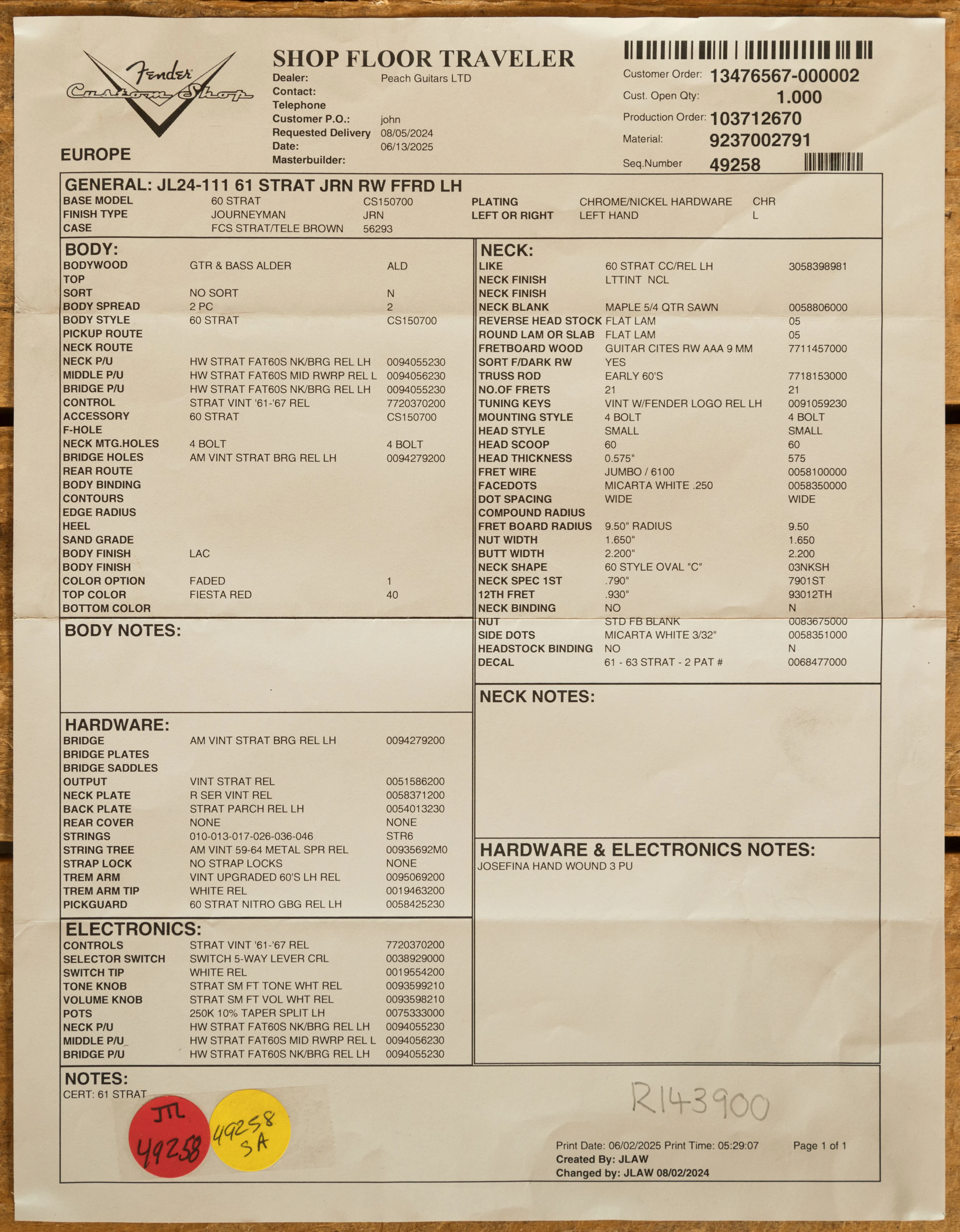 The Alder body is finished in a classic Faded Fiesta Red nitro lacquer. Period correct and authentically aged, this finish will wear beautifully with time and develop its own character even further. It also allows the natural resonance of the body to sing and sustain much more effectively compared with other more modern finishes.