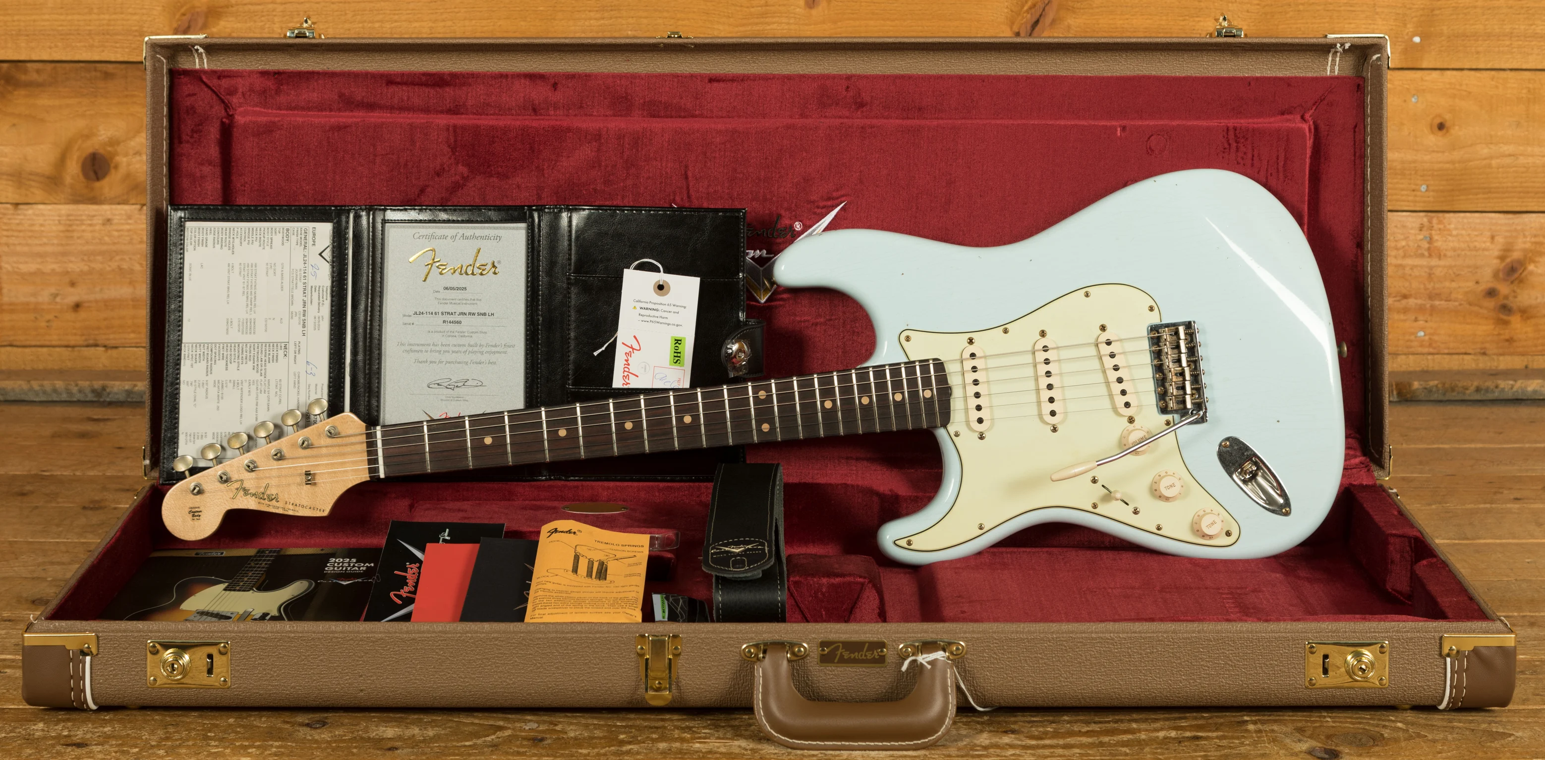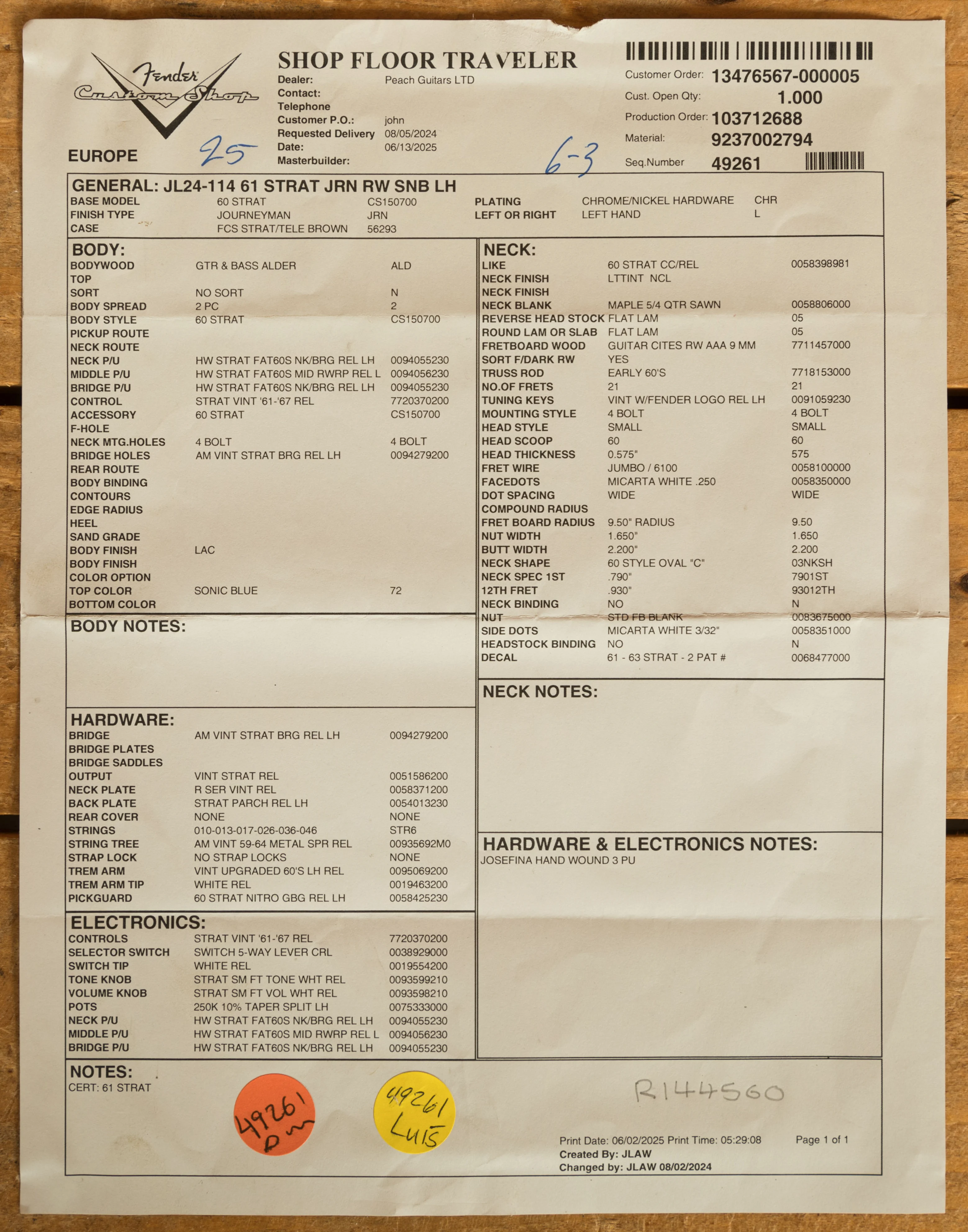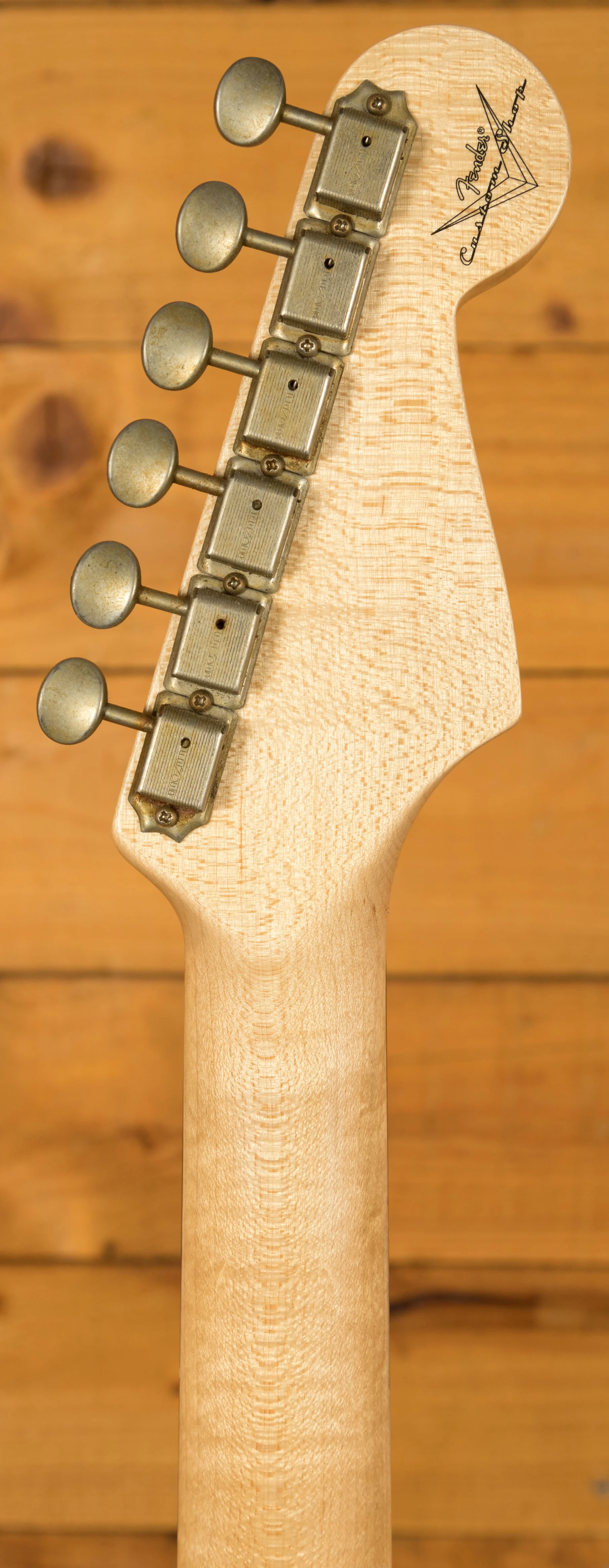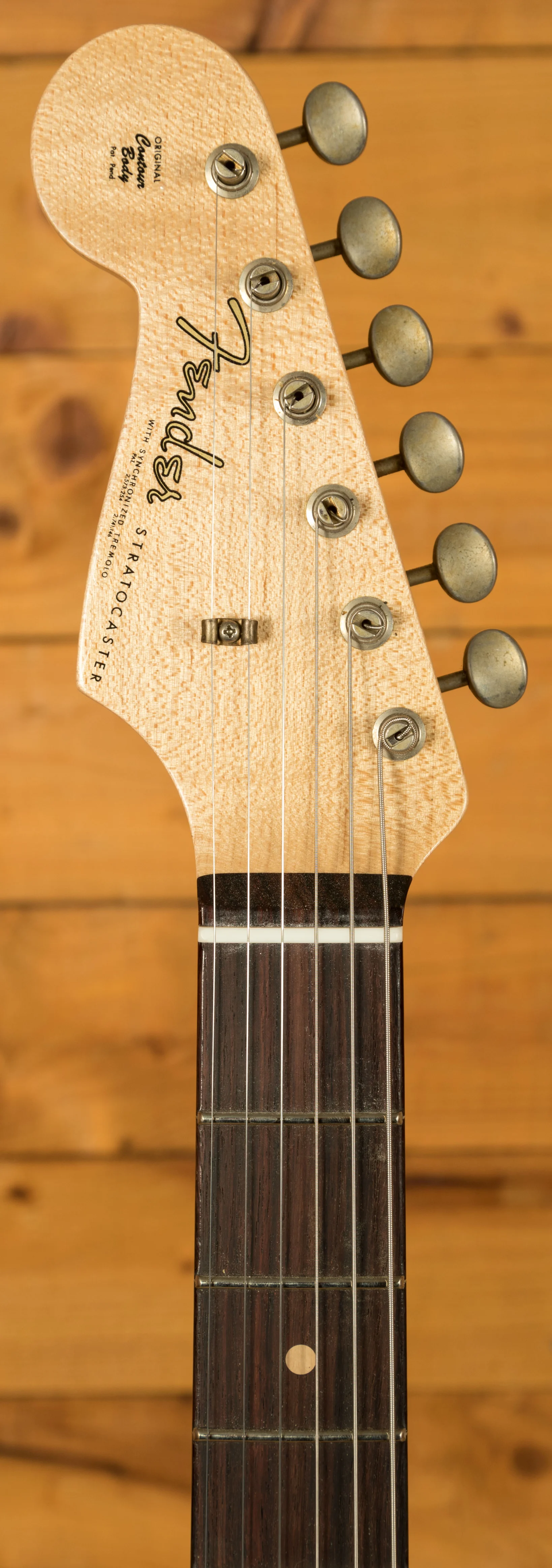 The 5/4 quartersawn Maple neck has a smooth finish and a AAA-grade sort for dark Rosewood fingerboard. With a 9.5" radius and 21 6100 jumbo frets, the '61 Custom Shop Stratocaster also features a '60 Style Oval "C" neck shape that measures .790" at the 1st fret and .930" at the 12th. It's supremely comfortable and well balanced.