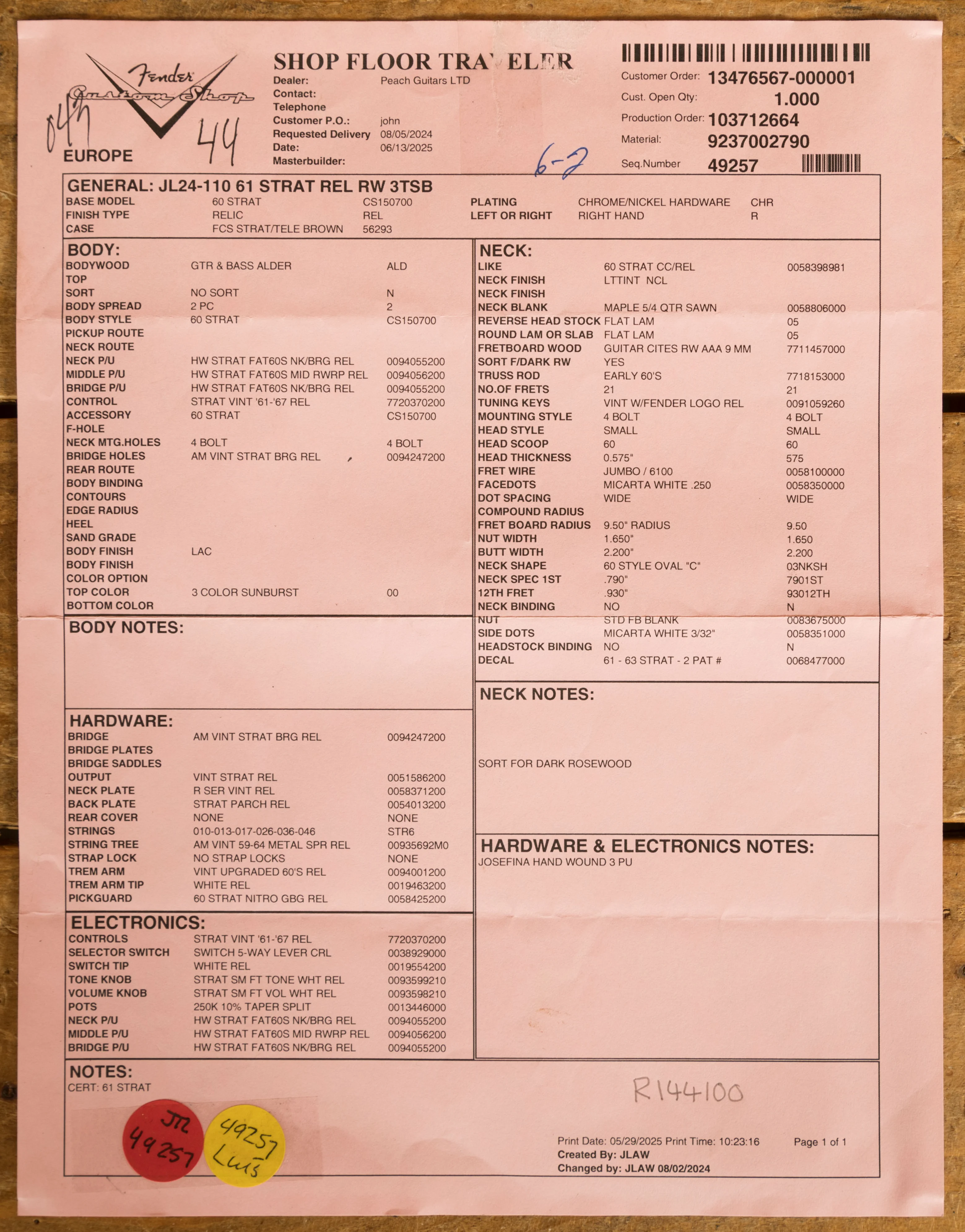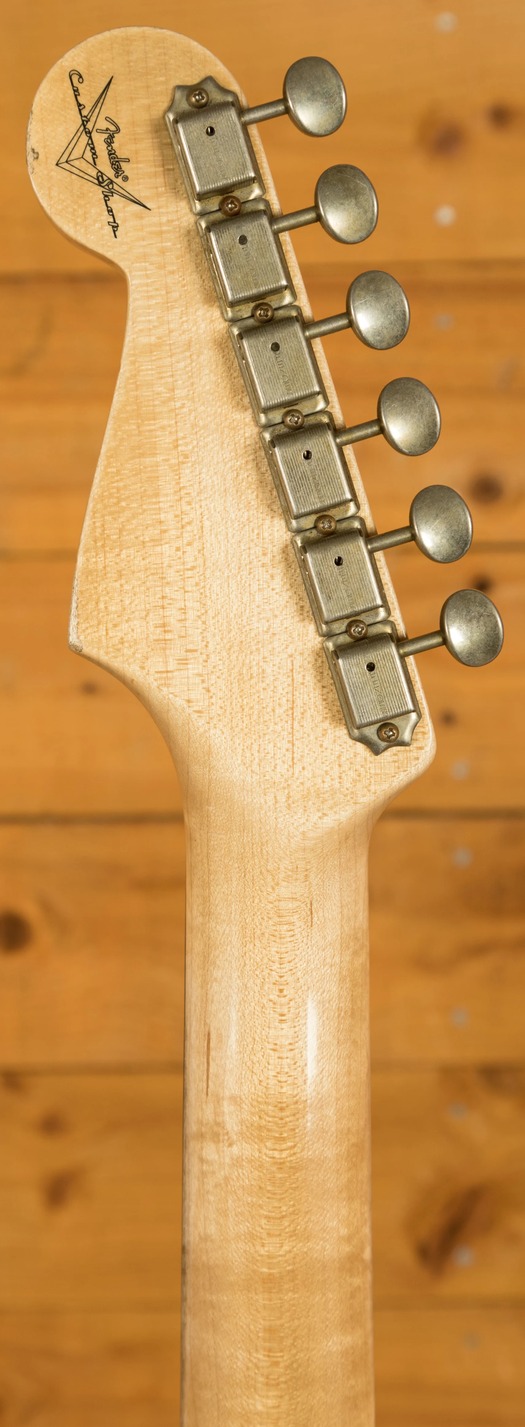 The 5/4 quartersawn Maple neck has a smooth finish and a AAA-grade sort for dark Rosewood fingerboard. With a 9.5" radius and 21 6100 jumbo frets, the '61 Custom Shop Stratocaster also features a '60 Style Oval "C" neck shape that measures .790" at the 1st fret and .930" at the 12th. It's supremely comfortable and well balanced.