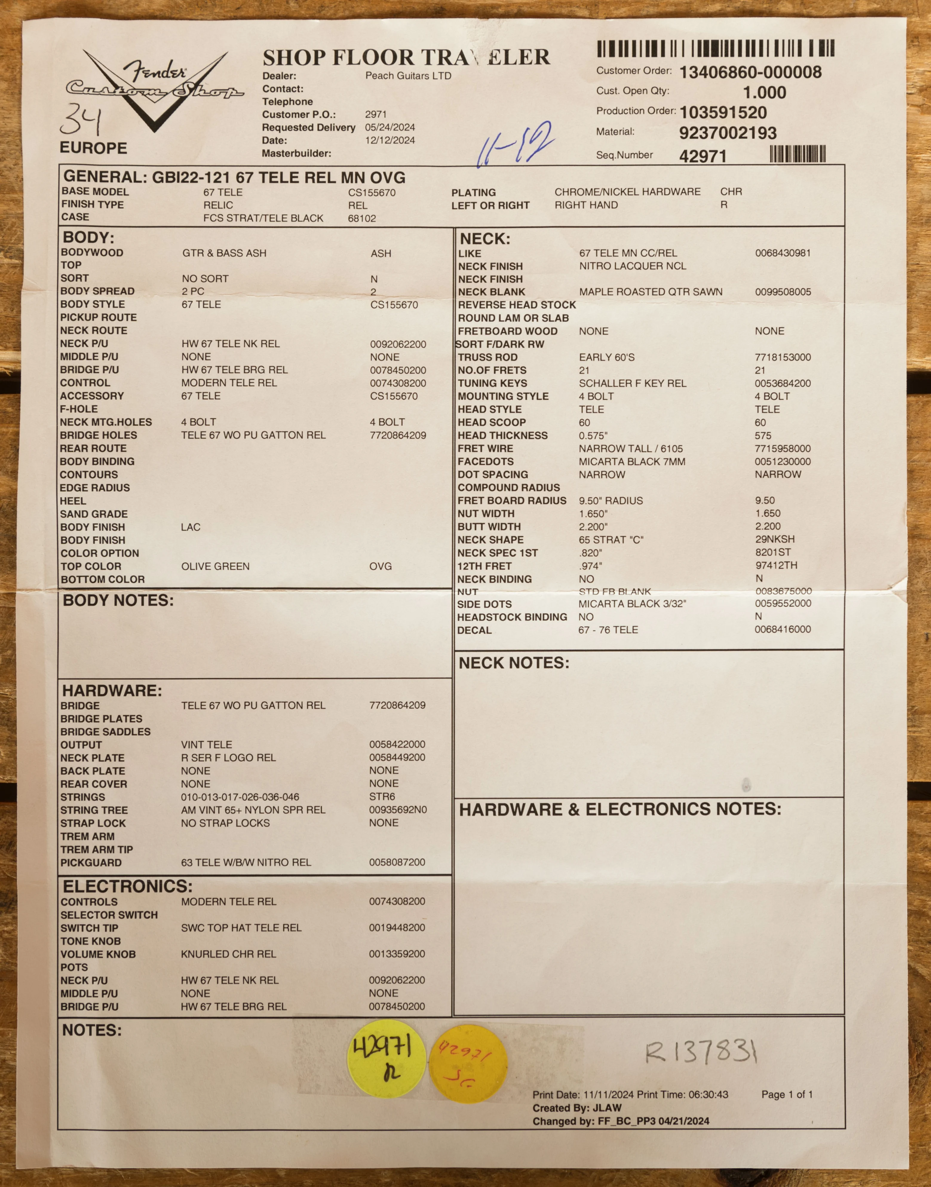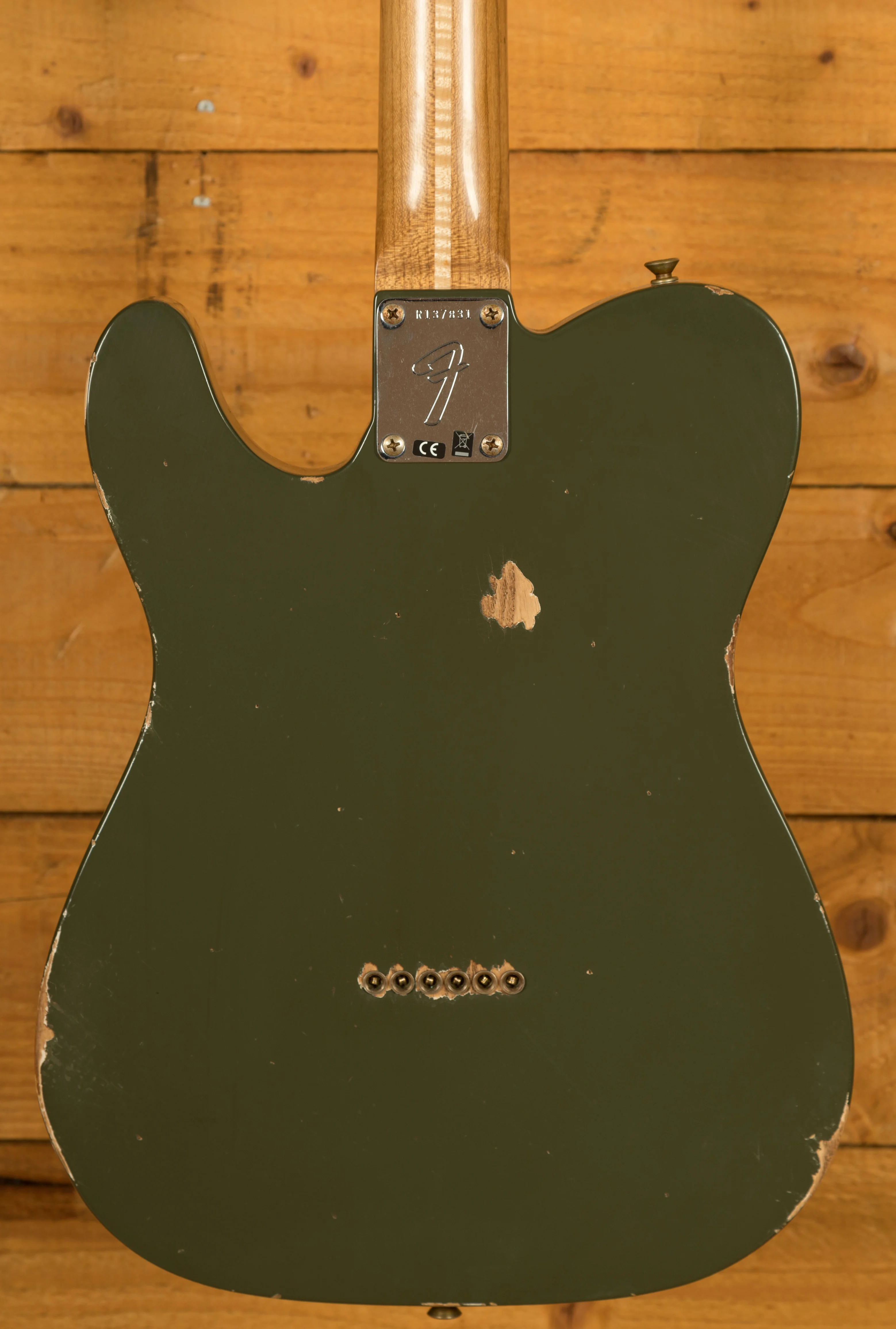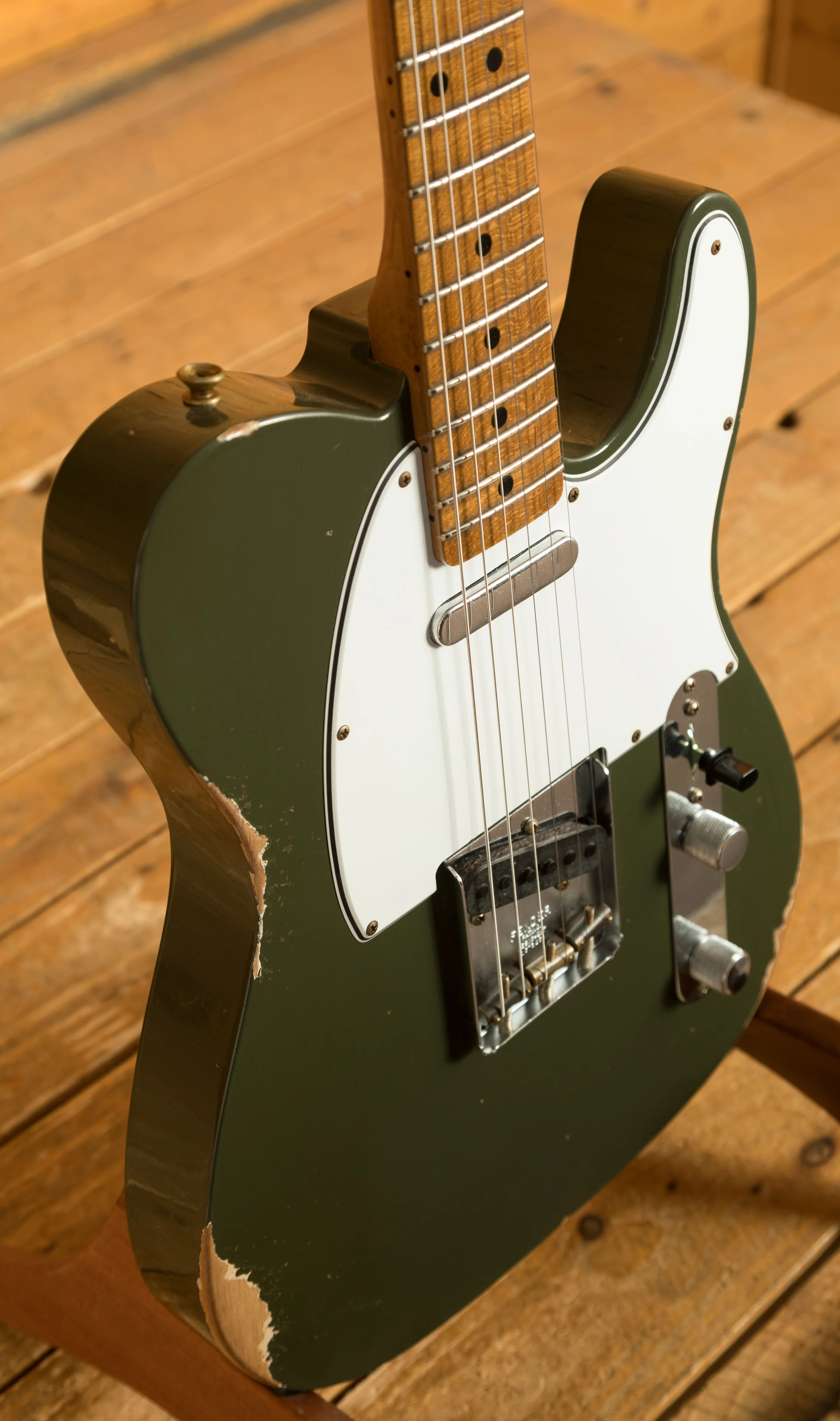 With an Ash body, finished in Olive Green, this guitar is super resonant and has a really bold tone. The Relic is a lightly aged nitro finish; this gives the look and feel of a vintage guitar that has seen it's fair share of use with good care taken. This finish will wear beautifully with time and develop its own character even further. It also allows the natural resonance of the body to sing and sustain much more effectively compared with other more modern finishes.