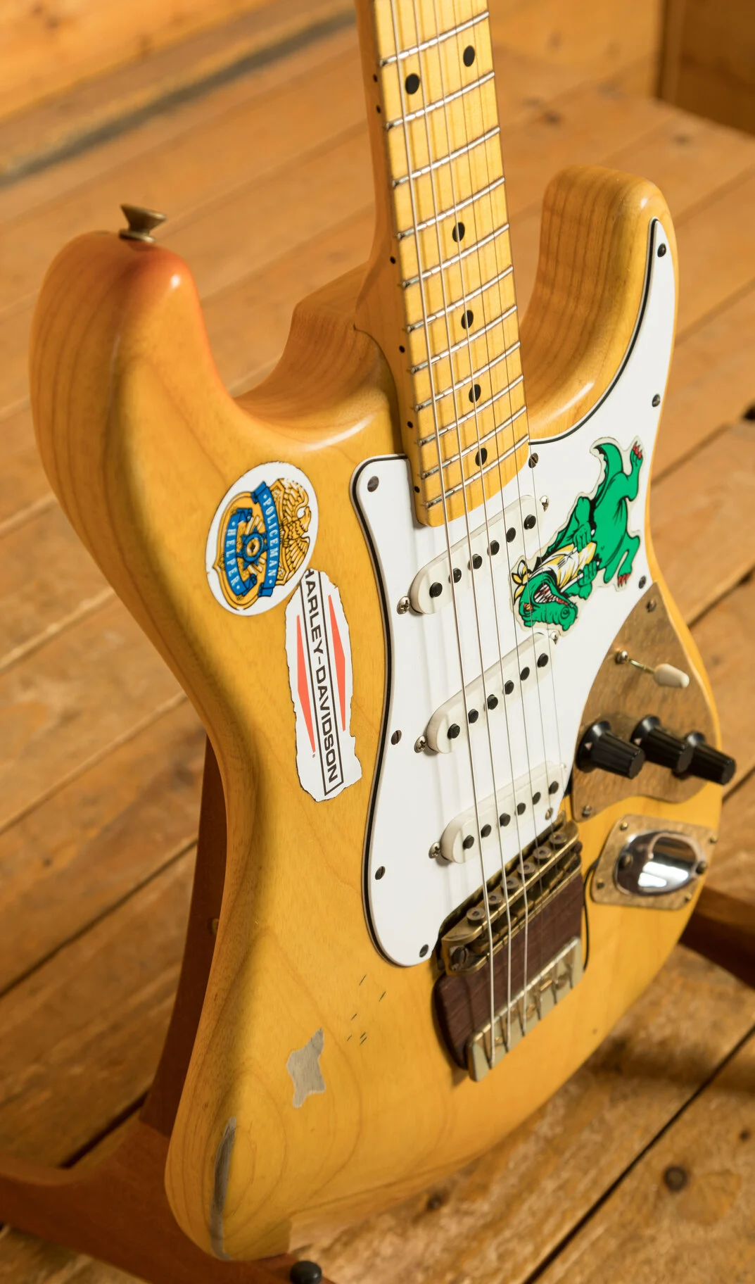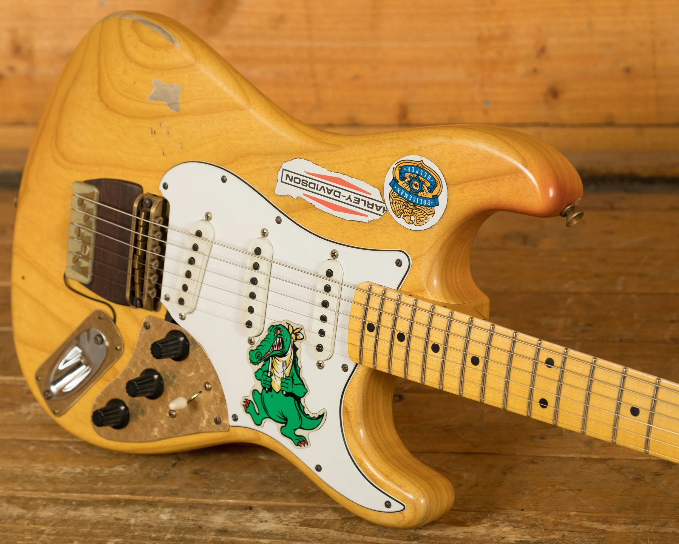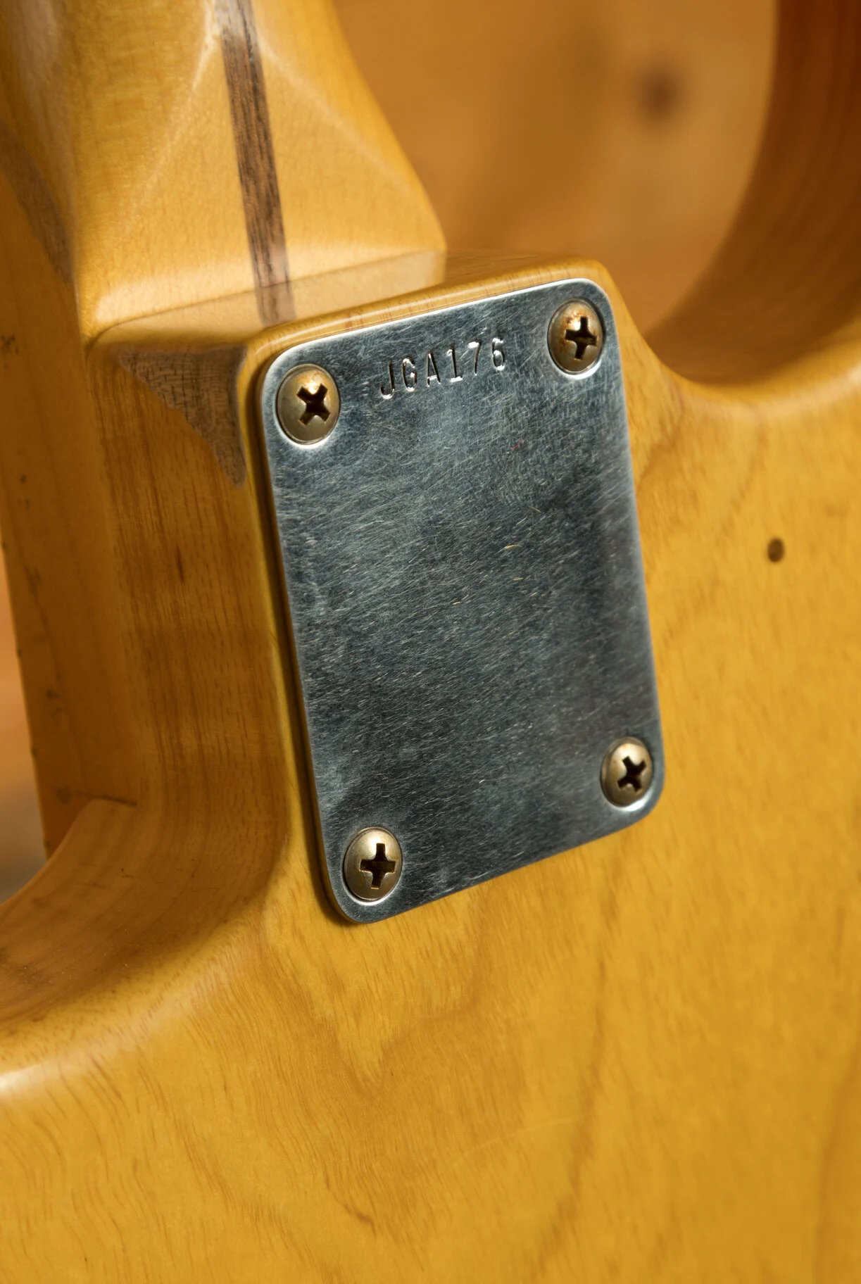 A 1-Piece sort for lightweight Ash body has been finished in a super awesome natural nitro lacquer, it's a real beauty. This guitar has gone through the full masterbuilt treatment. Austin MacNutt has painstakingly examined every last detail of the legendary original to ensure he creates a faithful replica. This guitar has been beautifully aged and will continue to age as you play due to the super thin Nitro lacquer used. The relic is truly unbelievable; the attention to detail here is meticulous and super authentic
