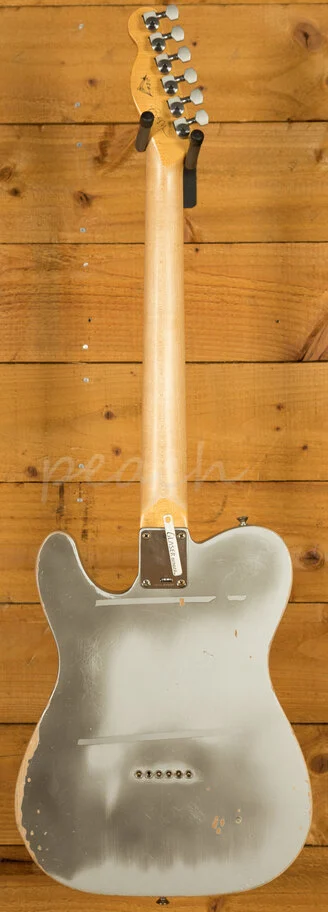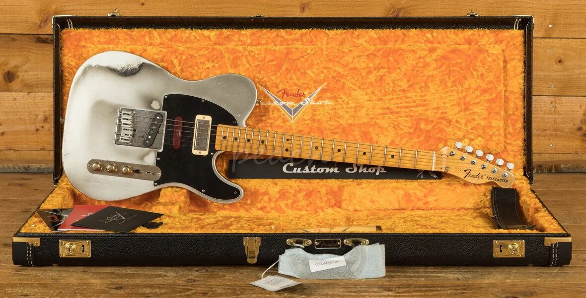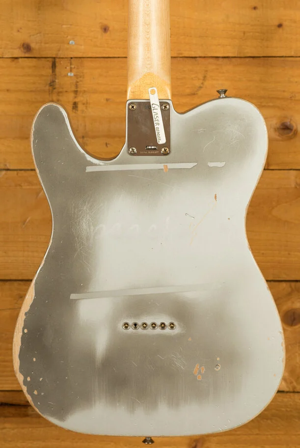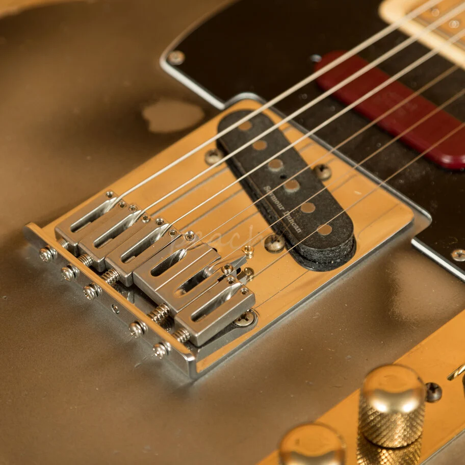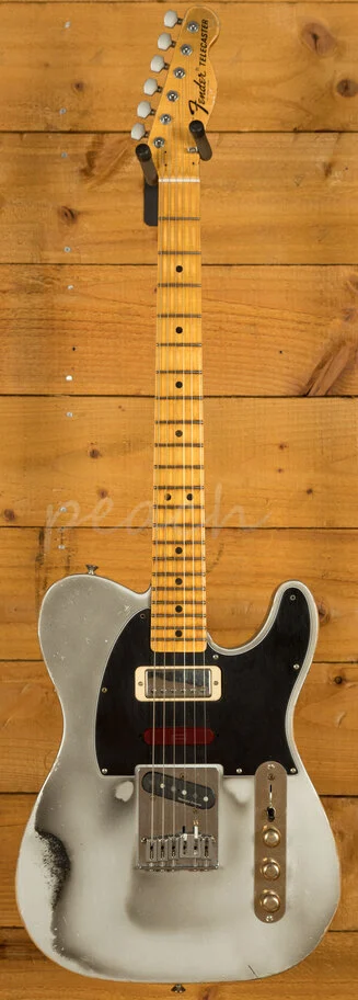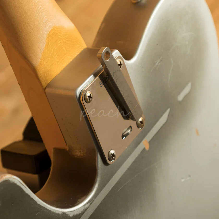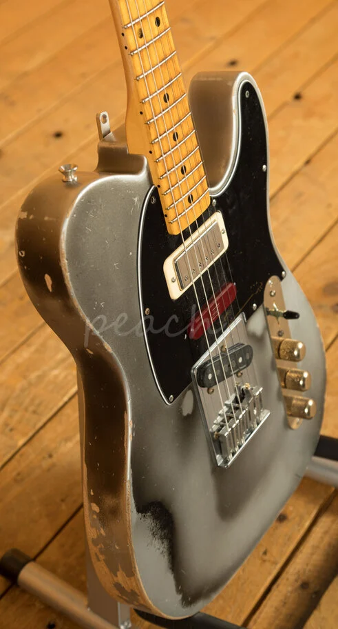 A lightweight Ash body is finished in a heavy relic industrial style Primer Grey nitro. Crisp, unique and instantly recognisable, this Tele is sure to turn heads. From the black grease and oil marks on the custom finish to the heavily worn neck, it effortlessly harkens back to Masons hard-played and long-serving original. The Black pick guard and mismatched Gold and Chrome hardware look ace and further add to the heavily modified vibe.