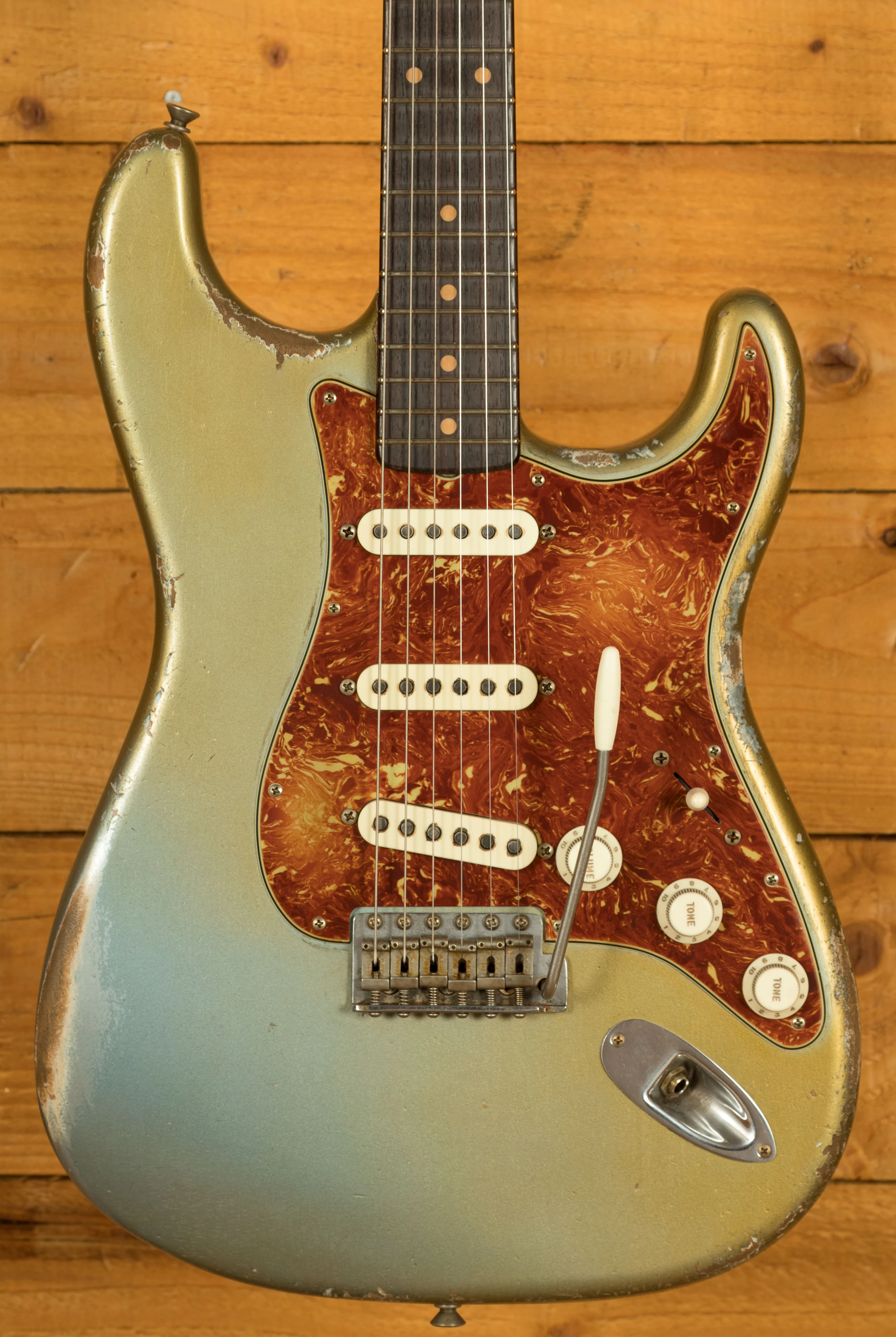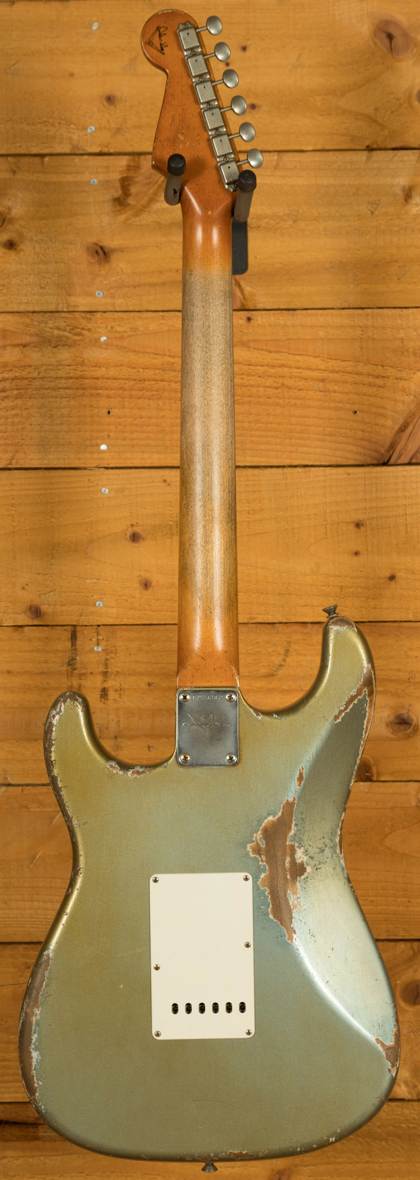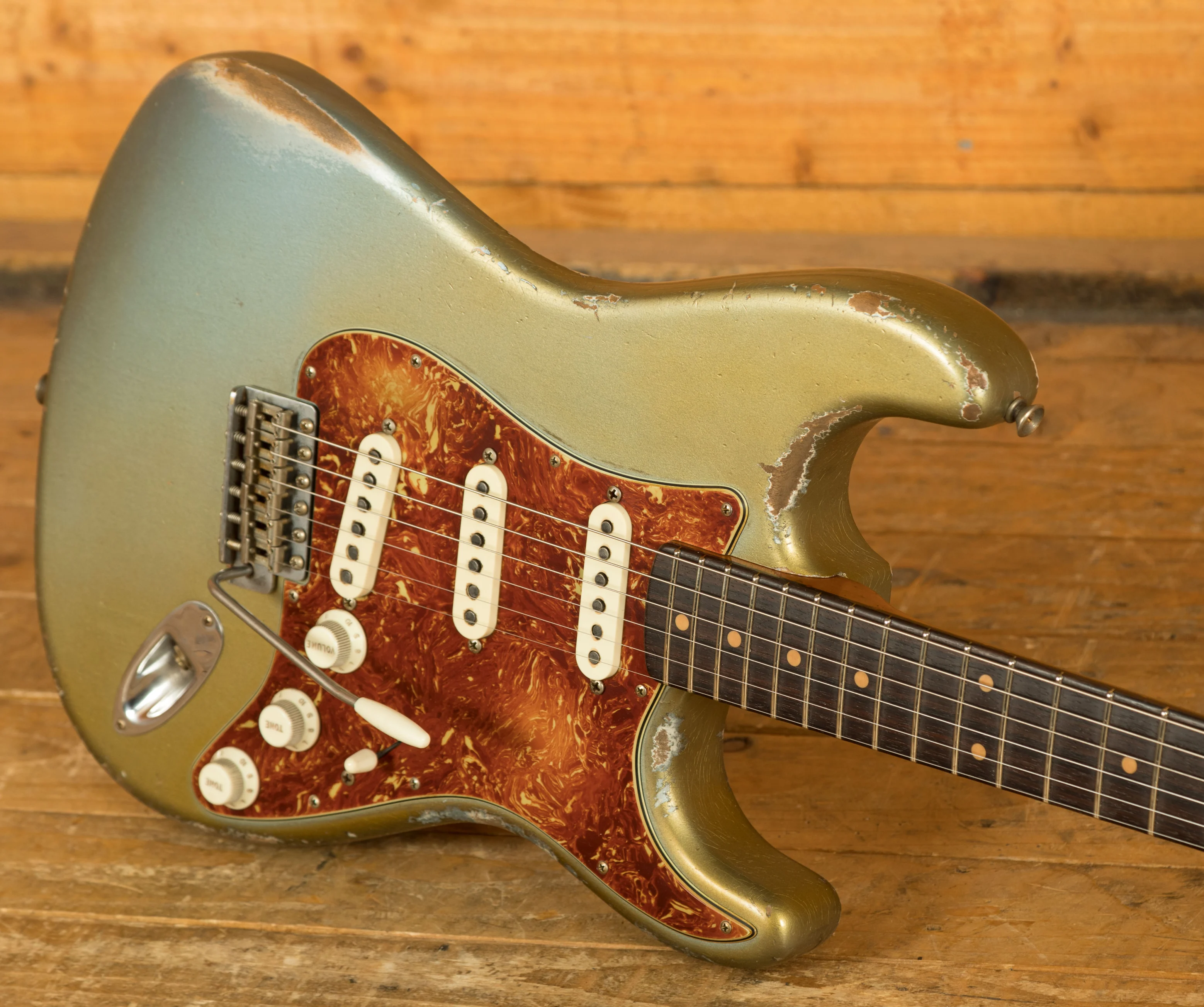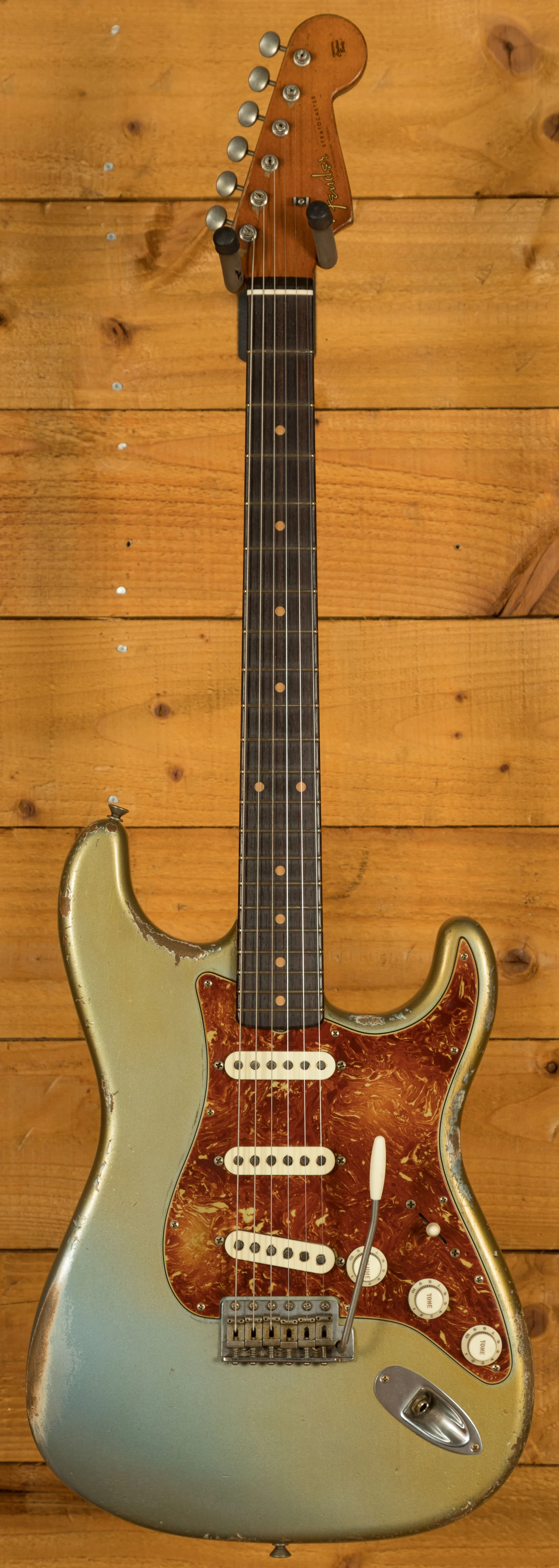 A sort for lightweight Alder body is finished in a stunning Aged Ice Blue Metallic nitro lacquer. Authenticlly aged, this finish will wear beautifully with time and develop its own character even further. The thin nitro finish also allows the natural resonance of the body to sing and sustain much more effectively. Dale is the King of relic work at the custom shop and this certainly doesn't disappoint though!