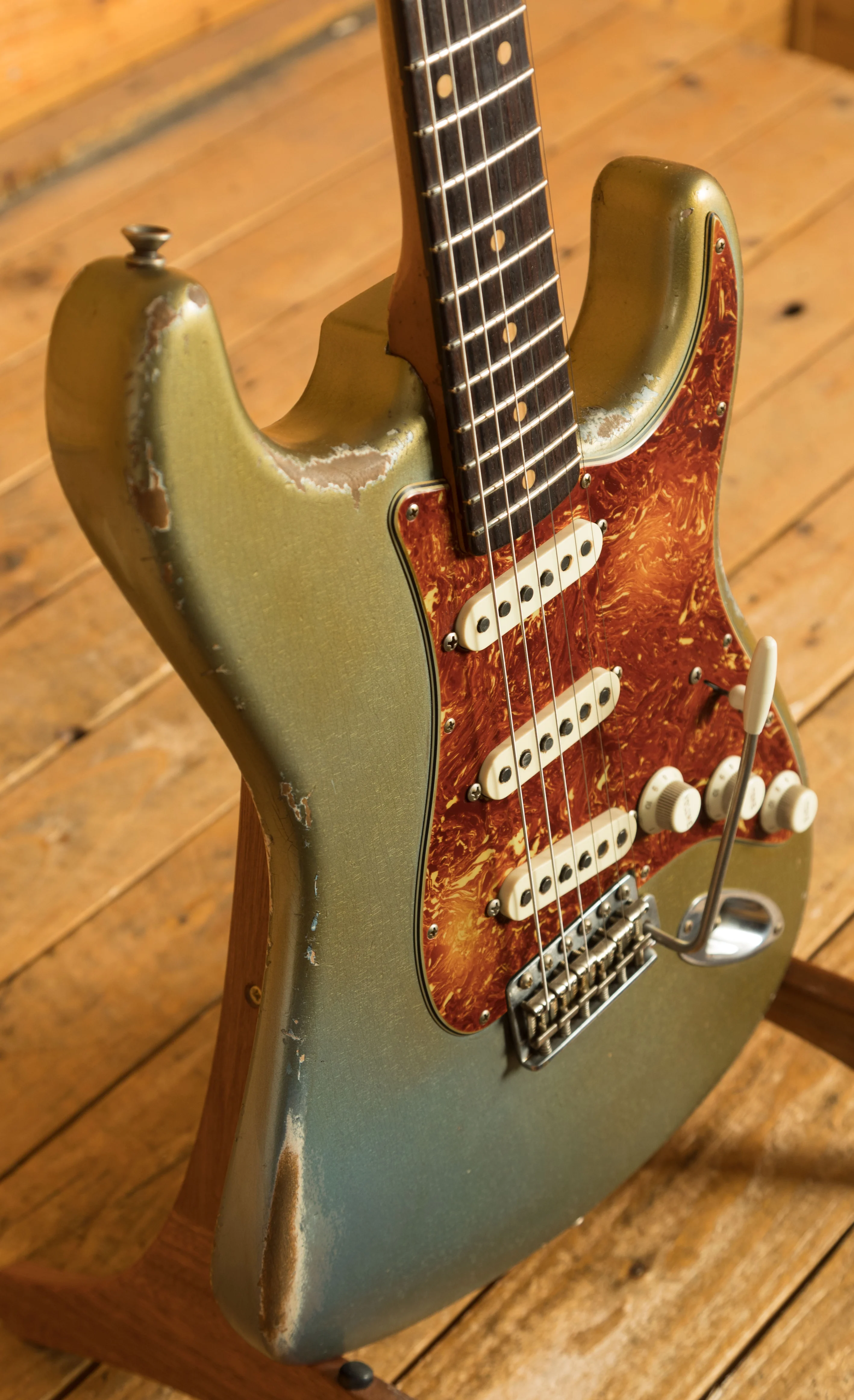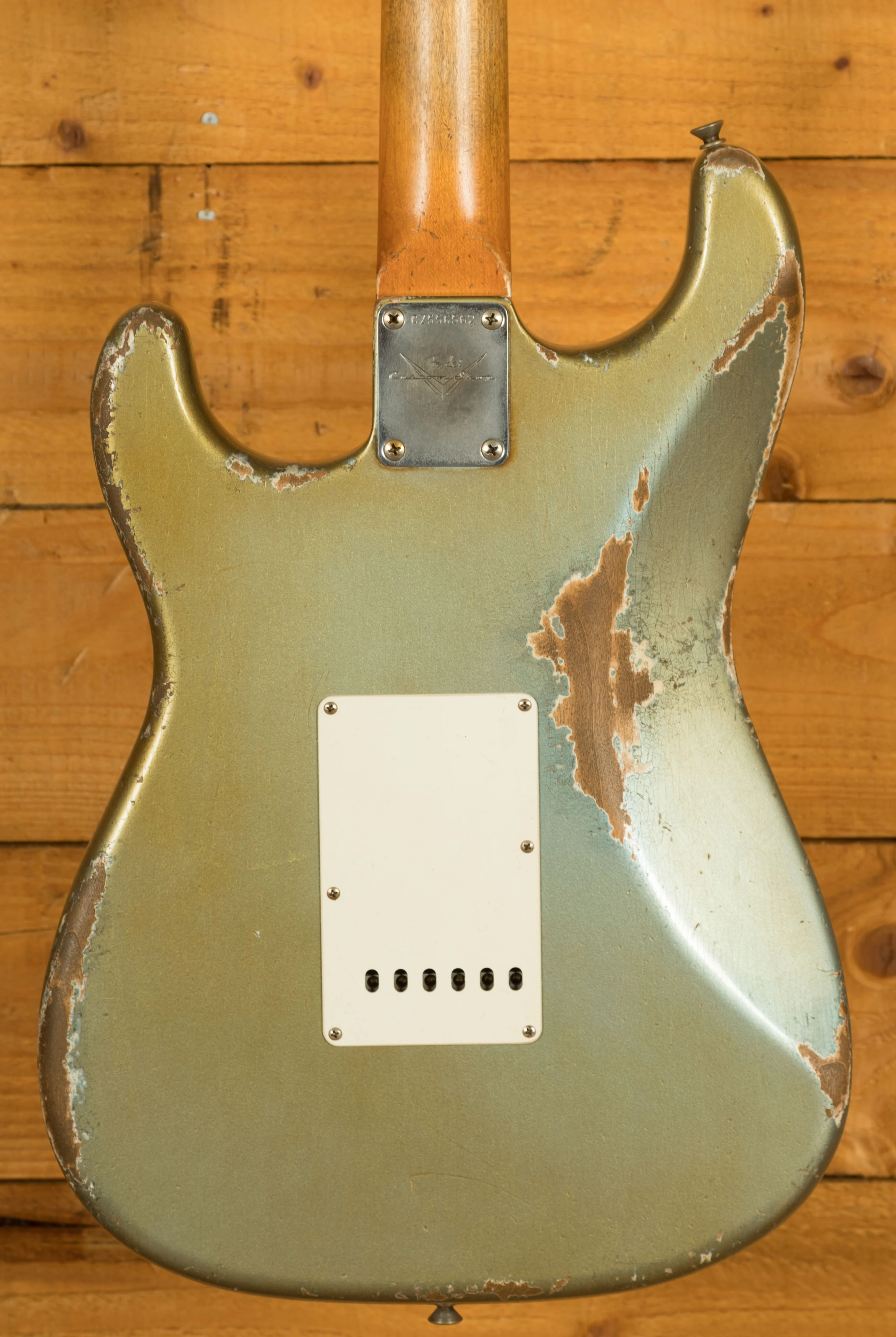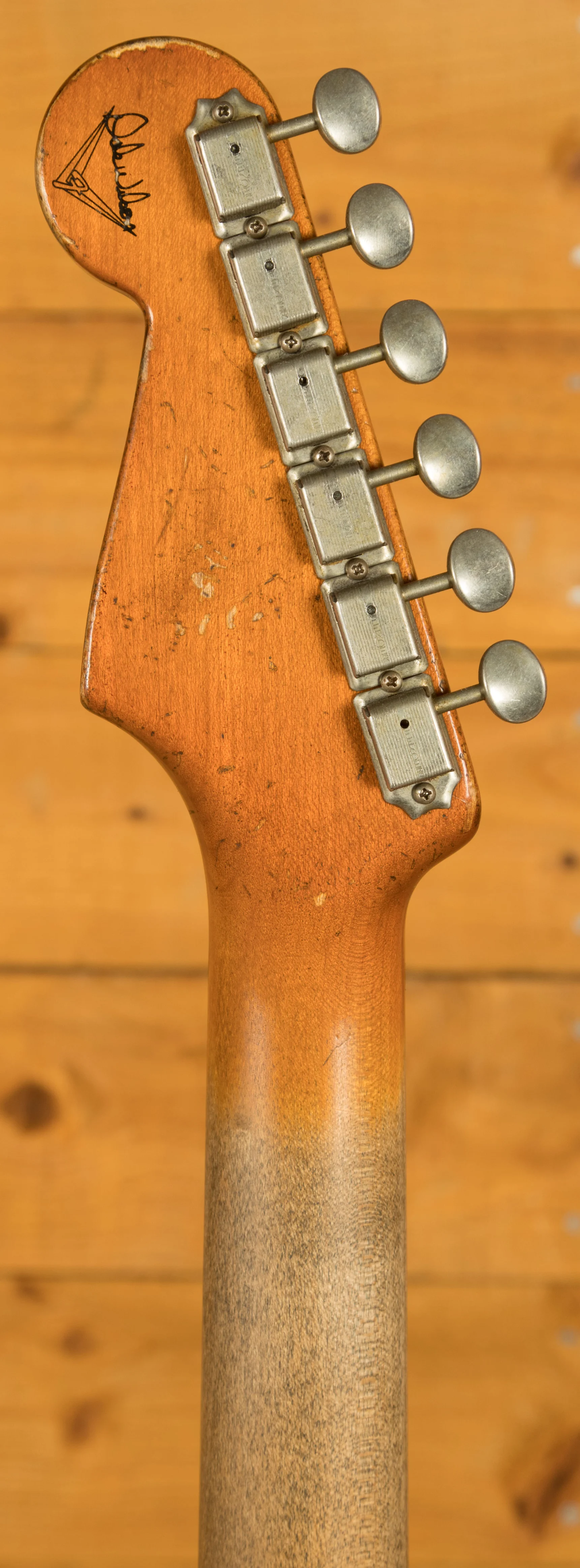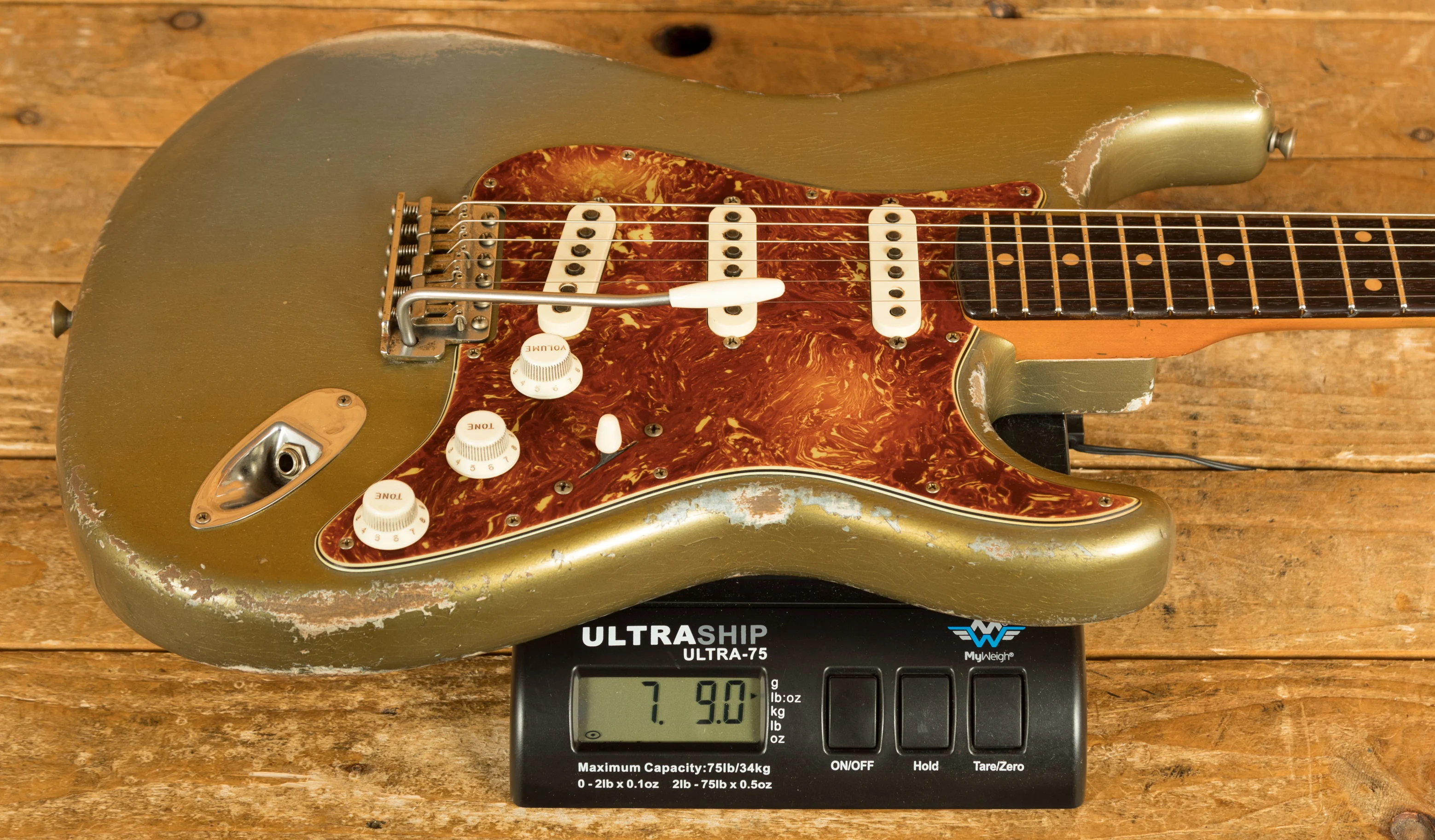 A sort for lightweight Alder body is finished in a stunning Aged Ice Blue Metallic nitro lacquer. Authenticlly aged, this finish will wear beautifully with time and develop its own character even further. The thin nitro finish also allows the natural resonance of the body to sing and sustain much more effectively. Dale is the King of relic work at the custom shop and this certainly doesn't disappoint though!