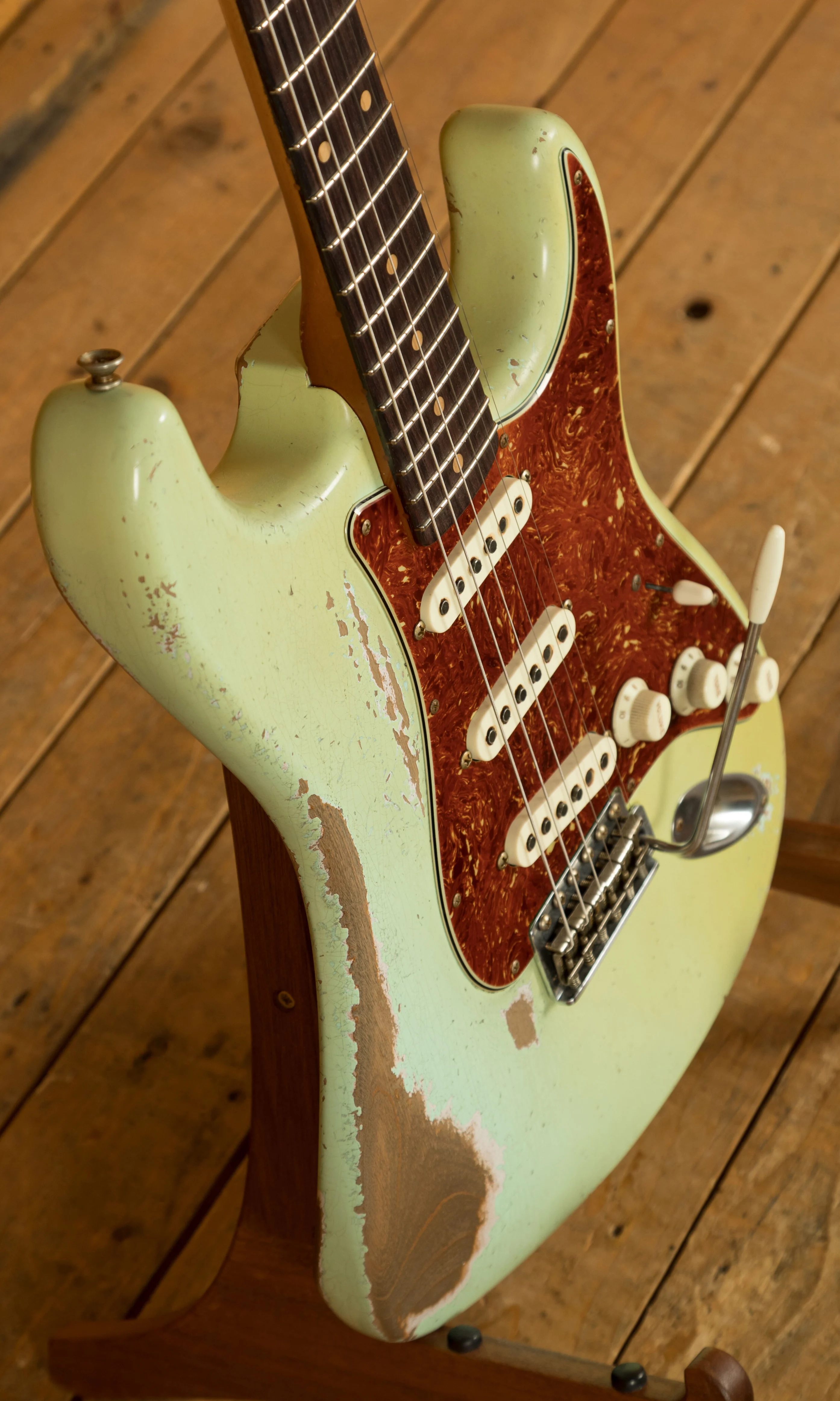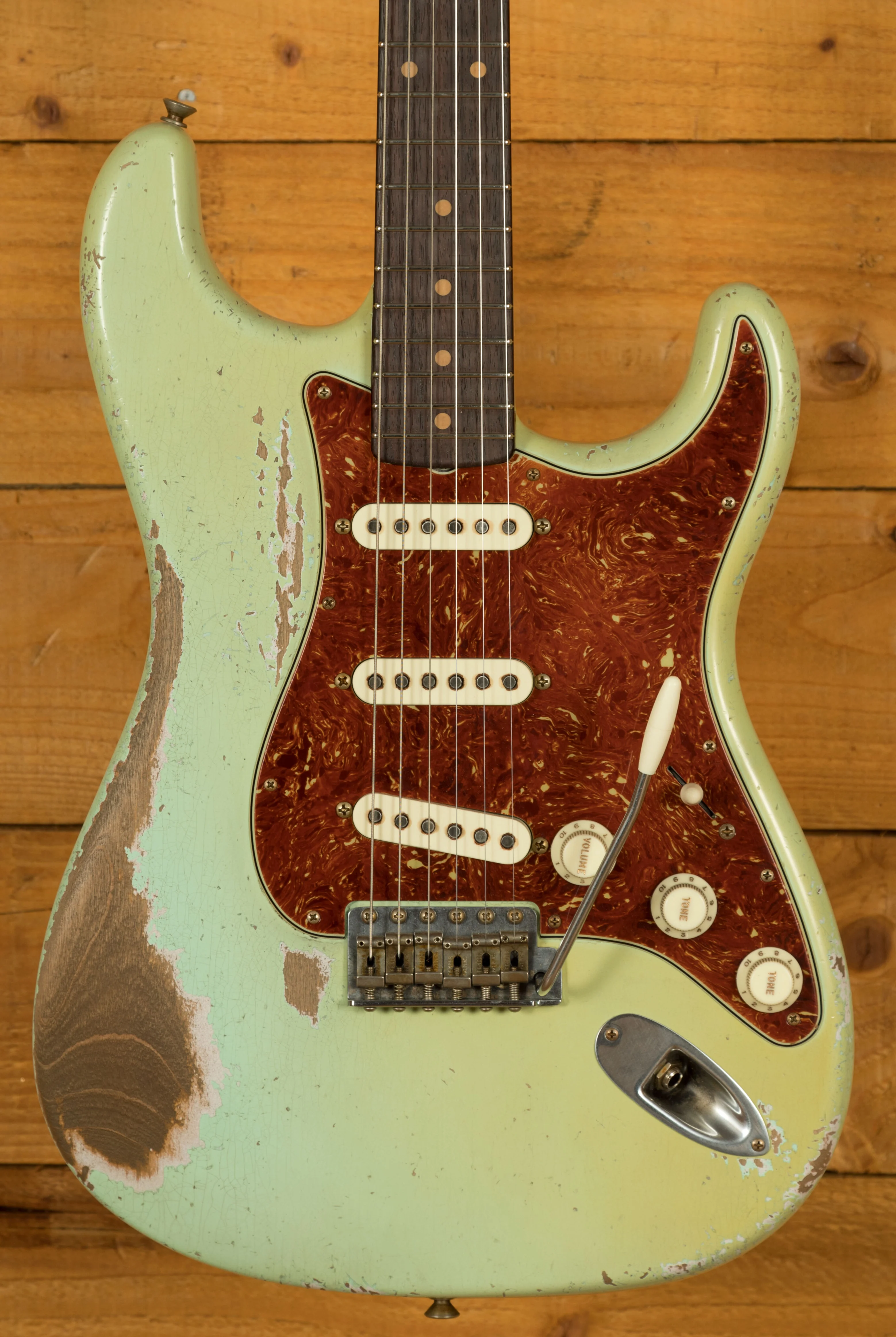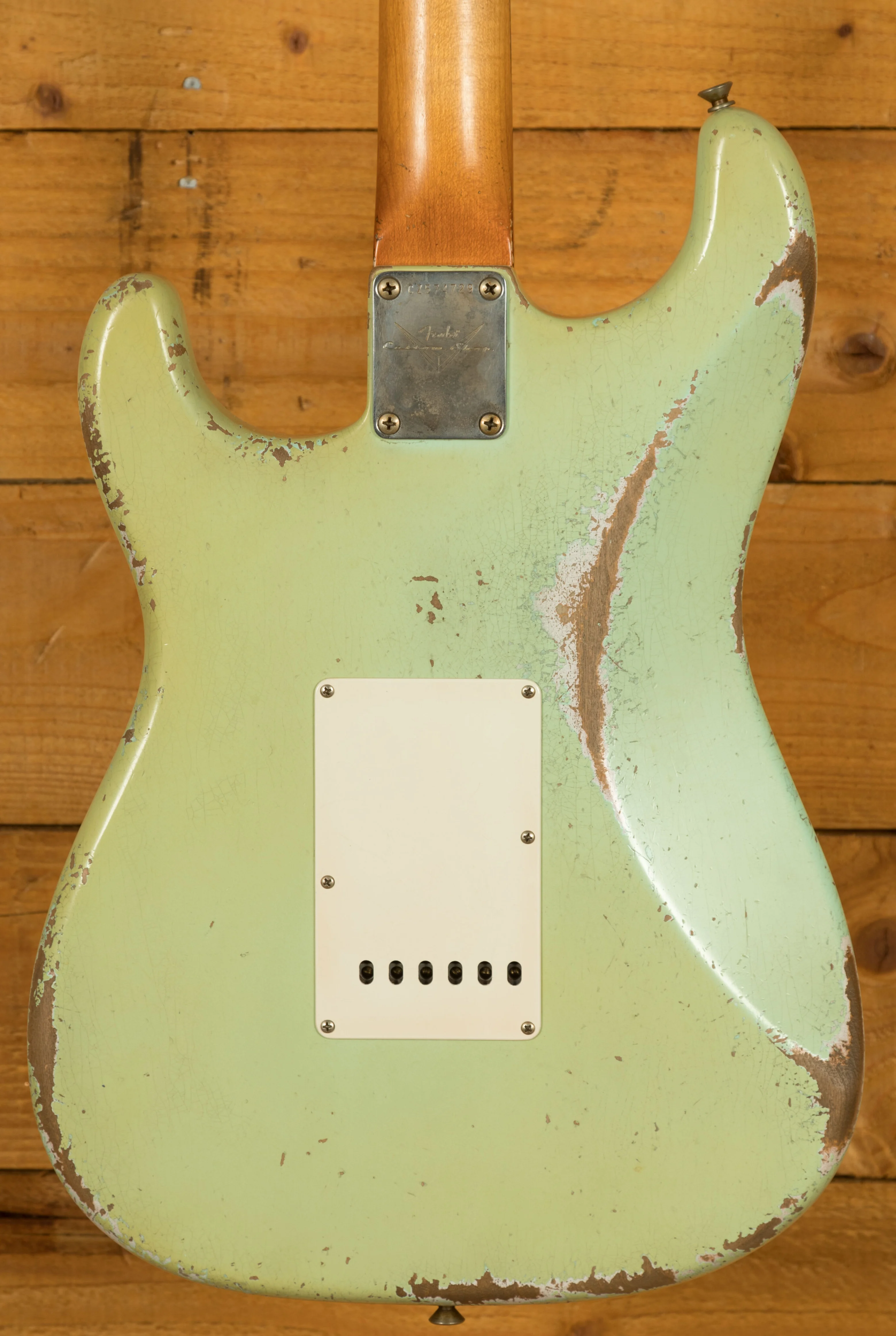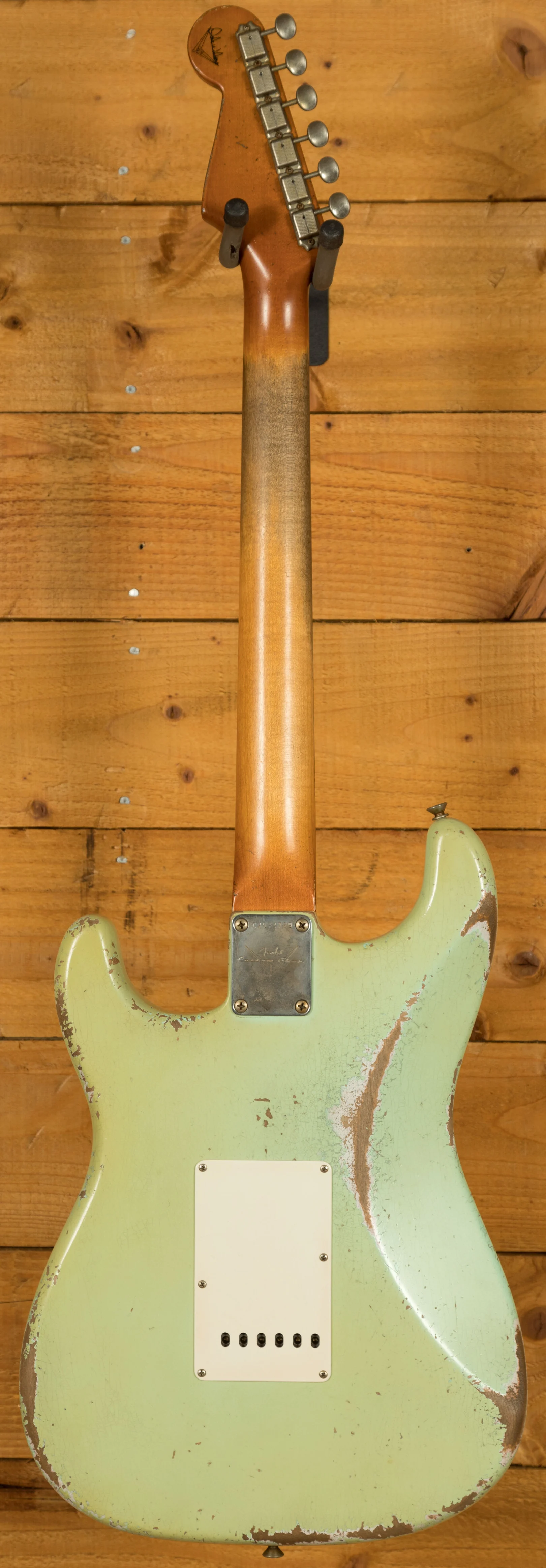 A sort for lightweight Alder body is finished in a stunning Aged Surf Green nitro lacquer. Authentically aged, this finish will wear beautifully with time and develop its own character even further. The thin nitro finish also allows the natural resonance of the body to sing and sustain much more effectively. Dale is the King of relic work at the custom shop and this certainly doesn't disappoint though!