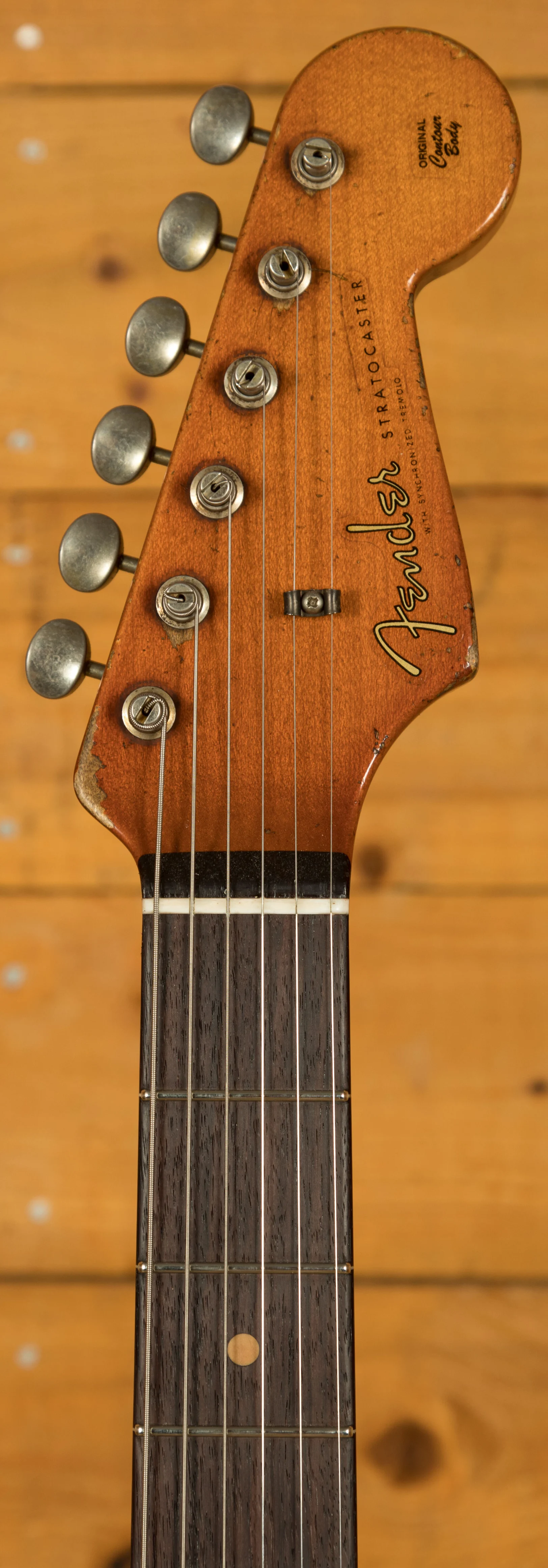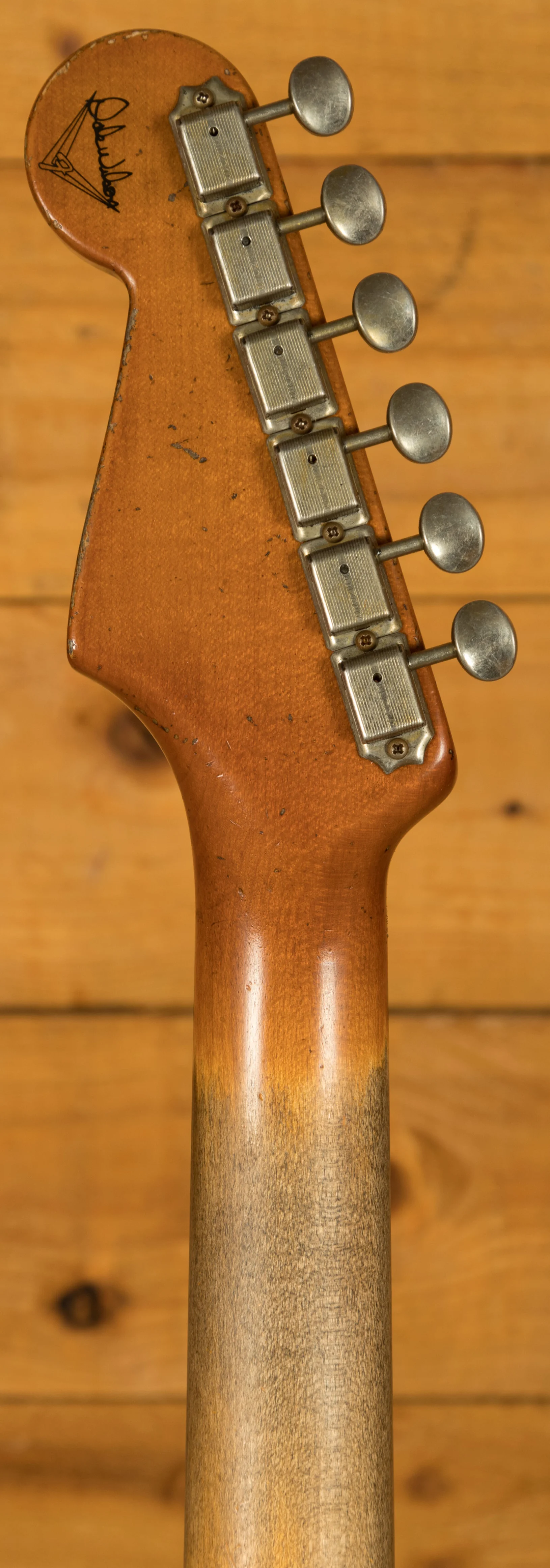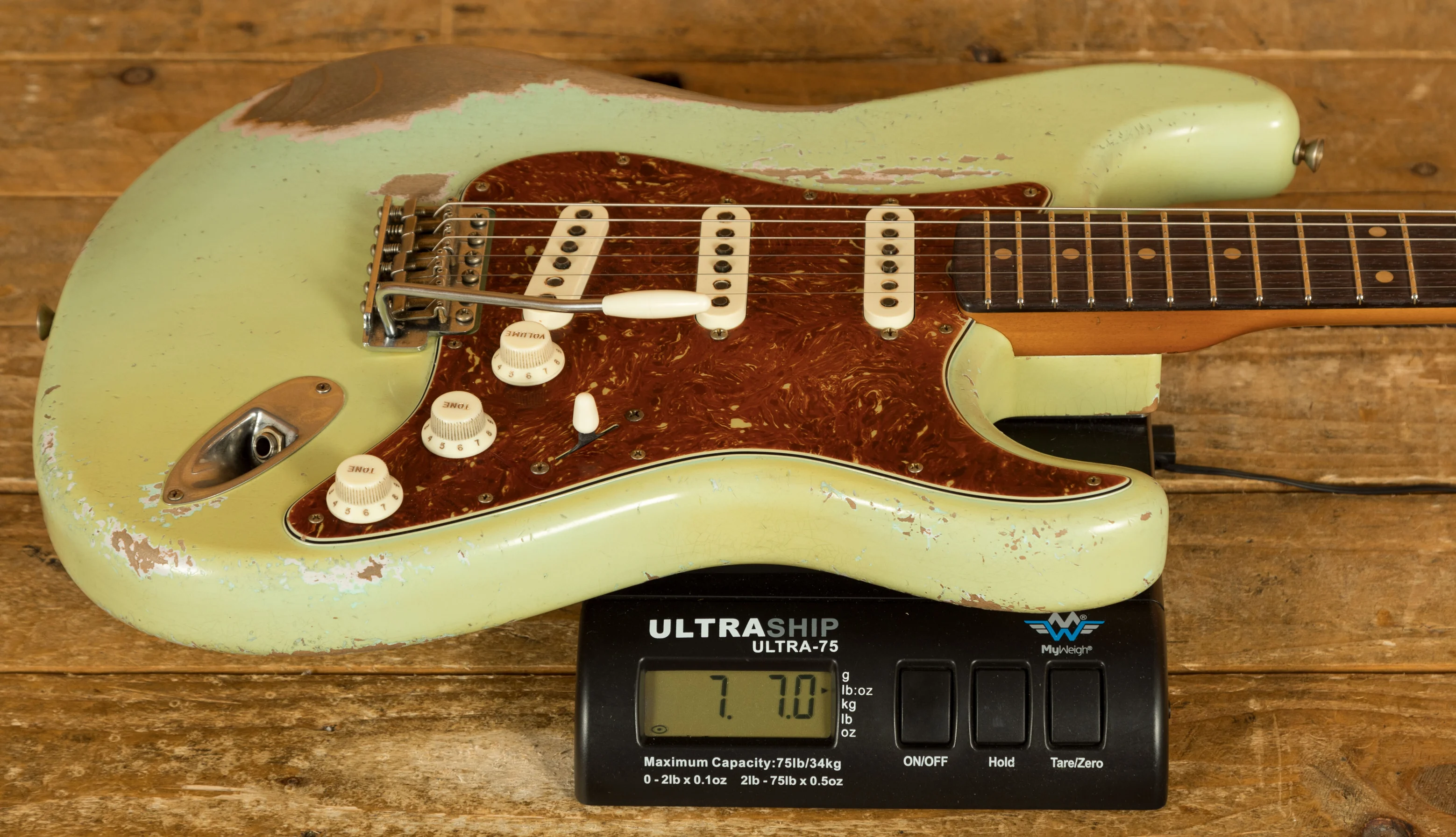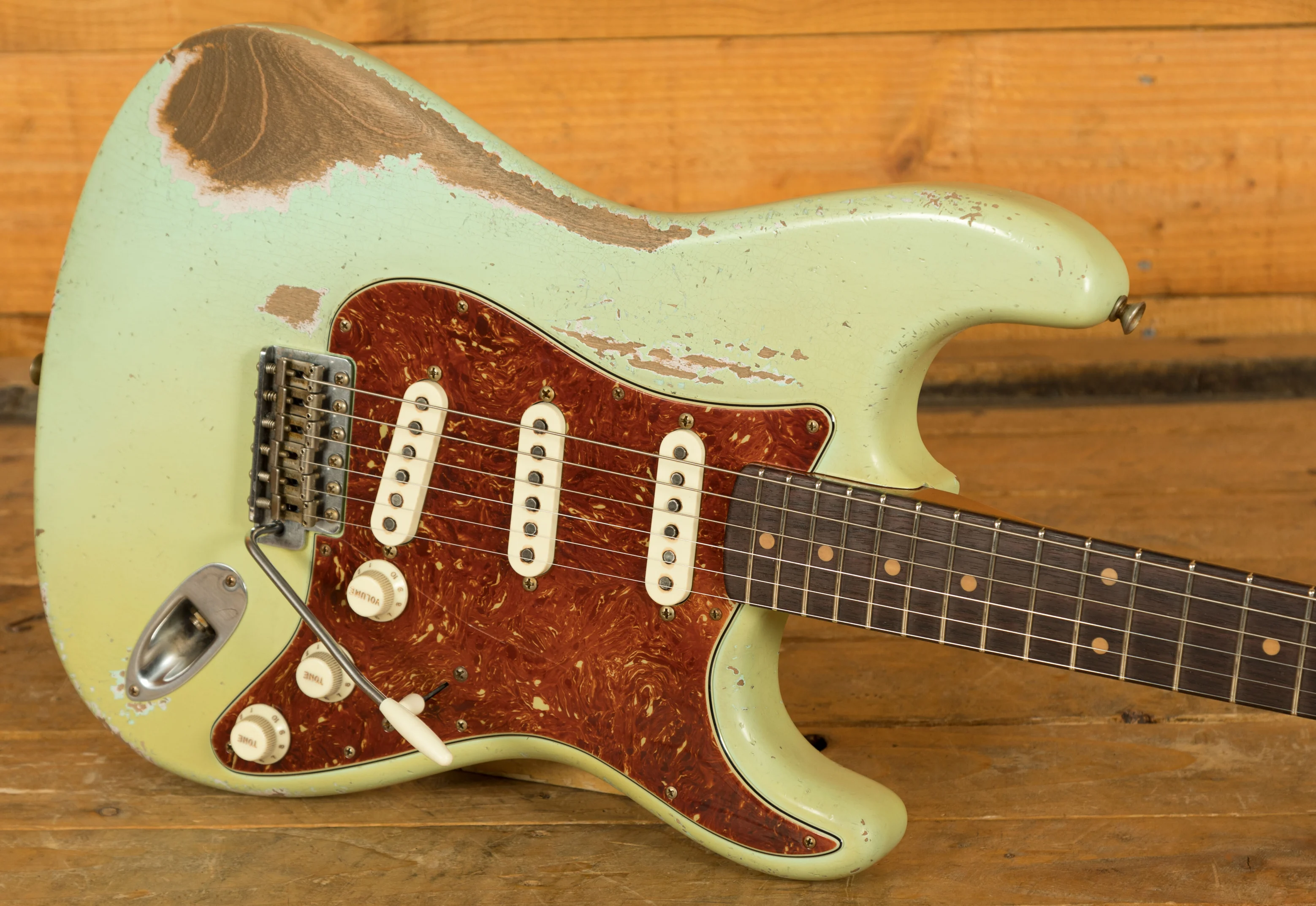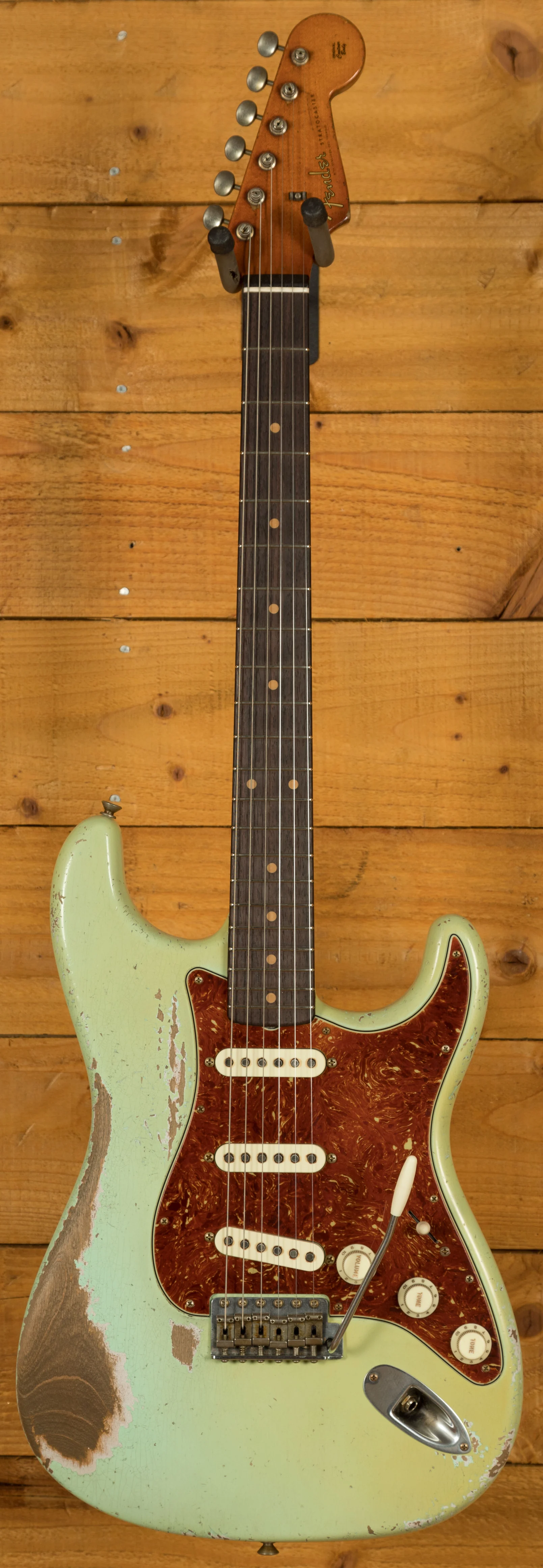 A sort for lightweight Alder body is finished in a stunning Aged Surf Green nitro lacquer. Authentically aged, this finish will wear beautifully with time and develop its own character even further. The thin nitro finish also allows the natural resonance of the body to sing and sustain much more effectively. Dale is the King of relic work at the custom shop and this certainly doesn't disappoint though!