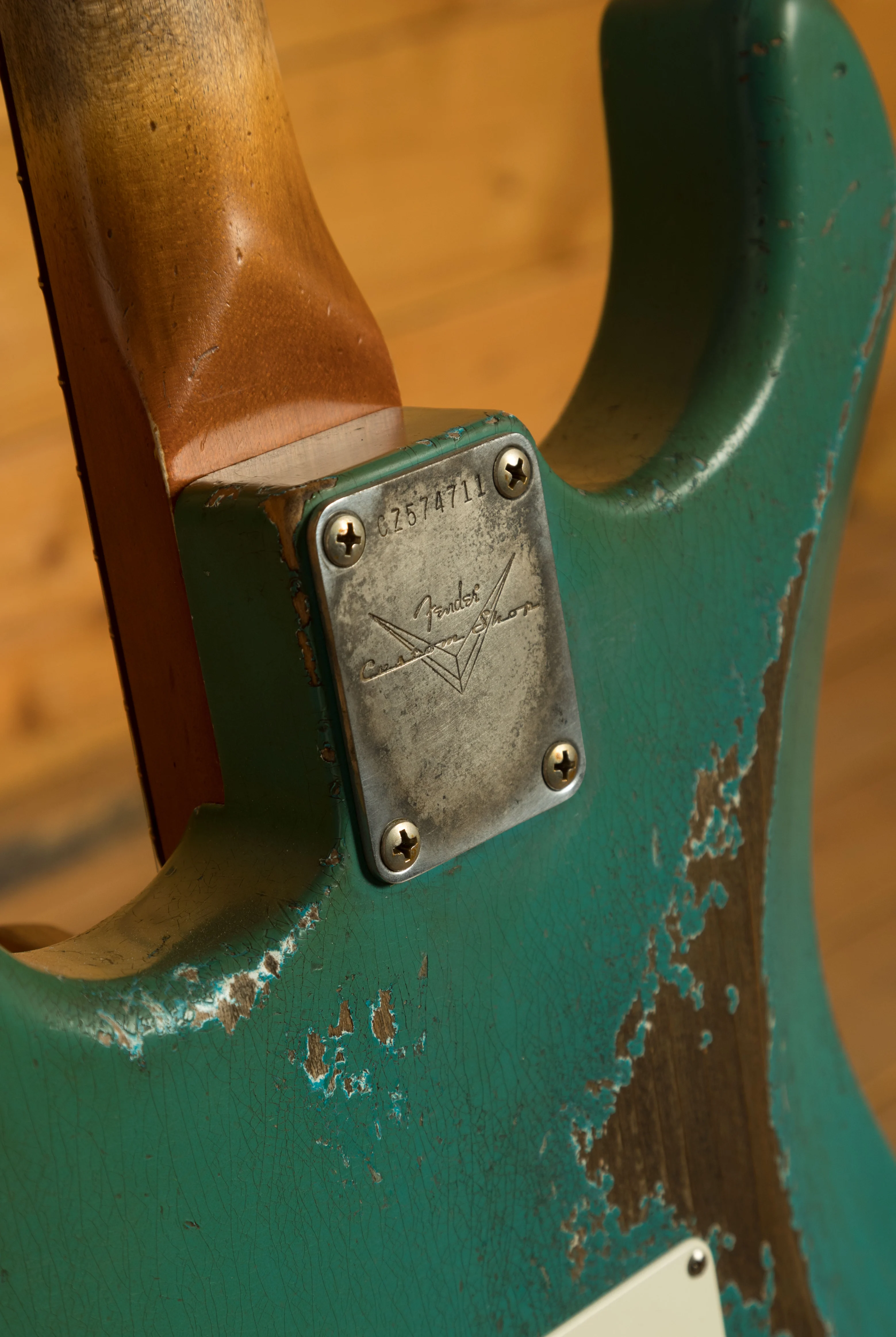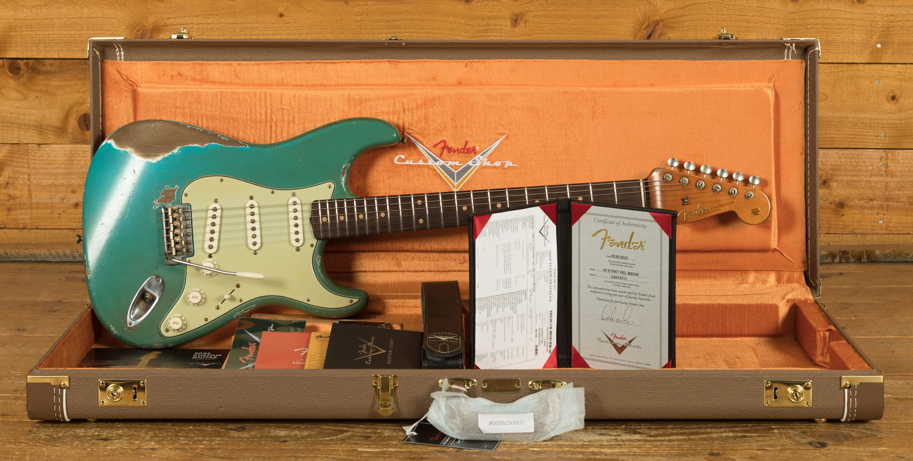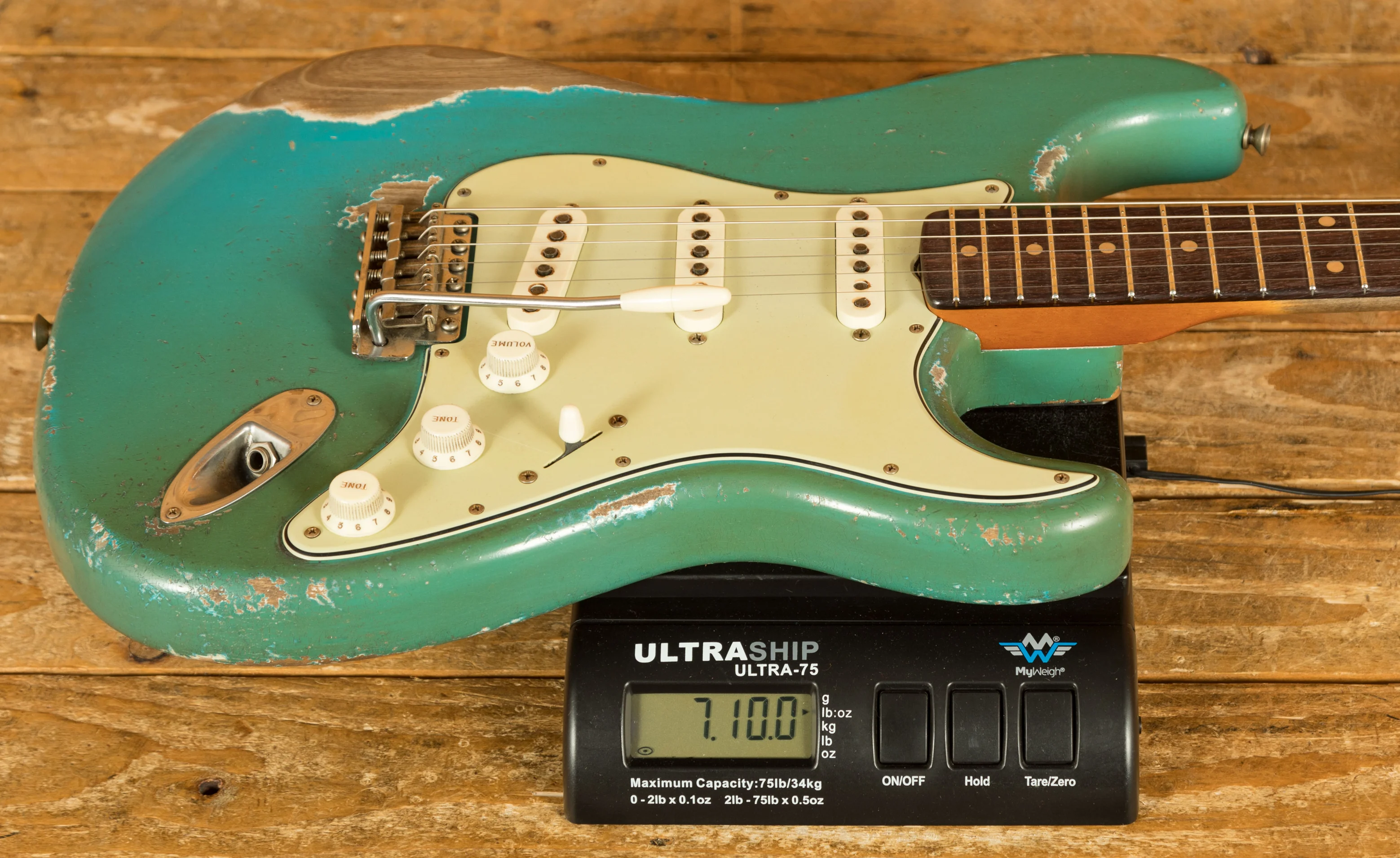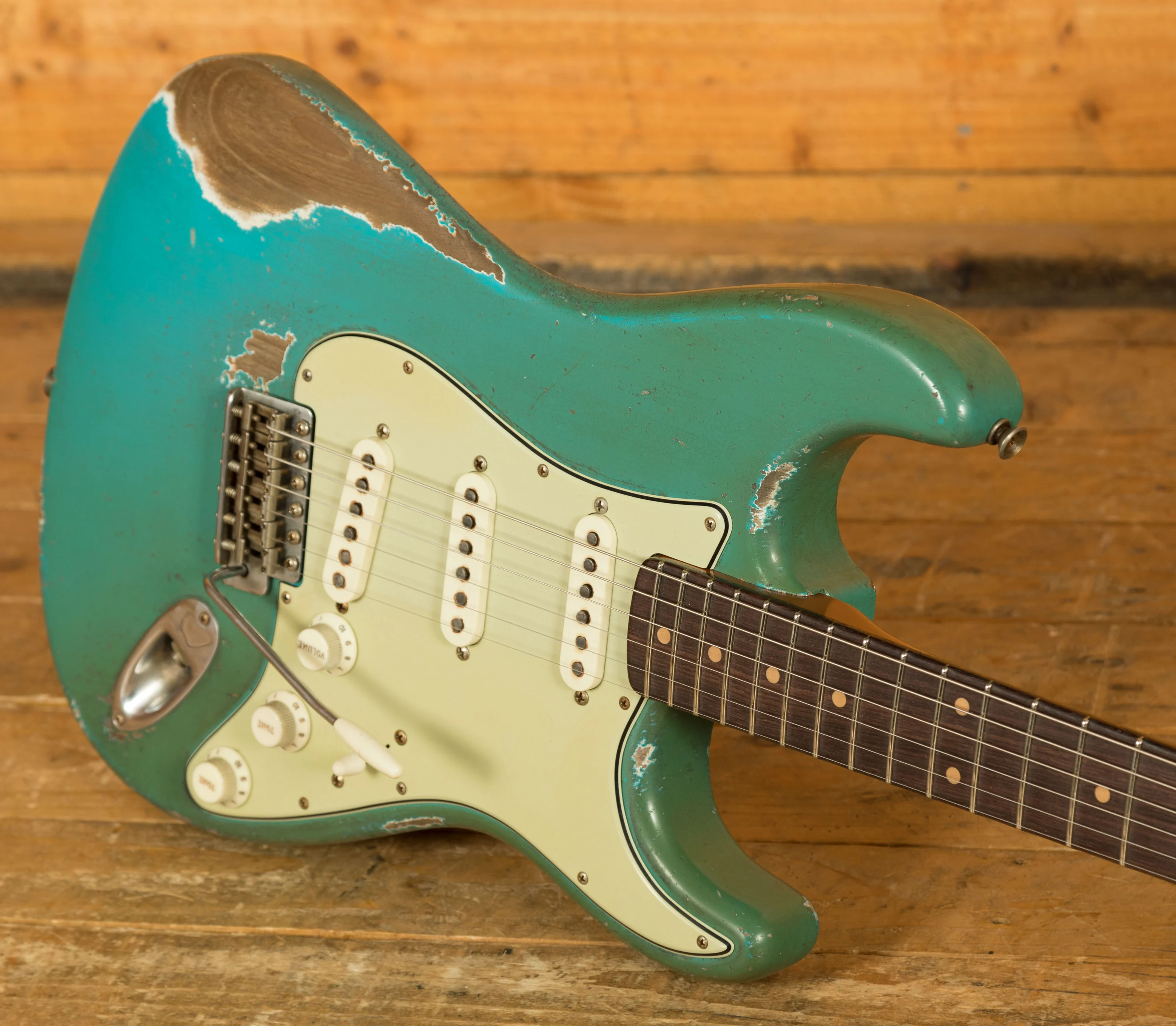 A sort for lightweight Alder body is finished in a stunning Aged Taos Turquoise nitro lacquer. Authentically aged, this finish will wear beautifully with time and develop its own character even further. The thin nitro finish also allows the natural resonance of the body to sing and sustain much more effectively. Dale is the King of relic work at the custom shop and this certainly doesn't disappoint though!