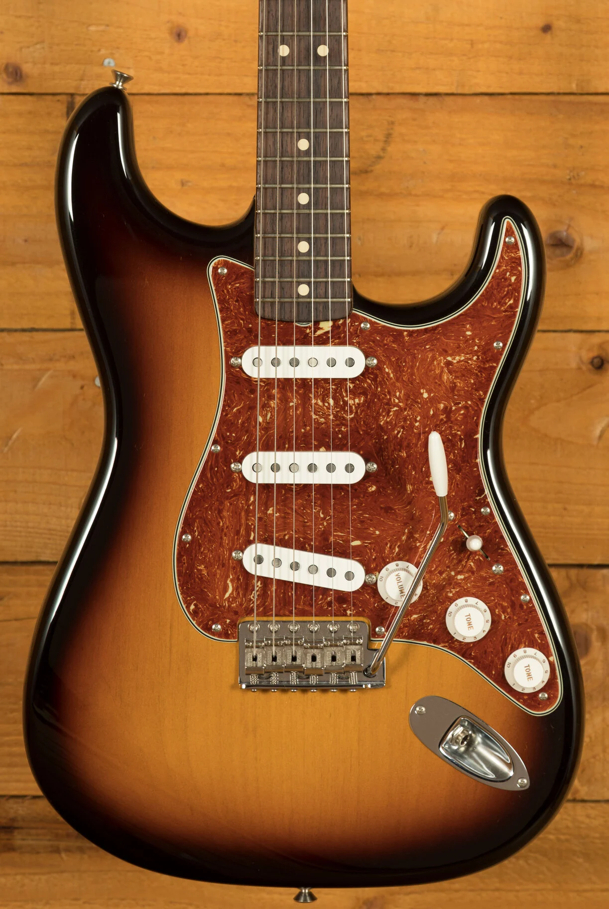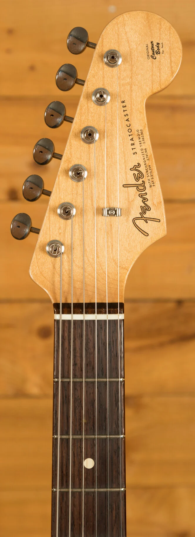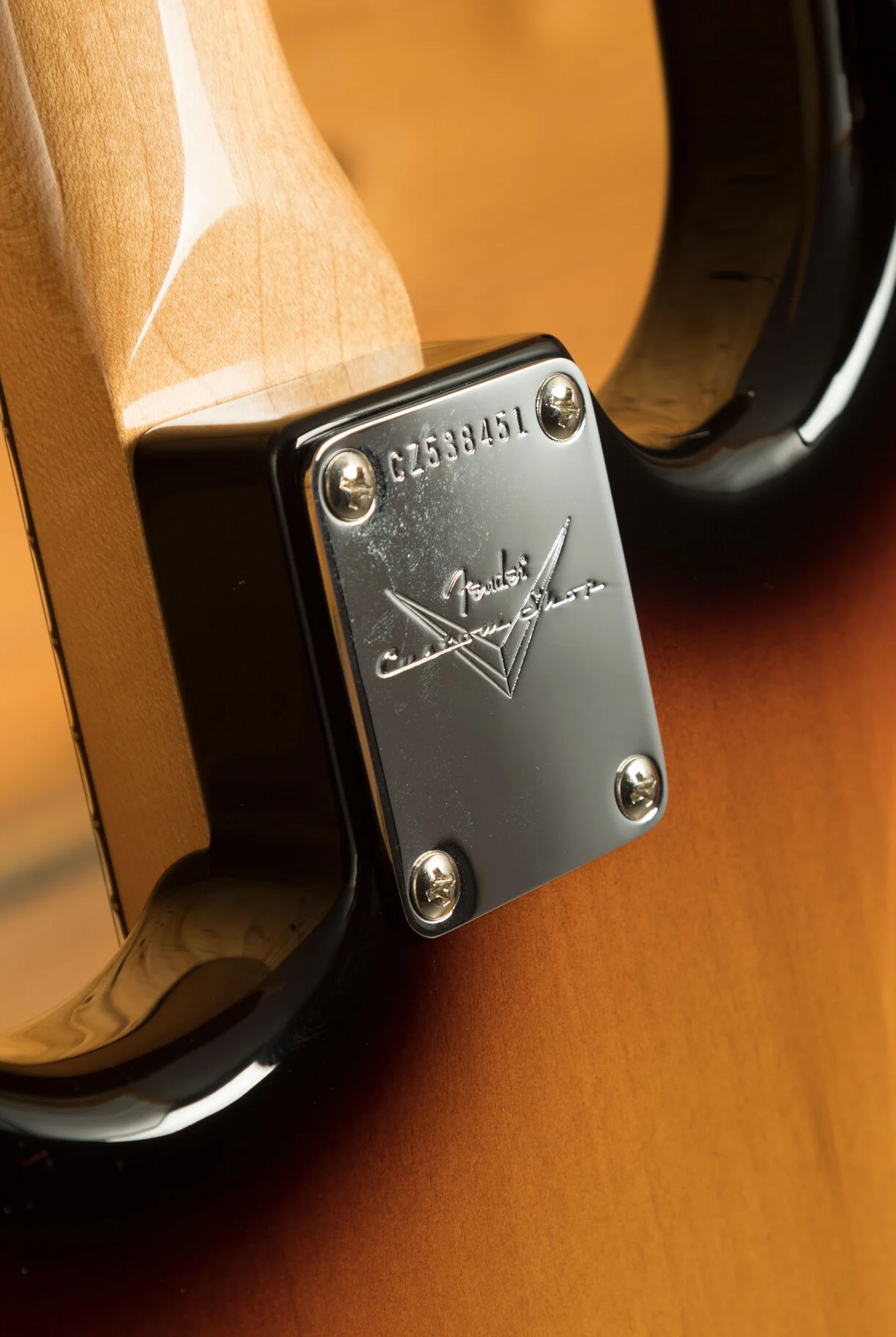 The plain grain Maple neck has a smooth Nitro lacquer finish and with an AAA Rosewood fingerboard, 9.5"-12" compound radius and 21 medium jumbo frets, the '63 Custom Shop Stratocaster can handle anything you throw at it without even breaking a sweat; it's supremely comfortable and well balanced. The 60 Style Oval "C" neck profile is extremely comfortable and easy to play. It measures .790" at the 1st fret and .930" at the 12th fret.