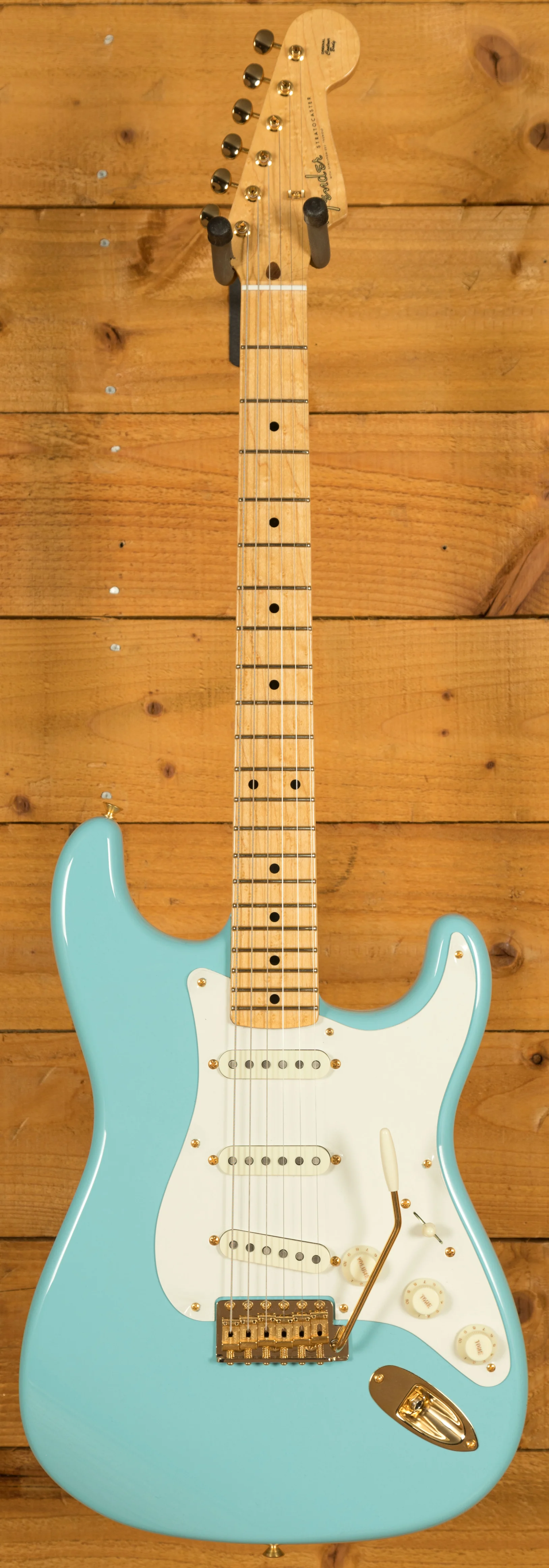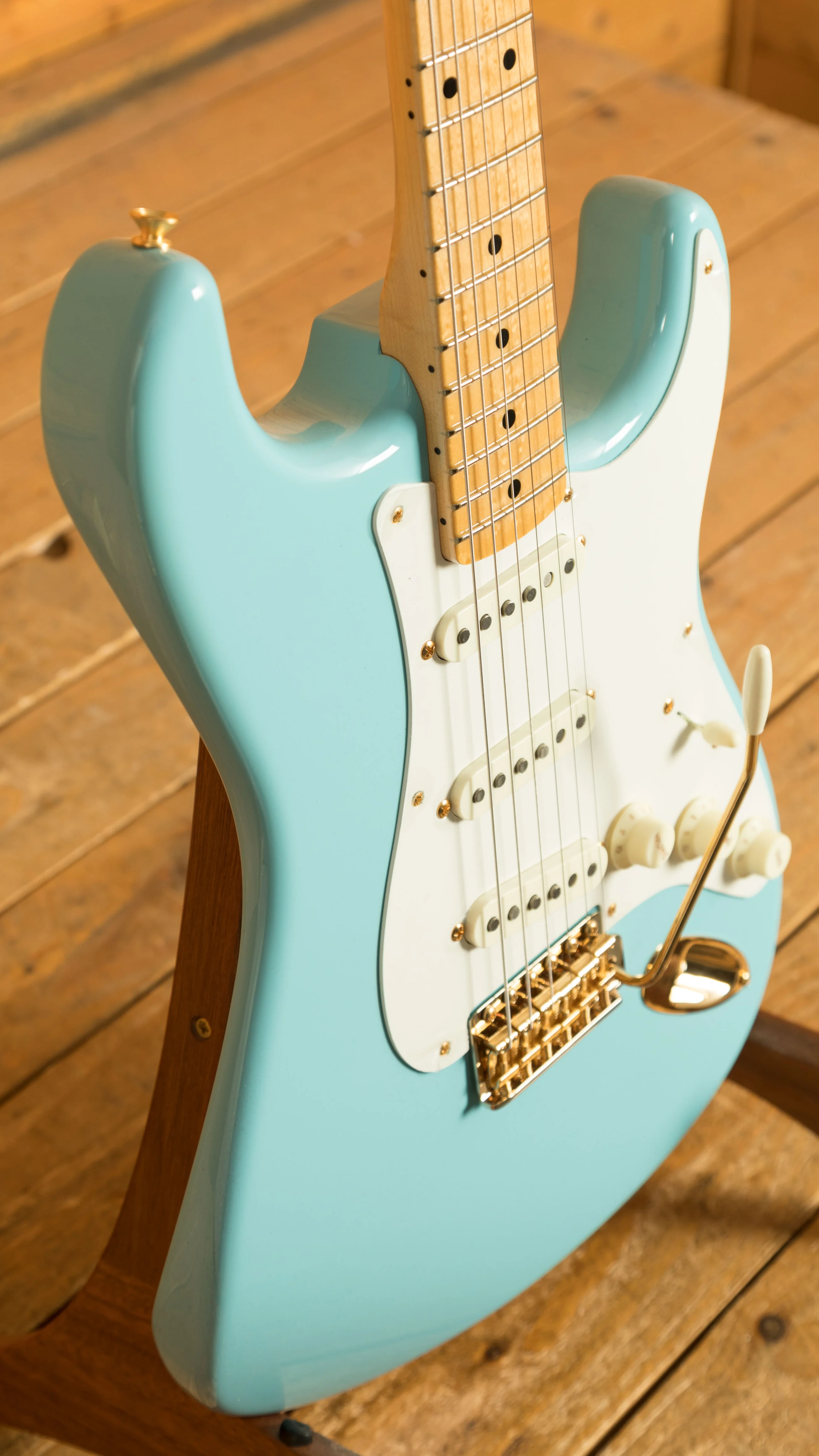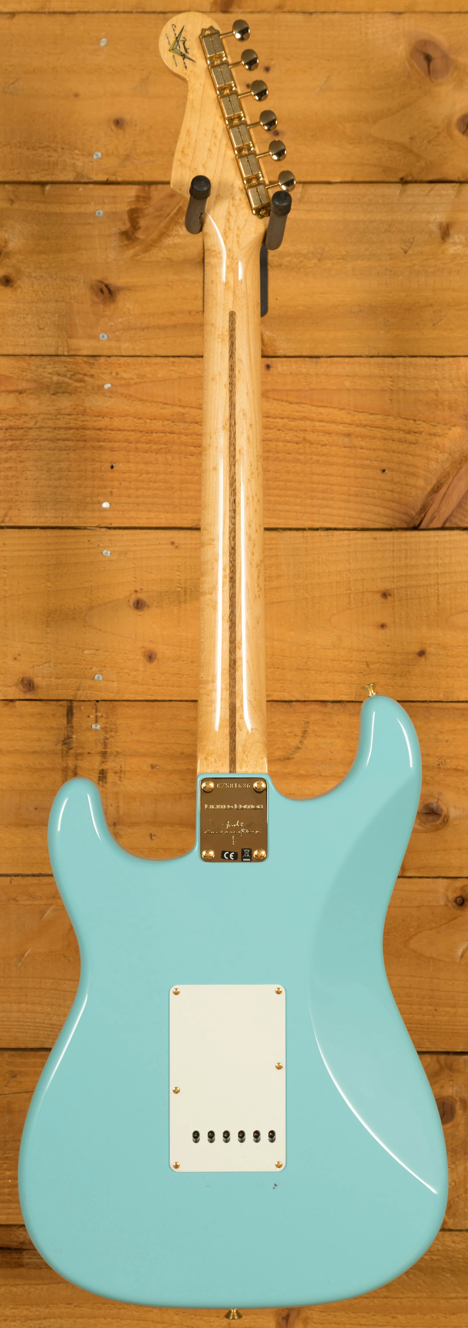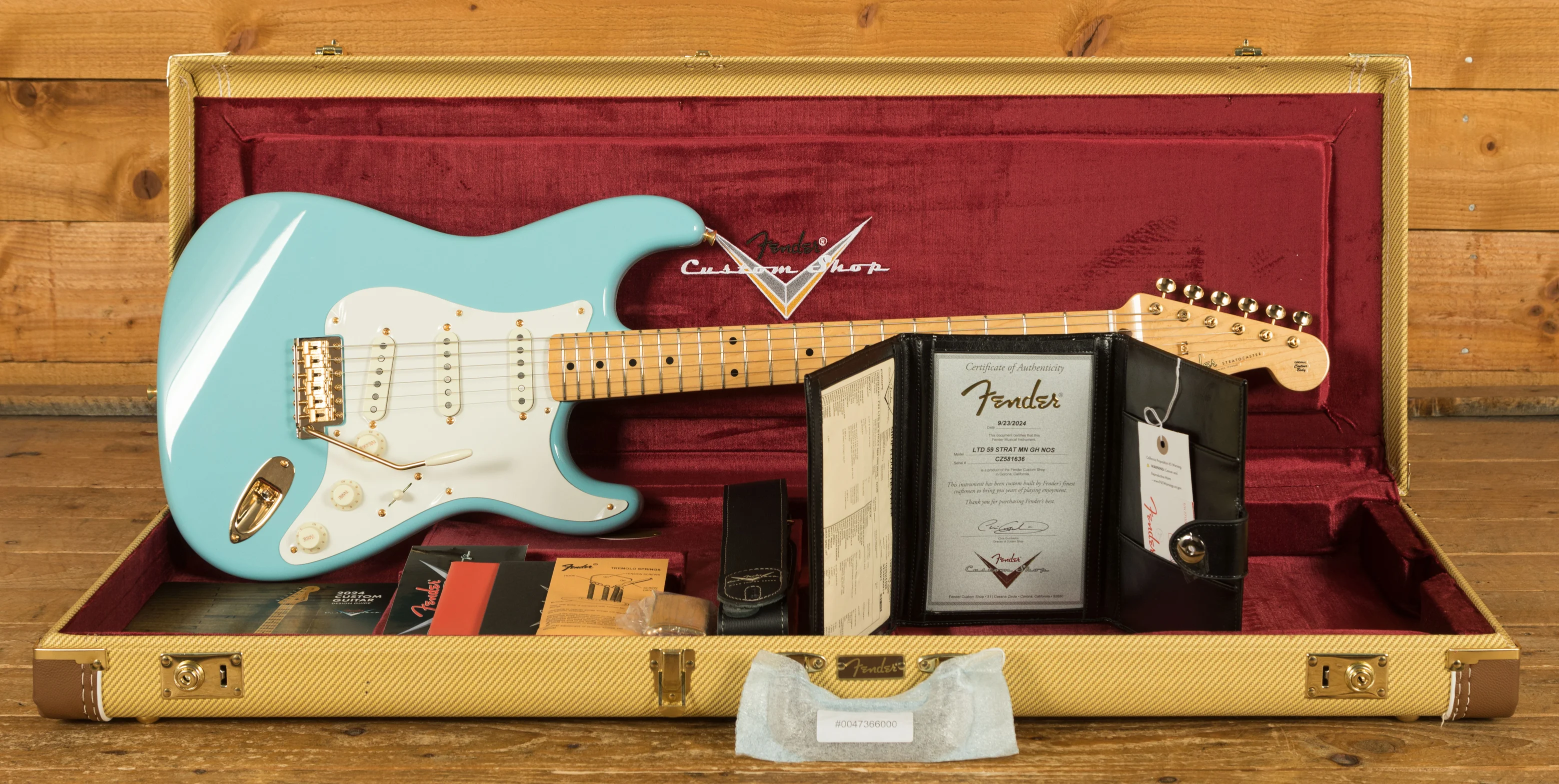 This Fender Custom Shop Limited-Edition '59 Stratocaster in Daphne Blue is a stunning homage to a classic, blending vintage appeal with modern refinements. Fender has spared no expense in selecting the finest materials and components, ensuring that this model not only reflects the look and feel of a 1959 Fullerton Stratocaster but also benefits from significant upgrades in both tonewoods and hardware.