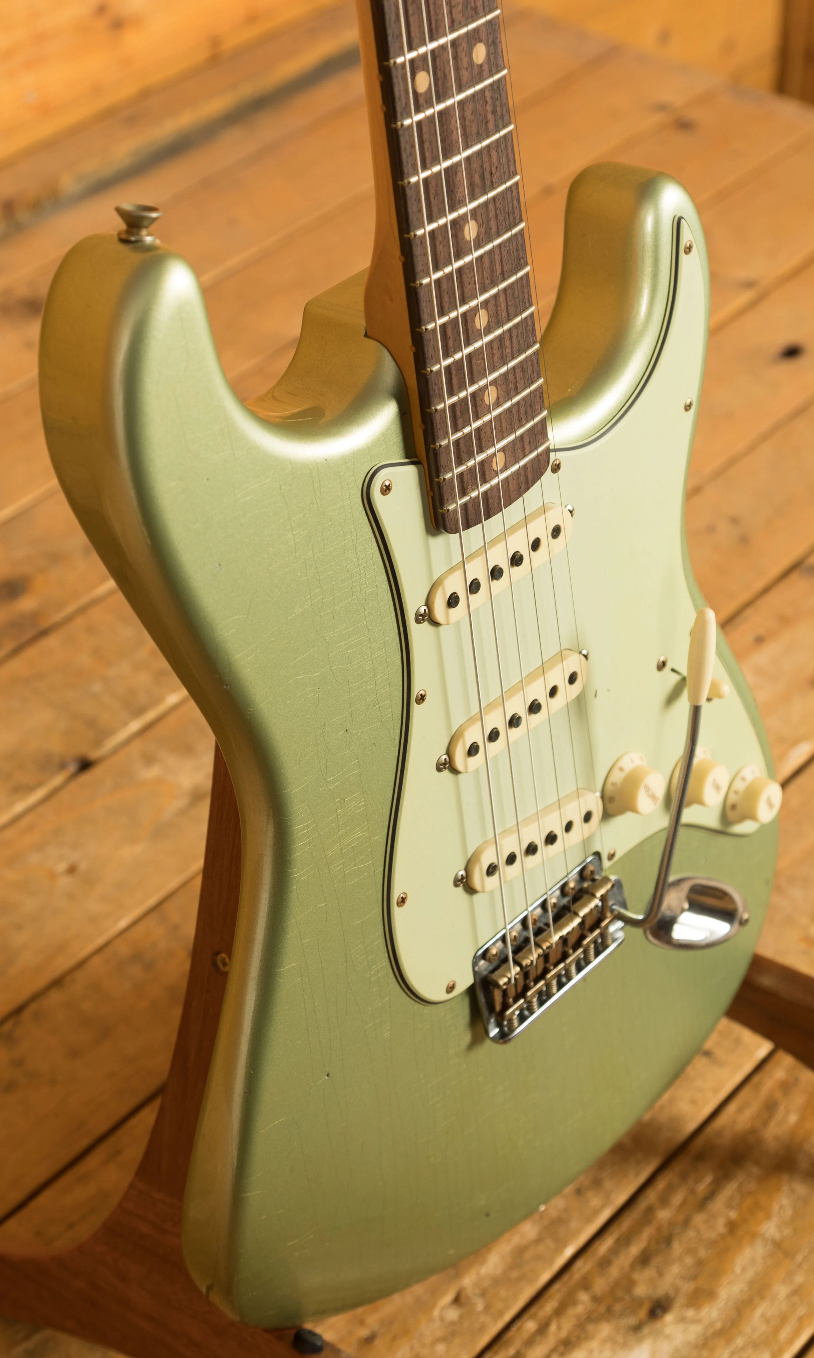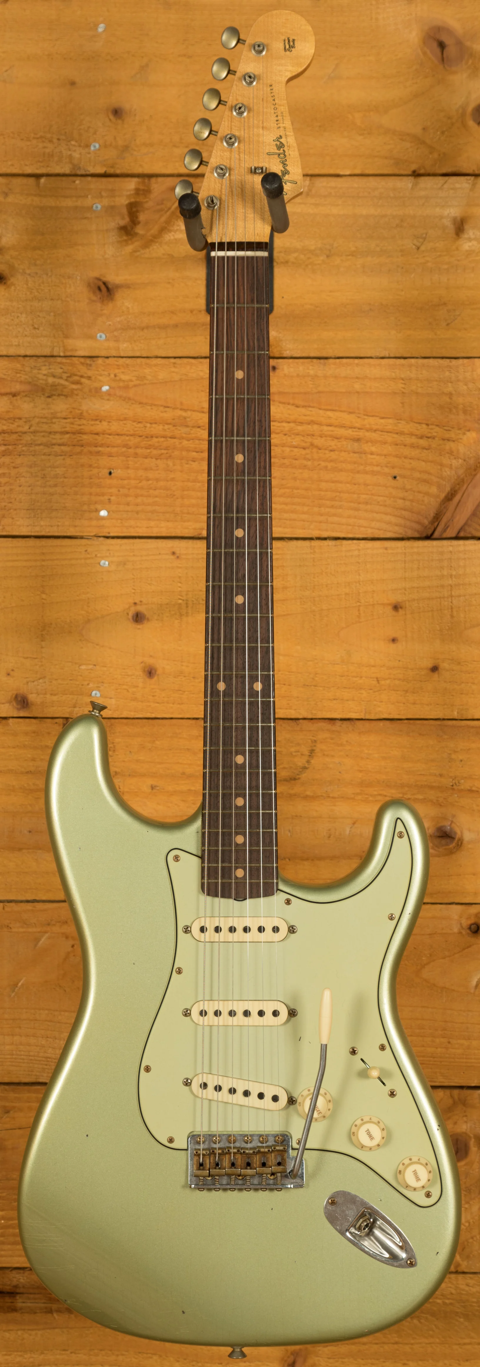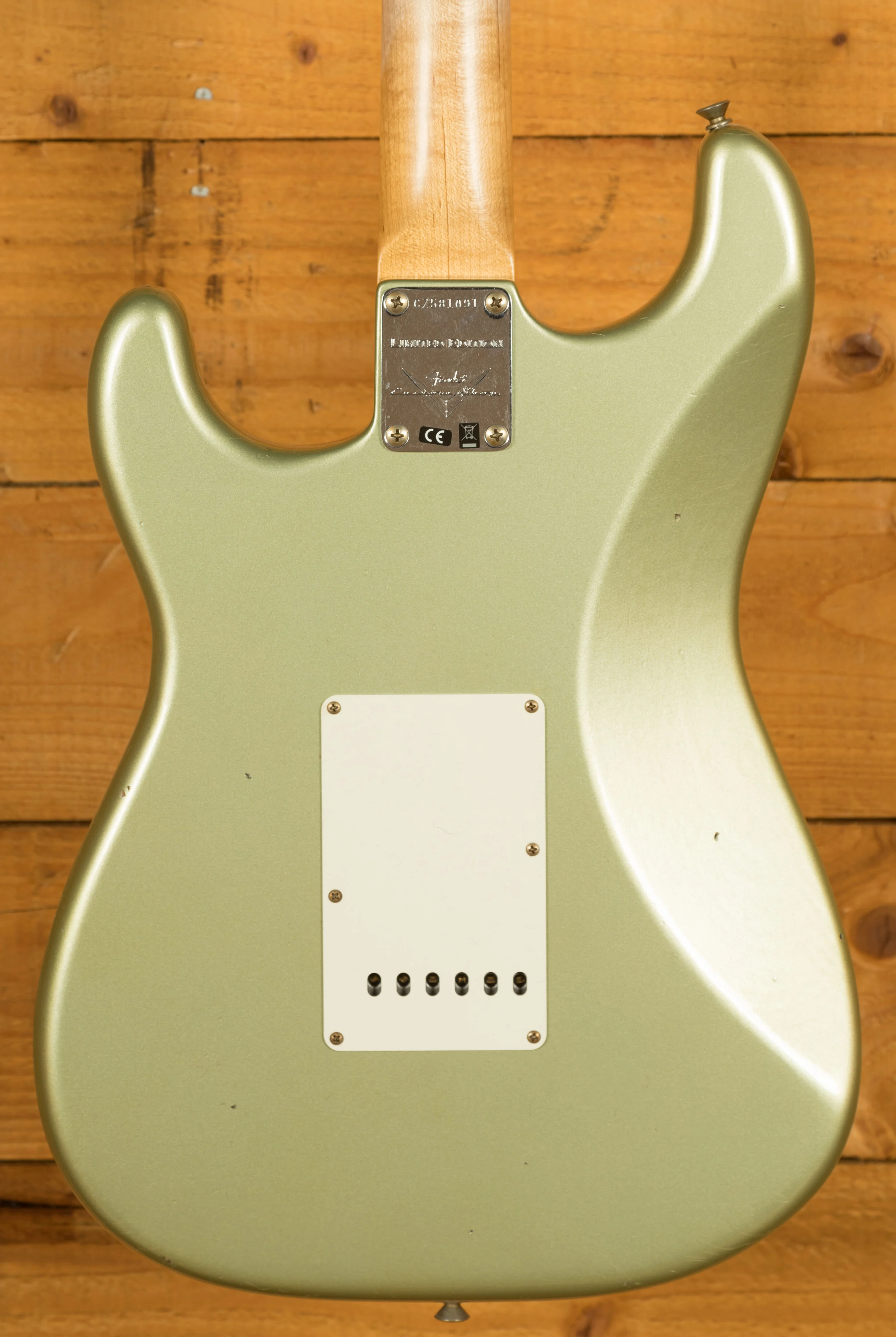 The sort for lightweight Alder body is finished in the awesome Super Faded Aged Sage Green Metallic, one of Fender's more unique finishes, it's a real beauty! Authentically aged, this finish will wear beautifully with time and develop its own character even further. The thin nitro finish also allows the natural resonance of the body to sing and sustain much more effectively.