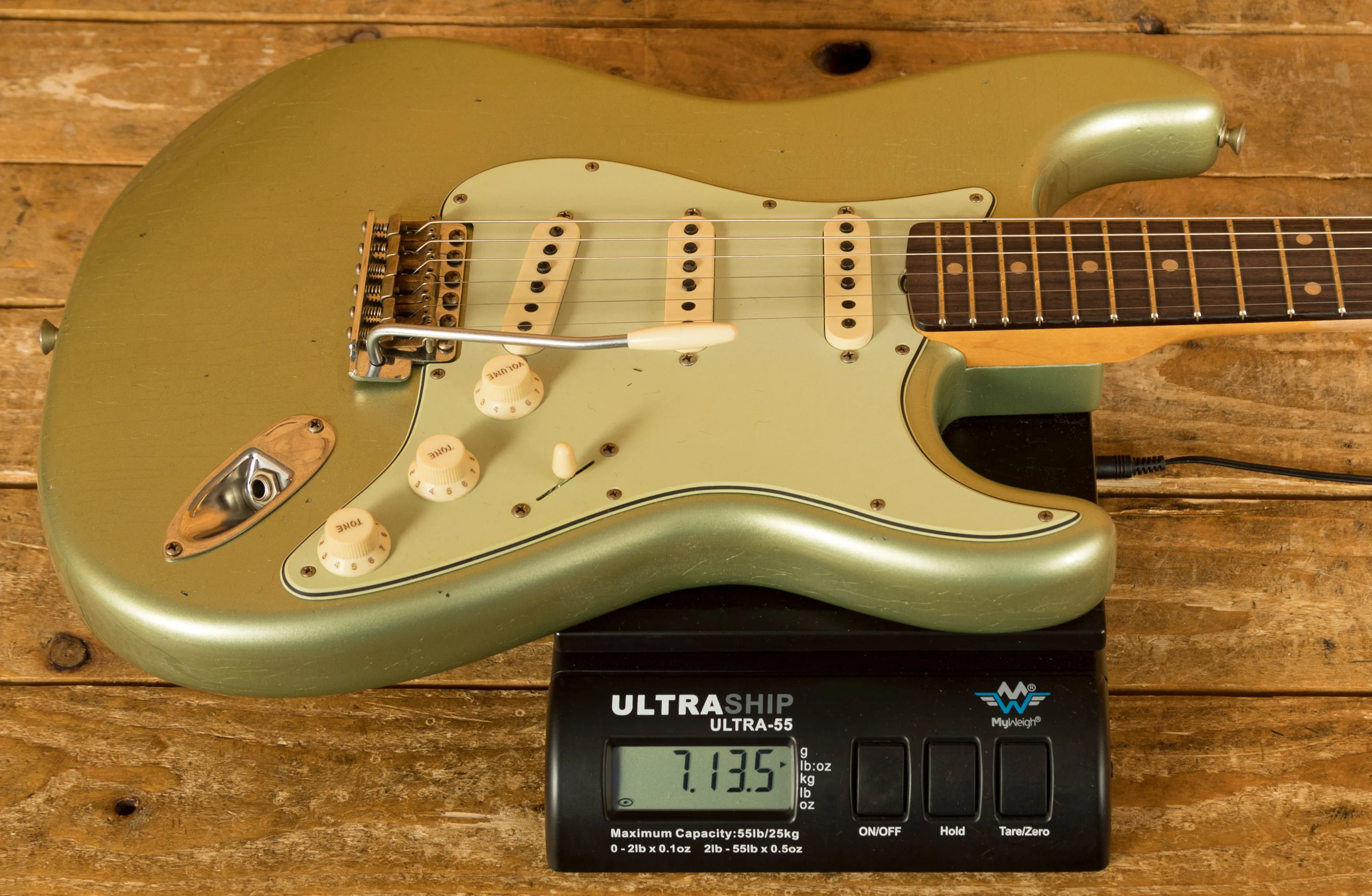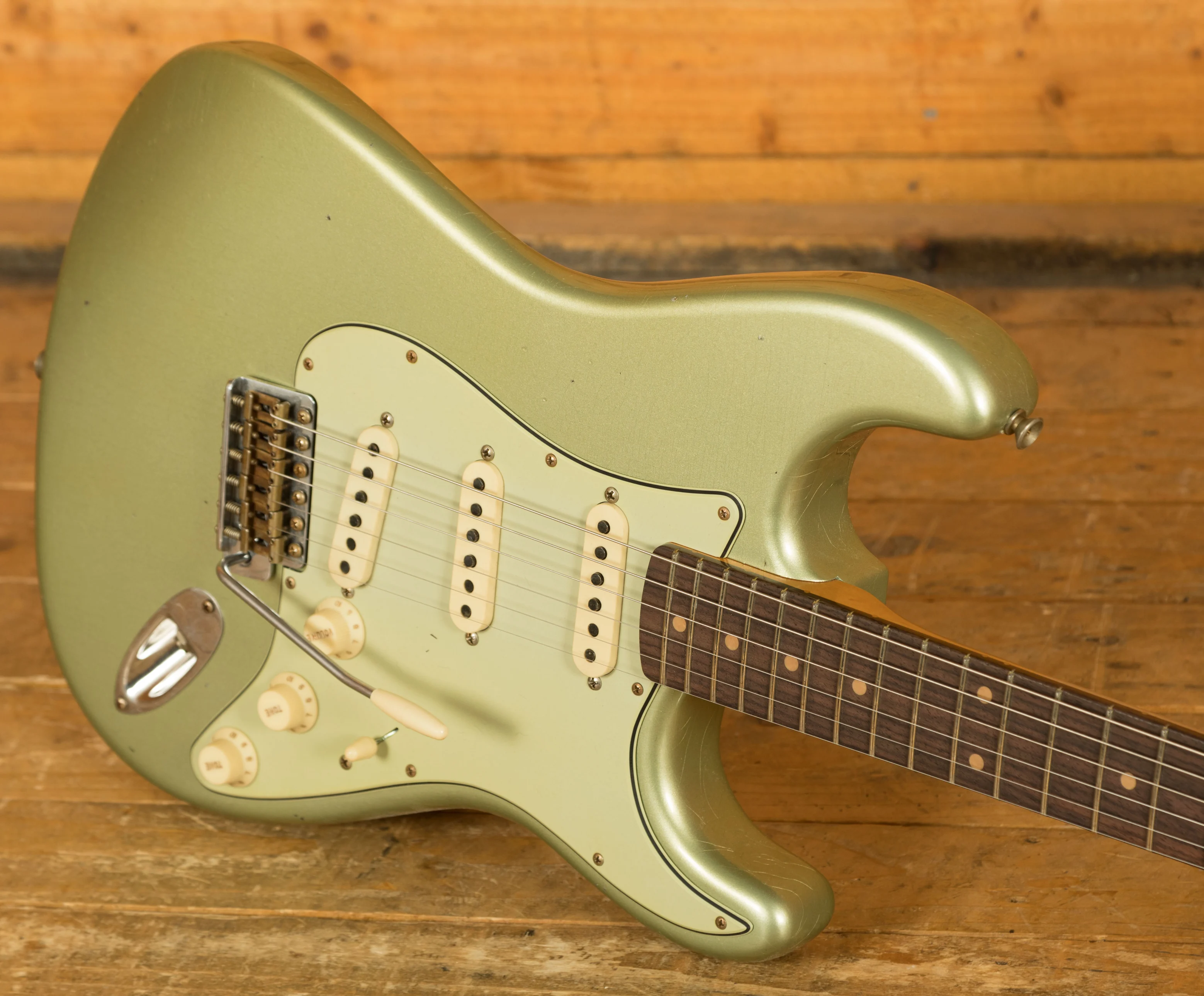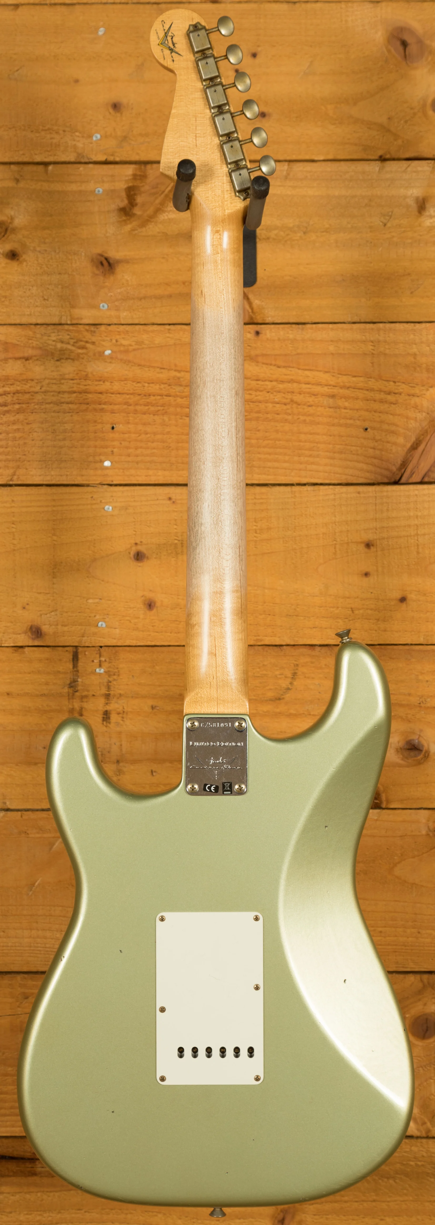 The sort for lightweight Alder body is finished in the awesome Super Faded Aged Sage Green Metallic, one of Fender's more unique finishes, it's a real beauty! Authentically aged, this finish will wear beautifully with time and develop its own character even further. The thin nitro finish also allows the natural resonance of the body to sing and sustain much more effectively.