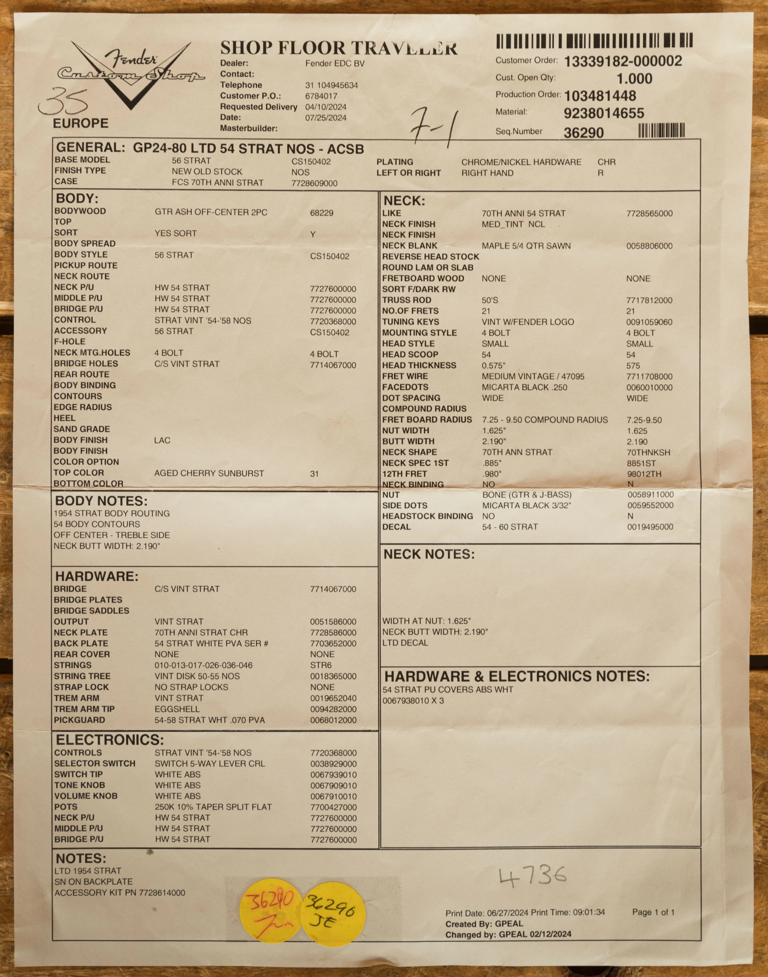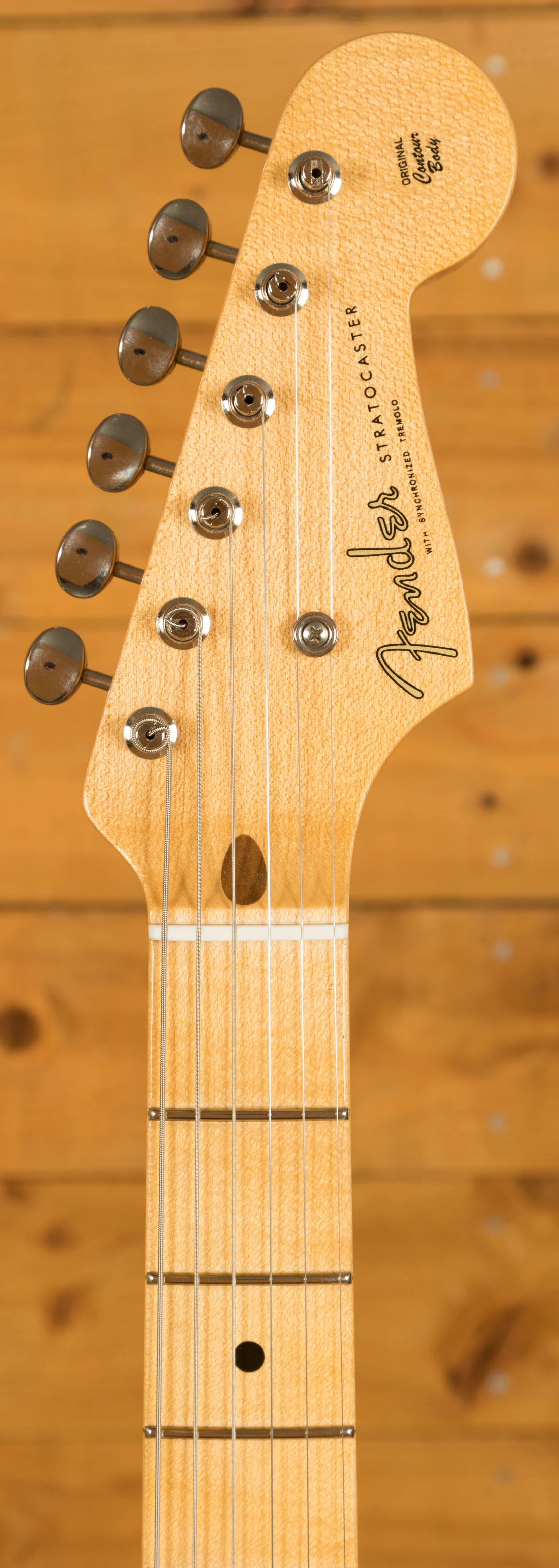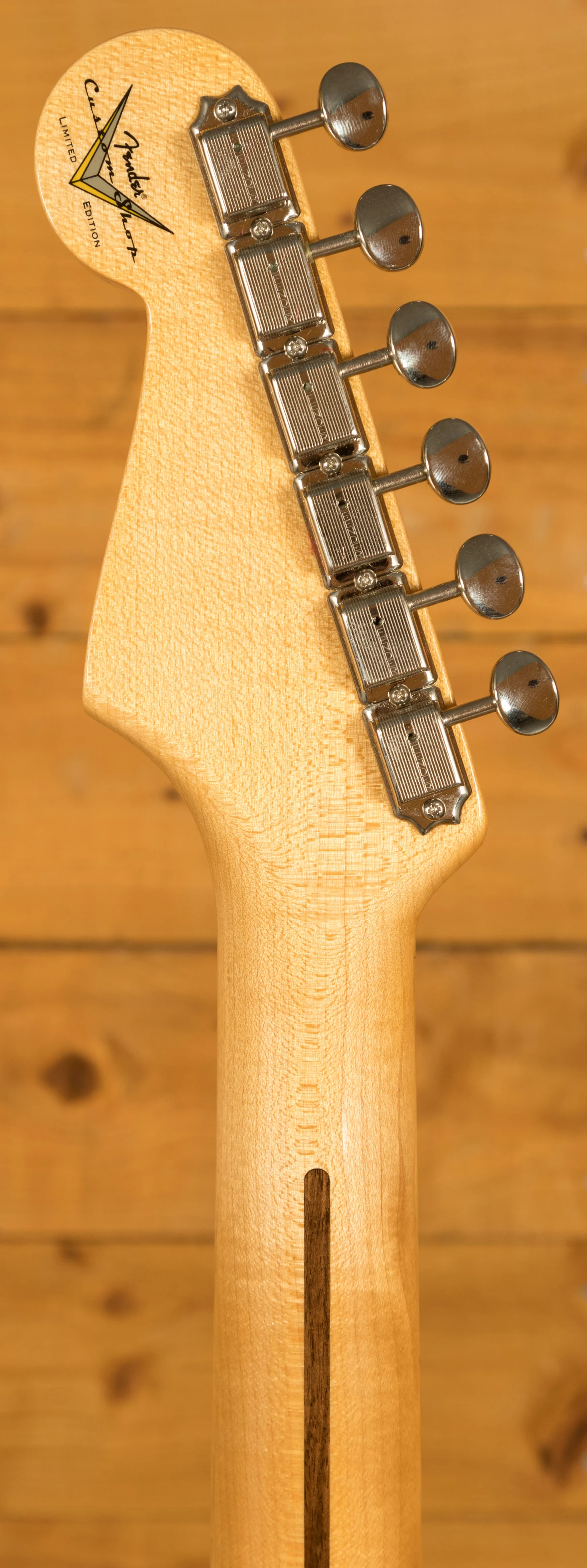 The neck is where the magic continues. Crafted from a single piece of quartersawn maple, it features a special 70th anniversary Soft V profile, inspired by an extraordinary Strat neck from July 1954. The vintage compound-radius fingerboard, with a 7.25" to 9.5" taper, is outfitted with 21 medium vintage (47095) frets and a 1.625" bone nut, providing the ideal blend of playability and comfort. Under the hood, three Custom Shop hand-wound '54 Strat pickups deliver the quintessential Strat sound, with clear, bell-like highs that define the classic Stratocaster voice. These pickups are routed through authentic vintage '54 Strat wiring with a wax paper capacitor and five-way switching for versatile tonal options. Does it get any better than that?!